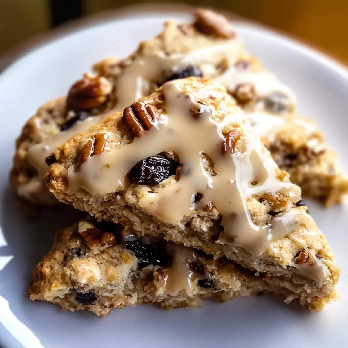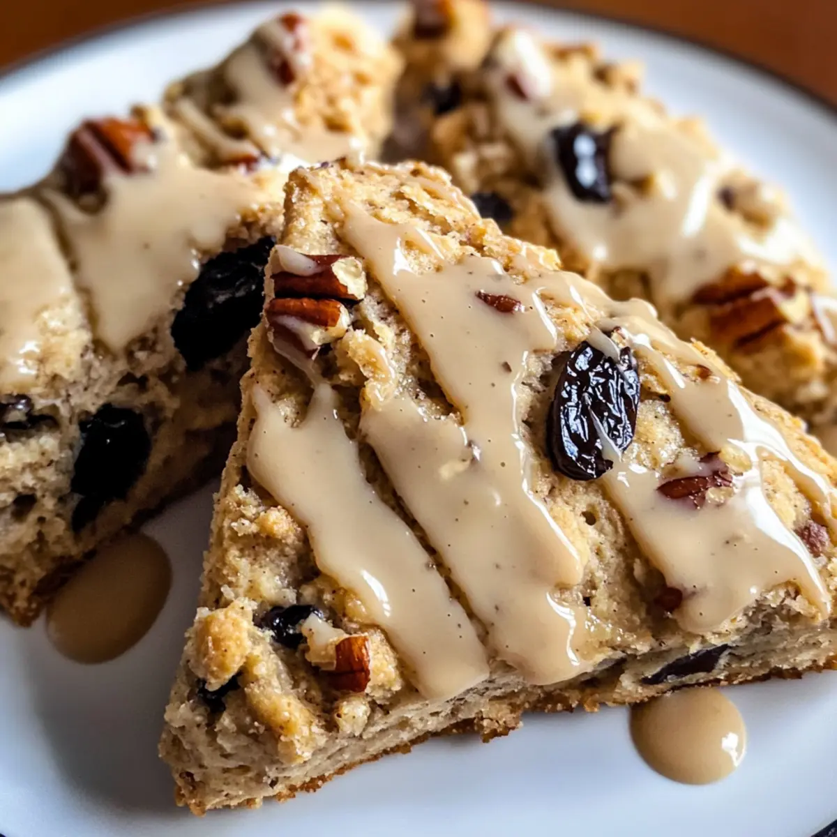 Beim ersten Bissen dieser Ahorn-Pekan-Walnuss-Scones wird das sanfte, süße Aroma von Ahornsirup und Zimt freigesetzt, das sofort für Gemütlichkeit sorgt. Die Kombination aus zarten, krümeligen Scones und der knackigen Textur der Pekannüsse schafft ein harmonisches Geschmackserlebnis, das sowohl verwöhnend als auch nahrhaft ist. Mit eingearbeiteten, saftigen Pflaumen sind diese Scones nicht nur ein Genuss für den Gaumen, sondern auch eine gesunde Wahl für dein Frühstück oder einen Snack. Sie sind einfach zuzubereiten und ideal, um sie für gemütliche Wochenendmorgen zu genießen oder deine Freunde beim nächsten Kaffeeklatsch zu beeindrucken. Hast du schon einmal gedacht, wie köstlich ein Hauch von Zimt und süßer Ahornsirup kombiniert mit knackigen Nüssen schmecken kann? Warum sind diese Scones so besonders? Aromatischer Genuss: Die perfekte Kombination aus Ahornsirup und Zimt verleiht den Scones ein unwiderstehliches Aroma, das deine Sinne verzaubert. Gesunde Zutaten: Mit saftigen Pflaumen und knusprigen Pekannüssen sind diese Scones nicht nur lecker, sondern auch nahrhaft und bieten eine gesunde Alternative zu herkömmlichem Gebäck. Einfaches Rezept: Du brauchst keine speziellen Fähigkeiten, um diese Scones zu backen – alles ist unkompliziert und schnell zuzubereiten! Vielfältig einsetzbar: Ideal für ein gemütliches Wochenende oder als besondere Überraschung bei deinem nächsten Kaffeeklatsch – sie passen zu jedem Anlass! Begeisterte Gäste: Deine Freunde und Familie werden sich in den geschmackvollen Mix aus Zartheit und Crunch verlieben, was dich zum Star in der Küche macht! Ahorn-Pekan-Walnuss-Scones Zutaten Für alle, die sich nach einem genussvollen Snack sehnen! Für den Teig Weißes Mehl – sorgt für die Struktur der Scones; für mehr Ballaststoffe kannst du Vollkornmehl verwenden. Zucker – verleiht Süße; ersetze ihn durch braunen Zucker für einen intensiveren Geschmack. Backpulver – als Treibmittel sorgt es für die richtige Höhe; achte darauf, dass es frisch ist. Feines Meersalz – intensiviert den Geschmack; du kannst auch koscheres Salz verwenden und die Menge nach Geschmack anpassen. Gemahlener Zimt – bringt Wärme und Gewürz; du kannst auch Muskatnuss als Alternative verwenden. Ungesalzene Butter (kalt und gewürfelt) – sorgt für die flauschige Textur; veganer Butter ist eine gute milchfreie Option. Kalifornische Pflaumen (grob gehackt) – spenden natürliche Süße und Feuchtigkeit; für die Notlage kannst du auch Datteln nutzen. Pekannüsse (grob gehackt) – bieten einen knusprigen Biss; tausche sie gegen Walnüsse oder Mandeln für eine Variation. Große Eier – binden den Teig; ein Leinsamen-Ei eignet sich gut als vegane Alternative. Buttermilch – sorgt für die nötige Feuchtigkeit; Mischt Milch einfach mit Zitronensaft als Ersatz. Ahornsirup – süßt und aromatisiert; Honig oder Agavendicksaft sind ebenfalls möglich. Für die Zimt-Ahorn-Glasur Puderzucker – für Süße und eine glatte Konsistenz; püriere normalen Zucker für eine gesunde Variante. Gemahlener Zimt – steigert den Geschmack der Glasur; lasse ihn weg, wenn du eine neutrale Glasur möchtest. Ahornsirup – bereichert die Glasur; Vanilleextrakt kann anstelle von Ahornsirup verwendet werden. Wasser – passt die Konsistenz der Glasur an; nutze mehr oder weniger je nach Wunsch. Schritt-für-Schritt-Anleitung für Ahorn-Pekan-Walnuss-Scones Step 1: Trockene Zutaten vermengen In einer großen Schüssel das Mehl, den Zucker, das Backpulver, das feine Meersalz und den gemahlenen Zimt gründlich vermengen. Verwende einen Schneebesen, um sicherzustellen, dass sich die Zutaten gut vermischen. Dieser Schritt sorgt dafür, dass deine Ahorn-Pekan-Walnuss-Scones gleichmäßig risen und aromatisch schmecken. Step 2: Butter einarbeiten Schneide die kalte, gewürfelte Butter in Stücke und füge sie zur Mehlmischung hinzu. Verwende einen Pastry Cutter oder zwei Gabeln, um die Butter einzukneten, bis die Mischung grob krümelig bleibt und die Konsistenz von Erbsen hat. Dies gibt den Scones die gewünschte flauschige Textur. Step 3: Trockenfrüchte hinzufügen Gib die grob gehackten Pflaumen und Pekannüsse zu der méischen Mischung und vermenge sie sanft, damit sie gleichmäßig verteilt sind. Achte darauf, dass du die Mischung nicht überarbeitest, um die zarte Textur der Ahorn-Pekan-Walnuss-Scones zu erhalten. Step 4: Feuchte Zutaten vermengen In einer separaten Schüssel die Eier, Buttermilch und den Ahornsirup gut verquirlen. Füge die feuchten Zutaten nach und nach zu den trockenen Zutaten hinzu und rühre vorsichtig, bis sie gerade so vermischt sind. Der Teig sollte noch ein wenig klumpig sein; dies ist wichtig, damit die Scones fluffig bleiben. Step 5: Teig formen Streue etwas Mehl auf eine saubere Arbeitsfläche und stürze den Teig darauf. Drücke den Teig vorsichtig zu einem etwa 2,5 cm dicken Kreis (18-20 cm Durchmesser) und achte darauf, die Scones nicht zu überarbeiten. Dieser Schritt sorgt dafür, dass die Ahorn-Pekan-Walnuss-Scones locker und leicht bleiben. Step 6: Teig kühlen Wickle die Form in Frischhaltefolie und lege den zubereiteten Teig für 20-30 Minuten in den Gefrierschrank. Dieses Kühlen hilft, die Butter fest zu halten, was zu besonders flauschigen Scones führt, wenn sie gebacken werden. Step 7: Scones schneiden Nehme den gekühlten Teig aus dem Gefrierschrank und schneide ihn mit einem scharfen Messer oder Pizzaroller in Wedges (z.B. Dreiecke). Achte darauf, den Teig nicht zu zerdrücken. Lege die geschnittenen Scones auf ein mit Backpapier belegtes Blech und stelle sie erneut in den Gefrierschrank, während du den Ofen auf 190 °C vorheizst. Step 8: Backen Backe die Scones im vorgeheizten Ofen für 20-22 Minuten, bis sie goldbraun sind und leicht auf Druck zurückspringen. Achte darauf, dass die Unterseite nicht zu dunkel wird, da die perfekten Ahorn-Pekan-Walnuss-Scones eine zarte, goldbraune Kruste haben sollten. Step 9: Abkühlen u