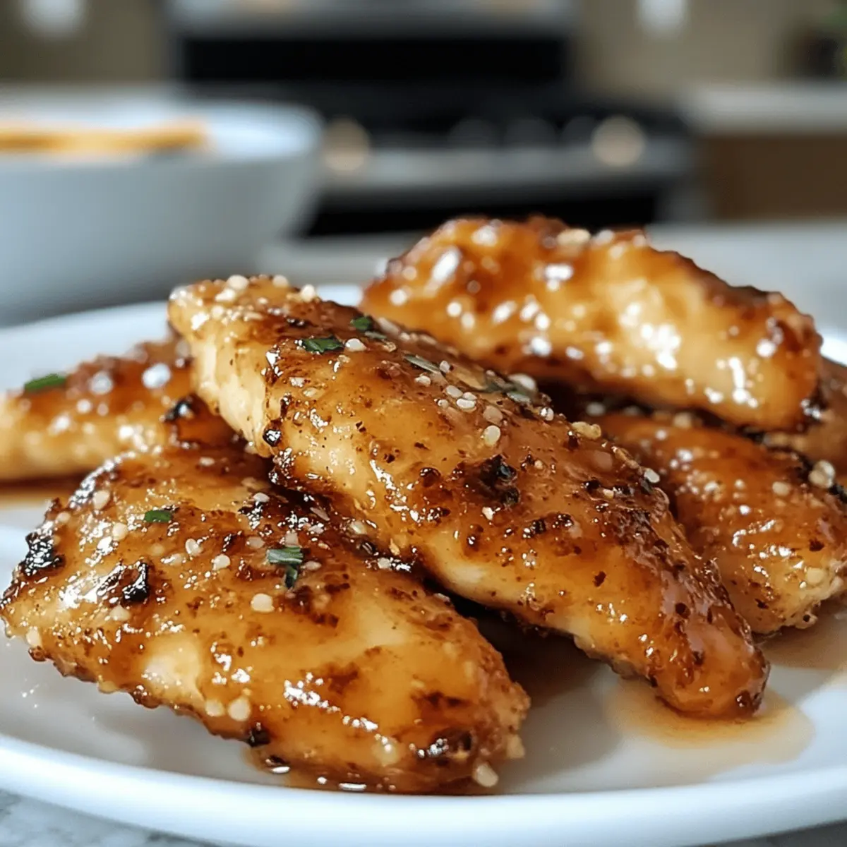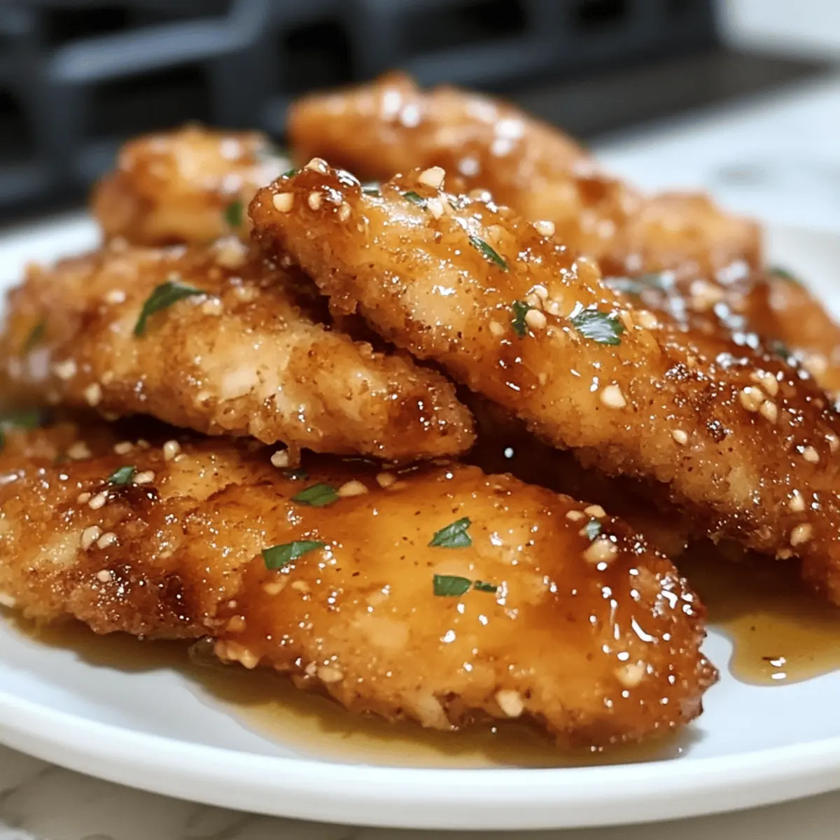 „Hast du jemals den unwiderstehlichen Duft von frisch gebackenem Hühnchen verspürt, der durch die Küche zieht und Erinnerungen an gemütliche Familienabende hervorruft?“ Mit diesen Air Fryer Honey Butter Garlic Chicken Tenders bringst du diesen Genuss direkt auf den Tisch – schnell und einfach in nur 15 Minuten zubereitet. Diese glutenfreien Hähnchenteile vereinen knusprige Textur mit der süßen und herzhaften Note von Honigbutter und Knoblauch. Ideal für geschäftige Wochentage oder ein entspanntes Abendessen mit Freunden, werden sie garantiert die Herzen deiner Lieben erobern. Außerdem sind sie perfekt zum Vorbereiten, was sie zu einer praktischen Wahl für jede Gelegenheit macht. Bist du bereit, diesen köstlichen Klassiker auszuprobieren? Warum wirst du dieses Rezept lieben? Köstliche Aromen: Diese Hähnchenteile sind nicht nur knusprig, sondern auch mit einer einzigartigen Honig-Knoblauch-Butter-Sauce überzogen, die jedem Bissen eine süß-herzhafte Tiefe verleiht. Schnelligkeit und Effizienz: In nur 15 Minuten auf dem Tisch – perfekt für geschäftige Wochentage. Familienfreundlich: Die ganze Familie wird begeistert sein! Serviere sie mit einem frischen Salat oder Butter Nudeln Mit für eine komplette Mahlzeit. Einfach zu variieren: Ob mit Hähnchenbrust oder einem spritzigen Hauch Zitrone – die Möglichkeiten sind.Endlos. Vorbereiten leicht gemacht: Bereite die Honigbuttersauce im Voraus zu und genieße müheloses Kochen am Abend! Zutaten für Krosse Air Fryer Honigbutter-Hähnchenteile Die köstlichen Air Fryer Honey Butter Garlic Chicken Tenders sind einfach zuzubereiten und werden dich und deine Liebsten begeistern! Für die Hähnchenteile • Hähnchentender – Saftige Basis, die für die beste Textur frisch und hochwertig sein sollte. • Butter – Fügt eine cremige Note hinzu; kann durch Ghee für eine milchfreie Option ersetzt werden. • Honig – Sorgt für eine natürliche Süße und ein schönes Karamellisieren – Alternativen sind Agavensirup für eine vegane Variante. • Knoblauch – Für aromatische Tiefe; frischer, gehackter Knoblauch ist ideal, aber Knoblauchpulver geht auch in der Not. • Salz – Verstärkt die Aromen; nach Bedarf anpassen. • Schwarzer Pfeffer – Bringt eine milde Schärfe; kann weggelassen oder durch eine Gewürzmischung ersetzt werden. Gib diese köstlichen Hähnchenteile heute einmal in deinen Speiseplan – du wirst es nicht bereuen! Schritt-für-Schritt-Anleitung für Krosse Air Fryer Honigbutter-Hähnchenteile Step 1: Air Fryer vorbereiten Heize deinen Air Fryer auf 190 °C (375 °F) vor. Dies ist ein wichtiger Schritt, um sicherzustellen, dass die krossen Air Fryer Honigbutter-Hähnchenteile gleichmäßig garen und eine goldene, knusprige Textur erreichen. Lass den Air Fryer mindestens 5 Minuten vorheizen, während du die anderen Zutaten vorbereitest. Step 2: Honigbutter-Knoblauch-Mischung zubereiten In einer kleinen Schüssel vermische die geschmolzene Butter, den Honig, den gehackten Knoblauch, das Salz und den schwarzen Pfeffer. Rühre die Zutaten gut um, bis sie vollständig vermischt sind. Diese Mischung sorgt für den köstlichen Geschmack, der die Hähnchenteile umhüllt, und gibt ihnen eine schöne glänzende Oberfläche. Step 3: Hähnchentender vorbereiten Trockne die Hähnchentender mit einem Papiertuch ab, um überschüssige Feuchtigkeit zu entfernen. Dies ist der Schlüssel für maximale Knusprigkeit. Du möchtest, dass die Hähnchenstücke schön trocken sind, damit sie die Honigbutter-Knoblauch-Mischung gut aufnehmen können. Lege die Hähnchentender auf einen Teller und bereite dich auf das Marinieren vor. Step 4: Hähnchen marinieren Bestriche die Hähnchentender mit der Hälfte der Honigbutter-Knoblauch-Mischung oder schwenke sie in der Schüssel, bis sie gleichmäßig beschichtet sind. Achte darauf, dass jede Seite gut mit der Mischung überzogen ist, sodass die krosse Oberfläche während des Garens intensiv aromatisiert wird. Die restliche Mischung wird später für den finalen Glanz verwendet. Step 5: Hähnchenteile im Air Fryer platzieren Lege die marinierten Hähnchentender in einer einzigen Schicht in den Korb des vorgeheizten Air Fryers. Achte darauf, dass die Hähnchenteile nicht überlappen, um eine gleichmäßige Garung zu gewährleisten. Diese Schritt ist wichtig, damit die Luft um die Hähnchenstücke zirkulieren kann und du die perfekte Knusprigkeit erreichst. Step 6: Hähnchenteile garen Lass die Hähnchentender 8-10 Minuten im Air Fryer garen, wobei du sie nach der Hälfte der Garzeit einmal umdrehst. Die Hähnchenstücke sollten goldbraun sein und eine Innentemperatur von 75 °C (165 °F) erreichen. Überprüfe die Garstufe mit einem Fleischthermometer, um sicherzugehen, dass sie perfekt durchgegart sind. Step 7: Mit der restlichen Mischung tossen Nimm die Hähnchentender aus dem Air Fryer und gib sie in eine Schüssel. Gieße die restliche Honigbutter-Knoblauch-Mischung über die Hähnchenteile und schwenke sie gründlich, bis sie gleichmäßig überzogen sind. Dies verleiht den Hähnchenkrossen einen letzten geschmackvollen Schliff und sorgt für zusätzlichen Glanz. Step 8: Servieren und genießen Serviere die krossen Air Fryer Honigbutter-Hähnchenteile warm, idealerweise zusammen mit einem frischen Salat oder knusprigen Pommes. Diese einfachen, herzhaften Häppchen sind nicht nur lecker, sondern auch perfekt für ein schnelles Abendessen oder eine gesellige Runde mit Freunden. Lagerungstipps für Krosse Air Fryer Honigbutter-Hähnchenteile • Raumtemperatur: Es wird empfohlen, die Hähnchenteile nicht länger als 2 Stunden bei Raumtemperatur stehen zu lassen, um die Frische zu bewahren. • Kühlschrank: Bewahre die übrig gebliebenen Hähnchentender in einem luftdichten Behälter im Kühlschrank für bis zu 3 Tage auf. • Gefrierfach: Die Hähnchenstücke können bis zu 3 Monate lang im Gefrierfach aufbewahrt werden, wenn sie gut verpackt sind, um Gefrierbrand zu vermei