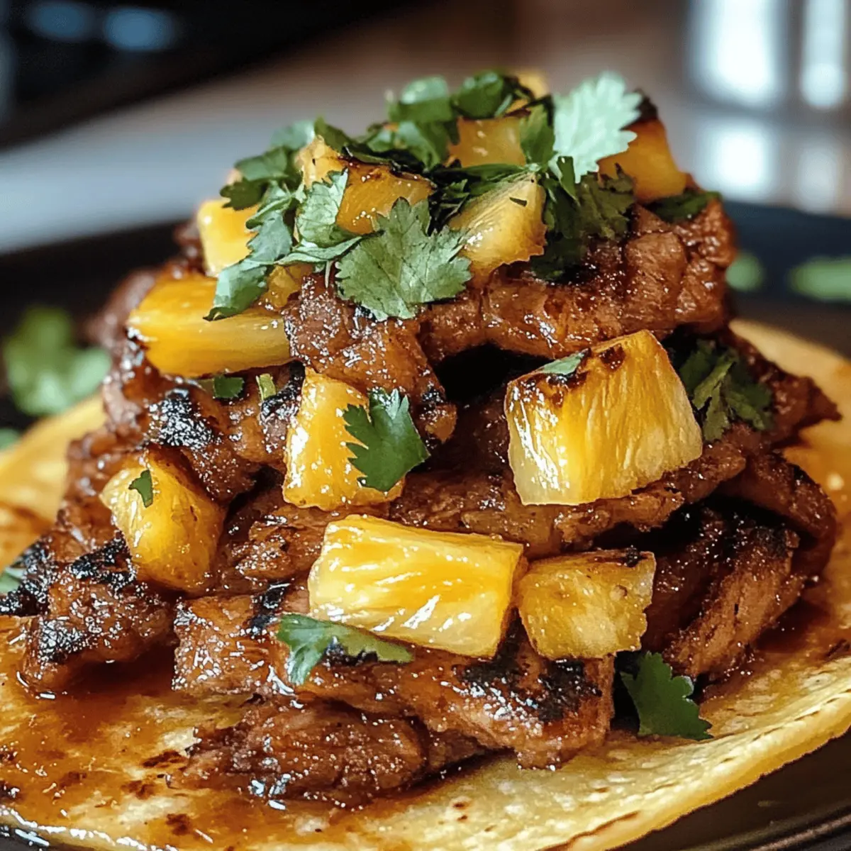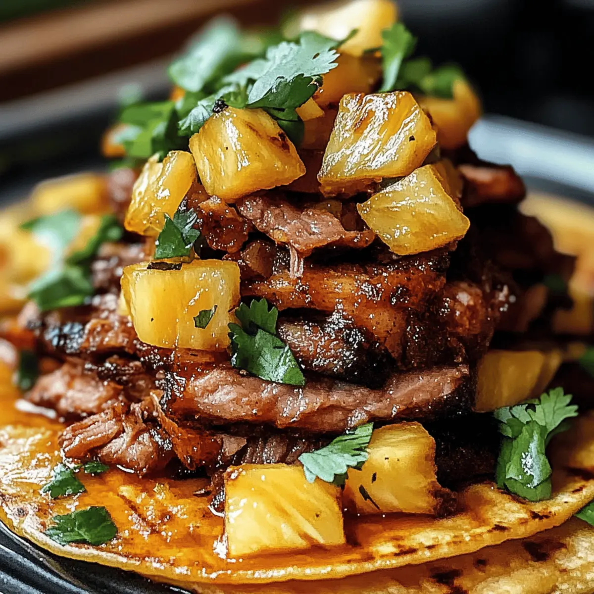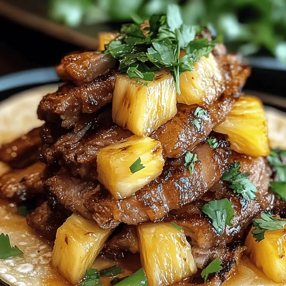 Als wir kürzlich in eine kleine mexikanische Taquería eintauchten, wurde mir sofort klar, dass Tacos Al Pastor mit gegrillter Ananas eine wahre Geschmacksexplosion bieten. Diese authentischen Tacos, voller zart mariniertem Schweinefleisch und der Süße der Ananas, werden deiner Familie und deinen Freunden mit Sicherheit ein Lächeln ins Gesicht zaubern. Diese einfache und dennoch beeindruckende Rezeptur ist perfekt für einen entspannten Taco-Abend oder um deine Gäste zu beeindrucken. Die zubereitungsfreundlichen Zutaten machen das Rezept vielseitig und auch für weniger erfahrene Köche zugänglich. Bist du bereit, deine Küche in eine lebendige mexikanische Fiesta zu verwandeln? Warum wirst du dieses Rezept lieben? Einfachheit, das Rezept erfordert nur grundlegende Kochfähigkeiten, sodass auch weniger erfahrene Köche mit Leichtigkeit beeindruckende Tacos kreieren können. Vielfalt, ob du dich für Schwein, Huhn oder eine vegetarische Option entscheidest, dieses Rezept lässt sich flink anpassen. Aromenexplosion, die Kombination aus zartem, mariniertem Fleisch und süßer Ananas sorgt für ein unvergleichliches Geschmackserlebnis. Zeitersparnis, bereite die Marinade und das Fleisch im Voraus vor, um mehr Zeit mit deinen Gästen zu verbringen. Überrasche deine Freunde mit einem köstlichen Taco, der dem Genuss in deiner liebsten Taquería nachspielt. Ergänze dein Menü mit Haehnchen Tacos Avocado oder Knoblauch Butter Honig. Al Pastor Tacos Zutaten Für die Marinade Schweinefleisch (Schweinebraten) – Verwende gut marmoriertes Fleisch für maximale Saftigkeit. Zwiebel – Gelbe oder weiße Zwiebeln verbessern die Marinadetiefe. Knoblauch – Frische Zehen verleihen einen reichhaltigen Geschmack; Pulver vermeiden! Dried Chile Guajillo – Sorgt für milde Schärfe und lebendige Farbe. Lorbeerblätter – Fügen aromatische Noten hinzu; vor dem Servieren entfernen. Achiote-Paste – Unverzichtbar für den authentischen Geschmack; kann DIY mit einer Gewürzmischung ersetzt werden. Koscheres Salz – Essentiell für die Würze, Menge nach Bedarf anpassen. Kreuzkümmel & Mexikanischer Oregano – Schlüsselgewürze der mexikanischen Küche; frischen Oregano verwenden, wenn möglich. Schwarzer Pfeffer & Piment – Verfeinert den Gesamtgeschmack; nach persönliche Vorliebe anpassen. Äpfelwein-Essig – Balanciert die Aromen mit Säure; Weißweinessig kann ebenfalls verwendet werden. Chipotle in Adobo – Fügt einen rauchigen Geschmack hinzu; für mildere Tacos weglassen. Für das Fleisch Hühnerbrühe – Hält das Schweinefleisch während des Kochens saftig; Gemüsebrühe für die vegetarische Option verwenden. Für die Tacos Mais-Tortillas – Warm servieren für den besten Genuss; glutenfreie Tortillas verwenden, wenn nötig. Frische Koriander – Essentielles Topping für zusätzlichen Geschmack und Präsentation. Salsa Verde – Ein Muss für mehr Frische und Geschmack. Für die Ananas Eingelegte Ananas – Sorgt für Süße und Feuchtigkeit; frische Ananas kann ebenfalls verwendet werden, muss jedoch separat gegrillt werden. Eingelegter Ananassaft – Für zusätzliche Feuchtigkeit und Süße; den Saft aus der Dose nutzen. Diese Zutaten für deine Al Pastor Tacos mit Ananas bieten nicht nur unverwechselbare Aromen, sondern auch eine Vielzahl an Optionen zur Anpassung! Step-by-Step Instructions for Al Pastor Tacos mit Ananas Step 1: Schweinefleisch vorbereiten Schneide den Schweinebraten in dünne Scheiben und lege ihn für 30 Minuten ins Gefrierfach, um die Arbeit zu erleichtern. Achte darauf, dass die Stücke gleichmäßig ca. 1 cm dick sind, damit sie gut in der Marinade einziehen und beim Grillen gleichmäßig garen. Step 2: Marinade zubereiten Erhitze 2 Esslöffel neutrales Öl in einer Pfanne und brate die gehackte Zwiebel und den Knoblauch bei mittlerer Hitze für etwa 3-4 Minuten, bis sie glasig sind. Füge die getrockneten Chiles und Lorbeerblätter hinzu, gieße 1 Tasse Wasser und 1/4 Tasse Essig dazu und lasse die Mischung für 10 Minuten köcheln, bevor du sie abkühlen lässt. Step 3: Marinade pürieren Gib die gekochte Mischung in einen Mixer und füge die Achiote-Paste, das Koscheres Salz, Kreuzkümmel, mexikanischen Oregano, schwarzen Pfeffer und Ananassaft hinzu. Püriere alles zu einer glatten Marinade und siebe sie anschließend, um eine klumpenfreie Konsistenz zu erhalten, die sich gut um das Schweinefleisch legt. Step 4: Marinieren Legen die dünnen Schweinefleischscheiben in eine Schüssel und gieße die fertige Marinade darüber. Decke die Schüssel ab und stelle sie für mindestens 4 Stunden, idealerweise über Nacht, in den Kühlschrank, damit die Aromen intensiv durchziehen können. Step 5: Ananas vorbereiten Während das Fleisch mariniert, schneide die eingekochte Ananas in Scheiben oder Stücke. Wenn du frische Ananas benutzt, grille sie 5-7 Minuten lang auf einem Grill oder in einer Grillpfanne, bis sie schön gebräunt und karamellisiert sind. Dies intensiviert die Süße der Ananas für deine Tacos. Step 6: Kochen Heize deinen Ofen auf 135°C (275°F) vor. Stecke abwechselnd die marinierten Schweinefleischscheiben und die gegrillte Ananas auf Spieße und lege sie in eine Auflaufform. Gare die Spieße für 2,5 bis 3 Stunden im Ofen, bis das Fleisch zart ist und eine Innentemperatur von 63°C (145°F) erreicht. Step 7: Fertigstellen Nimm die Spieße aus dem Ofen und lasse das Fleisch für 10 Minuten ruhen. Schneide das Schweinefleisch anschließend in dünne Streifen. In der Zwischenzeit kannst du Zwiebelstücke und die restliche Ananas in der Pfanne mit etwas Marinade für 2-3 Minuten anbraten, um zusätzliche Aromen zu gewinnen. Step 8: Tacos zusammenstellen Erwärme die Mais-Tortillas in einer trockenen Pfanne für 30 Sekunden pro Seite, bis sie leicht gebräunt sind. Fülle jede Tortilla mit den geschnittenen Fleischstreifen, der angebratenen Zwiebel und Ananas, und garniere sie großzügig mit frischem Koriander und einem Löffel Salsa Verde fü