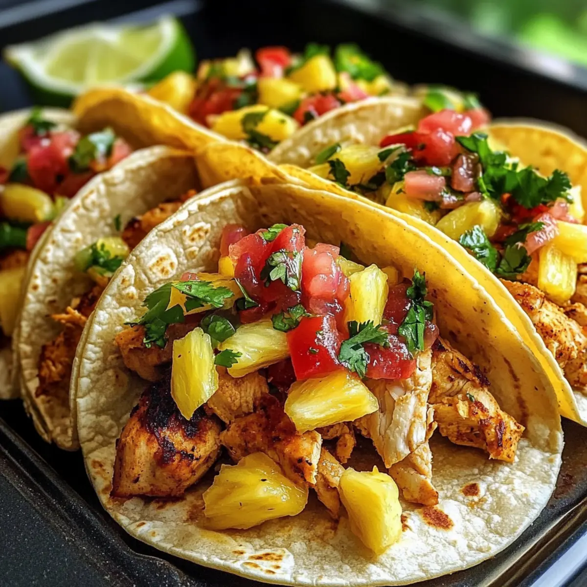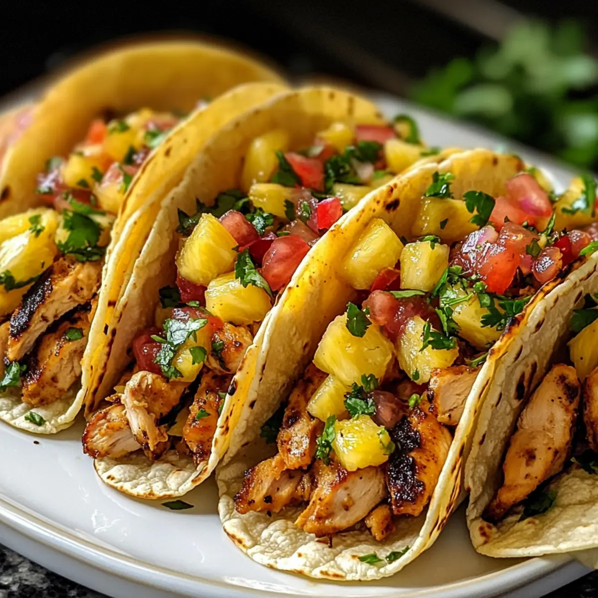 Eines Abends, während ich in der Küche stand und auf die zischende Pfanne schaute, entstand die Idee für diese Ananas Hähnchen Tacos. Die Kombination aus süßer Ananas und zartem Hühnchen entfaltet nicht nur eine Geschmacksexplosion, sondern bringt auch das tropische Feeling direkt auf euren Tisch. Diese Tacos sind perfekt für stressige Wochentage, da sie schnell zubereitet werden können und dennoch jeden am Tisch begeistern. Außerdem sind sie glutenfrei, wenn ihr euch für Mais-Tortillas entscheidet, was sie zu einer tollen Wahl für alle macht, die Wert auf Ernährung legen. Neugierig darauf, wie man dieses einfache, aber köstliche Gericht zubereitet? Lasst uns gemeinsam die Vorzüge dieser leckeren Tacos entdecken! Warum werden dir diese Tacos gefallen? Einfachheit: Die Zubereitung der Ananas Hähnchen Tacos ist kinderleicht, sodass auch Kochanfänger schnell zum Erfolg kommen. Frische Aromen: Die Kombination aus saftiger Ananas und gewürztem Hühnchen bringt tropisches Flair auf den Tisch. Vielfältige Variationen: Du kannst die Tacos anpassen, indem du unterschiedliche Toppings wie Avocado oder Sriracha-Mayo hinzufügst. Gesund und nahrhaft: Mit einer Basis aus glutenfreien Mais-Tortillas sind sie eine großartige Wahl für ernährungsbewusste Genießer. Schnelle Zubereitung: In nur wenigen Schritten bist du bereit, deine Gäste mit einem großartigen Gericht zu überraschen. Diese Tacos sind nicht nur ein Genuss im Sommer, sondern perfekt für jede Jahreszeit! Ananas Hähnchen Tacos Zutaten Für das Hühnchen Hähnchenbrust ohne Knochen und Haut – Liefert Proteine und Struktur; du kannst auch vorgekochtes Rotisserie-Hühnchen für mehr Bequemlichkeit verwenden. Sojasauce – Verleiht Umami und Salzheit; Tamari ist eine großartige glutenfreie Option. Honig – Bringt Süße und balanciert die Aromen, Agavensirup eignet sich hervorragend für eine vegane Alternative. Reisessig – Fügt Säure und Helligkeit hinzu; Apfelessig ist ein guter Ersatz, wenn nötig. Sesamöl – Gibt einen nussigen Geschmack; kann durch Rapsöl ersetzt werden, wenn du einen milderen Geschmack bevorzugst. Frisch geriebener Ingwer – Verstärkt das Aroma und den Geschmack; bei Bedarf kann auch gemahlener Ingwer verwendet werden. Knoblauch – Sorgt für eine geschmackliche Tiefe; im Notfall ist Knoblauchpulver eine gute Alternative. Rote Pfefferflocken – Optionale Schärfe, lasse sie weg, wenn du mildere Aromen bevorzugst. Für die Salsa Frische Ananas – Bringt Süße und tropisches Flair; verwende eventuell Dosenananas in Saft, nicht in Sirup. Rote Paprika – Fügt Knusprigkeit und Süße hinzu; jede süße Paprika kann substituiert werden. Rote Zwiebel – Bietet Schärfe und Farbe; gelbe Zwiebeln sind eine akzeptable Alternative. Koriander – Sorgt für Frische; im Notfall kann auch Petersilie verwendet werden. Jalapeño – Optional für Schärfe; weglassen für eine nicht scharfe Variante. Limettensaft – Bringt die Aromen zum Leuchten; Zitronensaft kann als Alternative dienen. Salz – Verstärkt den Geschmack; nach Belieben anpassen. Für die Tacos Mais- oder Weizentortillas – Bilden die Basis der Tacos; glutenfreie Tortillas sind eine gute Wahl für spezielle Diäten. Olivenöl – Zum Braten des Hühnchens; jedes neutrale Öl kann ebenfalls genutzt werden. Geriebener Kohl oder Slaw-Mix – Fügt Knusprigkeit und Textur hinzu; Salat eignet sich ebenso gut als Ersatz. Optionale Toppings – Avocadoscheiben, Sriracha-Mayo, Limettenviertel für zusätzlichen Geschmack und Textur. Die Kombination der frischen Zutaten verleiht den Ananas Hähnchen Tacos einen unwiderstehlichen Geschmack, perfekt für jede Gelegenheit! Schritt-für-Schritt-Anleitung für Ananas Hähnchen Tacos Step 1: Hähnchen marinieren Mische in einer Schüssel die Sojasauce, den Honig, den Reisessig, das Sesamöl, den frisch geriebenen Ingwer, den Knoblauch und die roten Pfefferflocken. Füge die gewürfelten Hähnchenbruststücke hinzu und mariniere sie für mindestens 30 Minuten bis zu 4 Stunden im Kühlschrank. So erhält das Hähnchen für die Ananas Hähnchen Tacos ein intensives Aroma. Step 2: Ananas-Salsa zubereiten Schneide die frische Ananas, die rote Paprika, die rote Zwiebel und optional die Jalapeño in kleine Stücke. Mische sie in einer Schüssel mit frischem Koriander, Limettensaft und Salz. Lass die Salsa für etwa 15 Minuten im Kühlschrank durchziehen, damit sich die Aromen optimal entfalten können und fühle dich bereit für die Nachbereitung der Ananas Hähnchen Tacos. Step 3: Hähnchen braten Erhitze in einer großen Pfanne oder einem Wok bei mittlerer Hitze etwas Olivenöl. Gib das marinierte Hähnchen dazu und brate es etwa 5-7 Minuten lang, bis es goldbraun und durchgegart ist. Achte darauf, dass das Hähnchen gut durchgegart ist (mindestens 165°F/74°C), um eine sichere Mahlzeit für deine Ananas Hähnchen Tacos zu gewährleisten. Step 4: Tortillas erwärmen Erwärme die Mais- oder Weizentortillas in einer trockenen Pfanne oder in der Mikrowelle, bis sie warm und flexibel sind. Dies dauert nur 30 Sekunden bis 1 Minute pro Seite. Weiche Tortillas sind perfekt, um die Füllung für deine Ananas Hähnchen Tacos gut zu halten und ein großartiges Esserlebnis zu bieten. Step 5: Tacos zusammenstellen Lege auf jede Tortilla eine Schicht aus geriebenem Kohl oder Slaw-Mix, gefolgt von der gebratenen Hähnchenfüllung. Toppe die Tacos anschließend großzügig mit der vorbereiteten Ananas-Salsa und optionalen Zutaten wie Avocado oder Sriracha-Mayo. Diese Schritte geben den Ananas Hähnchen Tacos die perfekte Kombination aus Geschmack und Textur. Expertentipps für Ananas Hähnchen Tacos Marinierzeit beachten: Je länger du das Hühnchen in der Marinade lässt, desto intensiver wird der Geschmack. Ideal sind 2-4 Stunden für optimale Aromen. Soße anpassen: Wenn du die Tacos schärfer magst, füge mehr rote Pfefferflocken oder Jalapeños hinzu. Achte darauf, die Schärfe vorsichtig zu dosieren, u