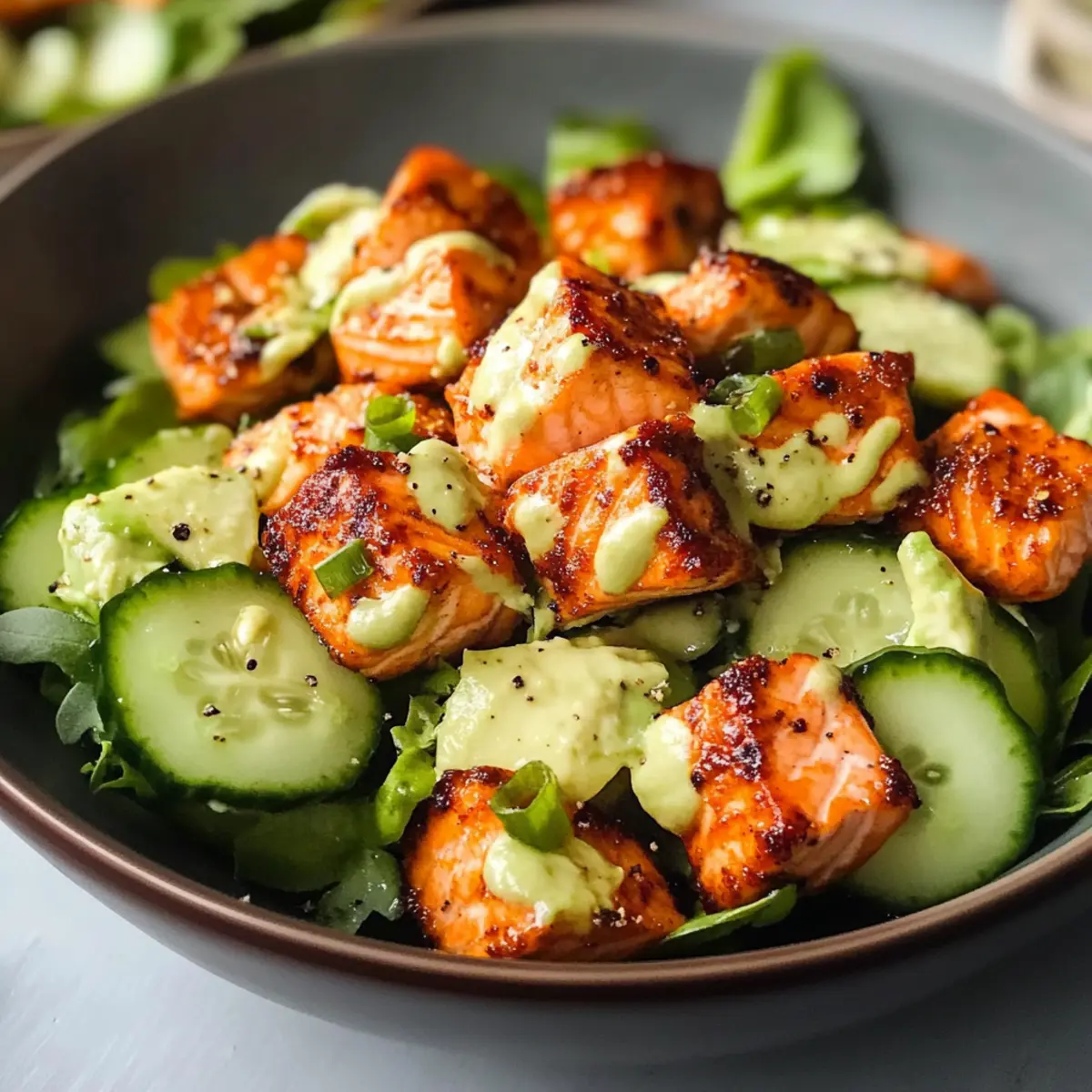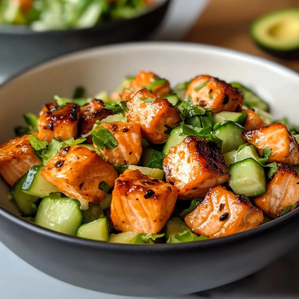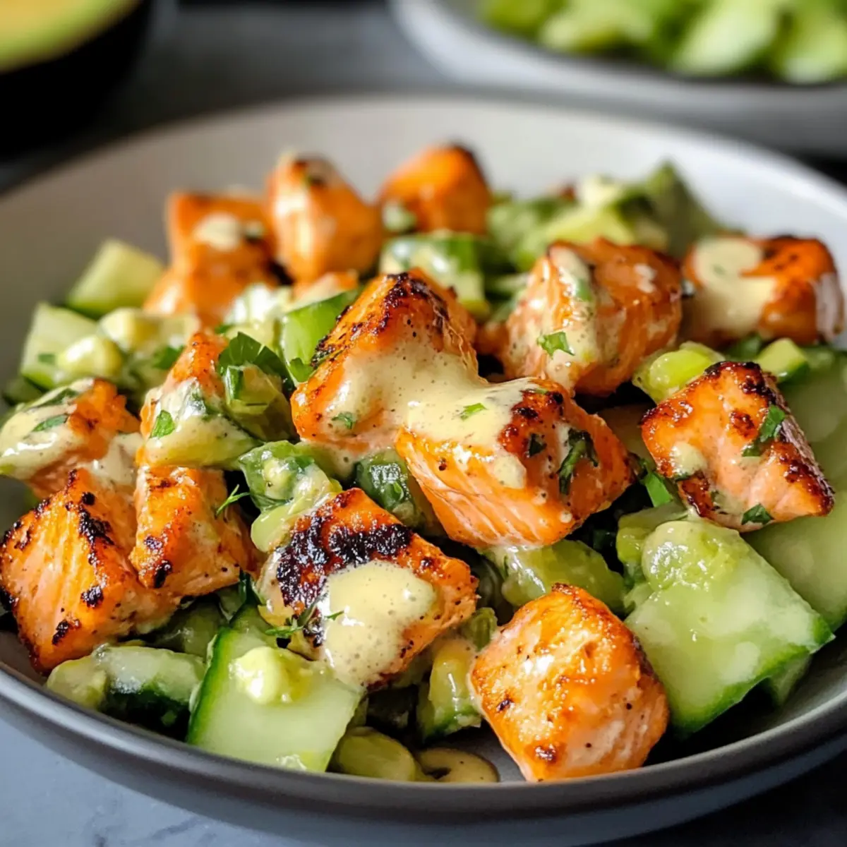 Während ich an diesem sonnigen Nachmittag in meiner Küche stand, traf mich plötzlich der verführerische Duft von frisch zubereitetem Fisch. Mein Herz schlug schnell, denn ich wusste, dass ich gerade das perfekte Gericht zubereitete: Bang Bang Lachs! Dieses Rezept ist nicht nur kinderleicht in nur 30 Minuten zubereitet, sondern auch ein absoluter Hingucker, der jedem Feinschmecker das Wasser im Mund zusammenlaufen lässt. Mit knusprigen Lachswürfeln, die in einer cremigen Mayo-Sauce gehüllt sind, und einem farbenfrohen Avocado-Gurken-Salat, ist es eine wahre Geschmacksexplosion und ideal für die ganze Familie. Wenn du nach einem schnellen, gesunden Abendessen suchst, das den Zauber eines Restaurantbesuchs in dein Zuhause bringt, bist du hier genau richtig. Was meinst du, bereit für ein wenig Küchenspaß? Warum wirst du dieses Rezept lieben? Schnelligkeit und Einfachheit: In nur 30 Minuten zubereitet – perfekt für hektische Abende! Erfrischender Geschmack: Die Kombination aus cremiger Sauce und knackigem Salat wird deine Geschmacksknospen verzaubern. Vielfältige Zubereitung: Egal, ob du den Lachs im Airfryer, im Ofen oder in der Pfanne zubereitest, der Geschmack bleibt unwiderstehlich! Gesund und Nahrhaft: Mit hochwertigem Omega-3 aus Lachs und gesunden Fetten aus Avocado ist dieses Gericht nicht nur köstlich, sondern auch nährstoffreich. Familienfreundlich: Kinder lieben den süßen Geschmack und die knusprige Textur – ein echter Hit für alle Altersgruppen! Kreative Variationen: Experimentiere mit verschiedenen Proteinen oder passe die Schärfe der Sauce an deinen Geschmack an und kreiere so immer wieder neue Genussmomente. Bang Bang Lachs Zutaten Für den Lachs Lachs – Wähle entweder ganze Filets oder gewürfelte Stücke für mehr Knusprigkeit. Chilisauce – Sorgt für Schärfe und Tiefe; passe die Menge nach deinem Geschmack an. Sojasauce – Fügt Umami und Salzigkeit hinzu; die Verwendung von natriumreduzierter Sojasauce ist möglich. Für die Sauce Mayonnaise – Ist die cremige Basis der Sauce; du kannst sie durch griechischen Joghurt ersetzen, um eine leichtere Variante zu erhalten. Honig – Balanciert die Geschmäcker mit Süße; als vegane Option kann auch Ahornsirup verwendet werden. Limettensaft – Bringt Frische und Aroma ins Gericht; frischer Saft ist ideal, aber im Notfall tut es auch der Bottled. Für den Salat Gurke – Sorgt für den knackigen Biss im Salat; kannst sie durch Radieschen für einen schärferen Geschmack ersetzen. Avocado – Fügt Cremigkeit hinzu; als Alternative kann auch gekochtes Edamame verwendet werden. Edamame-Bohnen – Bieten Protein und Farbe; frisch oder aufgetaut aus dem Gefrierfach ist empfehlenswert. Diese Zutaten machen deinen Bang Bang Lachs zu einem unvergleichlichen Geschmackserlebnis! Schritt-für-Schritt-Anleitung für Bang Bang Lachs mit Avocado-Curry-Salat Step 1: Sauce Zubereiten In einer Schüssel die Mayonnaise, Chilisauce, Sojasauce, Honig und Limettensaft gut vermengen. Diese cremige Mischung ist die Grundlage für die Bang Bang Sauce. Behalte einen Teil der Sauce zurück, um den Lachs später zu marinieren. Stelle die fertige Sauce für etwa 10 Minuten in den Kühlschrank, damit sie gut durchziehen kann. Step 2: Lachs Schneiden Den Lachs in kleine Würfel schneiden, um eine knusprige Textur zu erzielen. Die Würfel sollten gleichmäßig sein, damit sie gleichmäßig garen. In einer Schüssel mit den vorbereiteten Gewürzen und einem Teil der Bang Bang Sauce vermengen. Lasse den Lachs für 10 Minuten marinieren, damit er die Aromen aufnehmen kann. Step 3: Lachs Garen Wähle deine bevorzugte Zubereitungsmethode für den Lachs. Wenn du den Airfryer verwendest, stelle die Temperatur auf 200°C und gare die Lachswürfel für 8-10 Minuten, bis sie goldbraun sind. Alternativ kannst du den Lachs im Ofen bei 200°C für 12-15 Minuten backen oder in einer heißer Pfanne braten, bis eine knusprige Kruste entsteht. Step 4: Salat Zubereiten In einer Schüssel die gewürfelte Gurke und Avocado vorsichtig kombinieren. Um das Braunwerden der Avocado zu vermeiden, träufle kurz vor dem Servieren etwas Limettensaft darüber. Der Salat sollte frisch und knackig sein, um einen schönen Kontrast zum warmen Lachs zu bieten. Step 5: Anrichten und Servieren Die golden gebratenen Lachswürfel großzügig auf dem Avocado-Curry-Salat anrichten. Die restliche Bang Bang Sauce über den Lachs träufeln, um den Geschmack zu intensivieren. Serviere das Gericht warm oder genieße es als kühle Variante – es ist ein wahres Fest für die Sinne! Lagerungstipps für Bang Bang Lachs Zimmertemperatur: Nicht empfohlen, da der Bang Bang Lachs am besten frisch serviert wird. Vermeide, ihn bei Raumtemperatur zu lassen, um die Frische zu garantieren. Kühlschrank: Lagere Reste des Bang Bang Lachs in einem luftdichten Behälter für bis zu 3 Tage. Erwärme sie vorsichtig in der Mikrowelle oder in einer Pfanne, um die Knusprigkeit zu erhalten. Gefrierschrank: Du kannst den Lachs bis zu 3 Monate einfrieren, sollte jedoch vor dem Einfrieren in Portionen aufgeteilt und gut verpackt werden. Nach dem Auftauen erneut im Ofen oder in der Pfanne erhitzen, um Genussgefühl zurückzubringen. Salat Lagerung: Halte den Avocado-Gurken-Salat separat, um ein Braunwerden der Avocado zu vermeiden. Verwende ihn innerhalb von 2 Tagen und füge die Avocado kurz vor dem Servieren hinzu. Vorbereitung für deinen Bang Bang Lachs Diese Bang Bang Lachs-Zubereitung ist ideal für alle, die Zeit sparen möchten! Die Bang Bang Sauce kann bis zu eine Woche im Voraus zubereitet und in einem luftdichten Behälter im Kühlschrank aufbewahrt werden, um die Aromen gut durchziehen zu lassen. Den Salat kannst du bis zu zwei Tage im Voraus vorbereiten; beachte jedoch, die Avocado erst kurz vor dem Servieren hinzuzufügen, um ein Anlaufen zu verhindern. Wenn du bereit bist, das Gericht zu genießen, einfach den marinierten Lachs garen (im Airfryer, Ofen oder in der Pfanne) und auf dem f