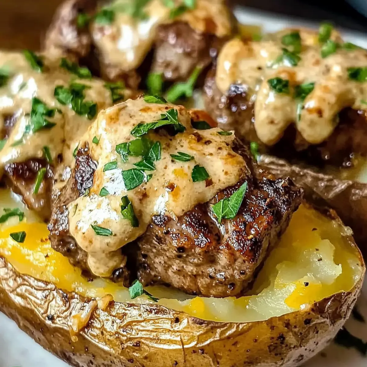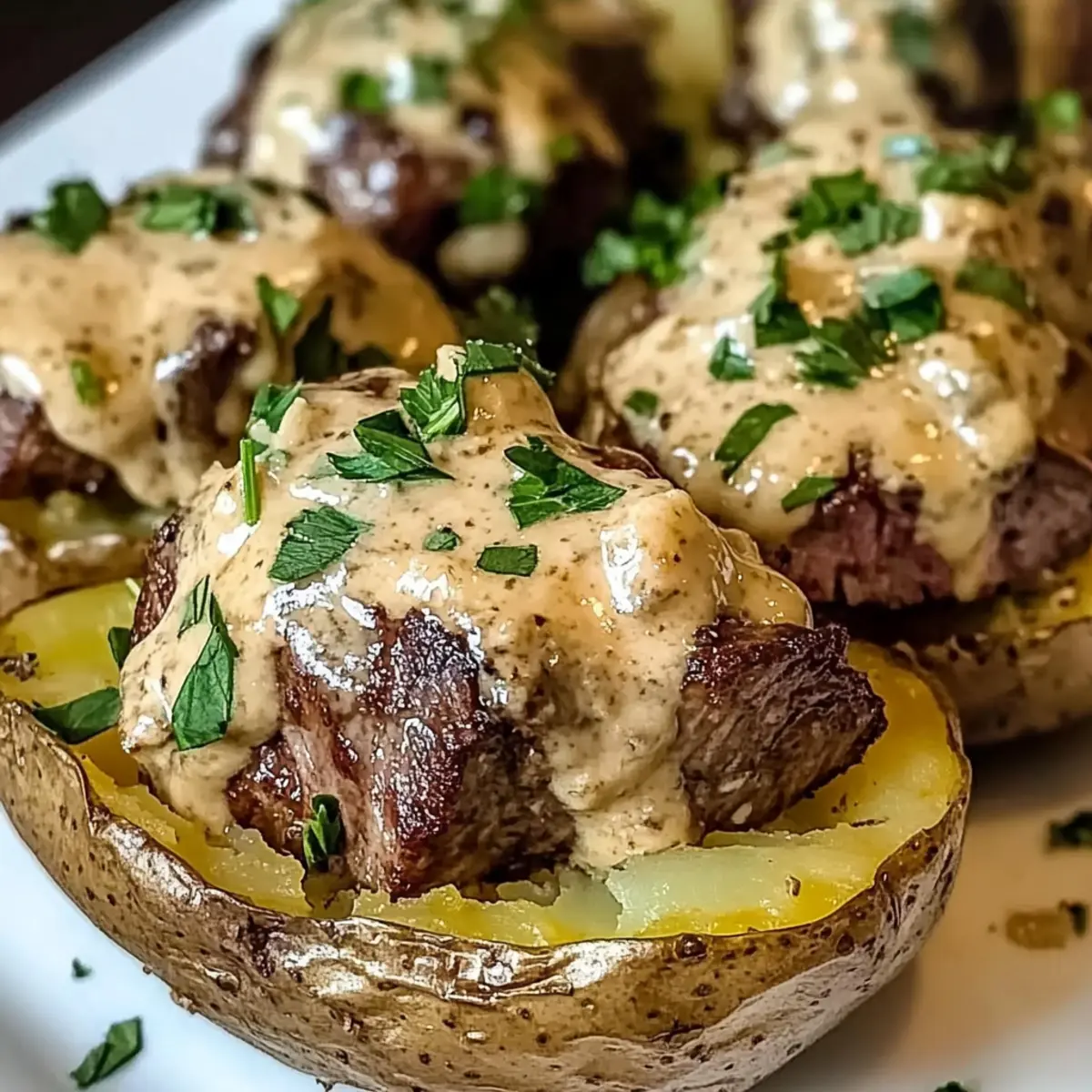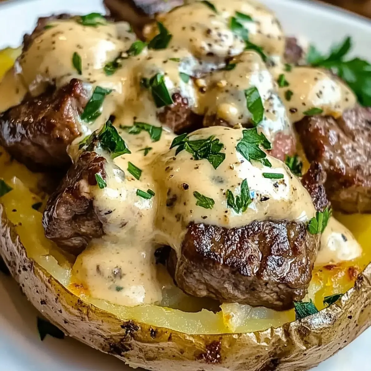 “Schau mal, was ich neulich entdeckt habe: eine Beladene Backkartoffel mit Steakstücken, die alles verändert! Diese köstliche Kombination aus luftigen, knusprigen Kartoffeln und zarten, aromatischen Steakstücken wird von einer cremigen Parmesansoße gekrönt, die schlichtweg zum Träumen einlädt. Perfekt für alle, die sich nach einem herzhaften Komfortessen sehnen, bietet dieses Rezept eine schnelle Zubereitung und ist unendlich personalisierbar. Stell dir vor, du kramst die perfekt gebackenen Kartoffeln aus dem Ofen und bereitest die Füllung nach deinem Geschmack zu – ganz gleich, ob du es scharf oder mild magst. Wer könnte da widerstehen? Lass uns gemeinsam in die Details eintauchen!” Warum wirst du dieses Rezept lieben? Einfachheit in Perfektion: Die Zubereitung ist kinderleicht und erfordert nur grundlegende Kochfähigkeiten, sodass auch Anfänger bestens zurechtkommen. Herzhafter Geschmack: Die Kombination aus zartem Steak und einer cremigen Parmesansoße sorgt für ein Geschmackserlebnis, das die Sehnsucht nach Komfortessen stillt. Vielfältige Anpassungsmöglichkeiten: Ob mit verschiedenen Käsesorten oder zusätzlichen Toppings wie knusprigem Bacon – deiner Kreativität sind keine Grenzen gesetzt! Zeitersparnis: Dieses Gericht benötigt keine langen Vorbereitungen. Ideal für ein schnelles Abendessen nach einem langen Tag. Beeindruckender Genuss: Mit seiner eleganten Präsentation wird deine Familie oder deine Gäste von dieser Gourmet-Optik begeistert sein. und wenn du noch mehr Ideen brauchst, schau dir auch unsere Variationen an! Beladene Backkartoffel Zutaten • Hier sind die Hauptzutaten für die perfekte Beladene Backkartoffel mit Steakstücken: Für die Kartoffeln Russet Kartoffeln – Die Grundlage für eine fluffige Textur; du kannst auch Süßkartoffeln verwenden, achte jedoch auf die Backzeit. Olivenöl – Sorgt für knusprige Haut; unverzichtbar für das beste Ergebnis. Meersalz – Verstärkt den Geschmack der Kartoffeln; Koscheres Salz funktioniert ebenfalls gut. Für die Steakstücken Steak – Zarte Fleischquelle; wähle zwischen Ribeye, Sirloin oder Filet, je nach Vorliebe und Budget. Koscheres Salz – Würze für das Steak; kann durch normalen Tischsalz ersetzt werden. Knoblauch – Für einen intensiven Geschmack; frischer Knoblauch ist ideal. Cajun-Gewürze – Bringt Würze ins Spiel; achte auf natriumarme Varianten, um die Salzaufnahme zu kontrollieren. Avocadoöl – Perfekt zum Braten; alternativ kannst du Raps- oder Sonnenblumenöl verwenden. Für die Creme-Soße Schlagsahne – Grundlage der Soße für Reichhaltigkeit; bereite eine leichtere Version mit Sahne vor, wenn gewünscht. Parmesankäse – Verleiht der Soße Tiefe; kannst auch Cheddar oder Blauschimmelkäse ausprobieren. Butter – Macht die Soße cremig und geschmackvoll; Margarine kann eine Alternative sein. Frische Petersilie – Für Frische und Garnierung; ersetze sie durch Schnittlauch oder Frühlingszwiebeln. Zitronensaft – Bringt Frische in die Soße; Essig kann im Notfall auch Verwendung finden. Rote Paprikaflocken – Für eine subtile Schärfe; optional, je nach Vorliebe. Schwarzer Pfeffer – Grundlegendes Gewürz für den gesamten Geschmack; nimm weißen Pfeffer für einen milderen Geschmack. Mit diesen Zutaten kannst du eine himmlische Beladene Backkartoffel mit Steakstücken zubereiten, die dir und deiner Familie das Wasser im Mund zusammenlaufen lässt! Schritt-für-Schritt-Anleitung für Beladene Backkartoffel mit Steakstücken Step 1: Kartoffeln backen Heize den Ofen auf 200 °C vor. Reibe die Russet-Kartoffeln mit Olivenöl ein und bestreue sie großzügig mit Meersalz. Lege sie direkt auf den Rost und backe die Kartoffeln für 45-60 Minuten, bis die Schale knusprig und das Innere weich ist, wenn du mit einer Gabel hineinstechst. Step 2: Steakstücke zubereiten Schneide das Steak in mundgerechte Stücke und würze sie mit koscherem Salz und Cajun-Gewürzen. Erhitze 2 Esslöffel Avocadoöl in einer Pfanne bei mittelhoher Hitze. Brate die Steakstücken in Portionen für 2-3 Minuten pro Seite, bis sie schön gebräunt sind. Füge in den letzten Minute gehackten Knoblauch hinzu. Nimm die Stücke aus der Pfanne und stelle sie beiseite. Step 3: Cremige Soße zubereiten In einem kleinen Topf erhitze die Schlagsahne bei mittlerer Hitze, bis sie sanft köchelt. Rühre dann Parmesan, Butter, Zitronensaft, rote Paprikaflocken und schwarzen Pfeffer ein, bis die Mischung schön homogen ist. Taste die Soße ab und passe die Würzung nach Belieben an. Step 4: Anrichten Sobald die Kartoffeln fertig sind, nimm sie aus dem Ofen. Schneide auf der Oberseite mit einem scharfen Messer einen Schlitz und lockere das Innenleben mit einer Gabel auf. Überfülle die Kartoffeln großzügig mit der cremigen Parmesansoße, setze die Steakstücke darauf und garniere sie mit frischer Petersilie für einen extra Farbtupfer. Aufbewahrung der Beladenen Backkartoffel mit Steakstücken Zimmertemperatur: Belassene Backkartoffel sollten nicht länger als 2 Stunden ungekühlt stehen, um die Frische und Sicherheit zu gewährleisten. Kühlschrank: Reste in einem luftdichten Behälter aufbewahren und innerhalb von bis zu 3 Tagen benötigen, um die beste Qualität der Beladenen Backkartoffel beizubehalten. Einfrieren: Für längere Lagerung können die Kartoffeln eingefroren werden. Wickeln Sie sie gut in Frischhaltefolie und dann in Alufolie ein. Sie bleiben bis zu 2 Monate frisch. Wiedereinfüllen: Zum Aufwärmen die gefrorenen Beladenen Backkartoffeln über Nacht im Kühlschrank auftauen und dann im Ofen oder in der Mikrowelle sanft erhitzen, um ein Austrocknen des Steakstücks zu vermeiden. Expertentipps für Beladene Backkartoffel Hochwertiges Steak wählen: Verwende frisches, qualitativ hochwertiges Steak für den besten Geschmack und die saftigsten Steakstücke in deiner Beladenen Backkartoffel. Ruhen lassen: Lass das Steak nach dem Braten ruhen, um die Säfte zu bewahren. So bleibt es zart u