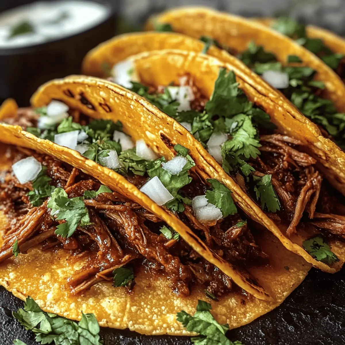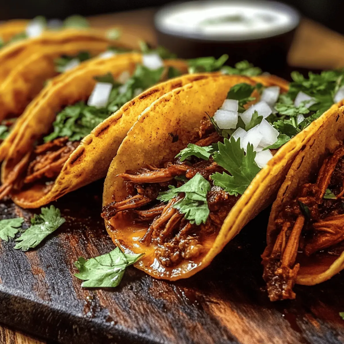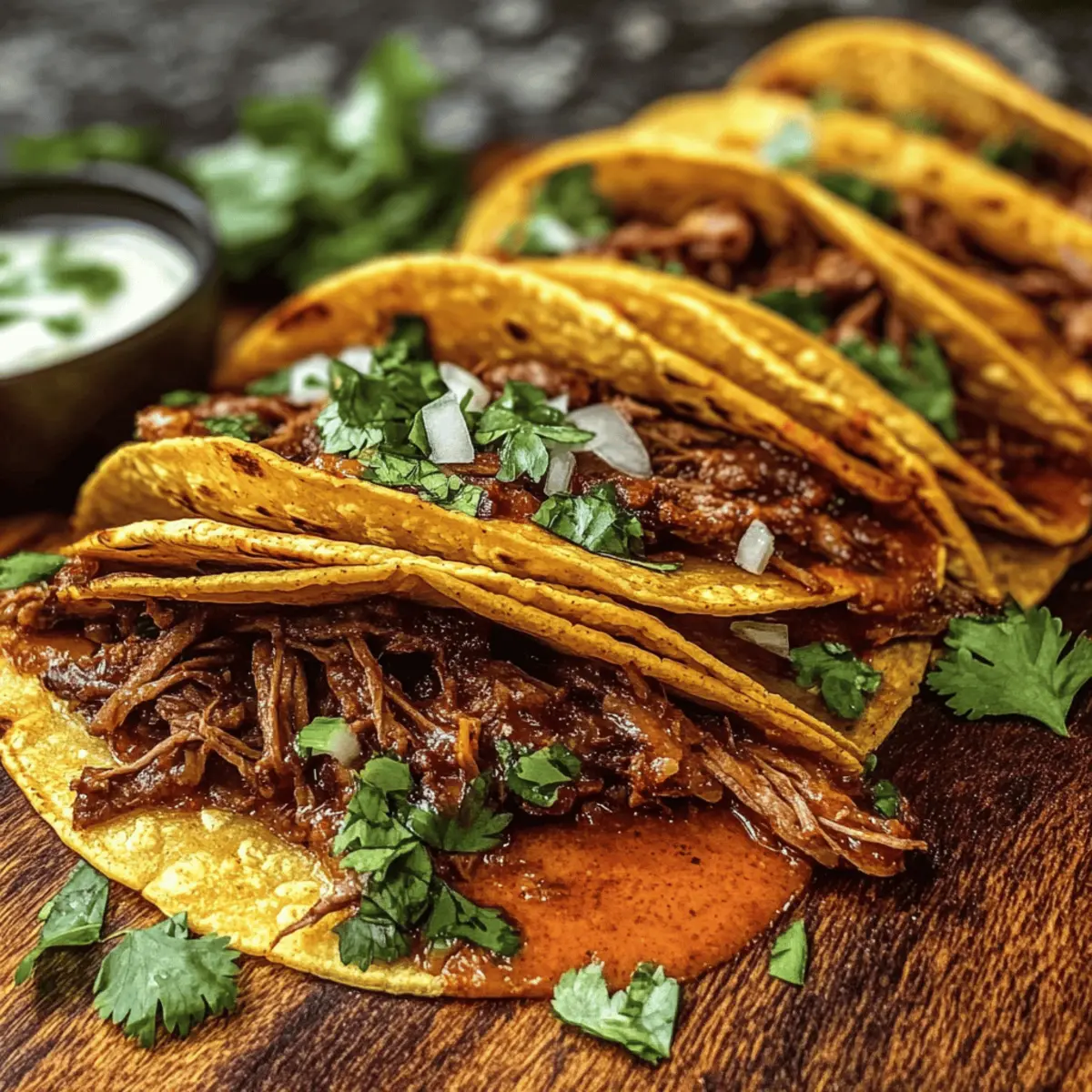 Der Duft von frisch gebratenen Tacos kann einen sofort in ein kleines mexikanisches Paradies versetzen. Und genau das habe ich erlebt, als ich meine Cheesy Birria Tacos ausprobiert habe – eine vereinfachte Version dieses klassisch köstlichen Gerichts. Dieses Rezept vereint unverwechselbare Aromen und eine kinderleichte Zubereitung, perfekt für alle, die eine schnelle und zufriedenstellende Mahlzeit suchen. Die Kombination aus zartem, langsam gekochtem Rindfleisch und geschmolzenem Käse, eingewickelt in knusprige Tortillas, bringt den authentischen Geschmack der mexikanischen Küche direkt in deine Küche – ohne stundenlanges Kochen! Bist du bereit, deinen Gaumen mit diesem schnellen Komfortessen zu verwöhnen? Warum wirst du diese Tacos lieben? Einfachheit, die begeistert: Die Zubereitung der Cheesy Birria Tacos ist kinderleicht, sodass auch unerfahrene Köche schnell in den Genuss kommen. Geschmacksexplosion: Die Kombination aus rauchigen Chiles und zartem Rindfleisch sorgt für ein unvergleichliches Geschmackserlebnis. Vielseitigkeit: Ob als Snack oder Hauptgericht, diese Tacos passen zu allen Anlässen und lassen sich nach Belieben abwandeln. Wenig Aufwand, großer Genuss: Dank der verkürzten Kochzeit kannst du die authentischen Aromen Mexikos in kürzester Zeit erleben. Perfekt für Geselligkeit: Wirklich jeder wird von diesen Tacos begeistert sein – ideal für gesellige Abende mit Freunden oder der Familie. Entdecke auch unsere Nährwertangaben für eine ausgewogene Ernährung samt dieser köstlichen Tacos! Cheesy Birria Tacos Zutaten • Für das Fleisch Rindfleisch (2½ lbs) – Das Hauptprotein; zart und aromatisch, wenn es langsam gekocht wird; man kann auch Kurzrippen verwenden. Salz & Pfeffer – Essentiell für die richtige Würze; nach Geschmack verwenden. Neutrales Öl (1 EL) – Zum Anbraten des Fleisches; Avocado- oder Pflanzenöl sind gute Alternativen. • Für die Sauce Getrocknete Guajillo-Chilis (3) – Fügen einen reichen, rauchigen Geschmack hinzu; können durch andere getrocknete Chilis ersetzt werden. Getrocknete Ancho-Chilis (2) – Trägt zur Süße und Tiefe bei; optional, aber empfohlen für einen besonderen Geschmack. Chipotle-Pfeffer in Adobo (1) – Fügt Schärfe und Reichhaltigkeit hinzu; nach Würzgeschmack mehr oder weniger verwenden. Zwiebel (1 große, gehackt) – Verleiht Süße und Tiefe; lässt sich auch durch Schalotten ersetzen. Knoblauch (4 Zehen, geschält) – Verstärkt den Gesamtgeschmack; frischer Knoblauch ist wichtig. Getrockneter Oregano (2 TL, vorzugsweise mexikanisch) – Bringt Erdigkeit; mediterraner Oregano kann auch verwendet werden. Gemahlener Kreuzkümmel (1 TL) – Fügt Wärme und eine erdige Note hinzu; Koriander kann auch als Alternative verwendet werden. Zimt (½ TL) – Ergänzt die Reichhaltigkeit des Rindfleischs; frischen Zimt verwenden für optimalen Geschmack. Lorbeerblätter (2) – Aromatische Basis, die den Geschmack der Brühe verstärkt; nicht konsumieren. • Für die Tacos Rinderbrühe oder Wasser (4 Tassen) – Zum Erstellen der Suppenbasis; natriumarme Brühe ist empfehlenswert. Mais-Tortillas (12) – Die traditionelle Umhüllung für die Tacos; Weizentortillas sind auch möglich, aber Mais ist klassisch. Geriebener Käse (2 Tassen, Oaxaca oder Monterey Jack) – Sorgt für eine cremige, schmelzende Textur; Cheddar kann auch verwendet werden. Gehackter Koriander & Zwiebel – Frische Toppings, die Helligkeit hinzufügen; können durch Frühlingszwiebeln ersetzt werden. Limettenviertel – Zum Servieren; unverzichtbar für einen frischen Geschmack. Erlebe mit diesen Cheesy Birria Tacos den ultimativen Genuss und bringe ein Stück mexikanischer Küche direkt auf deinen Tisch! Step-by-Step Instructions für Cheesy Birria Tacos Step 1: Fleisch vorbereiten Schneide das Rindfleisch in 3–4 große Stücke und würze es großzügig mit Salz und Pfeffer. Dies sorgt dafür, dass das Fleisch beim Kochen gut schmeckt. Lass das gewürzte Fleisch beiseite, während du dich um den nächsten Schritt kümmerst. Step 2: Fleisch anbraten Erhitze das Öl in einem Dutch Oven bei mittlerer Hitze. Brate das Rindfleisch auf allen Seiten für jeweils 2–3 Minuten an, bis es schön gebräunt ist. Achte darauf, dass die Oberfläche eine goldene Farbe annimmt, bevor du das Fleisch aus dem Topf nimmst und beiseitelegst. Step 3: Chilis rösten Gib in den gleichen Topf die Guajillo- und Ancho-Chilis und röste sie für 30 Sekunden, bis sie aromatisch riechen. Achte darauf, dass sie nicht verbrennen. Anschließend lege die gerösteten Chilis in heißes Wasser und lasse sie 5–10 Minuten einweichen, bis sie weich sind. Step 4: Sauce pürieren Lass die eingeweichten Chilis abtropfen und gebe sie in einen Mixer. Füge Chipotle, Zwiebel, Knoblauch, Oregano, Kreuzkümmel, Zimt, Essig und 1 Tasse Brühe hinzu. Mixe alles, bis eine glatte Sauce entsteht. Für eine feiner Textur kannst du die Sauce durch ein Sieb gießen, bevor du sie weiterverwendest. Step 5: Birria schmoren Lege das angebratene Rindfleisch zurück in den Topf und gieße die pürierte Sauce darüber. Füge so viel Brühe hinzu, bis das Fleisch bedeckt ist, und füge die Lorbeerblätter hinzu. Lass alles auf niedriger Hitze für 2–2½ Stunden köcheln, bis das Fleisch zart ist. Alternativ kannst du einen Schnellkochtopf (45 Minuten) oder einen Slow Cooker (6–8 Stunden auf niedrig) verwenden. Step 6: Fleisch zerkleinern Entferne das Rindfleisch aus dem Topf und zerkleinere es mit zwei Gabeln. Das Fleisch sollte sehr zart sein und leicht auseinanderfallen. Gib das zerkleinerte Fleisch zurück in den Topf mit der Sauce, um es warm zu halten und die Aromen zu vereinen. Step 7: Tacos zusammenstellen Erhitze eine Pfanne bei mittlerer Hitze und tauche die Mais-Tortillas kurz in die Birria-Sauce, um sie zu benetzen. Fülle jede Tortilla mit zerkleinertem Rindfleisch und Käse. Falte die Tortilla und brate sie 2–3 Minuten pro Seite, bis sie knusprig und goldbraun sind. 