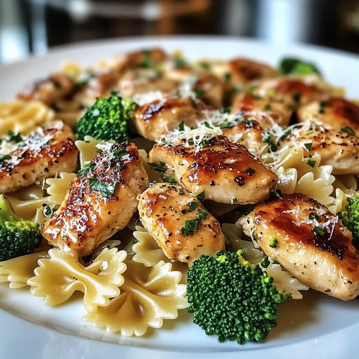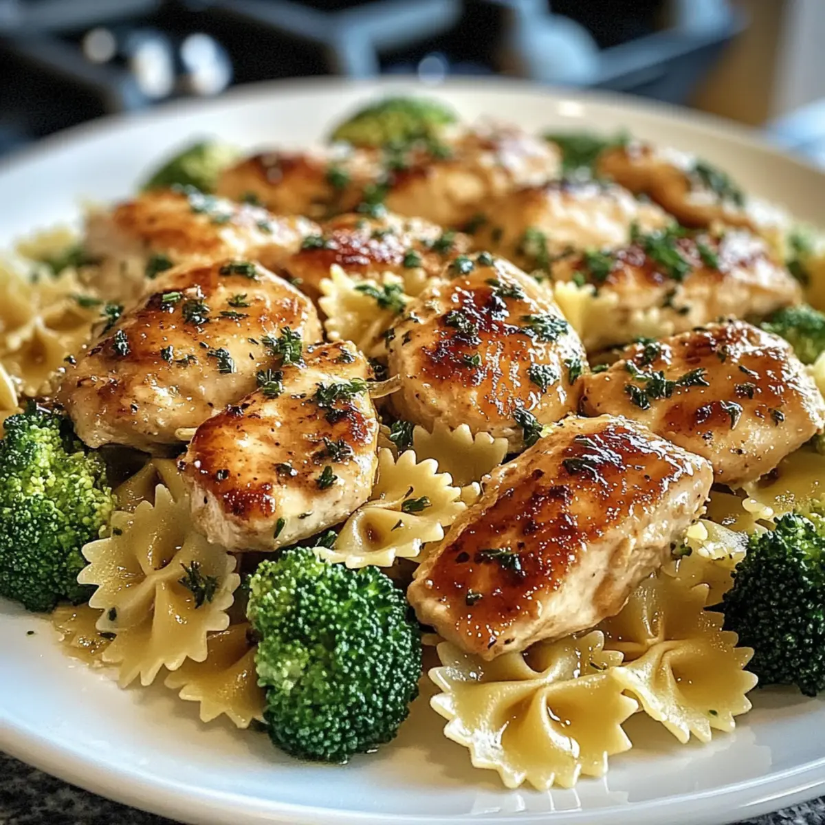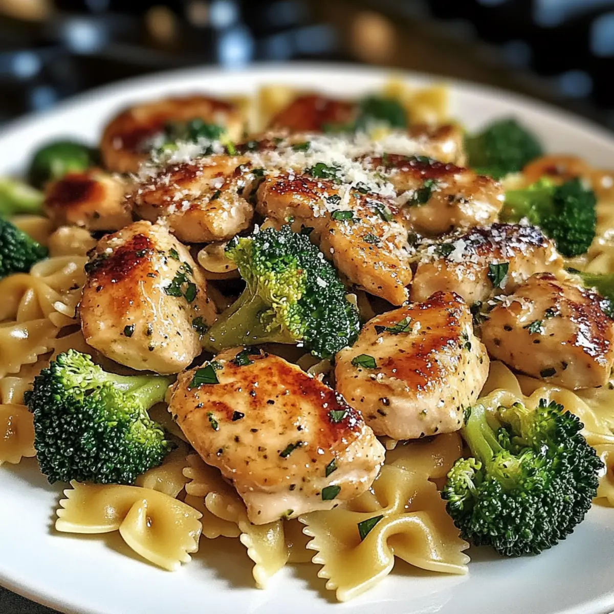 „Hast du schon einmal überlegt, wie sich ein köstliches Gericht mit den Aromen des Wilden Westens anfühlen könnte, während du in der heimischen Küche stehst? Das Cowboy-Butter-Zitronen-Schmetterlingshähnchen mit Brokkoli ist genau das – eine wunderbare Mischung aus zarten Hähnchenstücken und einer cremig-zesty Sauce, die dich direkt in die Gemütlichkeit eines kleinen Bistro-Cafés katapultiert. Und das Beste daran? Du kannst dieses einfache, schnelle Abendessen in weniger als einer Stunde zubereiten, perfekt für beschäftigte Familienabende. Sorgfältig kombiniert mit hellem Brokkoli und al dente Schmetterlingsnudeln, erwartet dich ein Gericht, das sogar die wählerischsten Esser am Tisch begeistert. Bist du bereit, deinen nächsten kulinarischen Triumph zu erleben?“ Warum wird dieses Rezept geliebt? Einfachheit: Die Zubereitung des Cowboy-Butter-Zitronen-Schmetterlingshähnchens ist kinderleicht und benötigt nur grundlegende Kochkünste. Schneller Genuss: In weniger als 60 Minuten genießt deine Familie ein herzhaftes, leckeres Abendessen. Wandelbar: Du kannst die Zutaten anpassen, indem du Gemüse tauschst oder verschiedene Nudelsorten verwendest, was für Abwechslung sorgt. Köstliche Aromen: Die Kombination aus Zitronenfrische und dem würzigen Cajun-Geschmack sorgt für eine Geschmacksexplosion, die alle begeistert. Familienfreundlich: Dieses Gericht ist so lecker, dass selbst die wählerischsten Esser am Tisch mehr wollen werden! Wenn du auf der Suche nach weiteren schnellen Rezepten bist, schau dir unser Schnelle Abendessen an! Cowboy-Butter-Zitronen-Schmetterlingshähnchen-Zutaten • Für das Hähnchen Hähnchenbrustfilets ohne Haut – Die Hauptproteinquelle; kann durch Hähnchenschenkel ersetzt werden, um mehr Saftigkeit zu erzielen. Cajun-Gewürz – Verleiht eine würzige Note; kann durch deine bevorzugte Gewürzmischung ersetzt werden. Knoblauchpulver – Verstärkt den herzhaften Geschmack; frischer Knoblauch ist für mehr Aroma eine tolle Option. • Für die Sauce Olivenöl – Erforderlich zum Anbraten des Hähnchens; butter kann für einen reichhaltigeren Geschmack verwendet werden. Ungesalzene Butter – Entscheidend für die Herstellung der Zitronensauce; gesalzene Butter kann auch verwendet werden. Frischer, gehackter Knoblauch – Für ein intensives Aroma; mehr kann hinzugefügt werden, wenn du es kräftiger magst. Dijon-Senf – Fügt der Sauce eine scharfe Note hinzu; gelber Senf kann ebenfalls verwendet werden. Zitronenzesten und -saft – Bringt Frische und ist für den unverwechselbaren Zitronengeschmack unentbehrlich. Rote Paprikaflocken – Optionale Schärfe; kann für eine mildere Variante weggelassen werden. • Für die Pasta und Gemüse Schmetterlingsnudeln (Farfalle) – Basis des Gerichts; kann durch Penne, Rotini oder Muscheln ersetzt werden. Brokkoliröschen – Für Farbe und Nährstoffe; kann auch durch andere Gemüse wie Spargel oder Erbsen ersetzt werden. • Für die Garnitur Frische Petersilie und Schnittlauch – Für Frische und als Garnitur; andere Kräuter wie Basilikum oder Thymian können verwendet werden. Parmesankäse – Für Cremigkeit und zusätzlichen Geschmack; kann durch Pecorino oder Nährhefe als vegane Alternative ersetzt werden. • Für die Sauce-Konsistenz Beiseite gelassenes Nudelwasser – Hilft, die Konsistenz der Sauce anzupassen und ist wichtig für einen seidigen Abschluss. Das Cowboy-Butter-Zitronen-Schmetterlingshähnchen mit Brokkoli ist nicht nur ein schnelles und leckeres Abendessen, sondern kann auch an die Vorlieben deiner Familie angepasst werden! Schritt-für-Schritt-Anleitung für Cowboy-Butter-Zitronen-Schmetterlingshähnchen mit Brokkoli Step 1: Wasser zum Kochen bringen Fülle einen großen Topf mit Wasser und füge ausreichend Salz hinzu. Bring das Wasser zum Kochen und koche die Schmetterlingsnudeln für etwa 8–10 Minuten, bis sie al dente sind. Füge in den letzten 3 Minuten die Brokkoliröschen hinzu, damit sie bissfest bleiben. Step 2: Nudeln und Brokkoli abgießen Sobald der Kochzeitraum abgelaufen ist, hebe ½ Tasse des Nudelwassers ab, um es später für die Sauce zu verwenden. Gieße dann die Nudeln und den Brokkoli in einem Sieb ab und stelle sie beiseite, damit sie abtropfen können. Step 3: Hähnchen würzen Nimm die Hähnchenbrustfilets und würze sie gleichmäßig mit Cajun-Gewürz, Knoblauchpulver, geräuchertem Paprikapulver, Salz und schwarzem Pfeffer. Achte darauf, dass die Gewürze gut auf beiden Seiten verteilt sind, um ein maximales Aroma im Cowboy-Butter-Zitronen-Schmetterlingshähnchen zu gewährleisten. Step 4: Hähnchen anbraten Erhitze das Olivenöl in einer großen, beschichteten Pfanne bei mittelhoher Hitze. Lege die gewürzten Hähnchenbrustfilets in die Pfanne und brate sie etwa 6–7 Minuten lang an, bis sie goldbraun sind. Wende die Hähnchenstücke vorsichtig, um eine gleichmäßige Bräunung zu erreichen, und entferne sie dann aus der Pfanne. Step 5: Sauce zubereiten Reduziere die Hitze auf mittlere Stufe und füge die ungesalzene Butter in die gleiche Pfanne hinzu. Lass sie schmelzen und verwende einen Spatel, um die braunen Reste vom Pfannenboden zu lösen und in die Sauce zu integrieren. Dies verleiht dem Cowboy-Butter-Zitronen-Schmetterlingshähnchen zusätzlichen Geschmack. Step 6: Knoblauch und Gewürze hinzufügen Sobald die Butter geschmolzen ist, füge den frisch gehackten Knoblauch hinzu und brate ihn etwa 1 Minute lang an, bis er duftet. Rühre die roten Paprikaflocken, den Dijon-Senf, den Zitronensaft und die Zitronenzesten unter; schmecke die Sauce nach Belieben mit Salz und Pfeffer ab. Step 7: Zutaten kombinieren Gib das angebratene Hähnchen, die abgetropften Schmetterlingsnudeln und den Brokkoli zurück in die Pfanne. Tossiere alles gut in der heißen Sauce, sodass die Nudeln und das Gemüse gleichmäßig bedeckt sind. Wenn die Sauce zu dick ist, füge schrittweise etwas vom reservierten Nudelwasser hinzu, um die gewünschte Konsistenz