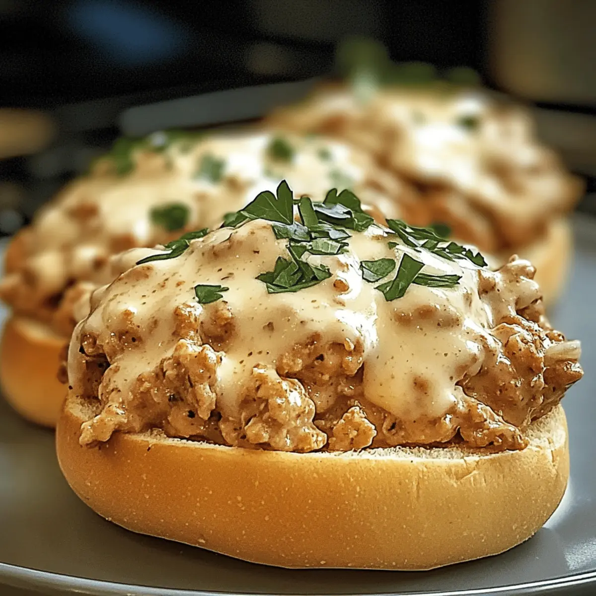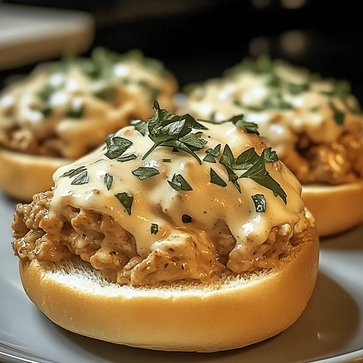 Wenn ich an den letzten gemütlichen Abend mit Freunden denke, fällt mir sofort die gesellige Atmosphäre ein, die von köstlichem Essen begleitet wurde. Diese Chicken Alfredo Sloppy Joes haben dabei alle Blicke auf sich gezogen! Diese einzigartige Fusion verbindet das klassische Gefühl von cremigem Chicken Alfredo mit der rustikalen Spritzigkeit von Sloppy Joes. In nur wenigen Minuten auf den Tisch gezaubert, sind sie das perfekte Komfortessen für entspannte Abende zu Hause oder gesellige Zusammenkünfte. Die zarte Füllung aus magerem Hähnchen und aromatischem Knoblauch, eingebettet in eine reichhaltige Alfredo-Sauce, macht jeden Biss zu einem herzlichen Erlebnis. Und das Beste? Sie lassen sich leicht anpassen und können nach Belieben mit frischen Zutaten verfeinert werden. Neugierig, wie einfach dieses Rezept zuzubereiten ist? Lass uns gleich loslegen! Warum wirst du dieses Rezept lieben? Einzigartige Fusion: Diese Chicken Alfredo Sloppy Joes kombinieren zwei beliebte Klassiker auf eine köstliche Weise, die jeden überrascht. Schnelle Zubereitung: In weniger als 30 Minuten kannst du dieses Gericht zaubern, ideal für stressige Abende. Cremiger Geschmack: Die Kombination aus schwerer Sahne und Parmesan sorgt für einen unvergleichlich reichhaltigen Genuss. Vielseitig: Perfekt anpassbar – füge Gemüse oder deine Lieblingskäse hinzu, um neue Geschmacksebenen zu entdecken. Geselliges Essen: Diese Sandwiches sind ideal für gesellige Abende mit Freunden oder als bequemes Familienessen, das alle mögen werden. Du wirst begeistert sein von der Leichtigkeit der Zubereitung und dem vollen Geschmack! Wenn du nach weiteren schnellen und unkomplizierten Rezepten suchst, schau dir auch meine Thai Sloppy Joe oder andere Variationen an! Chicken Alfredo Sloppy Joe Zutaten Für die Füllung • Gemahlenes Hähnchen – Hauptproteinquelle für eine herzhafte Füllung; kann durch mageres Putenfleisch ersetzt werden. • Olivenöl – Essentiell zum Anbraten, fügt gesunde Fette und Geschmack hinzu; kann durch Pflanzenöl ersetzt werden. • Zwiebel (fein gehackt) – Sorgt für Süße und tiefen Geschmack; Schalotten können für einen milderen Geschmack verwendet werden. • Knoblauch (gehackt) – Verbessert das gesamte Geschmacksprofil; frischer Knoblauch ist für das beste Aroma vorzuziehen. Für die Alfredo-Sauce • Schlagsahne – Basis der Alfredo-Sauce, sorgt für Reichhaltigkeit; halb-halb oder fettreduzierte Sahne für eine leichtere Version verwenden. • Parmesankäse (gerieben) – Fügt eine herzhafte Umami-Note und Cremigkeit hinzu; Grana Padano bietet einen ähnlichen Geschmack. • Italienisches Gewürz – Mischungen von Kräutern zur Geschmacksverbesserung; frische Kräuter können ebenfalls verwendet werden. • Salz und Pfeffer – Essenzielle Gewürze für den Geschmack; nach Belieben anpassen. Für die Sandwiches • Hamburgerbrötchen – Halten die Füllung und bilden die Grundstruktur des Gerichts; Vollkorn- oder glutenfreie Brötchen können verwendet werden. • Frische Petersilie (gehackt) – Garnitur für Frische und Farbe; Basilikum bietet ein anderes Geschmacksprofil. Diese Chicken Alfredo Sloppy Joes sind der perfekte Komfortspeise, die sich schnell und einfach zubereiten lässt! Schritt-für-Schritt-Anleitung für Cremige Chicken Alfredo Sloppy Joes Step 1: Hähnchenmischung vorbereiten Erhitze das Olivenöl in einer großen Pfanne bei mittlerer Hitze. Füge die fein gehackte Zwiebel hinzu und brate sie für etwa 3-4 Minuten, bis sie glasig ist. Gib den gehackten Knoblauch dazu und brate ihn für weitere 1-2 Minuten an, bis er aromatisch ist. Füge das gemahlene Hähnchen hinzu und koche es 5-7 Minuten lang, bis es nicht mehr rosa ist, während du gelegentlich umrührst. Step 2: Alfredo-Sauce zubereiten Reduziere die Hitze und füge die Schlagsahne zur Hähnchenmischung hinzu, wobei du gut umrührst, um alles zu kombinieren. Füge nach und nach den geriebenen Parmesan hinzu und rühre kontinuierlich, bis der Käse schmilzt und die Sauce cremig ist (ca. 2-3 Minuten). Würze die Sauce mit italienischem Gewürz, Salz und Pfeffer und passe die Konsistenz mit Hühnerbrühe oder Wasser an. Step 3: Sloppy Joes zusammenstellen Toaste die Hamburgerbrötchen leicht im Ofen oder in einer Pfanne, bis sie goldbraun sind. Löffle die Hähnchen-Alfredo-Mischung großzügig auf die untere Hälfte jedes Brötchens. Wenn gewünscht, streue zusätzlich Parmesan über die Füllung, bevor du die obere Brötchenhälfte daraufsetzt. Step 4: Servieren und Garnieren Richte die Sandwiches auf einem Servierteller an und garniere sie mit frisch gehackter Petersilie für einen Farbtupfer. Wenn du möchtest, serviere sie mit knusprigen Pommes oder einem frischen Salat, um die reichhaltigen Aromen der Cremigen Chicken Alfredo Sloppy Joes auszugleichen. Lagerungstipps für Chicken Alfredo Sloppy Joes Zimmertemperatur:: Lasse die Chicken Alfredo Sloppy Joes nicht länger als 2 Stunden bei Raumtemperatur stehen, um ein Verderben zu vermeiden. Kühlschrank:: Bewahre übrig gebliebene Füllung in einem luftdichten Behälter im Kühlschrank auf, wo sie bis zu 3 Tage frisch bleibt. Gefrierschrank:: Die Füllung kann bis zu 2 Monate eingefroren werden. Achte darauf, sie in einem gefrierfreundlichen Behälter oder Beutel aufzubewahren. Wiedererwärmen:: Beim Wiedererwärmen die gefrorene Füllung über Nacht im Kühlschrank auftauen lassen und dann sanft in einer Pfanne oder Mikrowelle erhitzen. Halte die Brötchen separat, um sie frisch und knusprig zu halten. Perfekte Vorbereitung für Cremige Chicken Alfredo Sloppy Joes Die Cremigen Chicken Alfredo Sloppy Joes sind ideal, um sie im Voraus zuzubereiten und dir wertvolle Zeit an hektischen Abenden zu sparen! Du kannst die Hähnchenmischung bis zu 3 Tage im Kühlschrank aufbewahren, solange sie in einem luftdichten Behälter gelagert wird. Bereite die Mischung einfach vor, indem du die Zwiebel und den Knoblauch anbrätst, gefolgt vom Kochen des H
