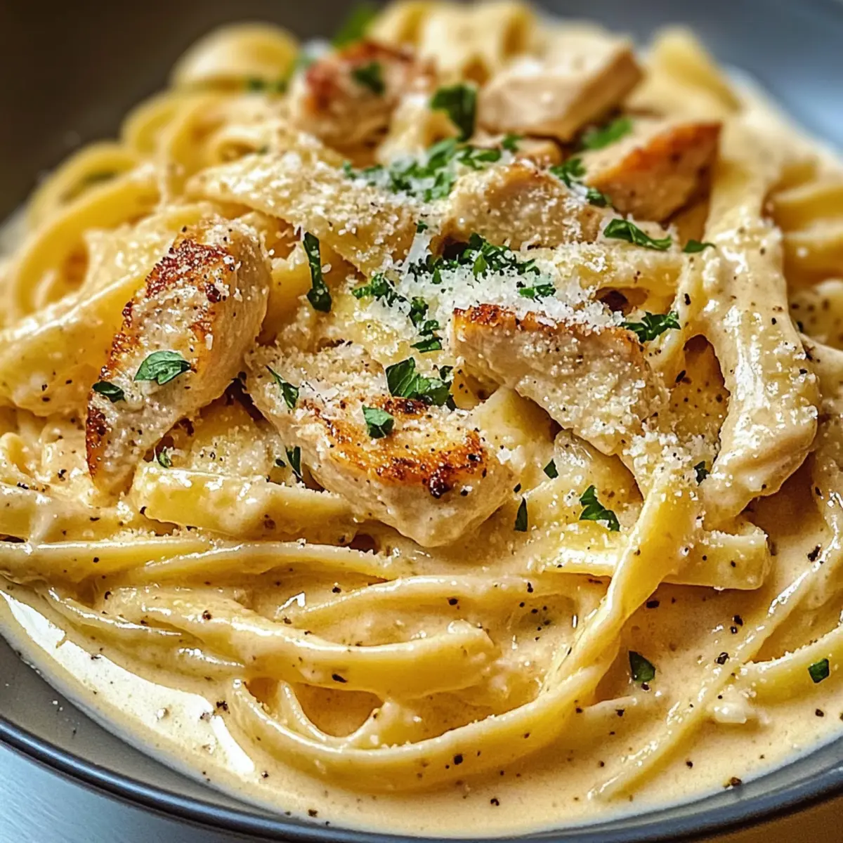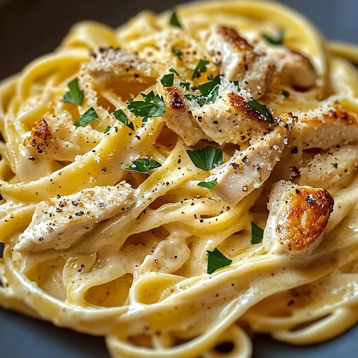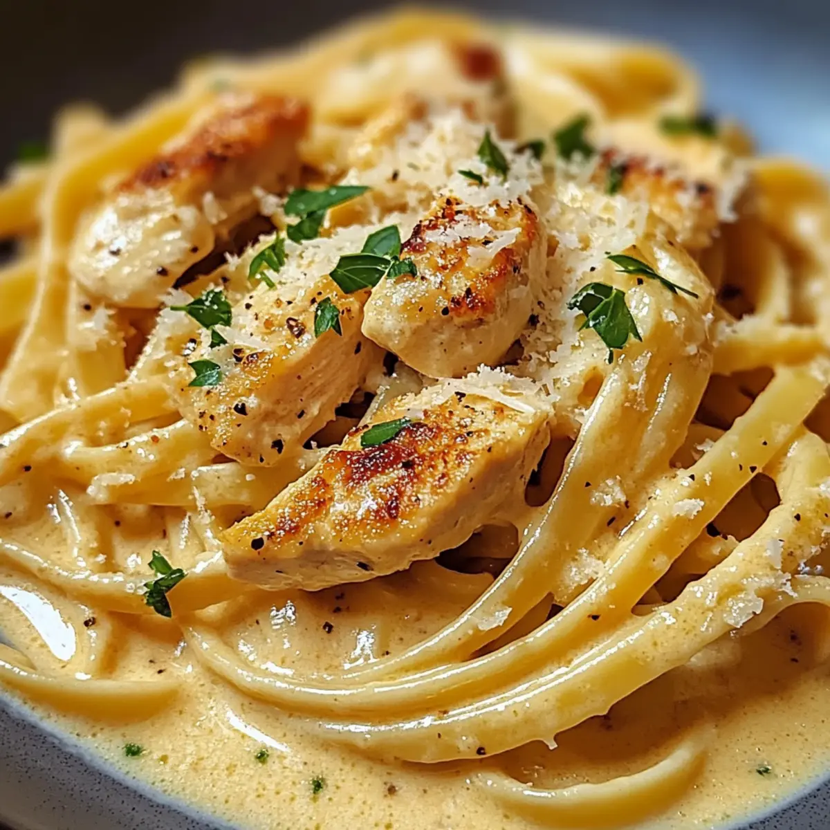Wie oft standen wir nach einem langen Tag in der Küche und sehend nach einer schnellen, aber dennoch schmackhaften Lösung? Der Pizzastand schien eine verlockende Option, doch ich wusste, dass es etwas Besseres gibt. Die Lösung, auf die ich stieß, sind Cremige Hähnchen-Alfredo-Nudeln – ein Gericht, das nicht nur in unter 30 Minuten zubereitet ist, sondern auch die Herzen der ganzen Familie im Sturm erobert. Die Kombination aus zartem Hähnchen, sättigenden Fettuccine und einer angenehm cremigen Sauce mit frisch geriebenem Parmesan macht es zur perfekten Wahl für ein gemütliches Abendessen unter der Woche. Außerdem ist dieses Rezept so anpassungsfähig, dass es sich leicht zu einer gesunden Variante oder mit etwas Gemüse aufpeppen lässt. Habt ihr euch schon gefragt, wie ihr eure nächste Pasta noche aufpeppen könnt? Lasst uns gemeinsam eintauchen! Warum werden Sie dieses Rezept lieben? Einfachheit: Die Zubereitung der Cremigen Hähnchen-Alfredo-Nudeln ist kinderleicht und benötigt nur grundlegende Kochfähigkeiten. Schnell und praktisch: In weniger als 30 Minuten haben Sie ein wohlschmeckendes Gericht auf dem Tisch, perfekt nach einem langen Tag. Wohlfühl-Geschmack: Die nussige Note des frisch geriebenen Parmesans harmoniert großartig mit der cremigen Sauce und dem zarten Hähnchen. Vielseitig: Dieses Rezept kann ganz nach Ihrem Geschmack angepasst werden, sei es durch das Hinzufügen von Gemüse oder das Austauschen des Hähnchens gegen Garnelen. Familienfreundlich: Es begeistert Jung und Alt, und die einfache Zubereitung sorgt dafür, dass alle zusammen in den Genuss dieser köstlichen Pasta kommen. Zudem können Sie unsere Lagerungstipps nutzen, um sicherzustellen, dass die Reste auch am nächsten Tag noch lecker sind! Cremige Hähnchen-Alfredo-Nudeln Zutaten • Entdecken Sie die köstlichen Zutaten für dieses einfache Gericht! Für die Nudeln Fettuccine – Diese Nudeln sind ideal, da sie die cremige Sauce perfekt halten; auch andere Pastasorten sind möglich. Für das Hähnchen Hähnchenbrustfilet – Die Hauptproteinquelle; kann durch Putenbrust oder Tofu für eine vegetarische Variante ersetzt werden. Für die Sauce Sahne – Sie verleiht der Sauce ihren reichen Geschmack; schwere Sahne ist am besten, während Halbfettversionen leichter sind. Parmesan – Für den nussigen, salzigen Geschmack; frisch gerieben ist optimal und Pecorino Romano kann für mehr Intensität verwendet werden. Knoblauch – Frischer Knoblauch bringt das beste Aroma; alternativ kann Knoblauchpulver verwendet werden. Butter – Zum Sautieren; bringt zusätzlichen Geschmack; Olivenöl ist eine gesündere Alternative. Italiene Gewürze – Optional für mehr Aroma; wegzulassen ist auch eine Möglichkeit für einen einfacheren Geschmack. Salz und Pfeffer – Unverzichtbar für die Würze; je nach Geschmack anpassen. Für die Garnitur Frische Petersilie – Sorgt für einen frischen Touch; kann durch Basilikum ersetzt oder ganz weggelassen werden. Machen Sie sich bereit, diese Cremige Hähnchen-Alfredo-Nudeln zu genießen und die Geschmacksexplosion in Ihrem Mund zu erleben! Schritt-für-Schritt-Anleitung für Cremige Hähnchen-Alfredo-Nudeln Step 1: Pasta kochen Bringen Sie in einem großen Topf Salzwasser zum Kochen. Fügen Sie die Fettuccine hinzu und kochen Sie sie gemäß den Anweisungen auf der Verpackung, bis sie al dente sind (ca. 8–10 Minuten). Rühren Sie gelegentlich um, damit die Nudeln nicht zusammenkleben. Nachdem sie fertig sind, gießen Sie die Nudeln ab und lassen Sie sie kurz im Topf ruhen. Step 2: Hähnchen vorbereiten Während die Nudeln kochen, schneiden Sie das Hähnchenbrustfilet in kleine Würfel. Würzen Sie die Stücke großzügig mit Salz und Pfeffer, um den Geschmack zu intensivieren. Diese Vorbereitungszeit sorgt dafür, dass das Hähnchen beim Kochen zart und würzig bleibt, was perfekt zu den Cremigen Hähnchen-Alfredo-Nudeln passt. Step 3: Hähnchen anbraten Erhitzen Sie in einer großen Pfanne bei mittlerer Hitze die Butter, bis sie schäumt. Geben Sie die gewürfelten Hähnchenstücke in die Pfanne und braten Sie sie etwa 5–7 Minuten lang an, bis sie goldbraun und durchgegart sind. Achten Sie darauf, die Stücke regelmäßig zu wenden, damit sie gleichmäßig kochen und nicht anbrennen. Step 4: Knoblauch hinzufügen Sobald das Hähnchen fertig ist, fügen Sie den fein gehackten Knoblauch hinzu und braten Sie ihn für 1 Minute an, bis er duftet. Dies verleiht den Cremigen Hähnchen-Alfredo-Nudeln eine köstliche Geschmacksbasis. Achten Sie darauf, den Knoblauch nicht zu verbrennen, da er sonst bitter wird. Step 5: Sauce zubereiten Senken Sie die Hitze auf niedrig und gießen Sie die Sahne in die Pfanne. Lassen Sie die Mischung 2–3 Minuten köcheln, wobei Sie gelegentlich umrühren, damit sie nicht anbrennt. Die Sahne sollte leicht eindicken und eine cremige Basis für die Sauce schaffen, ideal für die Cremigen Hähnchen-Alfredo-Nudeln. Step 6: Käse einarbeiten Streuen Sie nach und nach den frisch geriebenen Parmesan in die Sauce und rühren Sie kräftig um, bis der Käse vollständig eingeschmolzen ist und die Sauce eine cremige Konsistenz erreicht. Schmecken Sie die Sauce mit italienischen Gewürzen, Salz und Pfeffer ab, um die Aromen zu verbessern und den perfekten Geschmack für Ihre Nudeln zu erzielen. Step 7: Nudeln kombinieren Fügen Sie die abgetropften Fettuccine zu der Sauce in der Pfanne hinzu. Mischen Sie alles gut durch, sodass die Nudeln gleichmäßig mit der cremigen Sauce umhüllt sind. Diese einfache Kombination ist der Schlüssel zu den Cremigen Hähnchen-Alfredo-Nudeln und bringt alle Aromen zusammen. Step 8: Erwärmen lassen Lassen Sie die Mischung für 1–2 Minuten auf der Hitze, um sicherzustellen, dass alles durchgewärmt ist. Rühren Sie gelegentlich um, damit die Nudeln nicht am Boden der Pfanne kleben bleiben. Die Hitze hilft, das Gericht sofort servierfertig zu machen und die Aromen weiter zu vereinen. Step 9: Servieren Geben Si