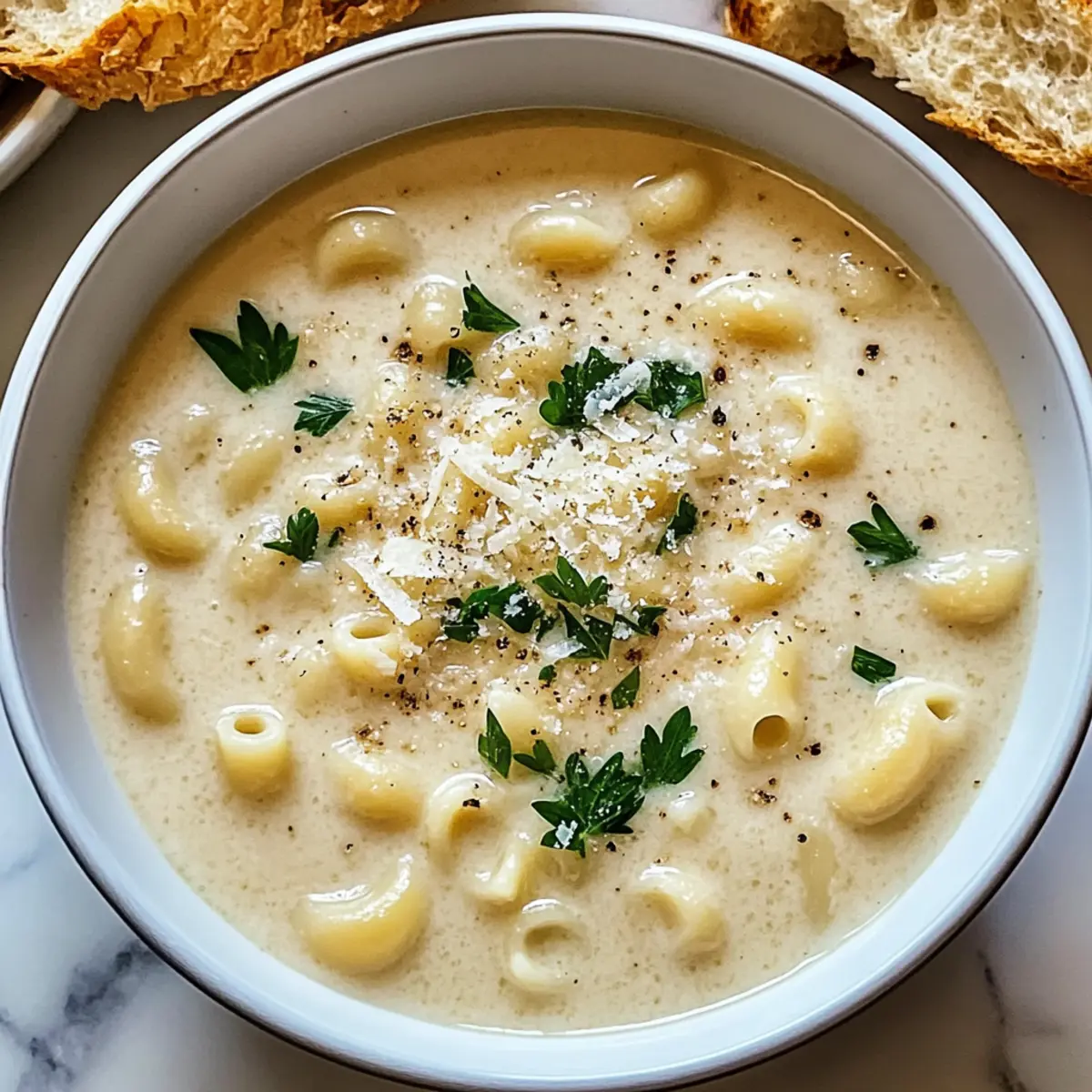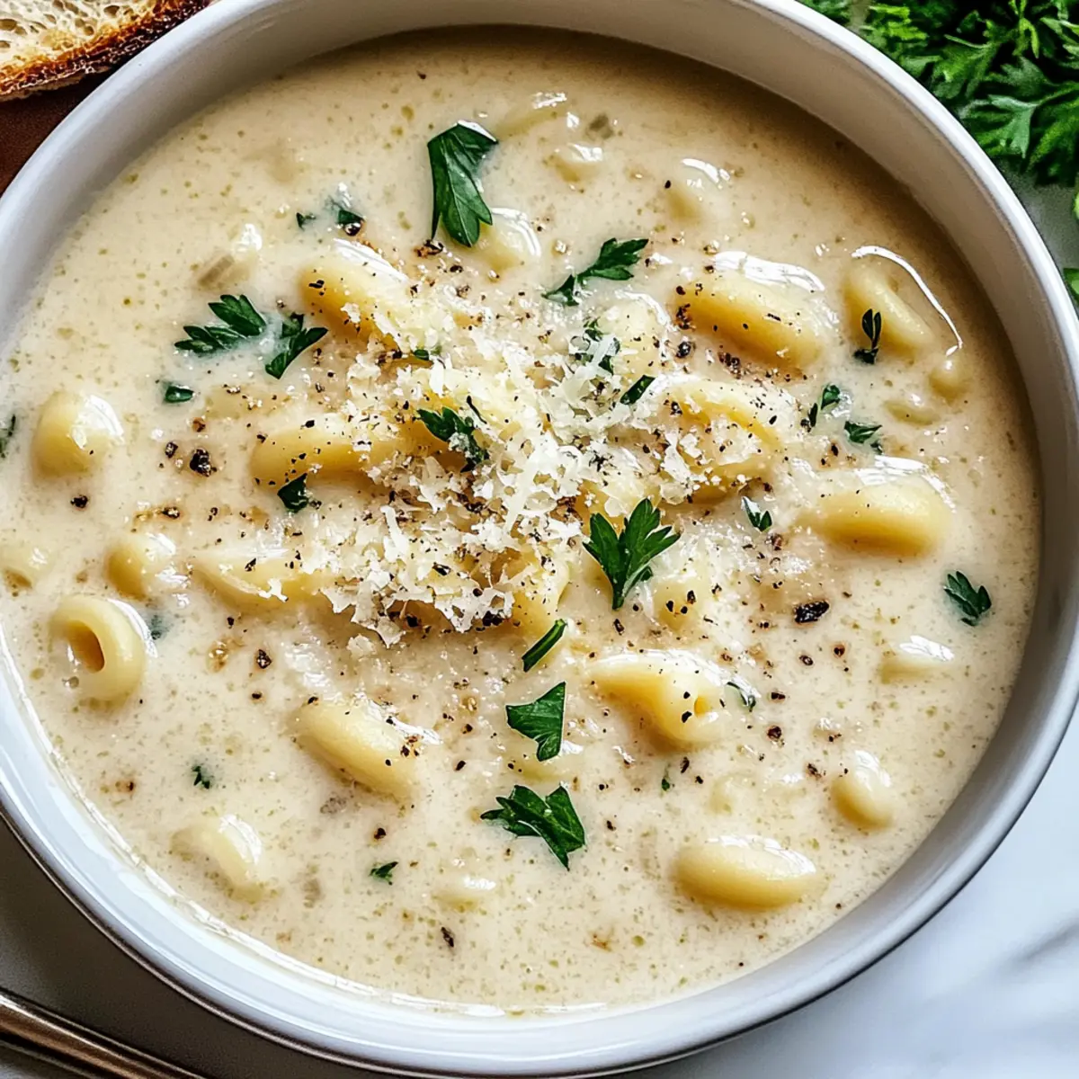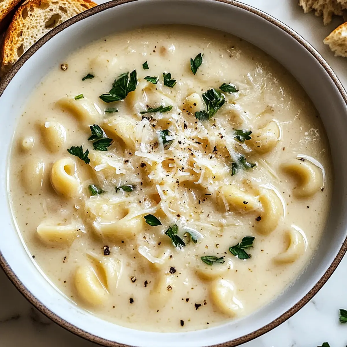 Während ich letzte Woche in meiner Küche stand, um eine schnelle Mahlzeit zuzubereiten, überkam mich der unwiderstehliche Duft von frisch gebratenem Knoblauch. Es erinnerte mich sofort an die tröstliche Cremige Knoblauch-Parmesan-Suppe, die nicht nur meine Sinne verführte, sondern auch in weniger als 30 Minuten auf den Tisch kam. Dieses Rezept ist perfekt für hektische Wochentage und unverwechselbar an den Wochenenden, wenn man Gäste beeindrucken möchte. Außerdem bietet sie die Möglichkeit, jede Menge leckerer Variationen, sodass jeder Gast etwas für seinen Geschmack finden kann. Neugierig, wie einfach es ist, diese köstliche Suppe zuzubereiten? Lass uns gemeinsam den Kochlöffel schwingen! Warum wirst du diese Suppe lieben? Einfache Zubereitung: Die Cremige Knoblauch-Parmesan-Suppe ist in weniger als 30 Minuten fertig und benötigt nur wenige Zutaten, die du wahrscheinlich bereits zu Hause hast. Vielfältige Variationen: Du kannst das Rezept leicht anpassen – egal, ob du es glutenfrei, vegetarisch oder sogar mit einer extra Portion Gemüse möchtest. Reicher Geschmack: Die Kombination aus Knoblauch und Parmesan sorgt für ein unvergleichliches Aroma, das dich und deine Gäste begeistern wird. Herzhaft und Leicht: Diese Suppe ist cremig und sättigend, ohne schwer im Magen zu liegen – perfekt für einen gemütlichen Abend zu Hause oder als Teil eines festlichen Menüs. Perfekte Begleitung: Serviere sie mit frisch gebackenem Brot oder einem leichten Salat, um dein Essen zu vervollständigen und noch mehr Geschmack hinzuzufügen. Probier auch die Linsensuppe Mit Zitrone oder die Spinat-Auflauf Mit Käse – Genuss für jeden Geschmack! Cremige Knoblauch-Parmesan-Suppe Zutaten Für die Suppe: Ungesalzene Butter – sorgt für einen reichhaltigen und tiefen Geschmack; du kannst auch Olivenöl für eine milchfreie Option verwenden. Knoblauch (4 Zehen, gehackt) – gibt der Suppe ihr unverwechselbares Aroma; frischer Knoblauch hat die stärkste Wirkung. Italienische Gewürzmischung (1 Teelöffel) – verleiht erdige und kräuterige Noten; Oregano oder Basilikum sind gute Alternativen. Weißwein-Essig (1 Esslöffel) – bringt eine spritzige Note; ersetze ihn durch Zitronensaft für eine frische Gewinnung. Salz und Pfeffer – essentiell für die Würze nach Geschmack. Für die Sahnebasis: Allzweckmehl (1/4 Tasse) – verdickt die Suppe und sorgt für eine cremige Konsistenz; glutenfreies Mehl ist eine gute Alternative. Hühnerbrühe (4 Tassen) – bildet die Basis und verleiht der Suppe herzhaften Geschmack; vegetarische Brühe für eine fleischfreie Variante. Schlagsahne (1 Tasse) – verleiht Cremigkeit und Reichtum; Kokoscreme ist eine milchfreie Option, die ebenfalls lecker ist. Ditalini-Pasta (1 Tasse) – sorgt für Gehalt; du kannst jede kleine Pastaform verwenden, auch glutenfreie Varianten. Parmesan (1 Tasse, gerieben) – gibt der Suppe einen würzigen, nussigen Geschmack; für eine vegane Variante kannst du Nährhefe verwenden. Diese Cremige Knoblauch-Parmesan-Suppe wird deine Geschmacksknospen verführen und ist schnell und einfach zuzubereiten! Schritt-für-Schritt-Anleitung für die Cremige Knoblauch-Parmesan-Suppe Step 1: Butter schmelzen Erhitze einen großen Topf bei niedriger Temperatur und füge die ungesalzene Butter hinzu. Lasse die Butter schmelzen, bis sie leicht schäumt, und achte darauf, dass sie nicht bräunt. Gib den gehackten Knoblauch und die italienische Gewürzmischung dazu und rühre alles für etwa 30 Sekunden, bis der Knoblauch aromatisch wird. Step 2: Roux herstellen Füge langsam das Allzweckmehl in den Topf hinzu, während du kontinuierlich rührst, um einen Roux zu bilden. Dies sollte etwa eine Minute dauern. Der Mix sollte leicht golden werden, wodurch eine Basis für die Cremige Knoblauch-Parmesan-Suppe entsteht, die für die gewünschte Dicke sorgt. Step 3: Brühe und Sahne hinzufügen Gieße vorsichtig die Hühnerbrühe in den Topf, während du kräftig rührst, um Klumpen zu vermeiden. Füge anschließend die Schlagsahne hinzu und mische alles gut, sodass eine homogene Basis entsteht. Diese Kombination verleiht der Suppe die cremige Textur, die sie so begehrenswert macht. Step 4: Pasta hinzufügen und kochen Erhöhe die Hitze auf mittel-hoch, damit die Suppe leicht köchelt. Gib die Ditalini-Pasta in den Topf und koche sie 5-8 Minuten lang, bis sie al dente ist. Rühre gelegentlich um, damit die Pasta nicht am Boden des Topfes kleben bleibt, und beobachte die Veränderung der Konsistenz. Step 5: Käse und Essig einrühren Nehme den Topf vom Herd und gebe den geriebenen Parmesan sowie den Weißwein-Essig dazu. Rühre gut um, bis der Käse vollständig geschmolzen ist und die Suppe schön cremig wird. Schmecke die Suppe mit Salz und Pfeffer ab und passe die Gewürze nach deinem Geschmack an. Step 6: Servieren Schöpfe die cremige Knoblauch-Parmesan-Suppe in schöne Schalen. Garniere sie, wenn gewünscht, mit frischer Petersilie und etwas extra geriebenem Parmesan für eine ansprechende Präsentation. Genieße die Suppe warm und erfreue dich an den herzhaften Aromen, die sie bietet. Was passt gut zur Cremigen Knoblauch-Parmesan-Suppe? Genieße eine harmonische Kombination, die deinen Gaumen verwöhnt und dein Essen vervollständigt. Knuspriges Baguette: Frisches, knuspriges Baguette ist perfekt, um die cremige Suppe aufzutunken und begeistert mit seiner warmen Kruste. Auseinanderzubrechen und in die Suppe zu dippen, ist der pure Genuss! Mischsalat mit Vinaigrette: Ein leichter Salat mit frischem Gemüse und einer spritzigen Vinaigrette bringt Frische und knusprige Texturen, die gegen die cremige Konsistenz der Suppe kontrastieren. Gegrilltes Gemüse: Das Rösten von saisonalem Gemüse verleiht der Mahlzeit Farbtiefe und zusätzliche Aromen. Zucchini, Paprika und Karotten sind hervorragende Begleiter, die jedem Bissen mehr Komplexität verleihen. Kräftiger Rotwein: Ein vollmundiger Rotwein, wie ein Chianti, rundet das Geschmackserlebnis 
