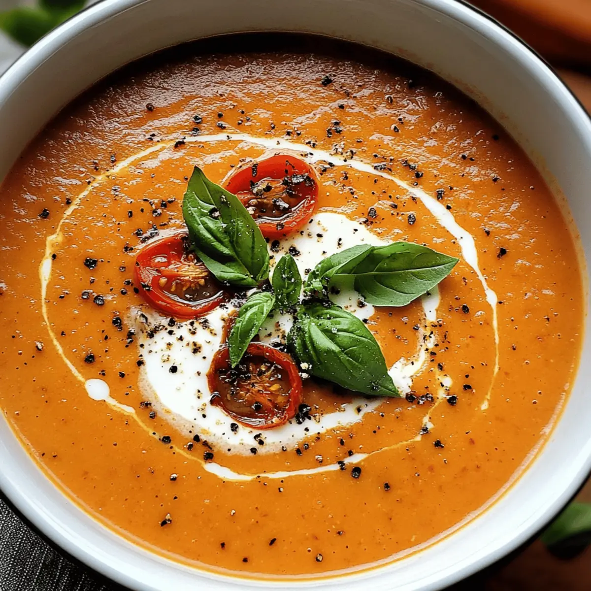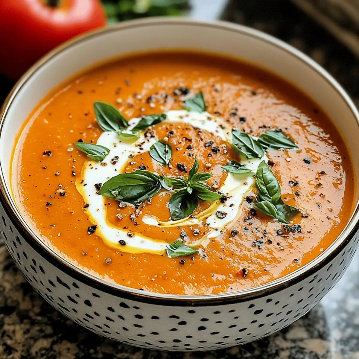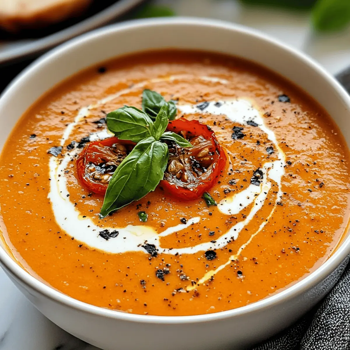 Der aromatische Duft von geröstetem Knoblauch und frischen Tomaten erfüllt den Raum und lässt mich sofort an gemütliche Abende in der Küche denken. In diesem Moment der Besinnung ist nichts verlockender als eine Schüssel mit cremiger, selbstgemachter Tomatensuppe. Unsere Rezeptur für die Creamy Roasted Garlic Tomato Soup vereint diese köstlichen Aromen und bringt das Beste aus beiden Welten zusammen – eine schnelle Zubereitung mit frischen Zutaten und ein unvergleichlicher Geschmack, der jeder Fertigsuppe überlegen ist. Diese vegetarische Wohltat ist perfekt für kalte Tage, bietet sich aber auch als feiner Auftakt zu einem besonderen Menü an. Möchtest du erfahren, wie du dieses herzhafte Wohlfühlgericht im Handumdrehen zubereitest? Warum wird dieses Rezept dein Favorit? Simplicity: Die Zubereitung ist so einfach, dass du es selbst als Kochanfänger meistern kannst. Aromatischer Genuss: Der geröstete Knoblauch verleiht der Tomatensuppe eine besondere Tiefe und ein unwiderstehliches Aroma. Vielseitig: Diese Suppe lässt sich wunderbar mit verschiedenen Zutaten anpassen, wie zum Beispiel frischem Spinat oder Balsamico, um extra Geschmack hinzuzufügen. Cremige Textur: Die Kombination aus schwerer Sahne oder Kokosmilch sorgt für eine luxuriöse Cremigkeit, die jede Löffel zu einem Genuss macht. Schnell & Einfach: In kürzester Zeit kannst du diese wohltuende Suppe zubereiten, perfekt nach einem langen Tag. Crowd-Pleaser: Egal, ob für ein gemütliches Abendessen oder als elegant servierte Vorspeise – diese Suppe wird jeden begeistern. Cremige Knoblauch-Tomaten-Suppen-Zutaten Für die Suppe • Frische Tomaten – sorgen für die Hauptnote, sowohl sauer als auch süß; du kannst auch Dosentomaten für eine schnellere Zubereitung verwenden. • Knoblauch – verleiht durch das Rösten eine tiefere Note; weniger verwenden, wenn du einen milderen Geschmack bevorzugst. • Olivenöl – zum Rösten und Sautieren, verstärkt den Geschmack; kann durch Pflanzenöl ersetzt werden. • Zwiebel – sorgt für Süße und Tiefe; eine gelbe Zwiebel ist ideal. Schalotten sind ein guter milder Ersatz. • Gemüsebrühe – dient als Flüssigkeit und Geschmacksträger; man kann auch Hühnerbrühe verwenden, wenn es nicht vegetarisch sein muss. • Frisches Basilikum – bringt aromatische Frische; im Notfall kann auch getrocknetes Basilikum verwendet werden. • Schlagsahne (oder Kokosmilch) – sorgt für eine cremige Konsistenz; für vegane Optionen kann man auch pflanzliche Sahne verwenden. • Salz und Pfeffer – essentielle Gewürze für die perfekte Abstimmung; nach Geschmack anpassen. • Rote Paprikaflocken – optional für etwas Schärfe; für eine mildere Suppe weglassen. Toppings • Frisches Basilikum – zur Garnierung, bringt zusätzliche Frische. • Sahne – ein Spritzer für eine schöne Präsentation und zusätzlichen Geschmack. • Crispy Cherry-Tomaten – für einen interessanten Kontrast in Textur und Geschmack. Diese cremige Knoblauch-Tomaten-Suppe wird dein neues Lieblingsgericht, perfekt für gemütliche Abende! Step-by-Step Instructions for Cremige Knoblauch-Tomaten-Suppe Step 1: Ofen vorheizen Heize den Ofen auf 200°C vor. Diese Temperatur sorgt dafür, dass die Tomaten und der Knoblauch perfekt rösten. Während der Ofen aufgeheizt wird, kannst du bereits die nächsten Schritte vorbereiten, um Zeit zu sparen und die Zubereitung zu beschleunigen. Step 2: Gemüse vorbereiten Schneide die frischen Tomaten in der Mitte durch und lege sie mit etwas Olivenöl, Salz und Pfeffer auf ein Backblech. Schneide den oberen Teil einer Knoblauchknolle ab, träufle etwas Olivenöl darauf, wickele sie in Alufolie und lege sie ebenfalls auf das Backblech. So bereitest du alles für das Rösten vor. Step 3: Rösten Backe die Tomaten und die Knoblauchknolle für etwa 30-35 Minuten im vorgeheizten Ofen. Die Tomaten sollten leicht karamellisiert sein, während der Knoblauch weich und zart wird. Der leckere Duft wird bald deinen Raum erfüllen und dich auf die kommende Suppe einstimmen. Step 4: Zwiebeln sautieren In einem großen Topf erhitzt du etwas Olivenöl bei mittlerer Hitze. Füge die grob gehackte Zwiebel hinzu und dünste sie etwa 5 Minuten lang, bis sie weich und goldbraun ist. Diese aromatische Basis gibt der Cremigen Knoblauch-Tomaten-Suppe zusätzlichen Geschmack. Step 5: Zutaten pürieren Squeeze den weichen, gerösteten Knoblauch aus der Schale und gib ihn zusammen mit den gerösteten Tomaten, Gemüsebrühe und frischem Basilikum in den Topf. Mit einem Stabmixer pürierst du die Mischung bis zur gewünschten Konsistenz; alternativ kannst du sie auch portionsweise in einem Standmixer pürieren. Step 6: Köcheln lassen Gib die pürierte Suppe zurück in den Topf und bringe sie zum Köcheln. Rühre die Schlagsahne (oder Kokosmilch) ein und lasse die Suppe 5-10 Minuten leicht köcheln, damit sich die Aromen gut verbinden können. Achte darauf, gelegentlich umzurühren, damit nichts anbrennt. Step 7: Servieren Löffele die heiße cremige Knoblauch-Tomaten-Suppe in Schalen und garniere sie nach Belieben mit frischem Basilikum, einem Spritzer Sahne oder knusprigen Kirschtomaten. Diese Suppe ist besonders lecker, wenn sie mit knusprigem Brot oder einem gegrillten Käsandwich serviert wird. Lagerungstipps für cremige Knoblauch-Tomaten-Suppe Kühlschrank: Bewahre die Suppe in einem luftdichten Behälter auf und genieße sie innerhalb von bis zu 5 Tagen für den besten Geschmack. Gefrierfach: Die cremige Knoblauch-Tomaten-Suppe kann bis zu 3 Monate eingefroren werden; fülle sie in gefriergeeignete Behälter und lasse etwas Platz für die Ausdehnung. Auftauen: Zum Auftauen die Suppe über Nacht im Kühlschrank lagern oder sie auf niedriger Stufe im Topf erhitzen, dabei gelegentlich umrühren, um eine gleichmäßige Konsistenz zu gewährleisten. Wiedererwärmen: Erhitze die gefrorene oder gekühlte Suppe in einem Topf bei niedriger Hitze; füge eventuell einen Schuss zusätzli