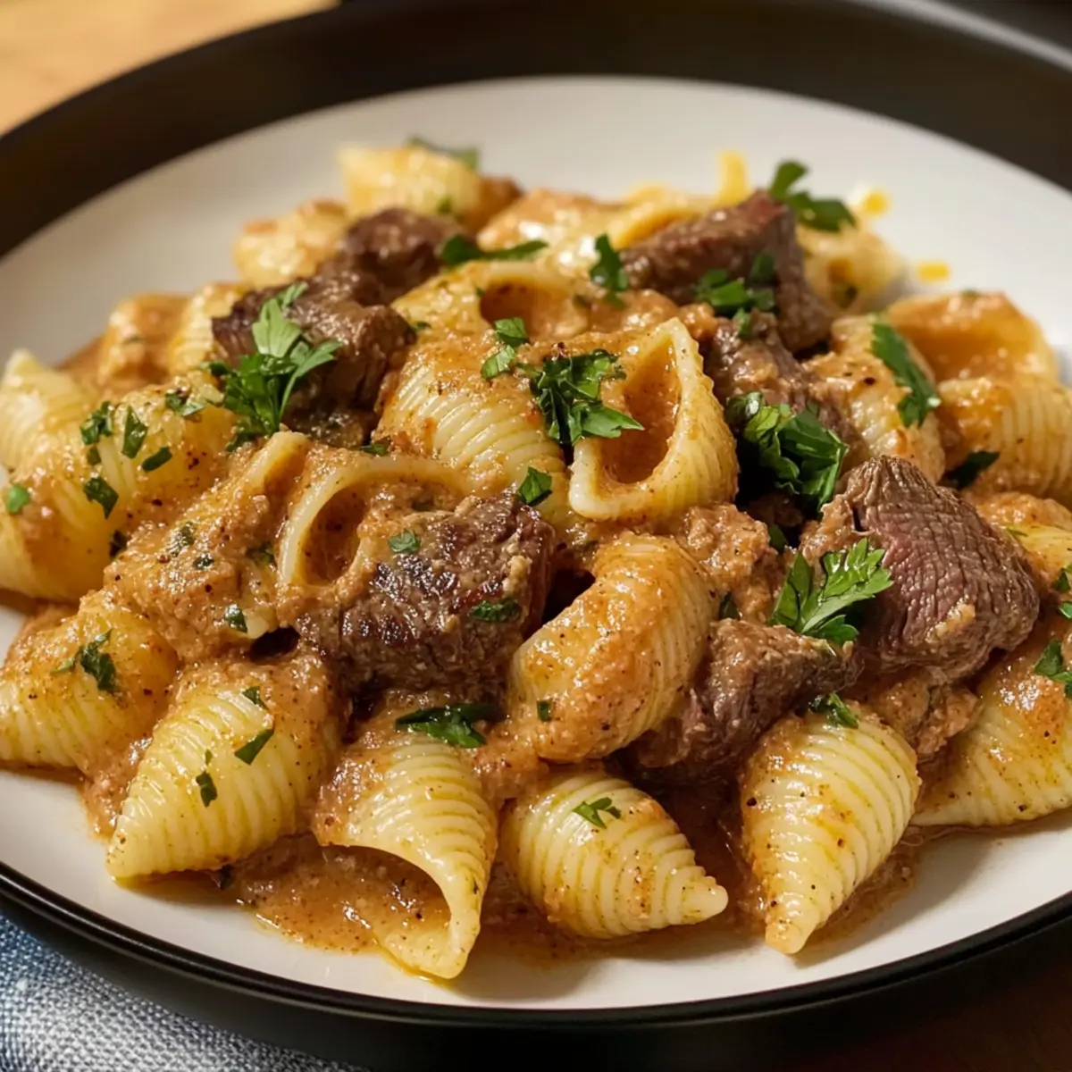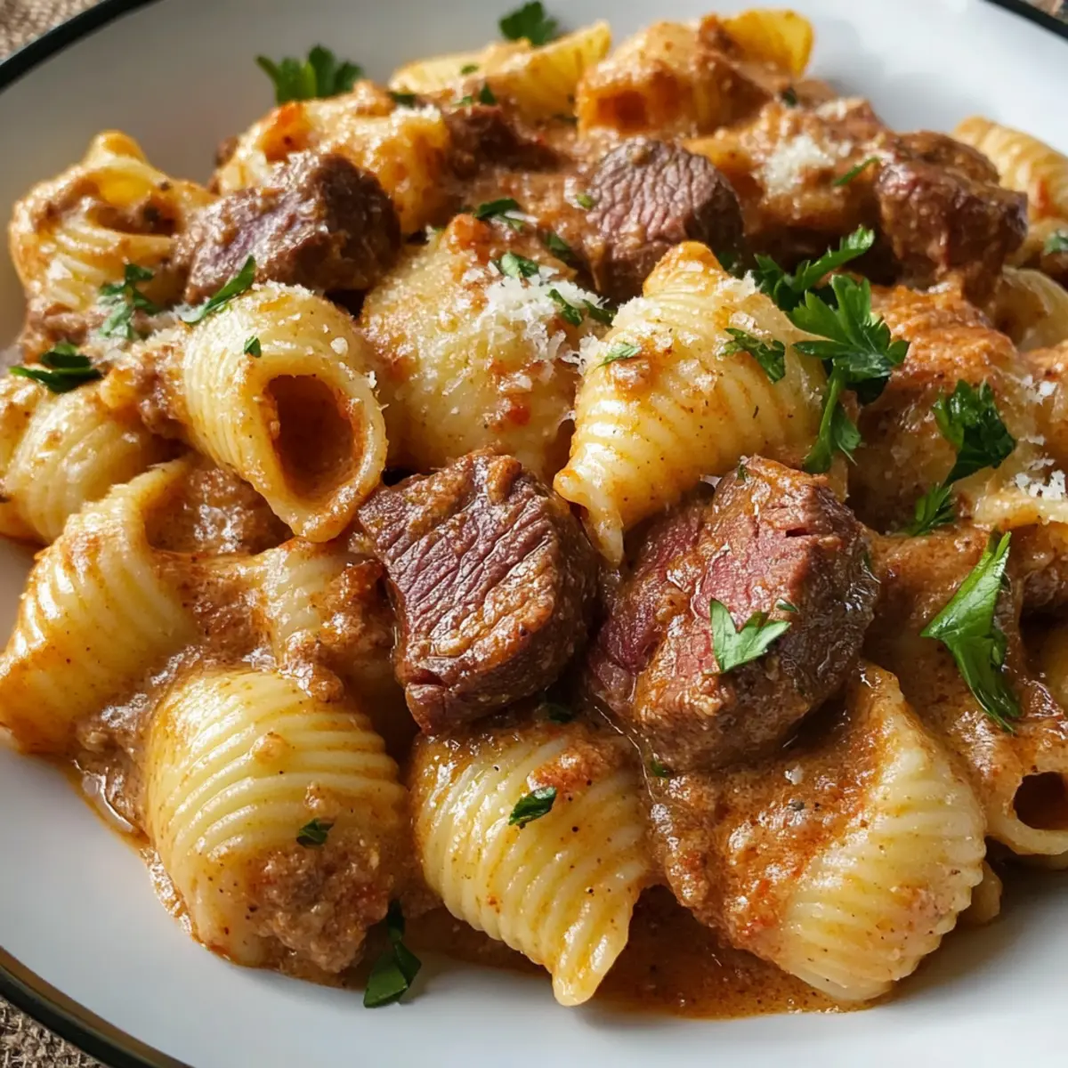Als ich neulich in meiner Küche stand und die letzten Sonnenstrahlen durch das Fenster fielen, wusste ich, dass es Zeit für ein Gericht war, das Wärme und Geborgenheit ausstrahlt. Die Cremige Paprika Steak Schalen sind ein köstliches Beispiel dafür, wie sich einfache Zutaten in ein herzhaftes und schnelles Abendessen verwandeln können – perfekt für geschäftige Wochentage. Mit zartem Steak und einer sahnigen Paprika-Sauce umhüllen die shell pasta euren Gaumen in einem Komfort, den man einfach lieben muss. Und das Beste? Diese Rezept ist schnell zubereitet und macht sich wunderbar als Publikumsliebling! Habt ihr schon festgestellt, wie eine köstliche Mahlzeit das Herz erwärmen kann? Lasst uns gemeinsam entdecken, wie einfach es ist, diese Geschmacksexplosion zu zaubern! Warum werdet ihr diese Rezept lieben? Einfachheit: Die Zubereitung ist unkompliziert und erfordert nur grundlegende Kochfähigkeiten. Vielfältig: Ihr könnt Steak durch Hähnchen ersetzen und die Sauce nach Belieben würzen. Würzige Aromen: Die Kombination aus geräucherter Paprika und zartem Fleisch sorgt für eine unverwechselbare Geschmackstiefe. Schnell: In weniger als 30 Minuten entsteht ein Menü, das beeindruckt. Gemütlichkeit: Diese Schalen sind der Inbegriff von Komfortessen – perfekt für die ganze Familie. Probiert auch unsere Koreanischer Chili Blumenkohl als leichten Beilagenklassiker aus! Cremige Paprika Steak Schalen Zutaten • Diese Zutatenliste sorgt dafür, dass ihr die perfekten Cremige Paprika Steak Schalen zaubern könnt! Für die Pasta Schalenpasta – Sie bietet die feste Struktur für das Gericht; ihr könnt sie auch durch Orecchiette oder Rotini ersetzen. Für das Steak Steak (Sirloin oder Ribeye) – Dieses sorgt für die nötige Protein- und Geschmacksfülle; Alternativen sind Flanksteak oder Hähnchenschenkel. Für die Würze Salz & Pfeffer – Um den Geschmack zu intensivieren; frischer, grober Pfeffer liefert eine stärkere Note. Für das Anbraten Olivenöl – Perfekt für das Anbraten des Steaks; Avocadoöl ist eine geeignete Alternative. Für die Sauce Butter – Fügt der Sauce zusätzliche Reichhaltigkeit hinzu; Ghee kann für einen nussigen Geschmack verwendet werden. Knoblauch (3 Zehen, gehackt) – Verleiht Aroma und vertieft die Geschmacksnuancen; frischer Knoblauch ist immer die beste Wahl. Geräucherte Paprika (1½ TL) – Bringt eine rauchige Note in das Gericht; süße Paprika kann für einen milderen Geschmack verwendet werden. Schlagsahne (1 Tasse) – Sorgt für eine luxuriöse Sauce; Halbfett-Sahne kann eine leichtere Option sein. Rinderbrühe (½ Tasse) – Für einen tieferen Geschmack der Sauce; Gemüsebrühe funktioniert ebenso gut. Parmesankäse (½ Tasse, gerieben) – Trägt zur Cremigkeit und zum Geschmack bei; Pecorino Romano bietet eine schärfere Note. Frische Petersilie (gehackt) – Zur Garnierung, bringt Frische und Farbe ins Spiel. Mit diesen Zutaten seid ihr bestens gerüstet, um euch an die Zubereitung der cremigen Paprika Steak Schalen zu machen! Schritt-für-Schritt-Anleitung für Cremige Paprika Steak Schalen Step 1: Pasta kochen Bringt einen großen Topf mit gesalzenem Wasser zum Kochen. Fügt die Schalenpasta hinzu und kocht sie nach Packungsanweisung bis sie al dente sind, was etwa 8–10 Minuten dauert. Vor dem Abgießen der Pasta, reserviert ½ Tasse des Nudelwassers. Die Pasta abgießen und beiseitestellen, während ihr die Sauce zubereitet. Step 2: Steak vorbereiten Trocken tupfen das Steak mit Küchenpapier, um überschüssige Feuchtigkeit zu entfernen. Würzt das Steak großzügig mit Salz und frisch gemahlenem Pfeffer. Erhitzt in einer großen Pfanne bei mittelhoher Temperatur 2 Esslöffel Olivenöl. Sobald das Öl heiß ist, das Steak 2–3 Minuten pro Seite anbraten, bis es eine schöne braune Kruste hat. Anschließend aus der Pfanne nehmen und beiseitelegen. Step 3: Sauce zubereiten Reduziert die Hitze der Pfanne auf mittlere Temperatur und fügt 2 Esslöffel Butter hinzu. Lasst die Butter schmelzen und gebt den gehackten Knoblauch hinzu. Sauté den Knoblauch etwa 30 Sekunden lang, bis er aromatisch ist, und passt auf, dass er nicht verbrennt, um einen bitteren Geschmack zu vermeiden. Step 4: Gewürze hinzufügen Fügt an dieser Stelle 1½ Teelöffel geräucherte Paprika in die Pfanne und rührt für 10–15 Sekunden um, damit die Gewürze ihren vollen Geschmack entfalten. Dies wird die Grundlage für die cremige Paprika-Sauce eurer Cremigen Paprika Steak Schalen und verleiht dem Gericht eine warme Farbe. Step 5: Sauce vollenden Gießt nun 1 Tasse Schlagsahne und ½ Tasse Rinderbrühe in die Pfanne, rührt gut um und lasst die Mischung 3–4 Minuten köcheln. Die Sauce sollte leicht eindicken und blubbern. Achtet darauf, gelegentlich umzurühren, damit nichts am Boden ansetzt. Step 6: Käse einrühren Fügt ½ Tasse geriebenen Parmesan zur Sauce hinzu und rührt, bis der Käse geschmolzen und die Sauce cremig ist. Wenn die Sauce zu dick ist, könnt ihr nach Bedarf etwas von dem reservierten Nudelwasser einrühren, um die gewünschte Konsistenz für die Cremigen Paprika Steak Schalen zu erreichen. Step 7: Zutaten kombinieren Gebt das angebratene Steak in die Pfanne zurück und schneidet es vor dem Hinzufügen in Streifen. Fügt auch die abgetropfte Pasta hinzu und mischt alles gut, damit sich die Sauce gleichmäßig verteilt. Lasst die Mischung 1–2 Minuten köcheln, damit sich die Aromen verbinden und die Pasta die köstliche Sauce aufnimmt. Step 8: Anrichten Nehmt die Pfanne vom Herd und garniert die Cremigen Paprika Steak Schalen mit frisch gehackter Petersilie für einen Farbtupfer und ein zusätzliches Aroma. Probiert die Dish und passt die Würze nach eurem Geschmack an, bevor ihr das Gericht serviert. Vorbereitung der Cremigen Paprika Steak Schalen für stressfreie Wochentage Die Cremigen Paprika Steak Schalen sind ein wahrer Zeitretter für beschäftigte Köche! Ihr könnt die Pasta bereits bis zu 24 Stunden im Voraus 