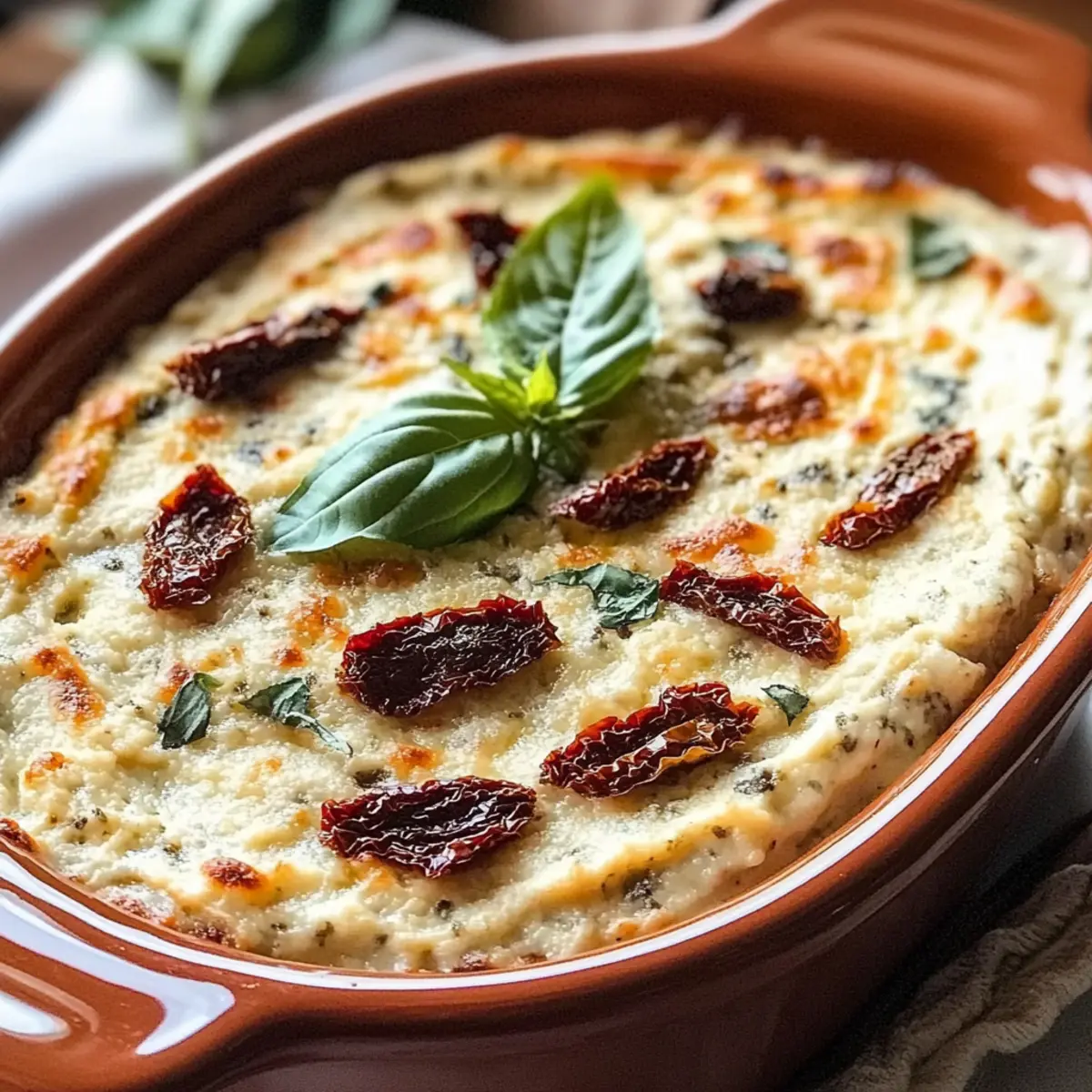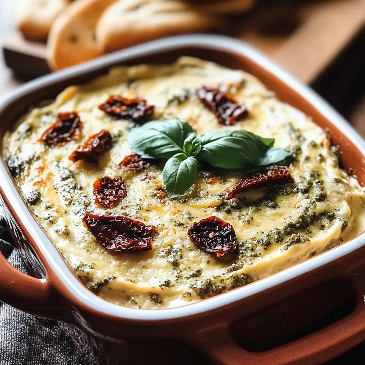 Cremiger gebackener Dip mit getrockneten Tomaten und Pesto