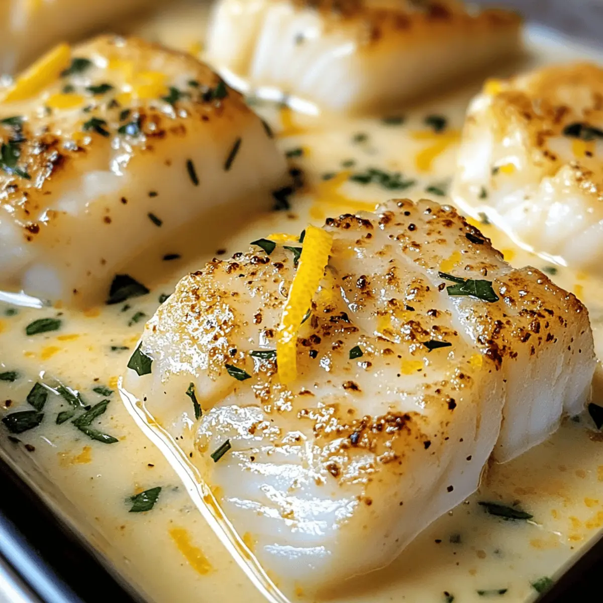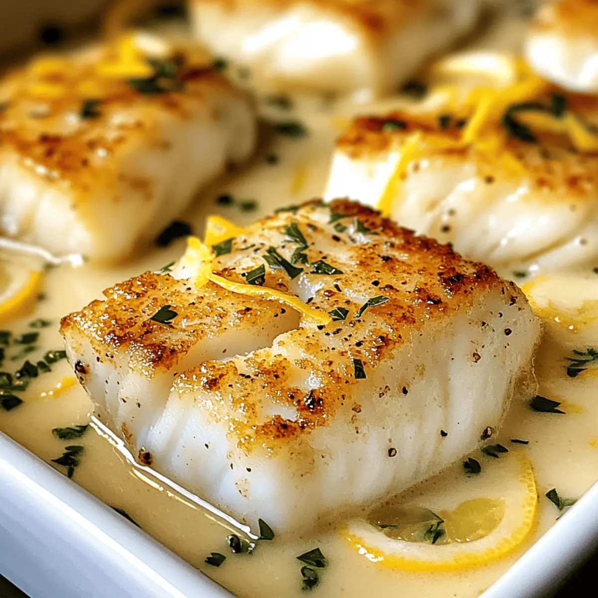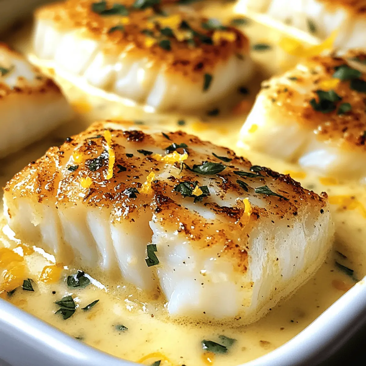 Während ich in meiner Küche stehe und die Zutaten vorbereite, entfaltet sich ein verführerischer Duft von Ingwer und Zitrone, der mich sofort in eine entspannte, tropische Stimmung versetzt. Heute teile ich mit euch mein Rezept für gebackenen Kabeljau in cremiger Kokos-Zitronen-Sauce – ein Gericht, das nicht nur leicht und lecker ist, sondern auch perfekt für stressige Wochentage. Die Kombination aus der samtigen Konsistenz der Kokosmilch und der spritzigen Frische der Zitrone macht dieses Rezept zu einem schnellen und einfachen Abendessen, das die ganze Familie erfreut. Es gelingt im Handumdrehen und ist dabei so vielseitig, dass ihr immer wieder neue Variationen ausprobieren könnt. Also, bereit für ein wenig kulinarische Magie? Lasst uns gemeinsam loslegen! Warum ist dieses Rezept so besonders? Einfachheit: Die Zubereitung ist kinderleicht und erfordert keine komplizierten Kochkünste. Cremiger Geschmack: Die Kombination aus Kokosmilch und Zitrone verleiht dem Gericht eine unverwechselbare, köstliche Note, die deinen Gaumen verzaubert. Familienfreundlich: Dieses Rezept ist perfekt für die ganze Familie und lässt sich wunderbar mit frischem Gemüse oder Reis kombinieren. Schnell & Praktisch: In nur 30 Minuten hast du ein schmackhaftes Abendessen auf dem Tisch, ideal für stressige Wochentage. Vielseitigkeit: Probiere es mit verschiedenen Fischsorten oder füge etwas Spinat hinzu, um zusätzliche Nährstoffe zu integrieren, und entdecke immer neue Geschmäcker! Zutaten für cremigen Kabeljau • Entdecke die perfekten Zutaten für ein schnelles und einfaches Abendessen! Für den Kabeljau Kabeljaufilets – Wähle dicke, weiße Filets für besten Geschmack; frisch ist ideal, aber auch gefroren funktioniert gut. Für die Sauce Kokosmilch – Sie sorgt für die cremige Textur der Sauce; du kannst auch leichte Kokosmilch verwenden, wenn du es etwas leichter magst. Olivenöl – Perfekt zum Anbraten der Zwiebel; eine Alternative wäre Avocadoöl. Zwiebel – sorgt für eine süßliche Note im Gericht; du kannst auch Schalotten für einen milderen Geschmack verwenden. Knoblauch – Verleiht dem Gericht das gewisse Etwas; verwende frischen Knoblauch für den besten Geschmack oder Schnelle Knoblauchpulver als Ersatz. Ingwer – Fügt eine warme, würzige Note hinzu; drücke bei Bedarf auf gemahlenen Ingwer zurück. Zitronensaft und -schale – Für einen erfrischenden, säuerlichen Kick; Lime-Juice bietet eine köstliche Abwechslung. Salz und Pfeffer – Die unverzichtbaren Gewürze, die die Aromen abrunden. Allgemeiner Hinweis Entdecke die köstlichen Aromen, die in diesem Rezept versteckt sind, und genieße die Freude am Kochen! Schritt-für-Schritt-Anleitung für cremigen Kabeljau in Kokos-Zitronensauce Step 1: Ofen vorheizen Heize deinen Ofen auf 180°C vor. Dies ist die ideale Temperatur, um den Kabeljau gleichmäßig zu garen und die Sauce schön cremig zu halten. Während der Ofen aufheizt, kannst du die Kabeljaufilets vorbereiten und die Gewürze bereitlegen. Step 2: Kabeljau würzen Nehme die Kabeljaufilets und bestreue beide Seiten großzügig mit Salz und Pfeffer. Achte darauf, dass die Filets gut gewürzt sind, um den Geschmack des Fisches zu betonen. Diese einfache Würzung wird die Basis für die köstliche Kokos-Zitronensauce bilden. Step 3: Sauce zubereiten Erhitze einen großen, beschichteten Bratpfanne bei mittlerer Hitze und gib einen Esslöffel Olivenöl hinein. Füge die gewürfelte Zwiebel hinzu und brate sie für etwa 3-4 Minuten, bis sie weich und leicht glasig ist. Anschließend gib den gehackten Knoblauch und den geriebenen Ingwer dazu und brate alles für eine weitere Minute, bis die Aromen freigesetzt werden. Step 4: Kokosmilch einfüllen Sobald Zwiebel, Knoblauch und Ingwer gut duften, gieße die Kokosmilch in die Pfanne und lasse die Mischung kurz aufkochen. Reduziere die Hitze und lasse die Sauce bei schwacher Hitze für etwa 5 Minuten köcheln, damit sich die Aromen entfalten können. Füge dann den Zitronensaft und die -schale hinzu, um der Sauce eine frische Note zu verleihen. Step 5: Kabeljau backen Lege die gewürzten Kabeljaufilets in eine Auflaufform und gieße die cremige Kokos-Zitronensauce gleichmäßig darüber. Stelle die Form in den vorgeheizten Ofen und backe den Kabeljau für 20 bis 25 Minuten. Das Fischfilet ist fertig, wenn es sich leicht mit einer Gabel zerlegen lässt und eine schöne, undurchsichtige Farbe hat. Step 6: Servieren Nimm die Auflaufform aus dem Ofen und serviere den Kabeljau sofort, schön überzogen mit der reichen Sauce. Dieses Gericht passt hervorragend zu dampfendem Reis oder frisch gedünstetem Gemüse, das die köstliche Sauce aufsaugen kann. Guten Appetit! Aufbewahrungstipps für cremigen Kabeljau Raumtemperatur:: Dieser gebackene Kabeljau sollte nicht bei Raumtemperatur gelagert werden, um die Frische und Qualität zu bewahren. Kühlschrank:: Bewahre Reste in einem luftdichten Behälter im Kühlschrank auf, wo sie bis zu 2 Tage haltbar sind. Gefrierer:: Du kannst den Kabeljau und die Sauce in einem gefriergeeigneten Behälter bis zu 3 Monate einfrieren. Achte darauf, die Sauce separat zu lagern, um die beste Textur zu erhalten. Wiedererwärmung:: Um den Kabeljau wieder aufzuwärmen, lege ihn bei 175°C (350°F) in den Ofen, bis er durchgewärmt ist. Die Sauce kann in der Mikrowelle oder in einem Topf aufgeheizt werden. Genieß den köstlichen Geschmack dieses Gerichts erneut! Expertentipps für cremigen Kabeljau Gleichmäßige Dicke: Achte darauf, dass die Kabeljaufilets eine ähnliche Dicke haben, um ein gleichmäßiges Garen zu gewährleisten. Einheitliche Filets sorgen dafür, dass dein Gericht perfekt gelingt. Garzeit überprüfen: Teste die Garzeit, indem du an der dicksten Stelle des Fisches mit einer Gabel pikst. Er sollte opak sein und leicht auseinanderfallen. Vermeide es, den Fisch zu lange zu backen, da er sonst trocken werden könnte. Würze schon zu Beginn: Würze die Kabeljaufilets gleich zu Beginn 