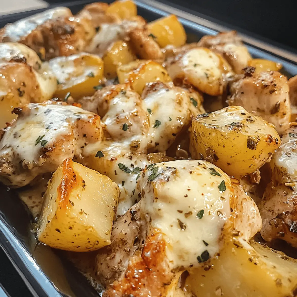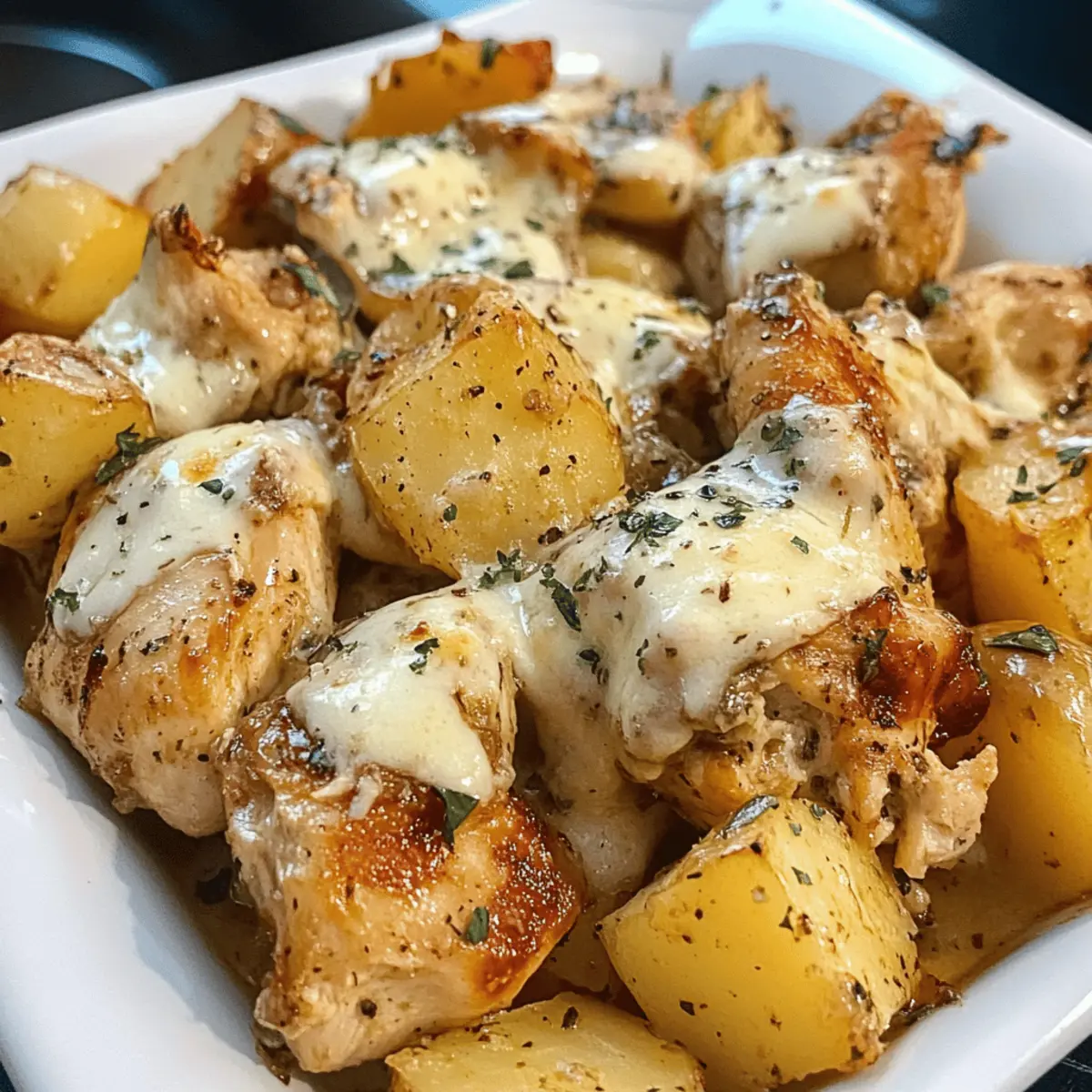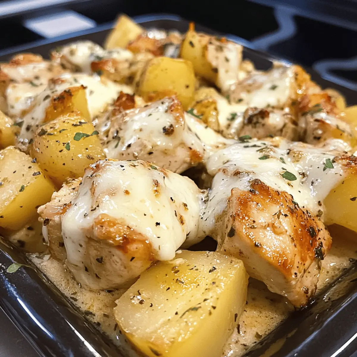 Der output sollte nur die übersetzten Wörter sein. Dieses Gericht kombiniert knusprige Kartoffeln mit zartem Hähnchen und köstlicher Knoblauch-Parmesan-Sauce – ideal für die ganze Familie.