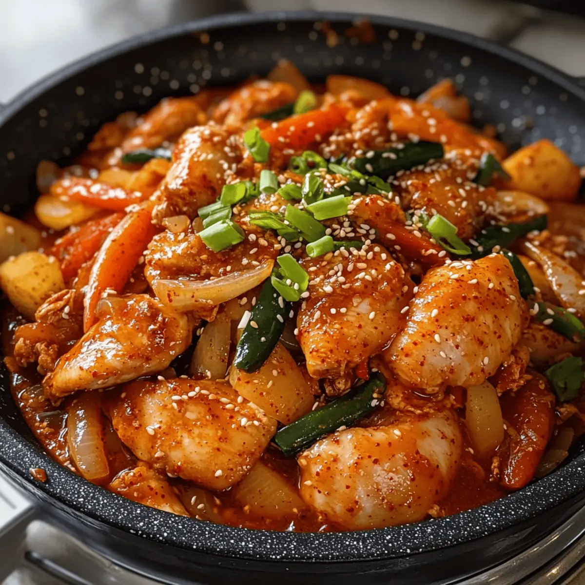 Erlebe den intensiven Genuss von Dakgalbi mit Hähnchen, Gemüse und Reis-Gnocchi. Ein schnelles, geselliges Gericht für jeden Anlass.
