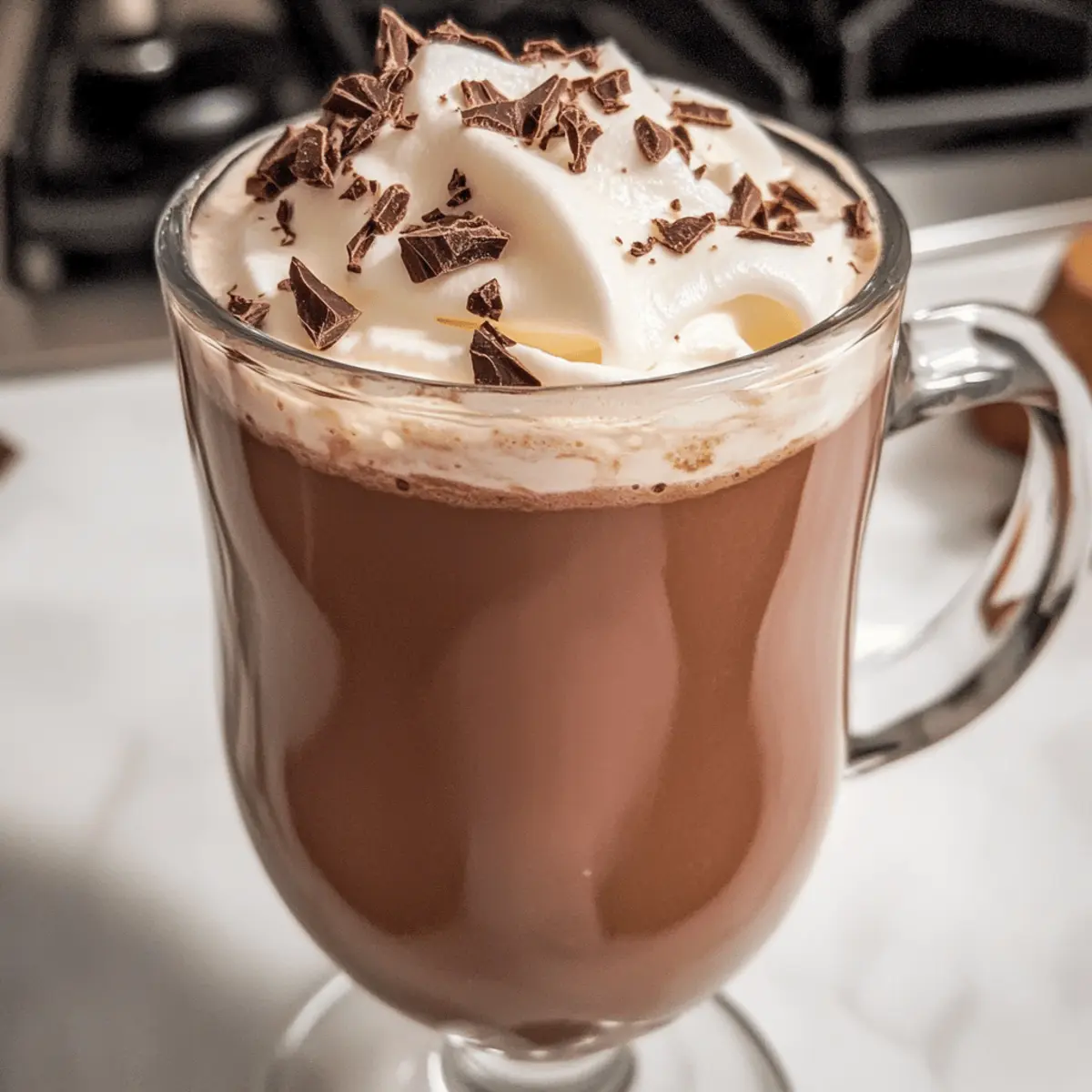 Genießen Sie die heiße Schokolade mit optionaler Garnierung von Schlagsahne oder Schokoladenspänen.