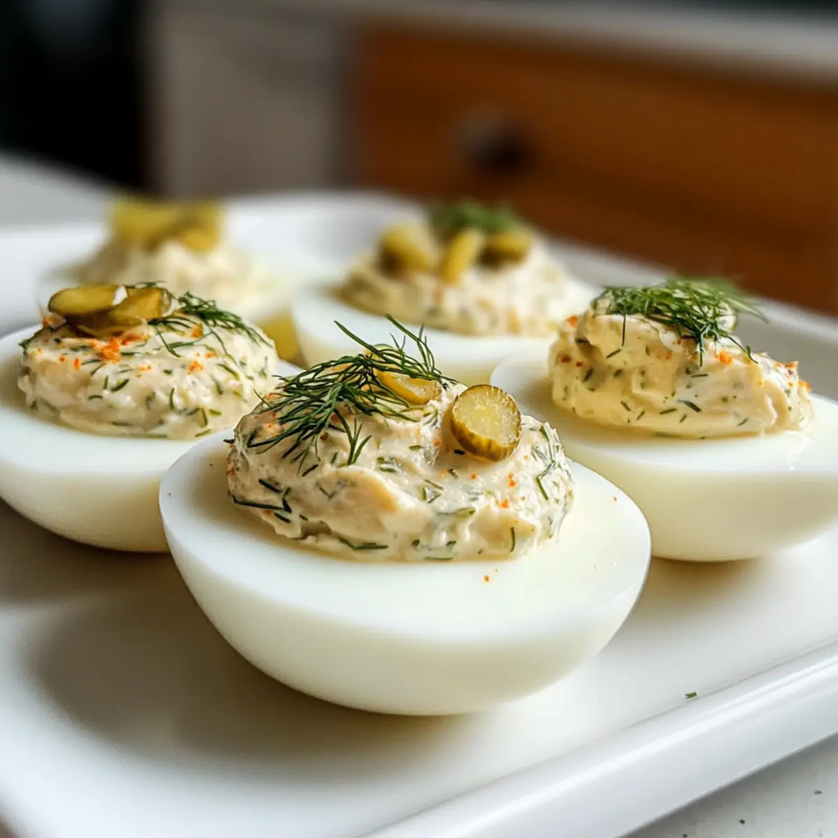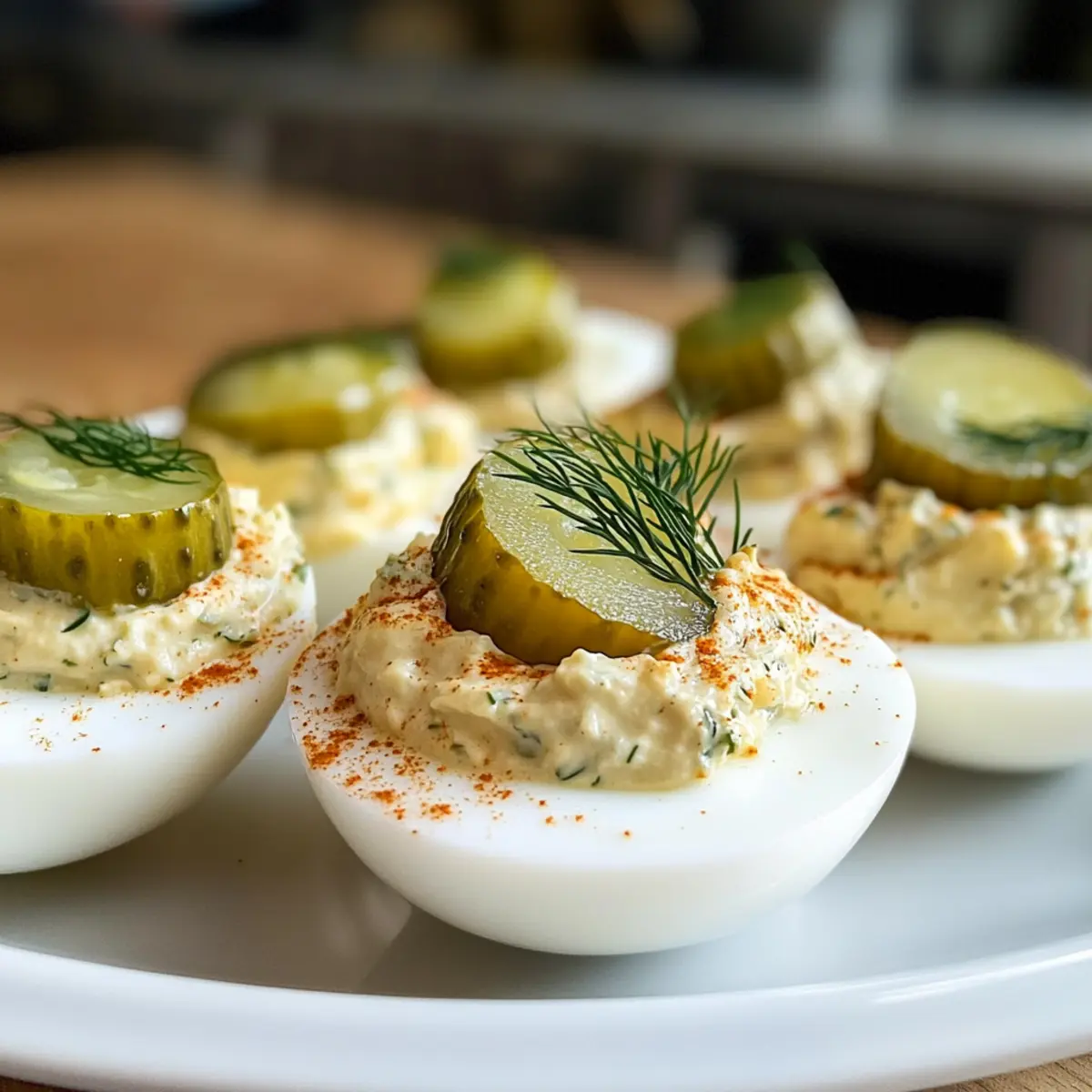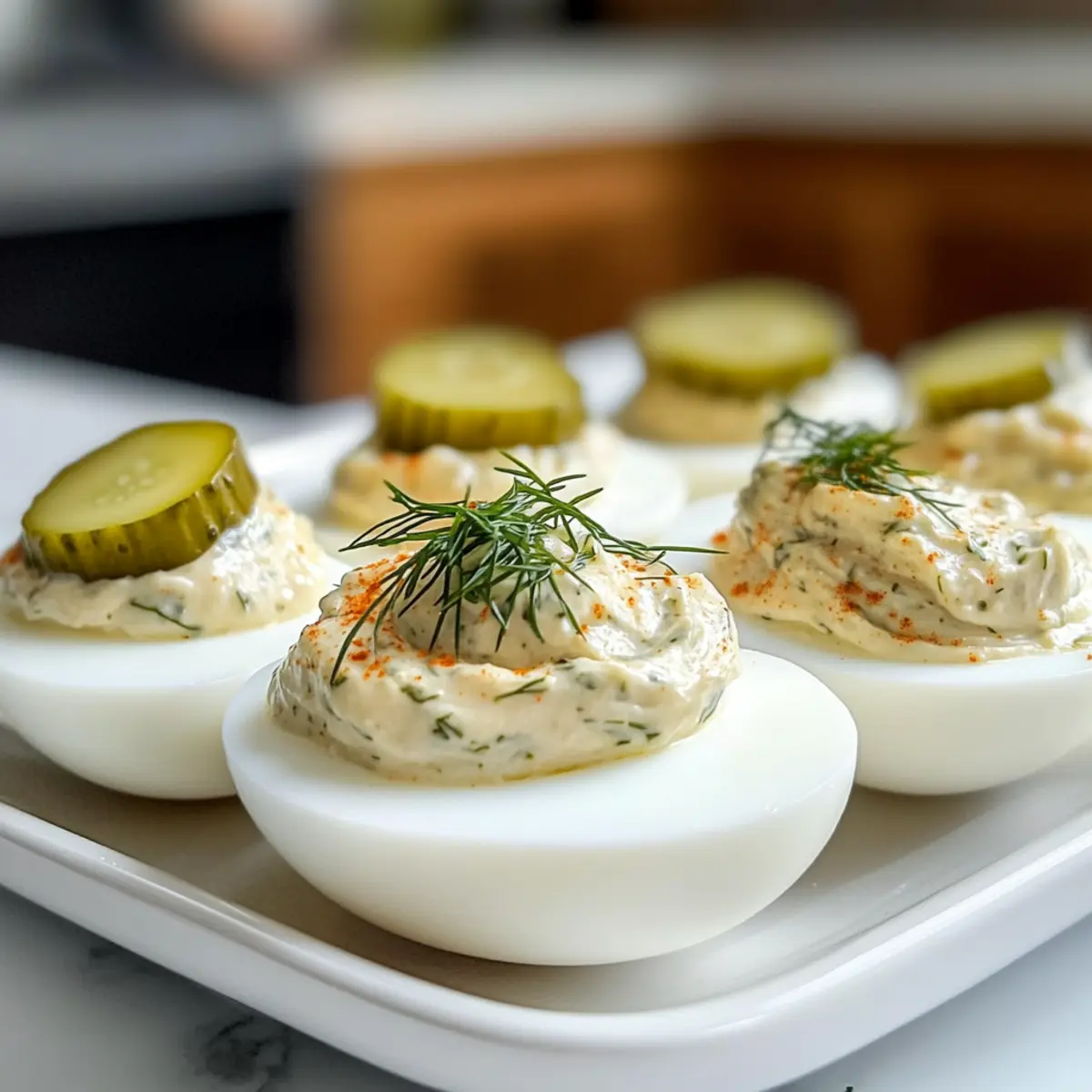 Ich erinnere mich an einen besonderen Sommerabend, als meine Freunde und ich uns zu einem herzlichen Barbecue versammelten. Der Duft von frisch gegrilltem Fleisch lag in der Luft, während ich nervös die letzten Handgriffe an meinen Dillgurken gefüllten Eiern vollbrachte. Diese köstliche Abwandlung klassischer Deviled Eggs verleiht dem vertrauten Rezept einen unerwarteten, spritzigen Kick durch den Gurkensaft und macht sie zu einem Höhepunkt auf jedem Fest. Mit ihrer cremigen Textur und dem knackigen Biss bieten sie nicht nur einen echten Genuss, sondern sind auch im Handumdrehen zubereitet – perfekt für spontane Zusammenkünfte. Wer könnte da widerstehen? Seid ihr bereit, diese Gaumenfreude selbst auszuprobieren? Warum sind Dillgurken gefüllte Eier so beliebt? Einzigartiger Geschmack: Mit ihrem spritzigen Gurkensaft bringen diese Eier einen aufregenden Geschmack in die Tradition der Deviled Eggs. Kreativität im Handumdrehen: Diese einfache Zubereitung verwandelt gewohnte Zutaten in ein kreatives Gericht, das bei jedem Anlass glänzt. Perfekt für Partys: Diese Kleinigkeiten sind nicht nur schmackhaft, sondern auch ein echter Hingucker auf jedem Tisch und begeistern sowohl Freunde als auch Familie. Zeitersparnis: Dank der schnellen Zubereitung ideal für spontane Zusammenkünfte, die es dir ermöglichen, mehr Zeit mit deinen Gästen zu verbringen. Mit einer zusätzlichen Portion Kreativität kannst du sie zum Beispiel mit frischen Kräutern oder sogar einem Hauch von Speck verfeinern – die Variationen sind endlos! Wenn dir noch weitere leckere Rezepte für die nächste Feier einfallen, schau dir auch unsere Rezepte wie die Linsensuppe Mit Gesund oder Butterbohnen Mit Kraeutern an. Dillgurken gefüllte Eier Zutaten • Entdecke die köstlichen Zutaten für diese cremigen Leckerbissen! Für die Füllung Eier – Sie sind die Basis für die Füllung und sorgen für die cremige Konsistenz. Verwende Eier, die mindestens eine Woche alt sind, um ein einfaches Schälen zu gewährleisten. Mayonnaise oder Salatdressing – Diese Zutat verleiht der Füllung eine cremige Textur. Du kannst auch griechischen Joghurt verwenden, um eine leichtere Variante zu kreieren. Dijon-Senf – Er bringt eine herbe Note in die Füllung. Für einen milderen Geschmack kannst du Gelben Senf verwenden. Dillgurken-Saft – Dieser bringt die spritzige Note in die Füllung. Beginne mit weniger, als du meinst zu benötigen; es lässt sich wunderbar anpassen. Frischer Dill (gehackt) – Für zusätzlichen frischen Geschmack. Driedill kann verwendet werden, wenn frischer Dill nicht verfügbar ist. Dillgurken (fein gehackt) – Sie sorgen für einen knackigen Biss und zusätzlichen Geschmack. Optional, aber sehr empfehlenswert! Salz und schwarzer Pfeffer – Unverzichtbare Gewürze für den perfekten Geschmack. Passe die Menge nach deinem Geschmack an, unter Berücksichtigung der Salzigkeit des Gurkensafts. Für die Garnitur Paprika – Ein Hauch von Paprika bringt Farbe und zusätzlichen Geschmack auf die Eier. Dillgurkenscheiben – Diese dienen als hübsche Garnitur und verstärken das Gurkenerlebnis. Schritt-für-Schritt-Anleitung für Dillgurken gefüllte Eier Step 1: Eier hart kochen Bringe einen Topf mit Wasser zum Kochen und füge die Eier hinzu. Koche die Eier für ungefähr 10 Minuten, bis sie vollständig durchgegart sind. Tauche sie anschließend in ein Eisbad für 10 Minuten, um den Kochprozess zu stoppen und das Schälen zu erleichtern. Step 2: Eier schälen und vorbereiten Nimm die gekühlten Eier aus dem Eisbad und schäle sie vorsichtig, um die Eiweiße nicht zu zerreißen. Halbiere die Eier sorgfältig der Länge nach und gib die Eigelbe in eine Rührschüssel. Die Eiweißhälften beiseitelegen, da sie später mit der Füllung gefüllt werden. Step 3: Eigelbmasse zubereiten Füge die Mayonnaise, den Dijon-Senf und den Dillgurkensaft zu den Eigelben in der Schüssel hinzu. Mische alles gründlich mit einer Gabel oder einem Handmixer, bis die Mischung cremig und glatt ist. Achte darauf, dass keine Klumpen zurückbleiben, um die ideale Konsistenz für die Dillgurken gefüllten Eier zu erreichen. Step 4: Zutaten kombinieren Streue den gehackten Dill und die fein gehackten Dillgurken in die Eigelbmasse. Rühre die Mischung gut um, bis alle Zutaten gleichmäßig verteilt sind. Schmecke die Füllung mit Salz und schwarzem Pfeffer ab, um den Geschmack zu perfektionieren und die Aromen hervorzuheben. Step 5: Füllung in die Eiweiße geben Nutze einen Spritzbeutel oder einen Gefrierbeutel mit abgeschnittenem Ende, um die cremige Füllung gleichmäßig in die vorbereiteten Eiweißhälften zu spritzen. Achte darauf, die Füllung großzügig zu verteilen, damit sie schön aussieht und geschmacklich voll zur Geltung kommt. Step 6: Garnieren Dekoriere die gefüllten Eier mit Dillgurkenscheiben und einer Prise Paprika für zusätzliche Farbe und Geschmack. Diese Garnitur macht die Dillgurken gefüllten Eier nicht nur ansprechend, sondern verstärkt auch das Gurkenerlebnis. Step 7: Kühlen und servieren Stelle die fertigen Dillgurken gefüllten Eier in den Kühlschrank, bis du bereit bist, sie zu servieren. Ideal ist es, sie mindestens 30 Minuten vor dem Servieren zu kühlen, damit sie ihre Aromen entfalten können. Expertentipps für Dillgurken gefüllte Eier Gute Eierwahl: Verwende Eier, die mindestens eine Woche alt sind, um das Schälen zu erleichtern und Brüche zu vermeiden. Eisbad für perfekte Eier: Tauche die gekochten Eier sofort nach dem Kochen in ein Eisbad, um das Schälen zu erleichtern und die Eiweiße glatt zu halten. Würze nach Geschmack: Beginne mit weniger Dillgurkensaft als empfohlen und passe die Menge nach deinem persönlichen Geschmack an, um die perfekte Balance zu finden. Piping leicht gemacht: Nutze einen Spritzbeutel oder einen Gefrierbeutel mit abgeschnittenem Ende, um die Füllung gleichmäßig und sauber in die Eiweiße zu füllen. Vorbereitung ist wichtig: Bereite die Dillgurken ge