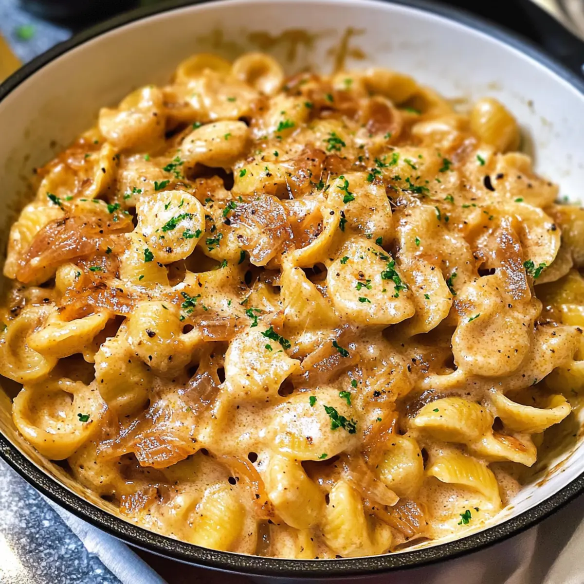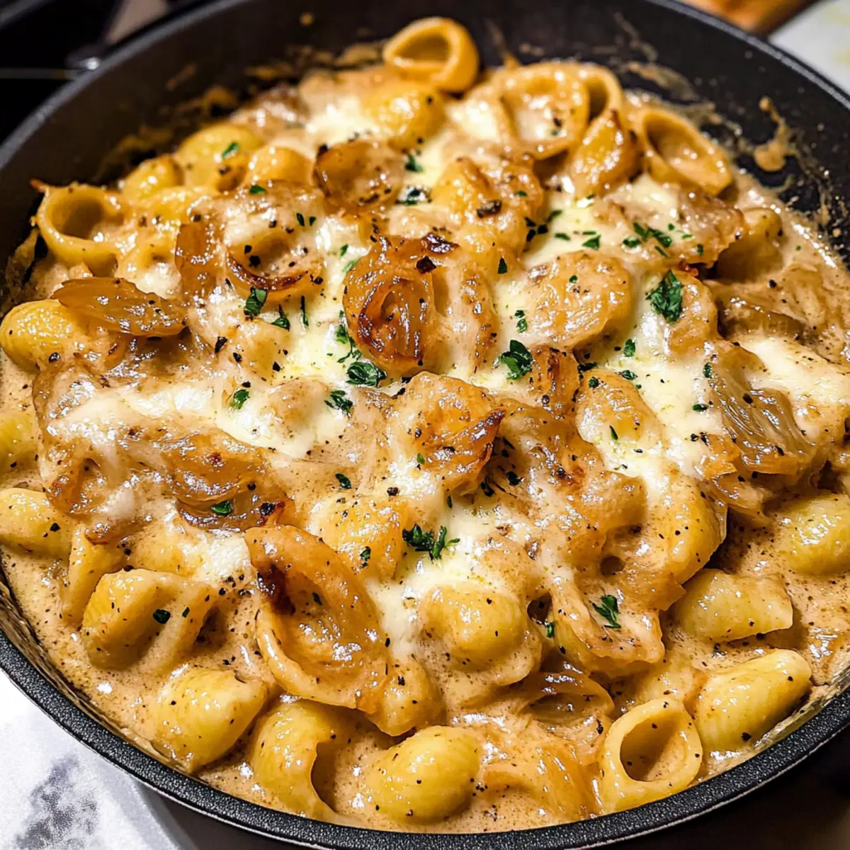 “Als ich neulich den feinen Duft von karamellisierten Zwiebeln in meiner Küche wahrnahm, war ich sofort in eine andere Welt versetzt. Ein köstliches Gericht, das Erinnerungen an gemütliche Abende weckt: die Ein-Topf Französische Zwiebel-Pasta. Diese Kombination aus cremigen Texturen und herzhaftem Geschmack macht nicht nur glücklich, sondern bringt auch eine willkommene Abwechslung in den Alltag. Mit ihrer simplen Zubereitung in nur einem Topf ist sie nicht nur ein echter Zeitretter in der Küche, sondern auch perfekt für all jene, die die Annehmlichkeiten einer köstlichen Mahlzeit lieben, ohne sich mit dem Geschirr zu überladen. Bereiten Sie sich darauf vor, dass diese Pasta jeden am Tisch verzaubert – können Sie den Komfort und die Aromen kaum erwarten?” Warum ist diese Kombination so unwiderstehlich? Ein Topf: Die Zubereitung in nur einem Topf macht dieses Rezept unglaublich praktisch und reduziert den Abwasch – ideal für beschäftigte Tage! Reichhaltiger Geschmack: Die perfekt karamellisierten Zwiebeln verleihen der Pasta eine Süße, die mit der cremigen Textur zu einem himmlischen Erlebnis verschmilzt. Vielseitig: Ob mit glutenfreier Pasta oder einer veganen Variante – diese Ein-Topf Französische Zwiebel-Pasta lässt sich leicht an deine Vorlieben anpassen. Schnelle Zubereitung: In weniger als 30 Minuten steht dieses Comfort Food auf dem Tisch, ideal für ein schnelles Abendessen unter der Woche. Lass dich auch von den zahlreichen Variationen inspirieren, um Abwechslung in deinen Menüplan zu bringen! Ein-Topf Französische Zwiebel-Pasta Zutaten • Diese Zutatenliste hilft Ihnen, alles Notwendige für die Zubereitung zusammenzustellen. Für die Pasta Orecchiette – Ideal, um die cremige Sauce gut aufzunehmen. Alternativ können auch andere kurze Pastasorten wie Radiatori oder mittlere Muscheln verwendet werden. Für die Zwiebelbasis Gelbe Zwiebeln – Unverzichtbar für die süße, karamellisierte Basis; andere Zwiebelarten sollten vermieden werden. Knoblauch – 4 Zehen, gehackt; verleiht Tiefe, kann aber auch durch weniger Knoblauchpulver ersetzt werden. Flüssige Zutaten Wasser + Rindfleischbouillon – Bildet die Basis für eine einfache Rinderbrühe; alternativ kann auch Rinderbrühe verwendet werden, um das Bouillon zu umgehen. Eingedickte Milch – Für eine cremige Konsistenz ohne Ausflocken beim Kochen; für eine milchfreie Variante bitte milchfreie Alternativen nutzen. Worcestershire-Sauce – Fügt dem Gericht umami Komplexität hinzu; vegetarische Alternativen auf Pilzbasis können verwendet werden. Sojasauce – Verstärkt den umami Geschmack; redusierte Natrium-Optionen sind empfehlenswert. Gewürze und Kräuter Frische Kräuter – Thymian und Petersilie; bringen frische Aromen; getrocknete Alternativen sind ebenfalls möglich. Gewürze –getrockneter Oregano, Paprika, rote Pfefferflocken; zum Würzen, Mengen nach Geschmack anpassen. Käse Gruyère – Beigefügt für einen nussigen Geschmack; ist entscheidend für die cremige Konsistenz. Aged Gruyère ist besonders empfehlenswert. Parmesan – Bietet eine salzige Ergänzung; für beste Ergebnisse immer frisch reiben. Diese Ein-Topf Französische Zwiebel-Pasta wird Ihre Familie mit seinem köstlichen Geschmack begeistern – ein perfektes Gericht, um den Alltag zu bereichern! Schritt-für-Schritt-Anleitung für Ein-Topf Französische Zwiebel-Pasta Schritt 1: Zwiebeln vorbereiten Schneiden Sie die gelben Zwiebeln in 1/8-Zoll-Ringe. Dies sorgt für eine gleichmäßige Karamellisierung und hilft, die Süße während des Kochens zu maximieren. Verwenden Sie ein scharfes Messer und ein Schneidebrett. Bereiten Sie Ihre Arbeitsfläche vor, damit alles griffbereit ist. Schritt 2: Zwiebeln karamellisieren Erhitzen Sie einen großen Schmortopf oder einen Dutch Oven bei mittlerer Hitze und geben Sie Butter und Olivenöl hinzu. Fügen Sie die geschnittenen Zwiebeln zusammen mit einer Prise Salz und Pfeffer hinzu. Kochen Sie die Zwiebeln unter gelegentlichem Rühren etwa 30 bis 35 Minuten, bis sie tiefgoldbraun sind und ein köstliches Aroma verströmen. Schritt 3: Aromen hinzufügen Rühren Sie den gehackten Knoblauch, die roten Pfefferflocken, die Worcestershire-Sauce und die Sojasauce in die karamellisierten Zwiebeln. Lassen Sie alles etwa 30 Sekunden lang kochen, bis die Aromen miteinander verschmelzen und der Knoblauch duftet. Dies verleiht Ihrer Ein-Topf Französischen Zwiebel-Pasta eine zusätzliche Geschmacksdimension. Schritt 4: Flüssigkeiten einführen Gießen Sie das Wasser zusammen mit der Hälfte der eingedickten Milch in den Topf und bringen Sie die Mischung zum Kochen. Mischen Sie die restliche Milch mit der Speisestärke und fügen Sie sie ebenfalls hinzu. Rühren Sie die Rinderbouillon und die Gewürze unter, um einen reichhaltigen Geschmack zu erzielen. Schritt 5: Pasta kochen Bringen Sie die Mischung zum Kochen und fügen Sie die Orecchiette hinzu. Reduzieren Sie die Hitze auf ein köcheln und lassen Sie die Pasta etwa 11 bis 14 Minuten lang ohne Deckel kochen, bis sie al dente ist. Rühren Sie häufig um, um ein Ankleben am Boden des Topfes zu vermeiden. Schritt 6: Käse einarbeiten Nehmen Sie den Topf vom Herd und rühren Sie den Gruyère-Käse in kleinen Mengen ein, gefolgt vom frisch geriebenen Parmesan. Warten Sie, bis der Käse vollständig geschmolzen ist und die Sauce eine cremige Konsistenz erreicht hat. Probieren Sie die Ein-Topf Französische Zwiebel-Pasta und passen Sie die Würze nach Bedarf an. Schritt 7: Servieren und Garnieren Garnieren Sie die Pasta mit frisch gehackter Petersilie für einen zusätzlichen Farbtupfer und Frische. Servieren Sie die köstliche Ein-Topf Französische Zwiebel-Pasta heiß und genießen Sie die herzhaften Aromen, die alle am Tisch verzaubern werden. Was serviert man zur Ein-Topf Französischen Zwiebel-Pasta? Ein köstliches Gericht zu genießen ist eine Einladung, die Geschmackserlebnisse zu erweitern und eine unvergessliche Mahlzeit zu kreier