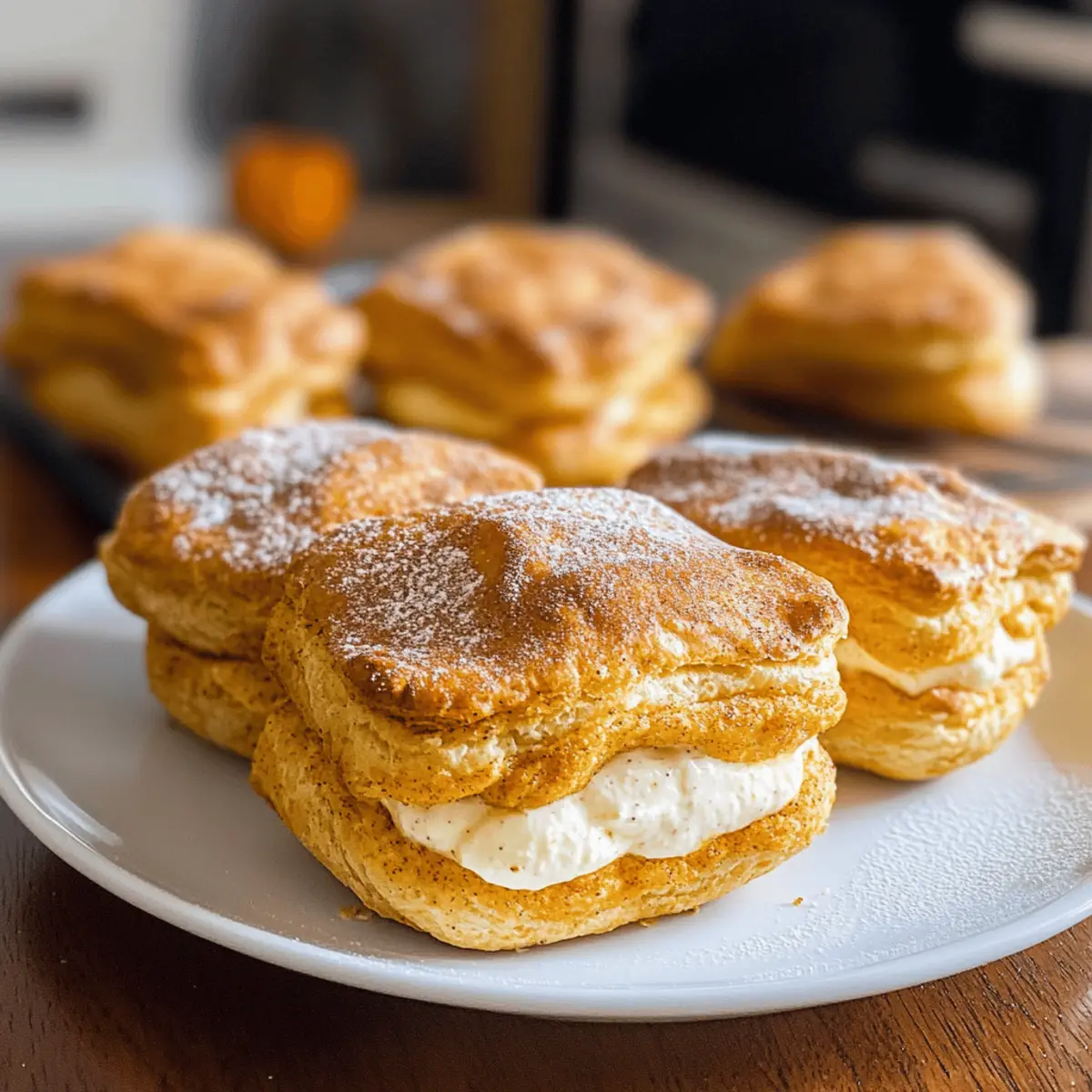Schneide die abgekühlten Blätterteigstücke vorsichtig in der Mitte durch. Piped die Kürbis-Sahne-Füllung gleichmäßig auf die untere Hälfte jedes Puffstücks. Achte darauf, dass du das Püree gleichmäßig verteilst, damit jede Portion köstlich voller Geschmack ist. Setze dann die obere Hälfte vorsichtig auf die gefüllten Bömbchen.