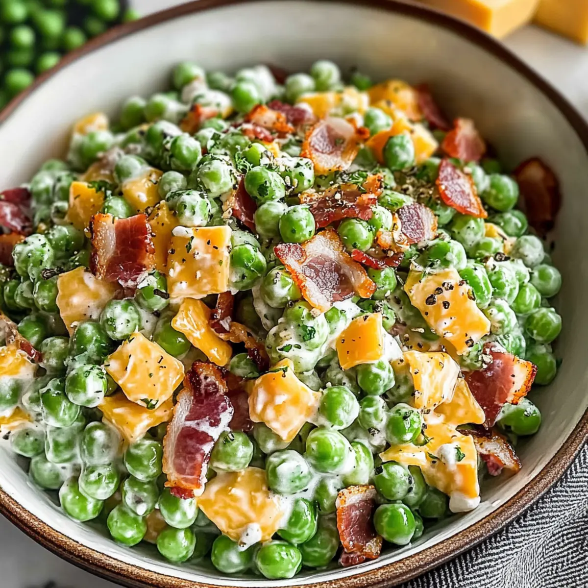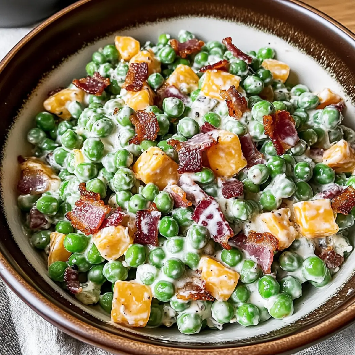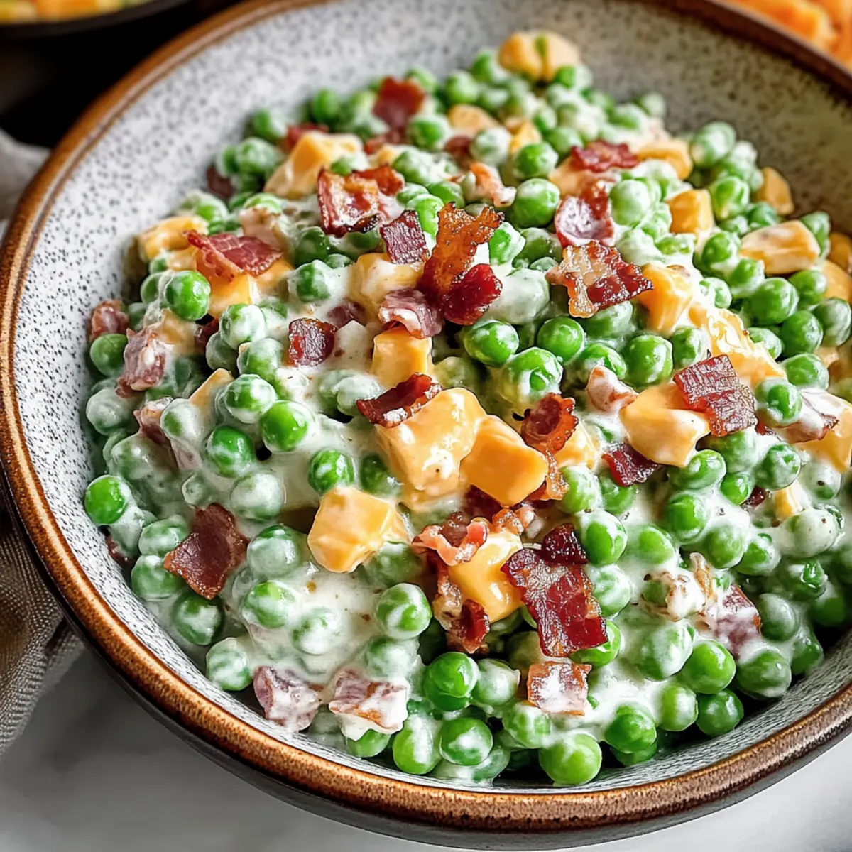 Entdecken Sie diesen cremigen Erbsensalat, eine perfekte Beilage für jede Gelegenheit.