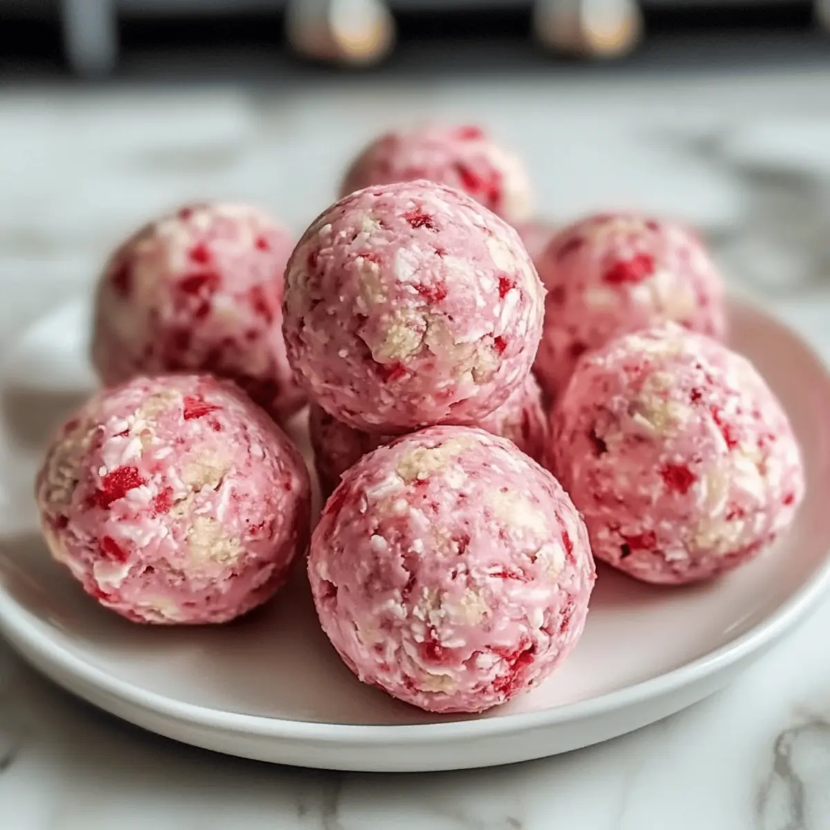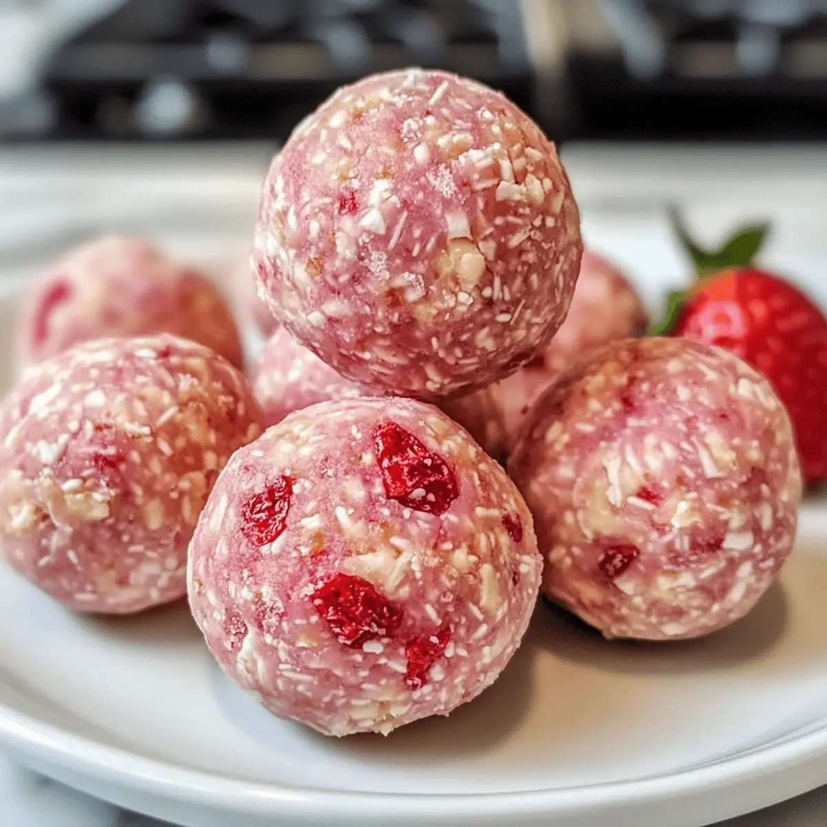 Gesunde Erdbeer-Cheesecake Proteinbällchen, perfekt für einen schnellen Snack oder Nachmittagsgenuss.