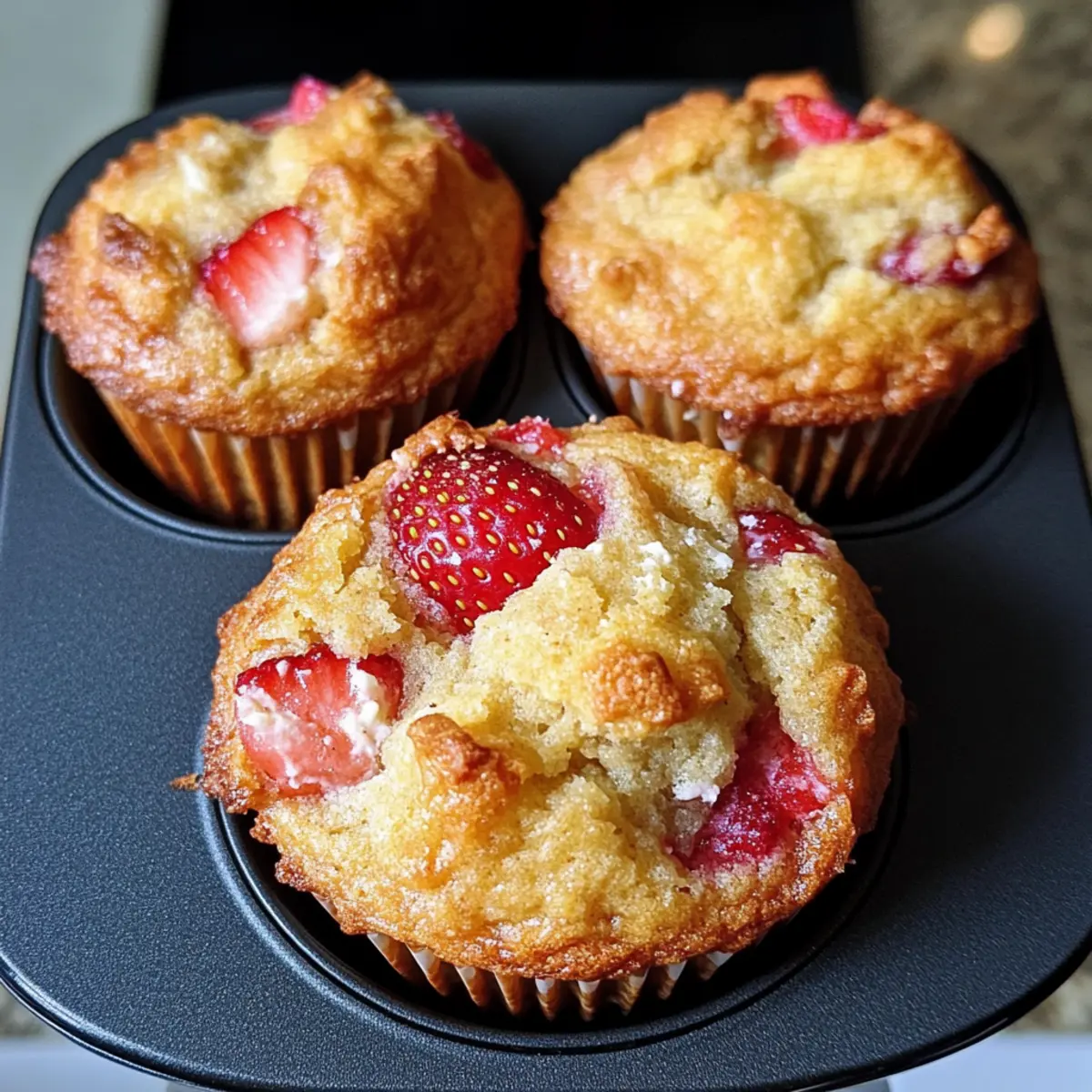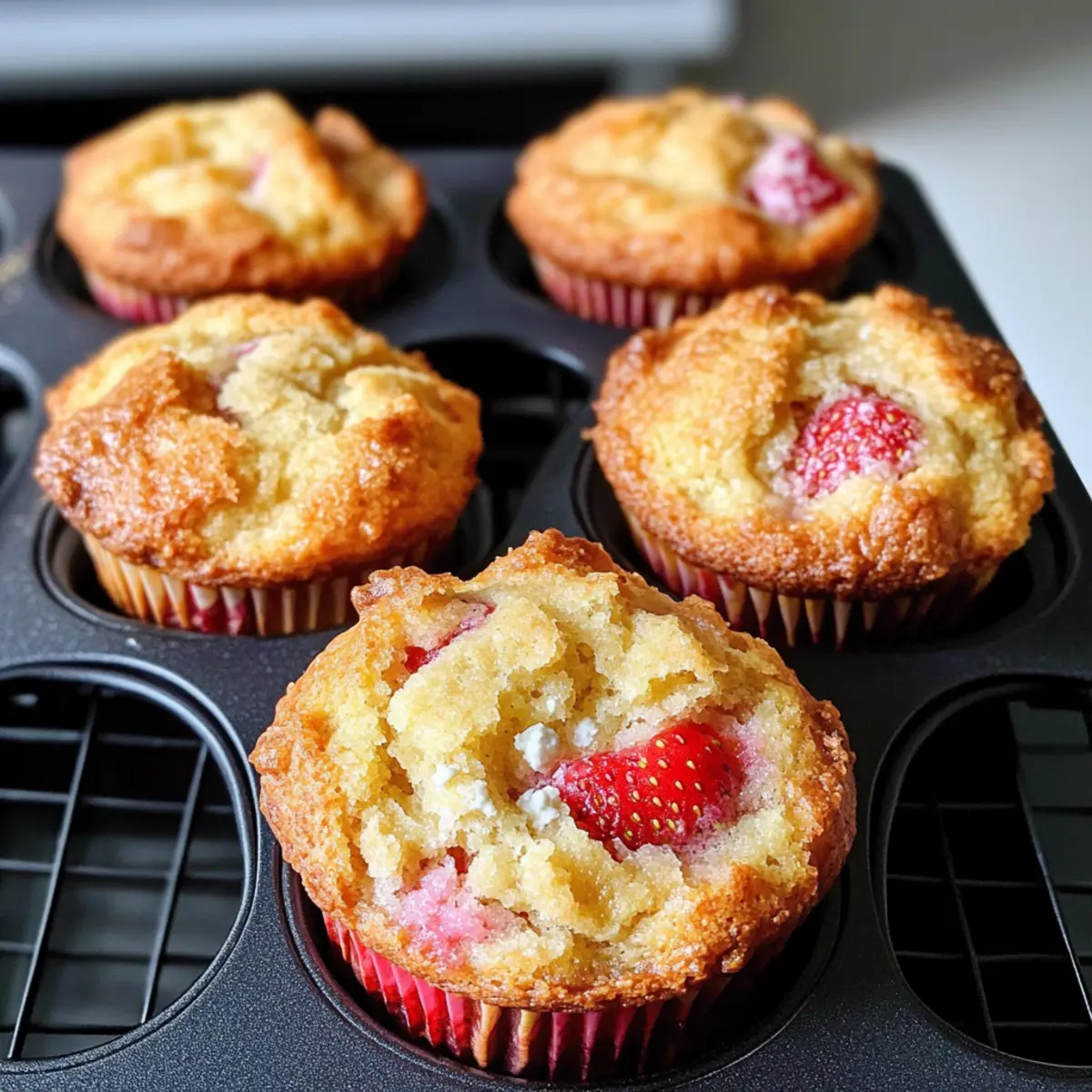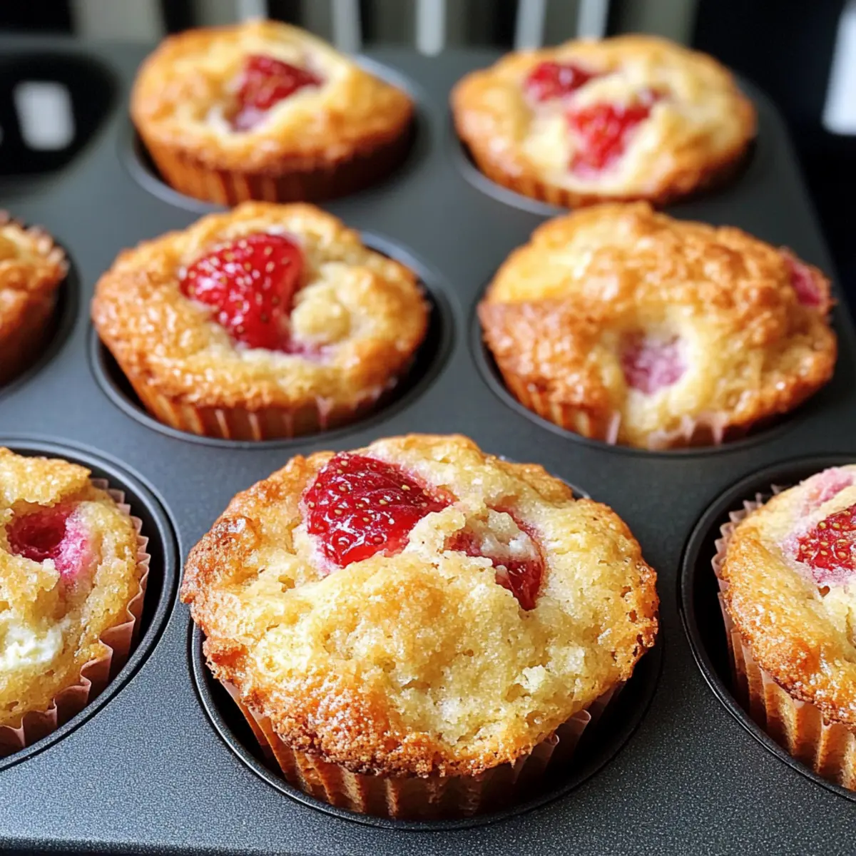 Sobald die ersten warmen Sonnenstrahlen des Frühlings durch die Fenster scheinen, steigt die Vorfreude auf frische, fruchtige Köstlichkeiten. Ich kann kaum abwarten, den herrlichen Duft von warmen Erdbeer-Ricotta-Muffins zu erleben, der bald meine Küche erfüllt. Diese leichten Muffins sind nicht nur ein geschmacklicher Hochgenuss, sie lassen sich auch im Handumdrehen zubereiten und sind perfekt für ein schnelles Frühstück oder einen süßen Snack am Nachmittag. Die Kombination aus saftigen Erdbeeren und der cremigen Ricotta verleiht ihnen eine unwiderstehliche Textur, die sowohl zu besonderen Anlässen als auch zu einem gemütlichen Brunch mit Freunden oder Familie passt. Macht ihr euch bereit, euren Tag mit diesen kleinen Geschmacksexplosionen zu bereichern? Warum sind diese Muffins unwiderstehlich? Leichtigkeit, die begeistert: Diese Erdbeer-Ricotta-Muffins sind einfach zuzubereiten und erfordern keine speziellen Kochkünste. Fruchtige Frische: Die Kombination aus saftigen Erdbeeren und cremiger Ricotta sorgt für einen frischen Geschmack, der jeden Morgen erhellt. Ideale Textur: Mit einer fluffigen, feuchten Konsistenz und einem zarten Krümel sind sie eine wahre Freude für den Gaumen. Vielfältig einsetzbar: Perfekt für ein schnelles Frühstück oder als süßer Snack – sie passen zu jeder Gelegenheit. Familienliebling: Diese Muffins werden garantiert zum Hit bei Familie und Freunden; niemand kann ihnen widerstehen! Entdecke auch unsere Tipps für erstaunliche Variationen der Muffins und genieße die Vielfalt. Erdbeer-Ricotta-Muffin-Zutaten • Einfache, ausgewogene Zutaten für köstliche Muffins. Für den Teig Allzweckmehl – Das Hauptgerüst der Muffins; am besten in gleichmäßigen Mengen verwenden. Zucker – Sorgt für die süße Note; gerne auch etwas mehr für einen süßeren Muffin. Backpulver – Unabdingbar für das Aufgehen und die fluffige Textur der Muffins. Natron – Hilft beim Aufgehen und gibt eine schöne Bräune; unbedingt verwenden. Salz – Verstärkt alle Aromen; ein essentielles Element beim Backen. Bio-Eier – Binden die Zutaten und sorgen für eine cremige Konsistenz. Ricotta – Verleiht Feuchtigkeit und eine cremige Textur; kann durch Hüttenkäse ersetzt werden. Olivenöl – Fügt Feuchtigkeit und reichhaltigen Geschmack hinzu; kann mit geschmolzener Butter substituiert werden. Frisch gepresster Orangensaft – Unterstützt die Feuchtigkeit und fügt eine fruchtige Note hinzu; kann auch durch Zitronensaft ersetzt werden. Erdbeeren (in Stücke geschnitten) – Sorgen für süßen Frischekick; lässt sich auch durch Heidelbeeren oder Himbeeren ersetzen. Entdecke, wie diese Zutaten zusammenkommen, um die perfekten Erdbeer-Ricotta-Muffins zu kreieren! Schritt-für-Schritt-Anleitung für Erdbeer-Ricotta-Muffins Step 1: Ofen vorheizen Heizen Sie Ihren Ofen auf 190 °C (375 °F, Umluft) vor. Bereiten Sie ein Muffinblech vor, indem Sie es mit Papierbackformen auslegen, um das Anhaften der Muffins zu verhindern. Diese Vorbereitungen sind wichtig, um gleichmäßige Muffins zu gewährleisten, die beim Backen nicht aneinander kleben. Step 2: Trockene Zutaten vermengen In einer großen Schüssel kombinieren Sie das Allzweckmehl, den Zucker, das Backpulver, das Natron und das Salz. Mischen Sie die Zutaten gründlich, bis sie gleichmäßig verteilt sind, was etwa 1–2 Minuten dauert. Diese entscheidende Mischung sorgt für die Basis der luftigen, leckeren Erdbeer-Ricotta-Muffins. Step 3: Nasszutaten mischen In einer separaten Schüssel verquirlen Sie die Eier, den Ricotta, das Olivenöl und den frisch gepressten Orangensaft, bis die Mixtur leicht und cremig ist. Dies sollte etwa 3–4 Minuten dauern, um eine fluffige Konsistenz zu erhalten. Durch diesen Schritt wird die Feuchtigkeit und der Geschmack in die Muffins eingebracht. Step 4: Trockene und nasse Zutaten kombinieren Fügen Sie die nassen Zutaten zu der trockenen Mischung hinzu und rühren Sie vorsichtig, bis die Mischung gerade so kombiniert ist. Es ist wichtig, dass der Teig noch klumpig ist mit einigen sichtbaren Mehlnester, um die perfekte Textur der Erdbeer-Ricotta-Muffins zu erzielen. Vermeiden Sie es, zu lange zu rühren. Step 5: Erdbeeren unterheben Falten Sie jetzt sanft die in Stücke geschnittenen Erdbeeren in den Teig, um gleichmäßige Verteilung zu gewährleisten und die zarten Früchte nicht zu zerdrücken. Dieser Schritt fügt den begehrten fruchtigen Geschmack hinzu und sorgt für saftige Überraschungen in jedem Bissen der Muffins. Step 6: Muffinförmchen füllen Füllen Sie die vorbereiteten Muffinförmchen mit dem Teig, bis sie etwa zu zwei Dritteln gefüllt sind. Dies gewährleistet, dass genug Platz zum Aufgehen bleibt. Stellen Sie sicher, dass der Teig gleichmäßig auf die Formen verteilt ist, um ein gleichmäßiges Backen zu ermöglichen. Step 7: Backen der Muffins Backen Sie die Muffins im vorgeheizten Ofen für etwa 18 Minuten, bis sie goldbraun sind und sich fest anfühlen. Um sicherzustellen, dass sie gut durchgebacken sind, können Sie sanft auf die Unterseite eines Muffins drücken; sie sollten fest und nicht matschig sein. Step 8: Abkühlen und servieren Lassen Sie die Muffins etwa 5 Minuten im Blech abkühlen, bevor Sie sie auf ein Kuchengitter setzen. Wenn die Muffins vollständig abgekühlt sind, können Sie die Oberseite mit einer Prise Zucker bestreuen, um sie noch verlockender zu machen. Servieren Sie die Erdbeer-Ricotta-Muffins warm und genießen Sie die fruchtigen Aromen! Expertentipps für Erdbeer-Ricotta-Muffins Nicht übermixen: Vermeiden Sie es, den Teig zu stark zu verrühren, um die fluffige Textur der Erdbeer-Ricotta-Muffins zu erhalten. Ein paar Klumpen sind absolut in Ordnung! Backzeit beachten: Halten Sie die Zeit im Auge! Überbacken kann die Muffins trocken machen; testen Sie sie nach 18 Minuten auf Festigkeit. Zucker anpassen: Passen Sie die Zuckermenge je nach persönlichem Geschmack an. Wenn Sie es lieber süßer mögen, erhöhen Sie die Zucker