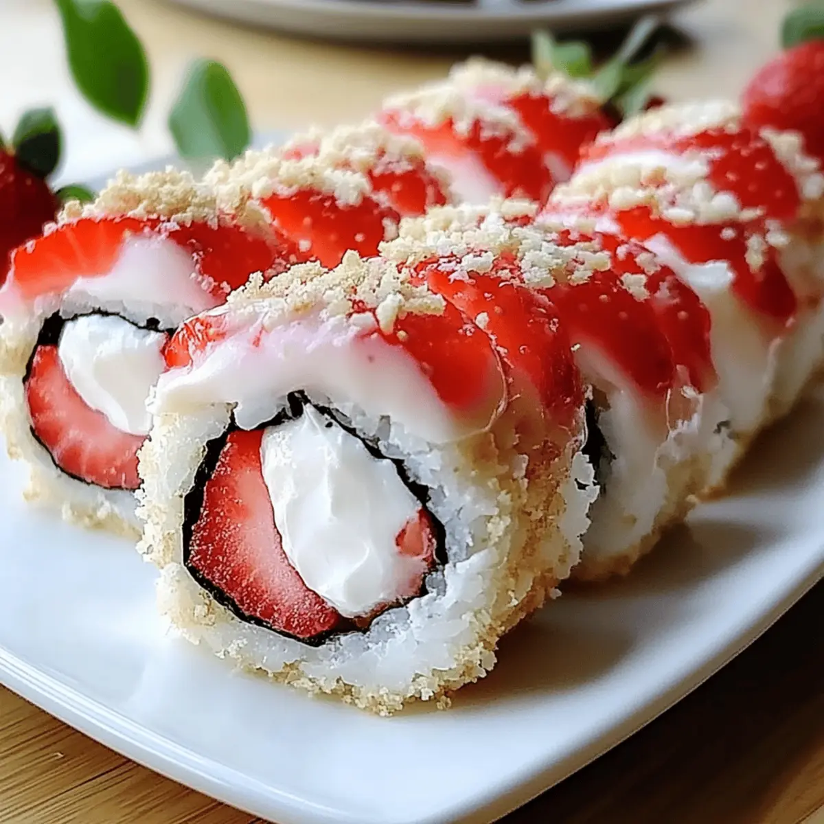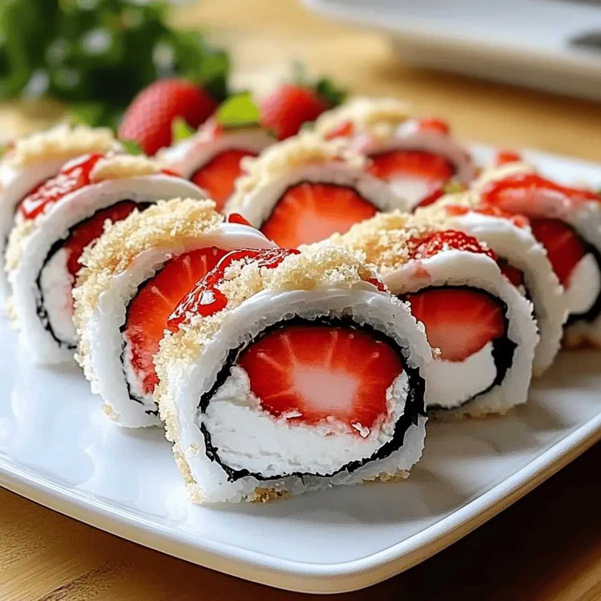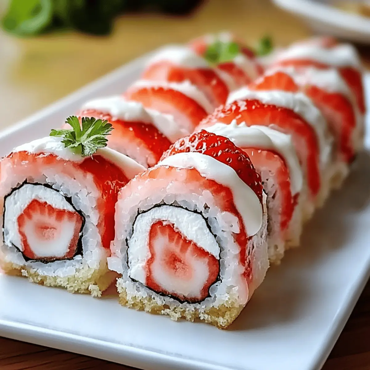 Als ich das erste Mal diese niedlichen Erdbeer-Shortcake-Sushi-Rollen zubereitete, war ich sofort verzaubert von ihrem Anblick und dem verlockenden Geschmack. Diese kreative Leckerei vereint die cremige Zartheit einer Käsekuchenfüllung mit dem luftigen Biskuit und frischen Erdbeeren – alles in handlichen, entzückenden Sushi-Röllchen. Perfekt für Partys, Hochzeiten oder einfach nur, um sich selbst zu verwöhnen, sind diese no-bake Desserts nicht nur schnell zubereitet, sondern auch ein echter Hingucker, der sicher für Begeisterung sorgen wird. Wer könnte da Nein sagen zu so einer süßen Verführung? Lass uns gemeinsam entdecken, wie einfach und spaßig es ist, diese außergewöhnlichen Leckereien zuzubereiten! Warum sind diese Sushi-Rollen so besonders? Einzigartig und kreativ: Diese Erdbeer-Shortcake-Sushi-Rollen bringen das Dessertspiel auf ein neues Level und kombinieren bekannte Geschmäcker auf eine ganz neue Weise. Einfach und schnell: Perfect für beschäftigte Home-Chefs! Innerhalb kürzester Zeit zubereitet, ideal für den unerwarteten Besuch oder eine süße Belohnung. Vielseitig: Du kannst mit verschiedenen Früchten experimentieren oder die Füllung nach deinem Geschmack anpassen, um deine eigenen Varianten zu kreieren. Vielleicht probierst du mal andere einfache Rezepte aus? Augenschmaus: Die bunten Röllchen sind ein absoluter Hingucker auf jeder Party und werden deine Gäste garantiert begeistern. Leicht und frisch: Mit frischen Zutaten wie Erdbeeren ist dieses Dessert nicht nur lecker, sondern auch eine leichtere Option für Naschkatzen. Erdbeer-Shortcake-Sushi-Rollen Zutaten • Diese zauberhaften Erdbeer-Shortcake-Sushi-Rollen sind nicht nur ein Genuss für den Gaumen, sondern auch einfach zuzubereiten! Für den Biskuit Biskuitkuchen – Verwende einen selbstgemachten oder gekauften Biskuit, achte darauf, dass er vollständig abgekühlt ist, bevor du ihn füllst. Vanilleextrakt – Für den besten Geschmack solltest du echten Vanilleextrakt verwenden. Für die Füllung Frischkäse – Er verleiht den Röllchen ihre Cremigkeit; du kannst auch Mascarpone als interessante Alternative verwenden. Puderzucker – Süßtheitssteigerung; passe die Menge nach deinem Geschmack an und nutze ggf. alternative Süßungsmittel. Schlagsahne – Sie sorgt für Leichtigkeit; du kannst auch aromatisierte Schlagsahne für zusätzliche Einzigartigkeit wählen. Für die Füllung und Dekoration Erdbeer-Marmelade – Sie gibt Feuchtigkeit und Süße; ersetze sie durch andere Fruchtaufstriche, wenn gewünscht. Frische Erdbeeren – Für den besten Geschmack und die Frische; tiefgefrorene Erdbeeren sind ebenfalls möglich, wenn sie gut abgetropft sind. Weiße Schokolade (optional) – Perfekt zum Drizzeln; du kannst sie durch Zartbitter-Schokolade ersetzen, um einen anderen Geschmack zu erzielen. Diese Zutaten machen deine Erdbeer-Shortcake-Sushi-Rollen zu einem frischen und kreativen Dessert, das perfekt für jeden Anlass geeignet ist! Schritt-für-Schritt-Anleitungen für Erdbeer-Shortcake-Sushi-Rollen Step 1: Biskuit vorbereiten Bereite deinen Biskuitkuchen vor, indem du ihn entweder selbst backst oder ein gekauftes Produkt verwendest. Lege den Biskuitfladen auf ein mit Backpapier ausgelegtes Blech und lasse ihn vollständig abkühlen. Es ist wichtig, dass der Biskuit gut abgekühlt ist, bevor du mit dem Füllen beginnst, um ein Durchweichen zu vermeiden. Step 2: Füllung zubereiten In einer Rührschüssel den Frischkäse mit dem Puderzucker und dem Vanilleextrakt glatt rühren. Nutze einen elektrischen Mixer oder einen Schneebesen, um eine cremige Konsistenz zu erreichen. Füge die Schlagsahne hinzu und falte sie vorsichtig unter, bis alles gut vermischt ist. Die Füllung sollte leicht und fluffig sein, perfekt für deine Erdbeer-Shortcake-Sushi-Rollen. Step 3: Füllung auf dem Biskuit verteilen Verteile gleichmäßig eine Schicht Erdbeer-Marmelade über den abgekühlten Biskuit. Achte darauf, dass die Marmelade nicht zu dick aufgetragen wird, damit die Röllchen später gut rollen können. Anschließend kommt die cremige Frischkäsefüllung darauf, gefolgt von den gewürfelten frischen Erdbeeren. Stelle sicher, dass die Füllung gleichmäßig verteilt ist, um köstliche Bissen zu erhalten. Step 4: Röllchen formen Beginne an einem kurzen Ende des Biskuits und rolle den Kuchen mithilfe des Backpapiers oder einer Silikonmatte vorsichtig auf. Drücke leicht, damit die Füllung an ihrem Platz bleibt, und achte darauf, dass die Rolle fest, aber nicht zu straff wird. Wickele die Rolle vollständig ein und lege sie im Kühlschrank für 20 bis 30 Minuten, damit sie fest wird. Step 5: Röllchen schneiden Nehme die gekühlte Rolle aus dem Kühlschrank und benutze ein scharfes Messer, um sie in 1-Zoll große Stücke zu schneiden. Achte darauf, die Klinge zwischen den Schnitten zu reinigen, um saubere Kanten zu erreichen. So sehen deine Erdbeer-Shortcake-Sushi-Rollen besonders appetitlich aus. Step 6: Anrichten und dekorieren Lege die geschnittenen Röllchen auf eine hübsche Servierplatte. Optional kannst du geschmolzene weiße Schokolade darüberträufeln für einen zusätzlichen Farbtupfer und Geschmack. Garniere die Platte nach Belieben mit frischen Minzblättern oder einem Klecks Schlagsahne, um deine Erdbeer-Shortcake-Sushi-Rollen noch ansprechender zu machen. Was passt zu Erdbeer-Shortcake-Sushi-Rollen? Lass uns eine unvergessliche Kombination schaffen, die deinem Dessert eine köstliche Note verleiht und die Geschmacksknospen verzaubert. Frischer Minztee: Ein aromatischer Minztee bringt Frische und Leichtigkeit, die das Dessert wunderbar ergänzt. Zitronensorbet: Das erfrischende Sorbet hebt die Aromen der Erdbeeren hervor und sorgt für einen interessanten Kontrast. Erdbeer-Limonade: Eine spritzige selbstgemachte Limonade mit Erdbeeren und Zitrone rundet das Geschmackserlebnis ab und erfreut den Gaumen. Kokosnuss-Schlagsahne: Diese Alternative zur klassischen Schlagsahne bringt einen 