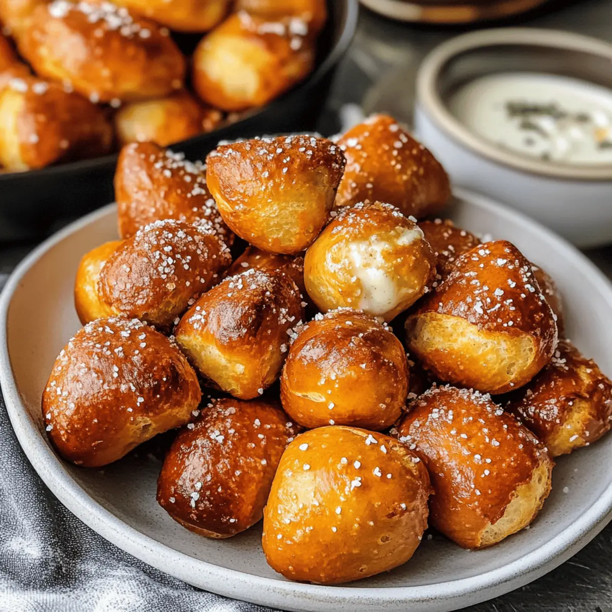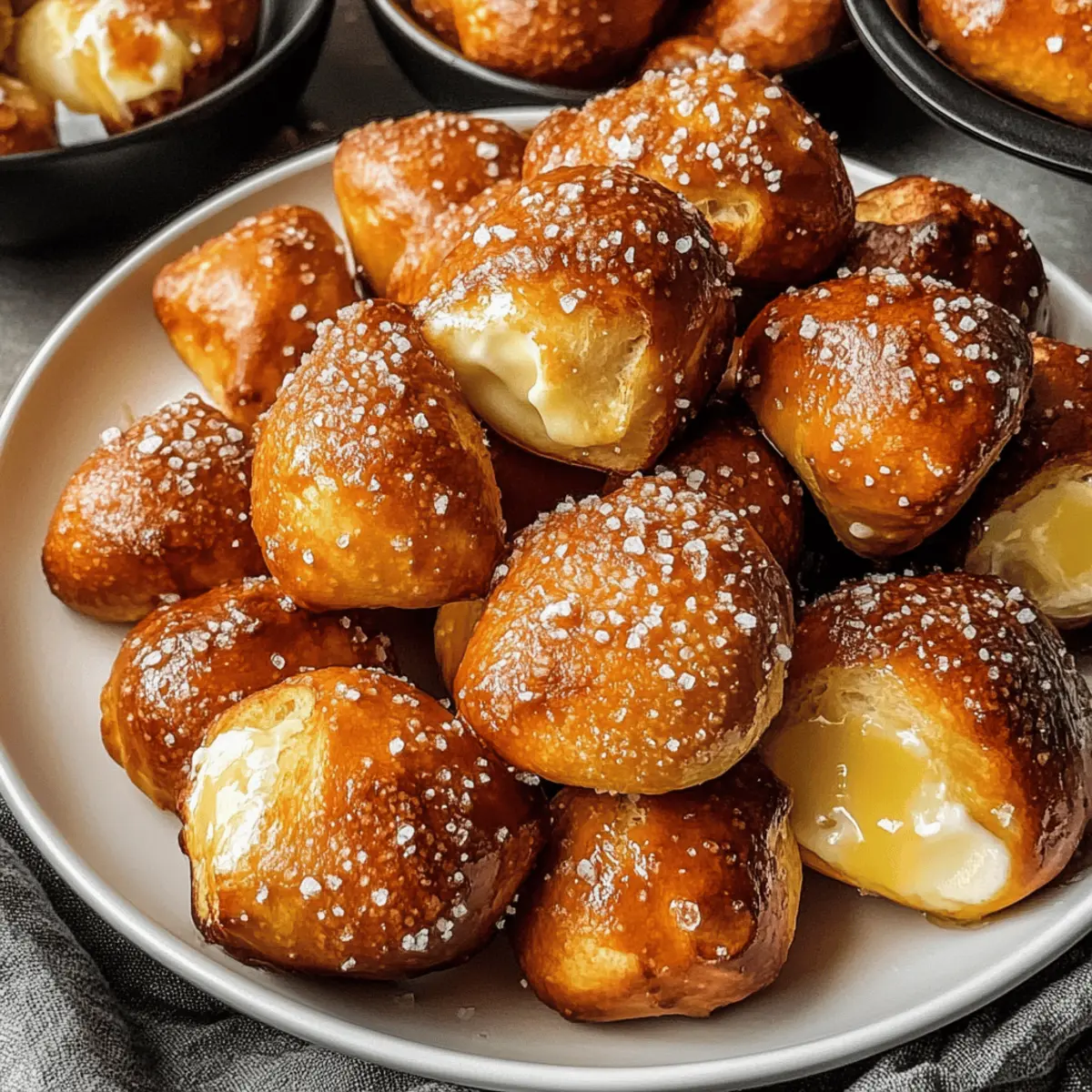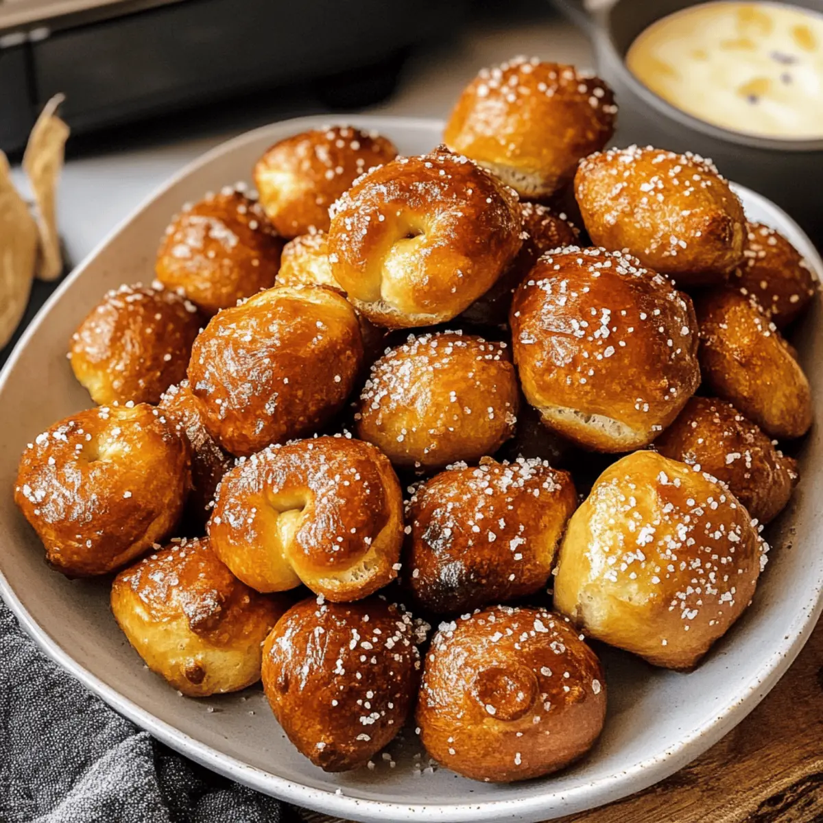 Vor ein paar Tagen stand ich in meiner Küche, als die Idee für die 10-Minuten fluffigen Air-Fryer-Brezel-Bissen entstanden ist. Diese kleinen Snacks bieten eine perfekt knusprige Außenseite und ein weiches, zäheres Innere, das meine Geschmacksknospen sofort dazu einlud, sich zu entspannen. Was mir besonders gefällt, ist, dass sie nicht nur schneller und gesünder sind als die gekauften Alternativen, sondern auch eine tolle Möglichkeit darstellen, kreativ zu werden – denken Sie nur an all die köstlichen Dips, die Sie dazu verwenden können! Ob für einen gemütlichen Filmabend oder als schnelles Mittagessen, diese Brezel-Bissen sind ein echter Publikumsliebling und einfach zuzubereiten. Wer könnte da widerstehen? Neugierig, welche Dips am besten dazu passen? Warum werden Sie dieses Rezept lieben? Einfachheit: Der gesamte Prozess dauert nur 10 Minuten, sodass Sie schnell ein köstliches Snack-Erlebnis genießen können. Vielseitigkeit: Diese Brezelbissen passen perfekt zu einer Vielzahl von Dips wie Senf oder Käsesoße, was sie zu einem großartigen Snack für jede Gelegenheit macht. Gesundheitsbewusst: Dank der Zubereitung im Airfryer sind sie fettärmer als die traditionellen Varianten, ohne Kompromisse beim Geschmack einzugehen. Genuss in jedem Biss: Mit einer knusprigen Außenseite und einem weichen Inneren erleben Sie die perfekte Textur, die Ihre Geschmacksknospen verwöhnt. Entdecken Sie auch die Serviervorschläge für noch mehr Kreativität in der Küche! Zutaten für die Brezelbissen • Für ein schnelles Snack-Erlebnis. Für den Teig: Warmes Wasser – Aktiviert die Hefe optimal; verwenden Sie etwa 110°F. Weizenmehl – Liefert die Struktur der Brezel; glutenfreies Mehl kann verwendet werden. Schnellhefe – Lässt den Teig zügig aufgehen, damit die Brezelbissen schnell zubereitet sind. Meersalz – Verstärkt den Geschmack im Teig; kann durch koscheres Salz ersetzt werden. Zucker (oder Honig) – Gibt eine leichte Süße; optional, aber empfehlenswert. Geschmolzene Butter – Sorgt für reichhaltigen Geschmack; kann auch mit Öl ersetzt werden. Für das Topping: Brezelsalz (optional) – Klassisches Topping für Brezelbissen; kann durch grobes Meersalz ersetzt oder weggelassen werden. Genießen Sie diese fluffigen Brezelbissen mit Ihren Lieblingsdips! Schritt-für-Schritt-Anleitungen für fluffige Brezelbissen aus der Heißluftfritteuse in 10 Minuten Schritt 1: Warmwasser und Hefe aktivieren Erhitzen Sie das Wasser auf etwa 43°C (110°F) und gießen Sie es in eine Schüssel. Mischen Sie das warme Wasser mit der Schnellhefe und lassen Sie es etwa 5 Minuten stehen, bis die Mischung schäumt. Dies aktiviert die Hefe und sorgt dafür, dass Ihre Brezelbissen fluffig werden. Schritt 2: Teig vorbereiten In einer separaten Schüssel vermengen Sie das Weizenmehl, den Zucker und das Meersalz. Gießen Sie die aktivierte Hefemischung dazu und rühren Sie alles gut um, bis ein klebriger Teig entsteht. Kneten Sie den Teig einige Minuten lang, bis er glatt ist, und lassen Sie ihn dann für etwa 2 Minuten ruhen, um die Konsistenz zu verbessern. Schritt 3: Teig formen Bestäuben Sie eine Arbeitsfläche leicht mit Mehl, um das Festkleben zu verhindern. Teilen Sie den Teig in 8 gleich große Stücke und rollen Sie jedes Stück zu langen Schlangen. Schneiden Sie diese Schlangen in 2,5 cm große Stücke, die die Form von Brezelbissen haben. Achten Sie darauf, dass sie gleichmäßig groß sind, um ein gleichmäßiges Garen zu gewährleisten. Schritt 4: Airfryer vorbereiten Sprühen Sie den Korb der Heißluftfritteuse leicht mit Öl ein, um ein Ankleben der Brezelbissen zu verhindern. Legen Sie die geformten Brezelbissen vorsichtig in den Korb, dabei darauf achten, dass zwischen den einzelnen Bissen genügend Platz bleibt, damit sie beim Garen aufgehen können. Schritt 5: Brezelbissen garen Bestreichen Sie die Brezelbissen nun gleichmäßig mit geschmolzener Butter, was ihnen Geschmack und eine schöne Bräunung verleiht. Stellen Sie die Heißluftfritteuse auf 200°C (400°F) ein und garen Sie die Brezelbissen für etwa 7 Minuten. Sie sind fertig, wenn sie goldbraun aussehen und einen köstlichen Duft verbreiten. Schritt 6: Fertigstellen und servieren Lassen Sie die Brezelbissen nach dem Garen kurz abkühlen. Bestreichen Sie sie erneut mit der restlichen geschmolzenen Butter und streuen Sie nach Belieben Brezelsalz oder grobes Meersalz darüber. Servieren Sie Ihre fluffigen Brezelbissen warm, um den vollen Genuss zu erleben, und genießen Sie sie mit Ihren Lieblingsdips. Was passt zu den 10-Minuten fluffigen Airfryer-Brezel-Bissen? Diese köstlichen Brezelbissen sind der perfekte Ausgangspunkt für ein Snack-Erlebnis, das Ihre Geschmacksknospen verwöhnt und Ihre Kreativität in der Küche anregt. Cremiger Käse-Dip: Der reichhaltige Geschmack von geschmolzenem Käse ergänzt die Brezelbissen hervorragend und sorgt für ein gemütliches Snack-Erlebnis. Scharfer Senf: Die würzige Note von scharfem Senf bietet einen tollen Kontrast zur milden Süße der Brezelbissen. Kräuterbutter: Ein einfacher Dip aus geschmolzener Butter mit frischen Kräutern verleiht diesen Snacks einen aromatischen Kick, der unwiderstehlich ist. Ranch-Dressing: Dieser cremige Dip ist ein beliebter Begleiter und verbindet sich perfekt mit der warmen, zähen Textur der Brezelbissen. Süßer Honig-Senf: Eine Mischung aus süßem Honig und würzigem Senf ergibt einen einzigartigen Dip, der eine köstliche Balance schafft. Frischer Gemüse-Salat: Ein knackiger Salat sorgt für eine frische Komponente, die die herzhaften Brezelbissen wunderbar ausgleicht und das Gericht abrundet. Limonade: Ein spritziges Getränk wie hausgemachte Limonade erfrischt und passt perfekt zu den warmen Brezelbissen. Diese Kombinationen machen aus den 10-Minuten fluffigen Airfryer-Brezel-Bissen ein unvergessliches Snack-Erlebnis für jede Gelegenheit! Tipps zur Vorbereitung der fluffigen Brezelbissen aus der Heißluftfritteuse Die fluffigen B