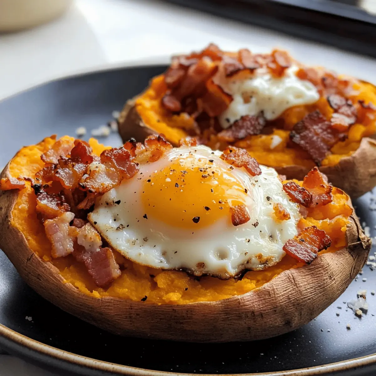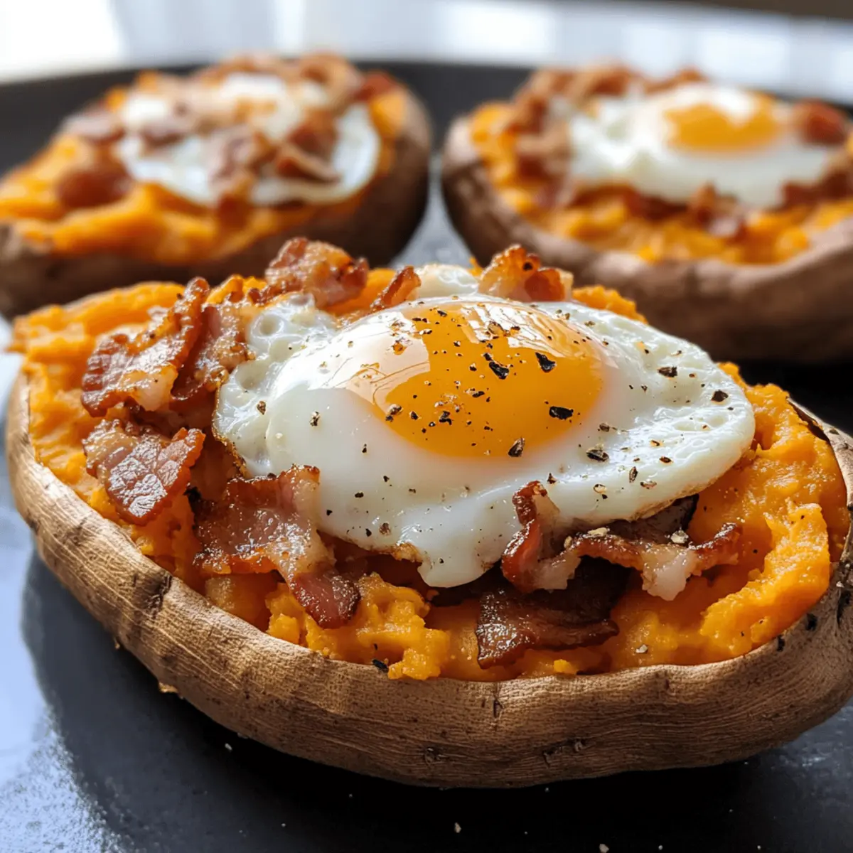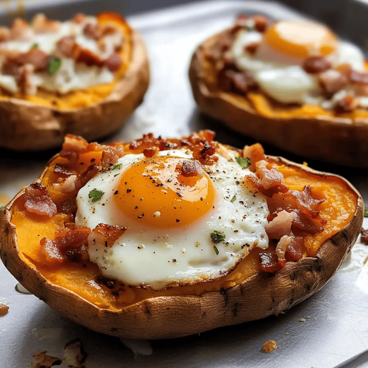 Es war einmal ein sonniger Morgen, als ich beschloss, mein Frühstück auf eine neue Ebene zu heben. Anstelle von langweiligem Toast oder schnellem Müsli, entschied ich mich für ein Gericht, das mich vom ersten Bissen an begeistern würde: Frühstück Süßkartoffeln, gefüllt mit knusprigem Bacon, frischem Ei und geschmolzenem Käse. Diese nahrhaften und herzhaften Köstlichkeiten sind nicht nur ein Genuss für den Gaumen, sondern auch perfekt für hektische Morgen – sie lassen sich schnell zubereiten und sind einfach anpassbar. Egal, ob Sie sie vorher zubereiten oder erst bei Bedarf in der Mikrowelle aufwärmen, mit diesen süßen Kartoffeln wird Ihr Frühstück nicht nur sättigend, sondern auch voller Geschmack. Neugierig, wie Sie dieses einfache Rezept in Ihr Morgenritual einbauen können? Warum werden Sie dieses Rezept lieben? Einfachheit: Die Zubereitung ist kinderleicht! Sie benötigen nur grundlegende Kochfähigkeiten, um diese köstlichen Frühstück Süßkartoffeln zuzubereiten. Herzhafter Geschmack: Die Kombination aus knusprigem Bacon, geschmolzenem Käse und frischen Eiern sorgt für ein geschmackliches Erlebnis, das Sie begeistern wird. Vielseitigkeit: Passen Sie das Rezept nach Belieben an! Tauschen Sie Bacon gegen Gemüse oder probieren Sie verschiedene Käsesorten aus. Schnelle Zubereitung: Ideal für hektische Morgen – bereiten Sie die Süßkartoffeln im Voraus vor oder wärmen Sie sie in der Mikrowelle auf, wann immer Sie Lust haben. Nährstoffreich: Diese Frühstücksoption ist nicht nur lecker, sondern auch reich an Vitaminen und Proteinen, die energisch in den Tag starten. Publikumsliebling: Ob für die Familie oder Brunch-Gäste, diese gefüllten Süßkartoffeln werden bestimmt ein Hit sein! Frühstück Süßkartoffeln Zutaten • Für ein nahrhaftes Frühstück ist diese Mischung unerlässlich. Für die Füllung Süßkartoffeln – Die Grundlage des Gerichts, die natürliche Süße und Nährstoffe liefert. Substitution: Regelmäßige Kartoffeln sind eine mögliche Option, jedoch bieten süße Kartoffeln einen einzigartigen Geschmack und gesundheitliche Vorteile. Bacon – Fügt einen herzhaften, rauchigen Geschmack und reichhaltige Textur hinzu. Hinweis: Für eine leichtere Option kann auch Truthahnbacon oder vegetarischer Bacon verwendet werden. Unsalzene Butter – Verbessert den Geschmack und sorgt für Feuchtigkeit. Substitution: Olivenöl kann für eine milchfreie Alternative verwendet werden. Geriebener weißer Cheddar – Bringt Cremigkeit und einen leichten Schmelz in die Füllung. Substitution: Andere Käsesorten wie Mozzarella oder Pepper Jack bieten verschiedene Geschmacksrichtungen. Eier – Liefert Protein und dient als Hauptbestandteil für den Belag. Hinweis: Freilandeier oder biologische Eier werden für besseren Geschmack empfohlen. Schwarzer Pfeffer & Salz – Wesentliche Gewürze, die die Aromen verstärken. Passen Sie die Menge nach Geschmack an; Kräuter wie Thymian oder Schnittlauch können für zusätzliche Frische hinzugefügt werden. Gehackte Frühlingszwiebeln (optional) – Dient zur Garnierung und fügt einen milden Zwiebelgeschmack sowie Farbe hinzu. Substitution: Frische Petersilie oder Koriander können für eine andere Kräuter-Note verwendet werden. Step-by-Step Instructions for Frühstück Süßkartoffeln gefüllt mit Bacon und Ei Step 1: Süßkartoffeln vorbereiten Heizen Sie den Ofen auf 180°C vor. Stechen Sie die Süßkartoffeln mit einer Gabel mehrmals ein, um Dampf entweichen zu lassen. Bestreichen Sie die Kartoffeln leicht mit Canola-Öl und bestreuen Sie sie mit etwas Salz. Backen Sie die Süßkartoffeln für 60 bis 90 Minuten, bis sie zart sind und sich leicht mit einer Gabel durchstechen lassen. Step 2: Kartoffeln aushöhlen Nachdem die Süßkartoffeln gebacken wurden, lassen Sie sie ein wenig abkühlen. Schneiden Sie jede Süßkartoffel der Länge nach in zwei Hälften und schöpfen Sie vorsichtig das Innere mit einem Löffel in eine Rührschüssel, ohne die Schalen zu zerreißen. Die ausgehöhlte Süßkartoffel sollte weich und fluffig sein, perfekt für die Füllung. Step 3: Füllung zubereiten Mischen Sie das ausgepumpte Kartoffelinnere mit dem zerbröselten Bacon, der Butter und dem geriebenen Käse in der Rührschüssel. Rühren Sie alles gut durch, bis eine homogene Mischung entsteht. Diese Mischung sollte schön cremig und geschmackvoll sein, bereit für die Füllung Ihrer Kartoffelschalen. Step 4: Kartoffeln füllen Legen Sie die ausgehöhlten Süßkartoffelhälften auf ein Backblech. Füllen Sie jede Hälften großzügig mit der Kartoffelmischung, wobei Sie in der Mitte eine kleine Vertiefung für das Ei schaffen, damit es beim Backen gleichmäßig gar wird. Die gefüllten Kartoffeln sollten gut portioniert aussehen. Step 5: Eier hinzufügen Knacken Sie ein Ei vorsichtig in jede Vertiefung der gefüllten Kartoffeln. Achten Sie darauf, dass das Eigelb intakt bleibt. Streuen Sie eine Prise Salz und Pfeffer über die Eier, um den Geschmack zu verstärken. Die Kombination aus Ei und Füllung wird das Aroma der Frühstück Süßkartoffeln wunderbar abrunden. Step 6: Erneut backen Geben Sie das Backblech mit den gefüllten Süßkartoffeln zurück in den Ofen und backen Sie sie für 15 bis 20 Minuten. Achten Sie darauf, dass die Eier fest sind und die Süßkartoffeln durchgewärmt sind. Die Oberfläche sollte leicht goldbraun sein, was auf eine perfekte Konsistenz des Gerichts hindeutet. Garnieren Sie die warmen Kartoffeln optional mit gehackten Frühlingszwiebeln für einen frischen Geschmack. Meal Prep für Frühstück Süßkartoffeln gefüllt mit Bacon und Ei Die Frühstück Süßkartoffeln gefüllt mit Bacon und Ei eignen sich hervorragend für die Vorbereitung im Voraus! Sie können die Süßkartoffeln bis zu 24 Stunden im Voraus backen und die Füllung zubereiten. Lagern Sie die gefüllten Kartoffeln in einem luftdichten Behälter im Kühlschrank; so bleiben sie frisch und köstlich. Wenn Sie bereit sind,