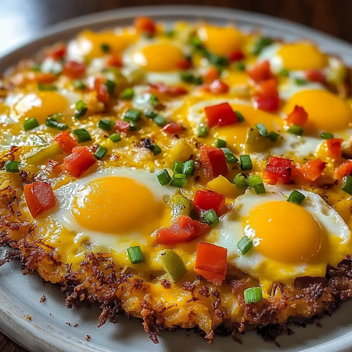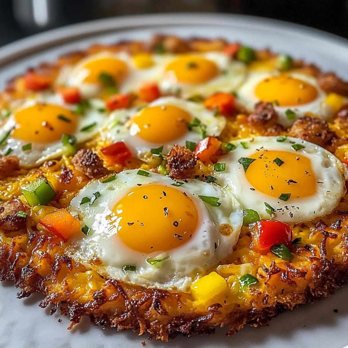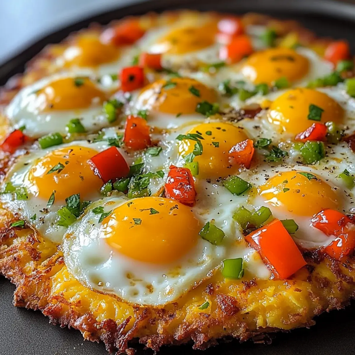 Genießen Sie diese Frühstücks-Pizza mit knusprigem Röstkartoffel-Boden, einem nahrhaften Start in den Tag.