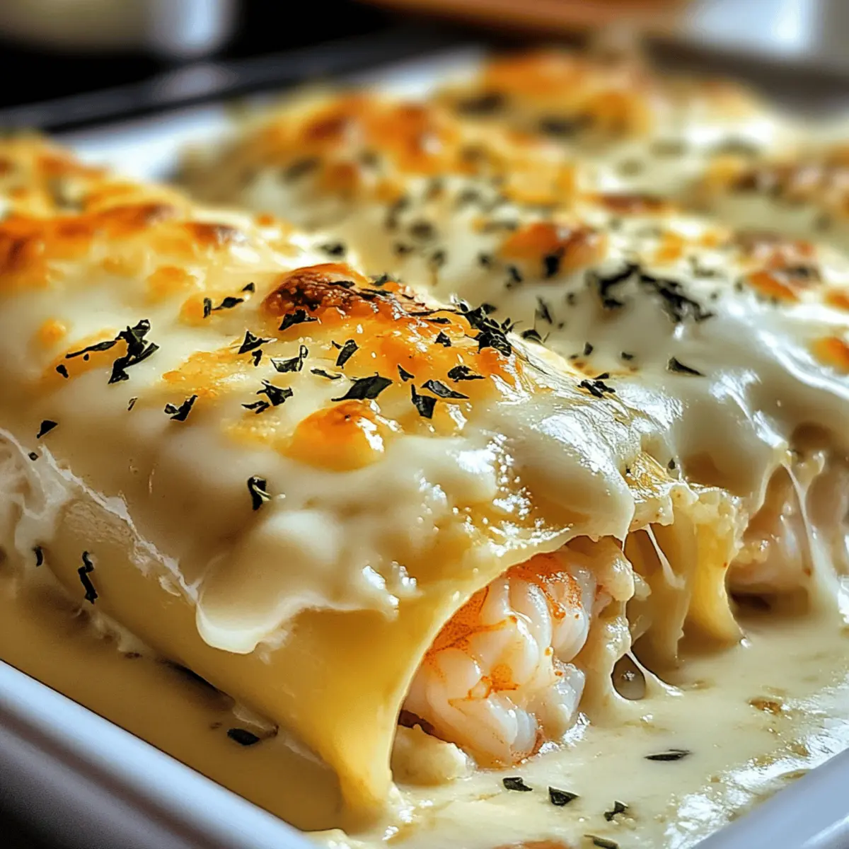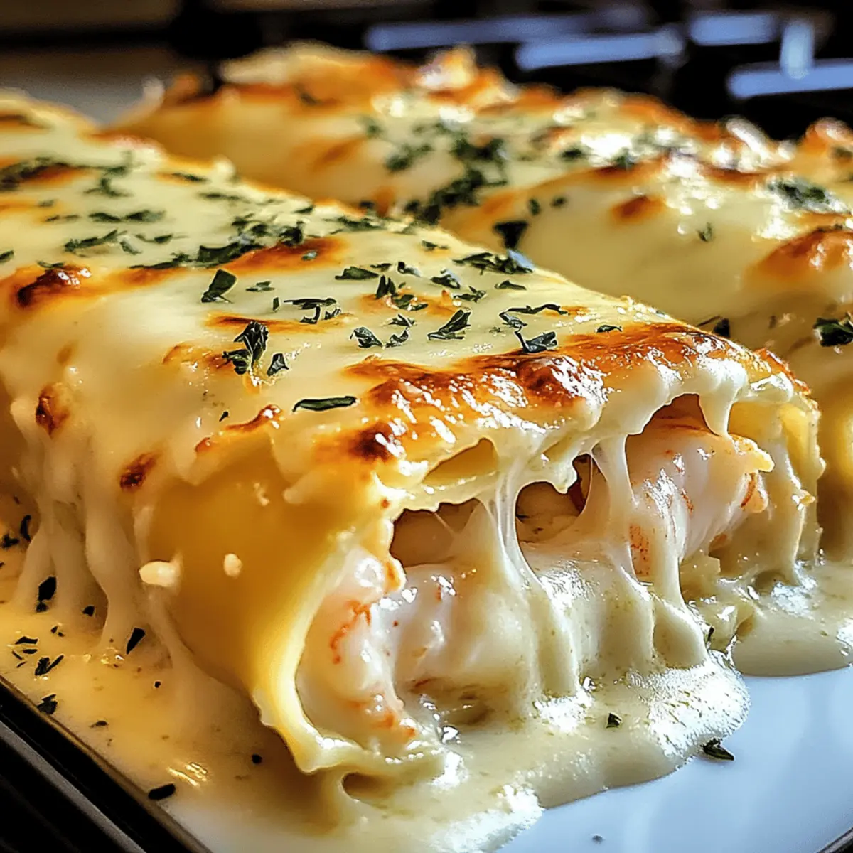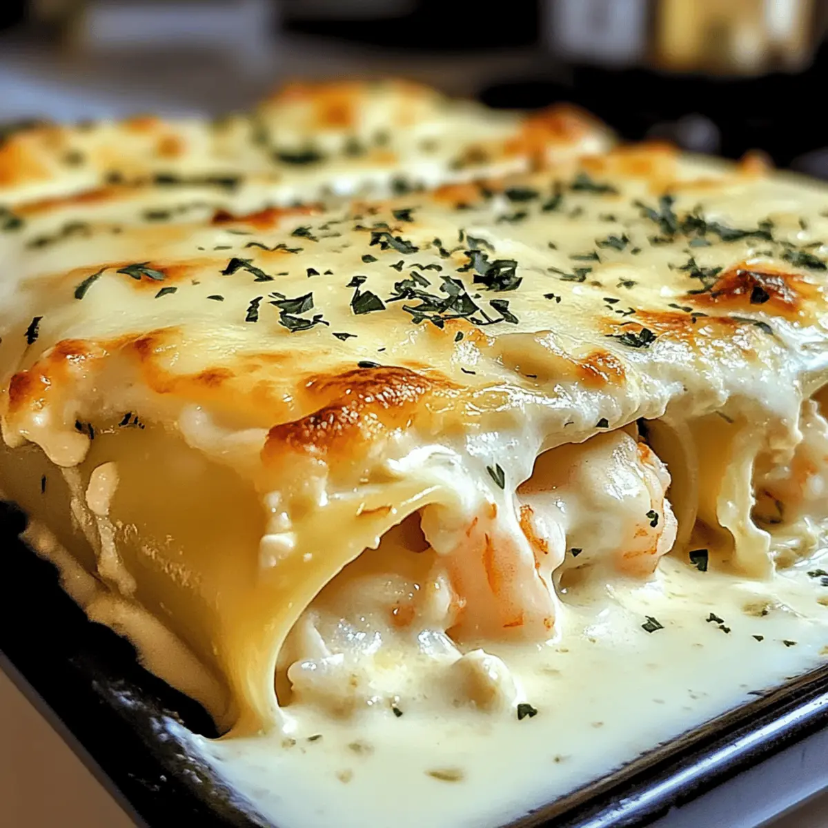 Wenn ich an ein gemütliches Abendessen mit der Familie denke, kommt mir sofort die Vorstellung von diesen köstlichen Shrimp & Crab Alfredo Lasagna Roll-Ups in den Sinn. Diese kreativen Roll-Ups kombinieren zarte Meeresfrüchte mit einer reichhaltigen, cremigen Alfredo-Sauce und sind ein wahres Wohlfühlessen. Sie sind nicht nur einfach zuzubereiten, sondern bieten auch eine perfekte Möglichkeit, die Familie zusammenzubringen und alle zu verwöhnen. Egal ob für einen entspannten Abend oder eine besondere Feier – dieses Gericht nimmt die Klassiker eine Stufe höher. Wer könnte da widerstehen? Neugierig, wie sich das ganze Gericht zusammenfügt? Lass uns einen Blick auf das Rezept werfen! Warum wirst du diese Roll-Ups lieben? Kreativität in der Küche: Diese Roll-Ups sind eine geniale Abwandlung der traditionellen Lasagne und bringen frischen Schwung auf den Tisch. Zarte Meeresfrüchte: Die Kombination aus Garnelen und Krabben sorgt für einen delikaten, luxuriösen Geschmack, der jeden begeistert. Einfach zuzubereiten: Dank der übersichtlichen Schritte ist dieses Rezept auch für Kochanfänger ein Kinderspiel! Familienfreundlich: Perfekt für ein gemeinsames Abendessen – jeder wird seinen Teller auskratzen. Vielfalt: Varriere das Rezept nach Lust und Laune, indem du zusätzlich Gemüse oder verschiedene Käse sorten hinzufügst. Bereite dich auf Komplimente vor, wenn du dieses Gericht servierst! Zutaten für die Garnelen-Cracker-Lasagne Roll-Ups • Diese köstlichen Roll-Ups sind voller Geschmack und Liebe zubereitet. Für die Füllung Lasagne-Nudeln – Halten die Füllung zusammen; glutenfreie Nudeln eignen sich hervorragend für Allergiker. Garnelen – Bringt eine süße, saftige Note; du kannst sie auch durch Jakobsmuscheln ersetzen. Krabbenfleisch – Fügt einen delikaten, süßen Geschmack hinzu; kann durch mehr Garnelen oder weggelassen werden für eine vegetarische Option. Ricotta-Käse – Sorgt für Cremigkeit und eine reiche Textur; verwende Hüttenkäse für eine leichtere Variante. Alfredo-Sauce – Dient als cremige Basis; selbstgemacht bringt frische Aromen. Geschnittener Knoblauch – Gibt Geschmack und Aroma; Knoblauchpulver ist ebenfalls eine gute Option. Für den Belag Mozzarella-Käse – Sorgt für einen köstlichen, schmelzenden Käseüberzug; provolone ist eine schmackhafte Alternative. Parmesan-Käse – Fügt eine salzige, würzige Note hinzu; Nutritional Yeast passt für eine milchfreie Version. Salz und Pfeffer – Verbessern den Gesamtgeschmack; nach Belieben anpassen. Genieße deine Zeit beim Ausprobieren dieser Garnelen-Cracker-Lasagne Roll-Ups und schaffe wundervolle Erinnerungen am Familientisch! Schritt-für-Schritt-Anleitung für die Garnelen-Cracker-Lasagne Roll-Ups Step 1: Lasagne-Nudeln kochen Bring einen großen Topf mit gesalzenem Wasser zum Kochen und füge die Lasagne-Nudeln hinzu. Koche sie gemäß der Packungsanweisung bis sie al dente sind, etwa 8-10 Minuten. Wenn sie fertig sind, lasse die Nudeln abtropfen und lege sie einzeln flach auf ein sauberes Küchentuch, damit sie nicht zusammenkleben. Step 2: Füllung zubereiten In einer großen Schüssel kombinierst du die gekochten Garnelen, das Krabbenfleisch, den Ricotta-Käse, die Hälfte der Alfredo-Sauce und den geschnittenen Knoblauch. Mische alles gut durch und schmecke die Füllung mit Salz und Pfeffer ab, um den vollen Geschmack der Garnelen-Cracker-Lasagne Roll-Ups hervorzuheben. Step 3: Alfredo-Sauce vorbereiten Verteile eine dünne Schicht der verbleibenden Alfredo-Sauce gleichmäßig auf dem Boden einer Auflaufform. Diese Schicht verhindert, dass die Roll-Ups ankleben, und sorgt für zusätzlichen Geschmack. Achte darauf, dass die Sauce den gesamten Boden der Form bedeckt. Step 4: Roll-Ups formen Nehme nacheinander die Lasagne-Nudeln und lege etwa 1/4 Tasse der Füllung breit auf jede Nudel. Rolle die Nudeln vorsichtig von einer kurzen Seite her auf und lege sie mit der Naht nach unten in die vorbereitete Auflaufform. Achte darauf, dass sie eng aufgerollt sind, damit die Füllung nicht herausquillt. Step 5: Alles überbacken Gieße die restliche Alfredo-Sauce gleichmäßig über die oberen Seiten der Roll-Ups. Jetzt streue Mozzarella- und Parmesan-Käse großzügig darüber, um eine köstliche, goldene Kruste zu erhalten. Hier kommt die Cremigkeit der Lasagne Roll-Ups perfekt zur Geltung. Step 6: Backofen vorheizen Heize den Ofen auf 190°C (375°F) vor. Decke die Auflaufform mit Alufolie ab, um die Feuchtigkeit zu erhalten, und backe die Roll-Ups für etwa 20 Minuten. Entferne dann die Folie und backe für weitere 10 Minuten, bis der Käse goldbraun und die Sauce blubbert. Step 7: Anrichten und servieren Lasse die Garnelen-Cracker-Lasagne Roll-Ups für einige Minuten ruhen, bevor du sie servierst. Garniere sie mit frischer Petersilie für einen schönen Farbkontrast und serviere sie warm. Diese köstlichen Roll-Ups sind perfekt für ein festliches Familienessen! Lagerungstipps für Garnelen-Cracker-Lasagne Roll-Ups Raumtemperatur:: Am besten direkt nach dem Kochen genießen. Lass die Roll-Ups nicht länger als 2 Stunden bei Raumtemperatur stehen, um die Frische zu gewährleisten. Kühlschrank:: Bewahre die übrig gebliebenen Roll-Ups in einem luftdichten Behälter im Kühlschrank für bis zu 3 Tage auf. So bleiben sie frisch und lecker. Gefrierschrank:: Du kannst die ungebackenen Roll-Ups auch einfrieren. Wickele sie gut in Frischhaltefolie und verpacke sie in einem gefriersicheren Behälter. So sind sie bis zu 2 Monate haltbar. Wiedererwärmen:: Um die Roll-Ups erneut zu genießen, backe sie bei 180°C (350°F) für etwa 25 Minuten, bis sie durch und der Käse geschmolzen ist. So bleibt die cremige Textur der Garnelen-Cracker-Lasagne Roll-Ups erhalten. Was passt zu Garnelen-Cracker-Lasagne Roll-Ups? Genieße ein rundum köstliches Abendessen, das die Sinne verwöhnt und die Familie zusammenbringt. Frischer Gartensalat: Eine leichte, knackige Beilage mit saisonalem Gemüse 