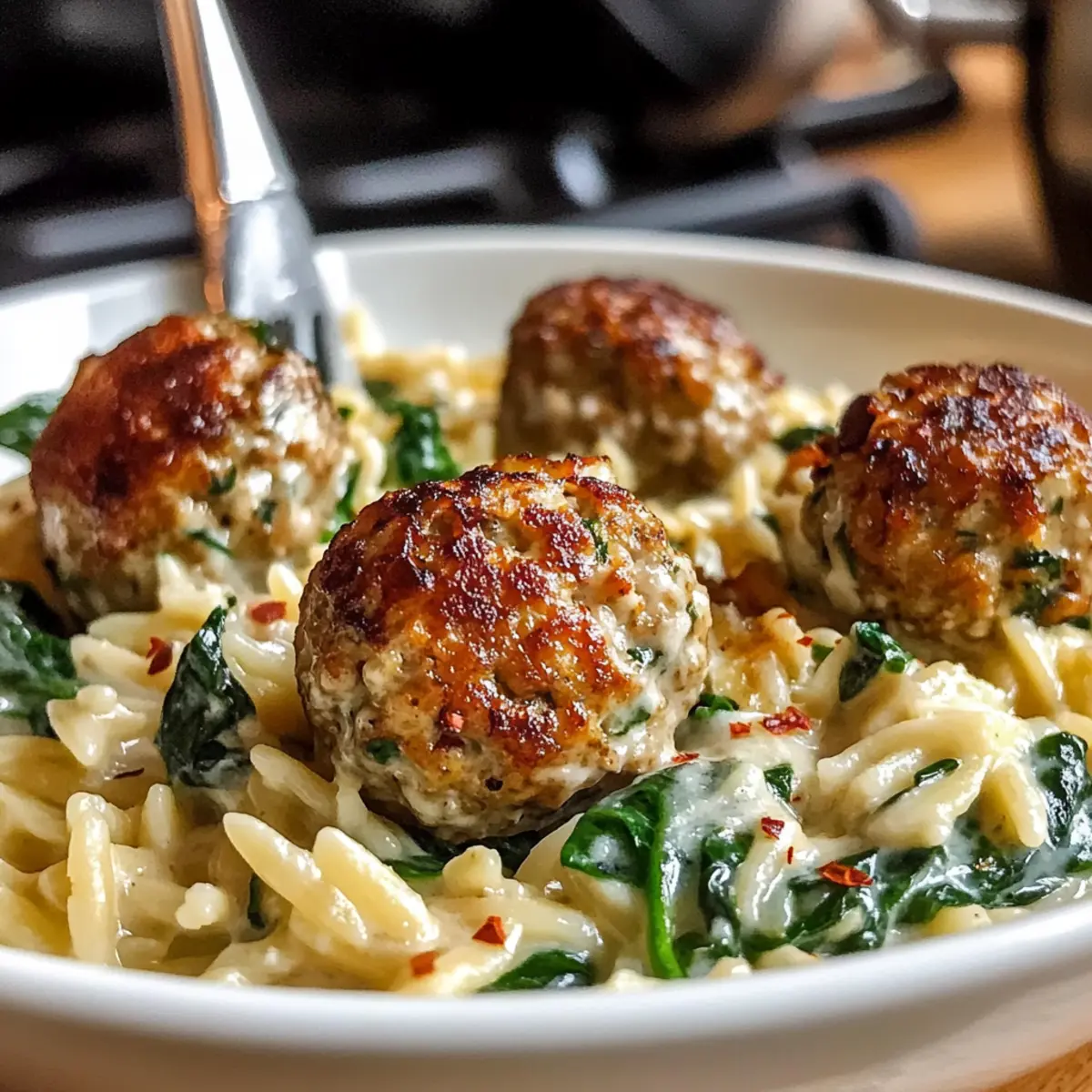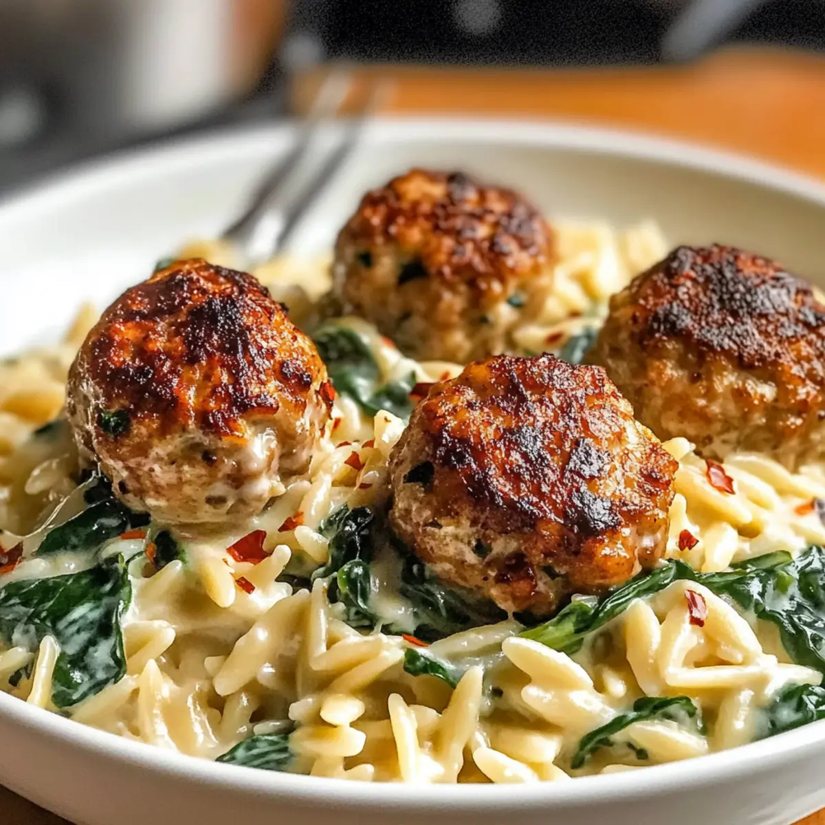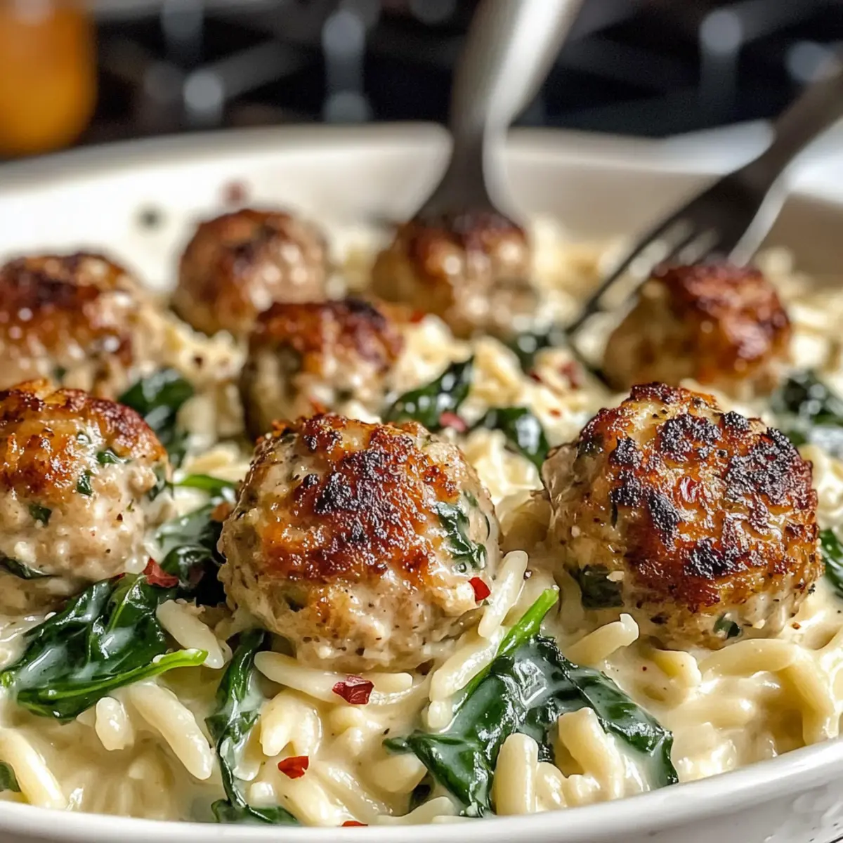 Eines Abends, als ich den Schlüssel ins Schloss steckte, überkam mich der köstliche Duft von frisch gebackenen Hühnchen-Ricotta-Fleischbällchen. Diese Gebackene Hühnchen-Ricotta-Fleischbällchen mit cremigem Spinat-Orzo sind viel mehr als nur ein schnelles Abendessen – sie verwandeln jede Woche in ein kleines Festmahl. Mit magerem Protein und einer herrlich cremigen Note sind sie ideal für die ganze Familie, selbst für die wählerischsten Esser. Und das Beste daran? In nur 45 Minuten steht das Essen auf dem Tisch! Egal, ob du einen crowded family dinner oder eine ruhige Date-night planst, dieses Gericht ist nicht nur einfach zuzubereiten, sondern lässt sich auch wunderbar anpassen, um jeden persönlichen Geschmack zu treffen. Welcher Twist wird dein nächster sein? Warum wirst du dieses Rezept lieben? Einfachheit: Die Zubereitung ist unkompliziert und erfordert keine speziellen Kochkünste. Gesunde Wahl: Mageres Hähnchen und frischer Spinat machen es zu einer nahrhaften Option für die ganze Familie. Vielfältige Anpassungen: Du kannst die Fleischbällchen leicht mit einer Mischung aus Rinderhack oder einer veganen Variante aufpeppen. Schnelle Zubereitung: In nur 45 Minuten auf dem Tisch, perfekt für geschäftige Wochentage! Köstliche Aromen: Die Kombination aus cremigem Ricotta und würzigem Parmesan sorgt für einen unvergleichlichen Genuss. Familienfreundlich: Ein Hit bei Jung und Alt, die Fleischbällchen werden zum Lieblingsthema am Esstisch. Entdecke auch unsere anderen köstlichen Rezepte wie Herzhafter Rindfleisch Nudel oder Herzhafter Italienischer Rinderbraten mit Polenta. Zutaten für Gebackene Hühnchen-Ricotta-Fleischbällchen mit cremigem Spinat-Orzo • Diese köstlichen Zutaten werden deine Geschmacksknospen erfreuen! Für die Fleischbällchen Gemahlenes Hühnchen – eine magerere Proteinquelle; kann durch gemahlenen Truthahn für zusätzlichen Geschmack ersetzt werden. Ricotta-Käse – sorgt für Cremigkeit und Feuchtigkeit; gut abtropfen lassen für die besten Resultate. Knoblauch – verstärkt den Gesamteindruck; reibe ihn für eine gleichmäßige Verteilung. Italienische Käsemischung – ergänzt den Ricotta; probiere Parmesan oder Mozzarella, oder für einen griechischen Twist Fetakäse. Rote Pfefferflocken – geben eine angenehme Schärfe; die Menge verdoppeln für einen stärkeren Kick. Salz & Pfeffer – entscheidend für die Geschmacksverstärkung; nach Geschmack anpassen. Für das Orzo Orzo-Pasta – eine wohltuende Basis; verwende Vollkorn-Variante für mehr Ballaststoffe. Brühe (Hühnchen oder Gemüse) – verleiht dem Orzo Geschmack; warm halten, um bessere Absorption zu erzielen. Sahne – fügt Reichhaltigkeit hinzu; nach dem Kochen unterrühren, um das Gerinnen zu verhindern. Frischer Spinat – bringt erdigen Geschmack und Nährstoffe; kann durch Grünkohl für eine herzhaftigere Textur ersetzt werden. Mit diesen einfachen, aber köstlichen Zutaten zauberst du die gebackenen Hühnchen-Ricotta-Fleischbällchen mit cremigem Spinat-Orzo ganz einfach auf den Tisch, und jeder wird begeistert sein! Schritt-für-Schritt-Anleitung für Gebackene Hühnchen-Ricotta-Fleischbällchen mit cremigem Spinat-Orzo Step 1: Ofen vorheizen Heize den Ofen auf 190°C (375°F) vor und lege ein Backblech mit Backpapier aus. Dies verhindert, dass die gebackenen Hühnchen-Ricotta-Fleischbällchen ankleben. Achte darauf, dass der Ofen auf die richtige Temperatur kommt, damit die Fleischbällchen gleichmäßig garen und außen schön goldbraun werden. Step 2: Fleischbällchen-Mischung vorbereiten In einer großen Schüssel kombinierst du das gemahlene Hühnchen, den Ricotta, den geriebenen Knoblauch und die italienische Käsemischung. Mische die Zutaten behutsam mit deinen Händen oder einem Löffel, um die Zartheit der Fleischbällchen zu gewährleisten. Der Teig sollte gut verbunden, aber nicht überarbeitet sein, um die besten Textur zu erzielen. Step 3: Fleischbällchen formen Forme aus der Mischung gleichmäßige Fleischbällchen von etwa 4 cm Durchmesser und lege sie auf das vorbereitete Backblech. Achte darauf, ausreichend Platz zwischen den Fleischbällchen zu lassen, damit sie beim Backen gleichmäßig garen können. Die Oberfläche sollte leicht glänzend und fest sein, wenn du mit der Formung fertig bist. Step 4: Fleischbällchen backen Backe die Fleischbällchen im vorgeheizten Ofen für 20-25 Minuten. Sie sind fertig, wenn sie goldbraun sind und die interne Temperatur mindestens 74°C (165°F) erreicht. Überwache den Garvorgang, um sicherzustellen, dass sie nicht austrocknen, und dreh sie zur Halbzeit um, damit sie gleichmäßig bräunen. Step 5: Orzo kochen Bringe in einem großen Topf die Brühe zum Kochen und füge das Orzo hinzu. Koche das Orzo für 8-10 Minuten, bis es al dente ist, und rühre gelegentlich um, um ein Ankleben zu verhindern. Nach dem Kochen das Orzo abgießen und wieder in den Topf geben, um das Aroma der Brühe zu bewahren. Step 6: Spinatsahne-Mischung zubereiten Füge den frischen Spinat und die Sahne zum warmen Orzo hinzu und würze großzügig mit Salz, Pfeffer und roten Pfefferflocken. Rühre alles gut um, bis der Spinat zusammenfällt und die Mischung schön cremig wird. Diese Kombination sorgt für eine köstliche Basis, die die gebackenen Hühnchen-Ricotta-Fleischbällchen perfekt ergänzt. Step 7: Fleischbällchen ruhen lassen Lass die gebackenen Fleischbällchen nach dem Backen für etwa 5 Minuten ruhen. Dies gibt der Feuchtigkeit Zeit, sich gleichmäßig zu verteilen, was sie schön saftig macht. Achte darauf, dass du sie nicht gleich nach dem Backen aufschneidest, damit die Säfte nicht entweichen. Step 8: Anrichten und servieren Serviere die gebackenen Hühnchen-Ricotta-Fleischbällchen warm, indem du sie behutsam in die cremige Spinat-Orzo-Mischung nestelst. Garniere nach Belieben mit zusätzlichem Käse oder frischen Kräutern für mehr Geschmack. Genieße dieses köstliche Gericht mit deiner Familie und Freunden! 