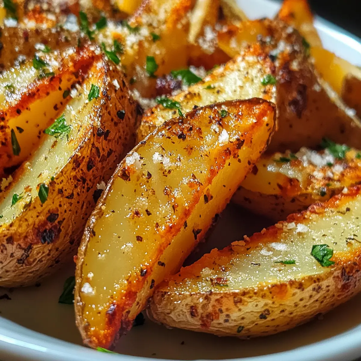 Genießen Sie diese gebratene Knoblauch-Parmesan-Kartoffelspalten als gesunde Beilage, die schnell zubereitet ist und köstlich schmeckt.