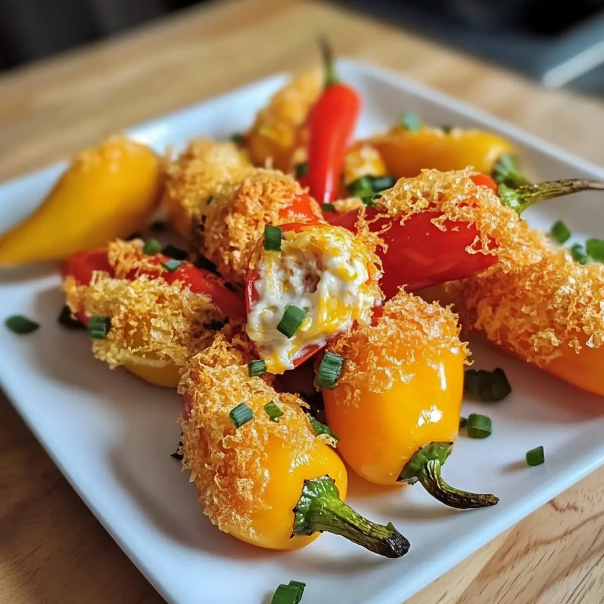 Die bunten Farben und der verlockende Duft von frisch gebackenem Essen können wahre Glücksmomente hervorrufen. Heute möchte ich euch ein Rezept vorstellen, das diese beiden Freuden vereint: die gefüllten Mini-Paprika. Diese unkomplizierten Häppchen sind nicht nur ein echter Hingucker, sondern auch glutenfrei und perfekt für all jene, die einen gesunden Snack suchen, der nicht auf den Geschmack verzichtet. Mit nur fünf Zutaten sind sie im Handumdrehen zubereitet und eignen sich hervorragend als Appetizer für eure nächste Feier oder als gemütlicher Snack bei einem Filmabend. Möchtet ihr wissen, wie einfach es ist, diese kleinen Leckerbissen zu zaubern? Lasst uns zusammen in die Welt der gefüllten Mini-Paprika eintauchen! Warum sind gefüllte Mini-Paprika so beliebt? Einfachheit: Mit nur fünf Zutaten sind diese gefüllten Mini-Paprika nicht nur schnell und unkompliziert zubereitet, sondern auch perfekt für Kochanfänger geeignet. Vielseitigkeit: Diese Häppchen können leicht an persönliche Vorlieben angepasst werden – ob mit verschiedenen Käsesorten oder zusätzlichen Kräutern. Sie sind ein Fest für die Sinne! Gesundheitsbewusst: Low-Carb und glutenfrei, sind sie eine ideal Alternative zu herkömmlichen Snacks und passen gut zu einer gesunden Ernährung. Ideal für jede Gelegenheit: Egal ob Party oder Filmabend, diese poppigen Happen begeistern garantiert jeden. Sie können auch im Voraus zubereitet werden , um sie stressfrei zu genießen! Gefüllte Mini-Paprika Zutaten • Diese köstlichen gefüllten Mini-Paprika sind nicht nur ein Genuss für den Gaumen, sondern auch einfach zuzubereiten. Für die Füllung Mini Sweet Peppers – Sie bieten eine knackige Textur und milde Süße, die perfekt für die Füllung ist. Variieren Sie mit bunten Paprika für eine Farbexplosion! Frischkäse – Sorgt für eine cremige Konsistenz und einen reichen Geschmack. Ersetzen Sie ihn durch Ricotta für eine leichtere Option. Cheddar Käse – Garantiert einen scharfen, würzigen Geschmack, der die Füllung perfekt ergänzt. Nutzen Sie Mozzarella für eine mildere Note. Gewürze (Knoblauchpulver, etc.) – Verleiht der Füllung Tiefe und Geschmack. Mischen Sie frische Kräuter wie Schnittlauch oder Petersilie für zusätzlichen Frischekick. Speck oder Wurst (optional) – Fügt eine herzhaft-schmeckende Note hinzu. Lassen Sie diesen Bestandteil weg für eine vegetarische Variante. Schritt-für-Schritt-Anleitung für gefüllte Mini-Paprika Step 1: Ofen vorheizen Heizen Sie Ihren Ofen auf 190°C vor. Dies ist wichtig, um sicherzustellen, dass die gefüllten Mini-Paprika gleichmäßig garen und eine goldbraune Färbung erhalten. Während der Ofen vorheizt, können Sie mit dem Vorbereiten der Paprika beginnen. Step 2: Paprika vorbereiten Waschen Sie die Mini Sweet Peppers gründlich und schneiden Sie sie der Länge nach in zwei Hälften. Entfernen Sie die Kerne und die weißen Innenhäute mit einem kleinen Löffel oder Ihrer Hand. Diese vorbereiteten Hälften sind die ideale Grundlage für die cremige Füllung in Ihren gefüllten Mini-Paprika. Step 3: Füllung anmischen In einer großen Schüssel den Frischkäse, den geriebenen Cheddar und die gewünschten Gewürze, wie Knoblauchpulver, gut vermengen. Mischen Sie alles mit einem Löffel oder einem Handmixer, bis eine homogene und cremige Konsistenz entsteht. Fühlen Sie sich frei, frische Kräuter hinzuzufügen, um die Füllung noch aromatischer zu gestalten. Step 4: Paprika füllen Verteilen Sie die vorbereitete Käsemischung mit einem kleinen Löffel gleichmäßig auf den offenen Hälften der Mini-Paprika. Achten Sie darauf, dass die Füllung nicht überläuft, um ein Auslaufen während des Backens zu vermeiden. Diese gefüllten Mini-Paprika sind nun bereit für den Ofen. Step 5: Backen Legen Sie die gefüllten Mini-Paprika auf ein mit Backpapier ausgelegtes Backblech. Backen Sie sie im vorgeheizten Ofen für 20 bis 25 Minuten, bis die Füllung sprudelnd heiß und die Oberseite leicht goldbraun ist. Diese visuellen Hinweise sind ein Zeichen dafür, dass Ihre Snacks perfekt gegart sind. Step 6: Servieren Nachdem die gefüllten Mini-Paprika aus dem Ofen kommen, lassen Sie sie einige Minuten abkühlen, bevor Sie sie servieren. Sie sind heiß und die Füllung kann sehr heiß sein. Servieren Sie die Poppers warm und genießen Sie diese köstlichen Häppchen, die sich hervorragend als Appetizer eignen! Was passt gut zu gefüllten Mini-Paprika? Die gefüllten Mini-Paprika sind nicht nur ein Fest für die Augen, sondern auch perfekt als Teil eines reichhaltigen Buffets oder als herzhaftes Snack-Highlight. Cremiger Dip: Ein hausgemachter Ranch-Dip ergänzt die Paprika mit frischen Kräutern und einer cremigen Textur, die wunderbar harmoniert. Knusprige Nachos: Servieren Sie die Poppers mit knusprigen Nachos. Dies bringt einen tollen Kontrast in den Texturen und macht das Snack-Erlebnis aufregend. Leichte Salate: Ein frischer grüner Salat mit einem Zitronen-Dressing sorgt für eine erfrischende Ergänzung zu den herzhaften Aromen der gefüllten Mini-Paprika. Spritziger Weißwein: Ein trockener Weißwein oder ein spritziger Rosé macht jede Gelegenheit festlicher und unterstreicht die Süße der Paprika. Fruchtige Salsa: Eine fruchtige Mango- oder Ananas-Salsa bringt eine süße Note, die die würzige Füllung perfekt ausbalanciert. Schokoladen-Mousse: Als krönenden Abschluss sollten Sie unbedingt ein leichtes Schokoladen-Mousse servieren. Diese süße Versuchung rundet Ihr Menü wunderbar ab. Expert Tips für gefüllte Mini-Paprika • Größe beachten: Wählen Sie Mini-Paprika in ähnlicher Größe, um gleichmäßiges Garen zu gewährleisten und überfüllte Exemplare zu vermeiden. • Füllmenge anpassen: Füllen Sie die Paprika nicht zu voll, um ein Überlaufen während des Backens zu verhindern. Es ist besser, etwas weniger zu nehmen. • Auskühlen lassen: Lassen Sie die gefüllten Mini-Paprika nach dem Backen kurz abkühlen. Die Füllung ist