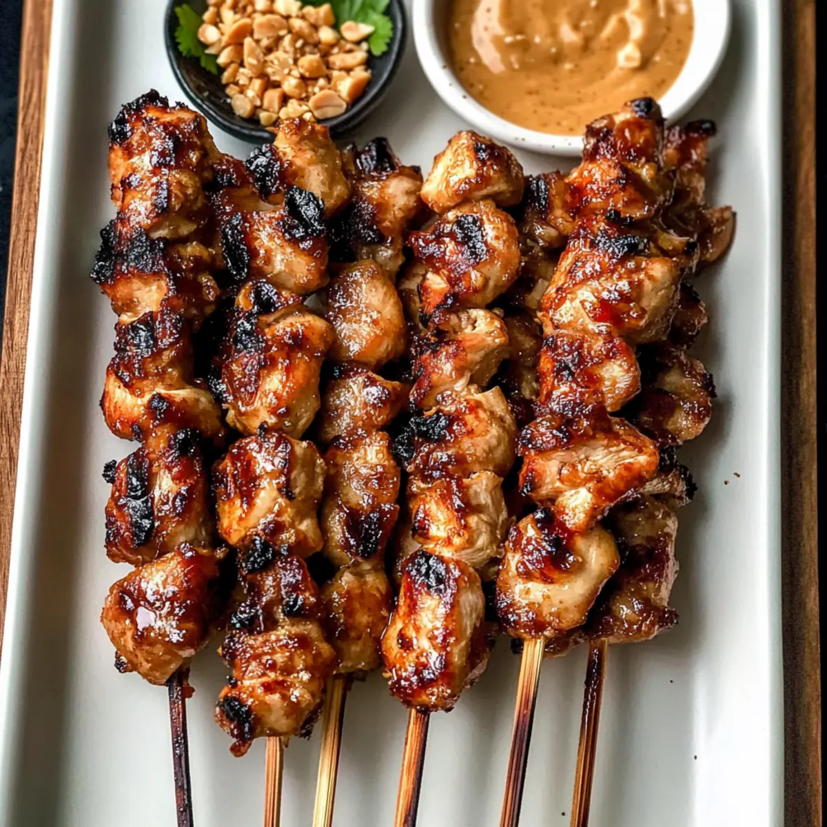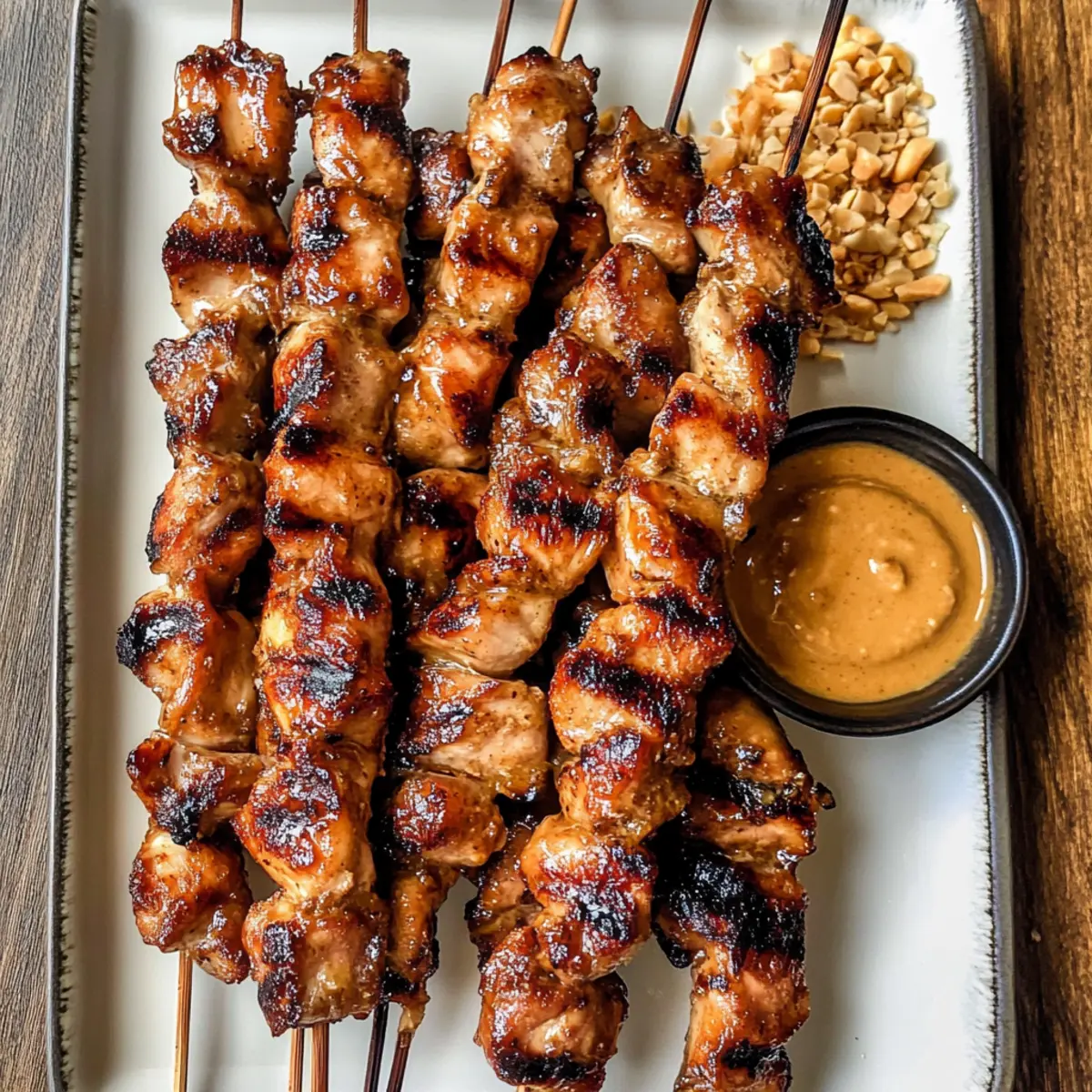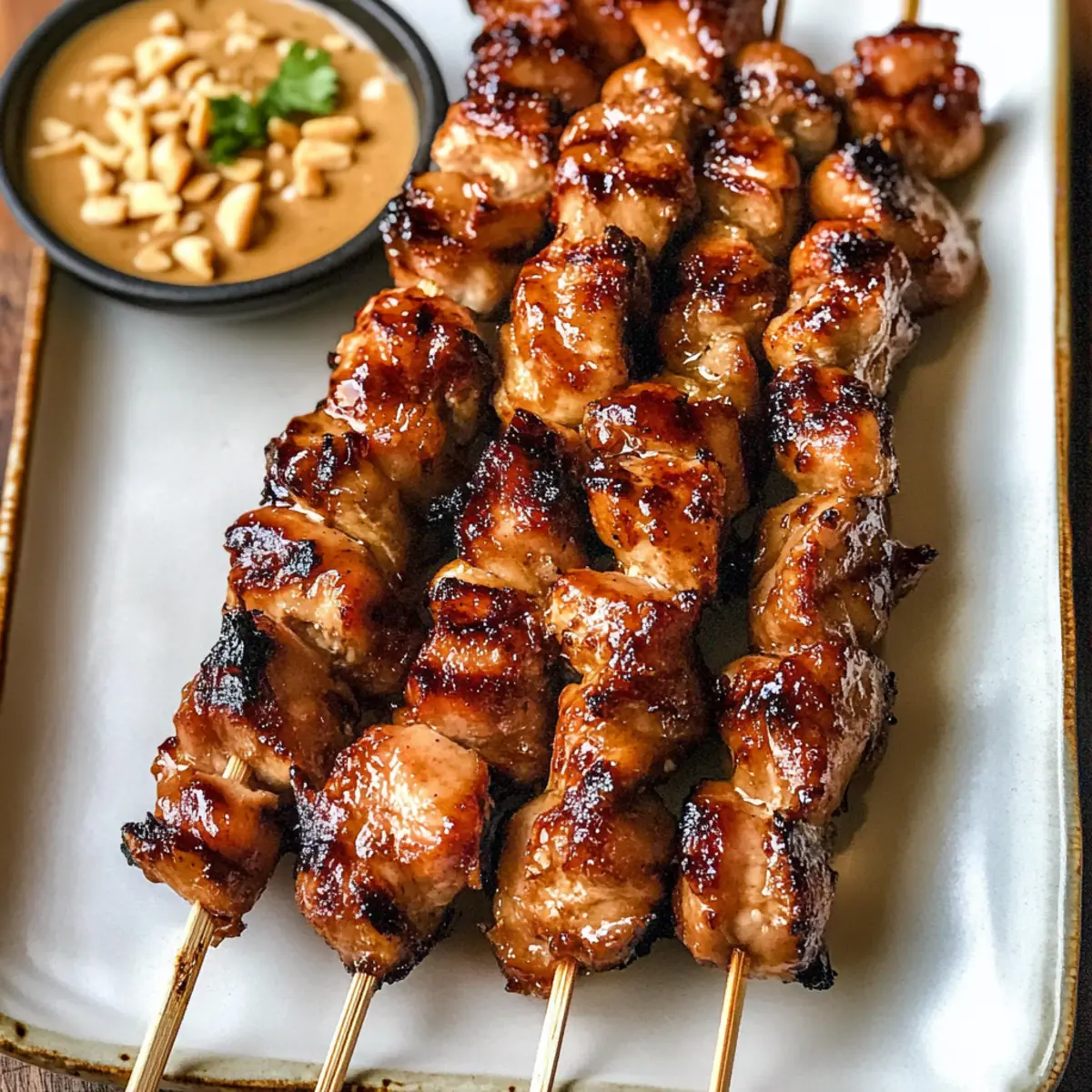 Es gibt Momente, die ich in der Küche als magisch empfinde – dieser hier kam, als ich die ersten Gegrillten thailändischen Kokosnuss-Hühnchenspieße zubereitete. Der Duft von mariniertem Huhn, das frisch vom Grill kommt, erfüllt die Luft und lässt jeden Hunger stillen. Mit einer köstlichen Mischung aus Kokoscreme, Ingwer und einem Hauch von Sojasauce sind diese Spieße nicht nur einfach zuzubereiten, sondern auch der perfekte Gesprächsstarter bei Ihren nächsten Grillabenden. Zudem zaubern sie eine beeindruckende Auswahl an Aromen, die bei Ihren Gästen für Begeisterung sorgen werden. Tauchen Sie ein in die Welt der asiatischen Küche und genießen Sie diese blitzschnellen, aber herzlichen Gerichte. Wer könnte der Versuchung widerstehen, sich mit einem Hauch von Fernost verwöhnen zu lassen? Lassen Sie uns gemeinsam diesen köstlichen Genuss erkunden! Warum sind diese Spieße ein Muss? Einfachheit: Die Zubereitung der Gegrillten thailändischen Kokosnuss-Hühnchenspieße gelingt auch ohne große Kochkünste. Intensives Aroma: Die Kombination aus Kokoscreme und frischen Gewürzen sorgt für einen Geschmack, der sowohl süß als auch würzig ist. Vielseitigkeit: Diese Spieße lassen sich leicht anpassen – fügen Sie Gemüse hinzu oder tauschen Sie das Huhn gegen Schweinefleisch aus! Schnelligkeit: In nur 30 Minuten können Sie schmackhafte Spieße zaubern, ideal für spontane Grillpartys. Gesellige Momente: Ihre Gäste werden den köstlichen Duft lieben und garantiert nach dem Rezept fragen! Probieren Sie auch unsere Linsensuppe Mit Gesund für eine gesunde Beilage. Gegrillte thailändische Kokosnuss-Hühnchenspieße Zutaten • Diese Zutaten bilden die Basis für ein köstliches griechisches Rezept, das jedes Grillfest zum Highlight macht. Für die Marinade Hühnchen (dunkles Fleisch bevorzugt) – sorgt für Zartheit und Geschmack; Boneless, skinless chicken breast kann eine fettärmere Alternative sein. Ingwer (4-5 Scheiben, ca. 2 Esslöffel) – verleiht der Marinade Wärme und Würze; frisch geriebener Ingwer bietet intensiveren Geschmack. Knoblauch (2 Zehen, ca. 1½ Esslöffel) – hebt das gesamte Aroma; die Menge kann je nach persönlichen Vorlieben angepasst werden. Sojasauce (2 Esslöffel) – bietet Salzigkeit und Umami-Vertiefung; es empfiehlt sich, helle Sojasauce zu verwenden. Dunkle Sojasauce (1 Esslöffel) – fügt Reichhaltigkeit und tiefere Aromen hinzu; mehr helle Sojasauce kann bei Bedarf verwendet werden. Kokoscreme (2 Esslöffel + 6 Esslöffel für das Glasieren) – sorgt für eine cremige Textur und subtile Süße; kann durch vollfette Kokosmilch ersetzt werden. Zucker (2 Esslöffel) – balanciert die Aromen und fügt einen Hauch Süße hinzu; brauner Zucker ist eine gute Alternative. Austernsauce (1 Esslöffel) – trägt zur Umami-Note bei; kann bei Bedarf durch Sojasauce und eine Prise Zucker substituiert werden. Für die Glasur Honig (1½ Esslöffel) – wird in der Kokoscreme-Glasur verwendet, um die Süße zu verstärken; Ahornsirup kann ersetzt werden. Für die Erdnusssoße Erdnussbutter (¼ Tasse, ungesüßt) – bildet die Basis der Erdnusssoße, die Cremigkeit und Reichhaltigkeit beisteuert; kann durch Mandelbutter ersetzt werden. Reisessig (1 Teelöffel) – liefert Säure zur Geschmacksbalance; kann durch Apfelessig substituiert werden. Thai-Rote-Curry-Paste (1 Teelöffel) – bringt eine würzige Note; je nach gewünschtem Schärfegrad anpassen. Ahornsirup (2 Teelöffel) – optionale Süße für die Erdnusssoße; Honig kann auch verwendet werden. Sesamöl (1 Teelöffel, optional) – fügt nussigen Geschmack hinzu; ist nicht essentiell, wird jedoch empfohlen. Chiliöl (1 Teelöffel, optional) – für die Schärfe; kann weggelassen werden, wenn nicht gewünscht. Garnitur Gehackte Erdnüsse (optionale Garnitur) – sorgen für Crunch in der Erdnusssoße und geben einen schönen Texturkontrast. Die gegrillten thailändischen Kokosnuss-Hühnchenspieße werden Ihnen und Ihren Gästen ein unvergessliches Geschmackserlebnis bieten! Schritt-für-Schritt-Anleitung für Gegrillte thailändische Kokosnuss-Hühnchenspieße Step 1: Hühnchen marinieren Schneiden Sie das Hühnchen in 2,5 cm große Stücke und geben Sie es zusammen mit Ingwer, Knoblauch, Sojasauce, Kokoscreme, Zucker und Austernsauce in eine Schüssel. Mischen Sie alles gut, sodass das Hühnchen gleichmäßig bedeckt ist. Decken Sie die Schüssel ab und lassen Sie das Hühnchen mindestens 1-2 Stunden im Kühlschrank marinieren, idealerweise über Nacht, um die Aromen intensiv zu entfalten. Step 2: Spieße vorbereiten Falls Sie Holzspieße verwenden, legen Sie die nicht spitzen Enden für 30 Minuten in Wasser, um ein Verbrennen zu verhindern. Nehmen Sie die marinierten Hühnchenstücke aus dem Kühlschrank und stecken Sie sie straff auf die Spieße. Achten Sie darauf, die Stücke nicht zu überladen, damit sie beim Grillen gleichmäßig garen können. Step 3: Kokosglasur zubereiten In einer kleinen Schüssel vermengen Sie die restliche Kokoscreme, den Honig und die Sojasauce. Rühren Sie die Mischung gründlich durch, bis sie gut kombiniert ist. Diese Glasur wird während des Grillens auf die Gegrillten thailändischen Kokosnuss-Hühnchenspieße gestrichen, um ihnen eine süße, glänzende Schicht zu verleihen. Step 4: Hühnchen grillen Heizen Sie Ihren Grill auf 260°C (500°F) vor. Legen Sie die Spieße auf den Grill und grillen Sie sie über direkter Hitze. Drehen Sie die Spieße alle 2-3 Minuten für etwa 15-18 Minuten, bis das Hühnchen durchgegart und schön angebräunt ist. Achten Sie darauf, dass die äußere Schicht leicht verkohlt ist, um den perfekten Grillgeschmack zu erhalten. Step 5: Glasur auftragen und fertigstellen In den letzten Minuten des Grillens bestreichen Sie die Spieße mit der vorbereiteten Kokosglasur. Wenden Sie die Spieße häufig, damit die Glasur karamellisiert, ohne zu verbrennen. Dies verleiht den Gegrillten thailändischen Kokosnuss-Hühnchenspießen e