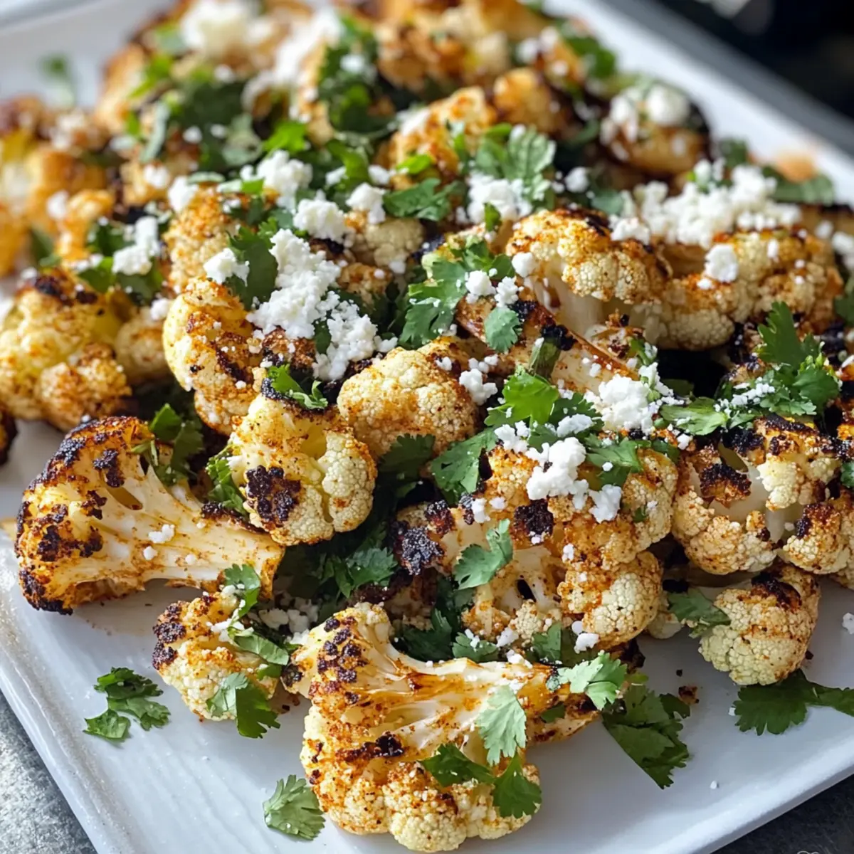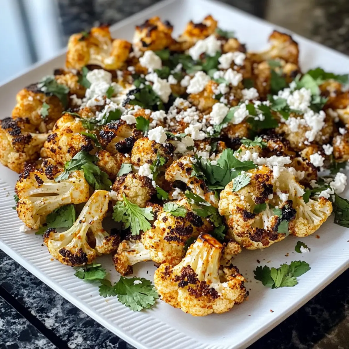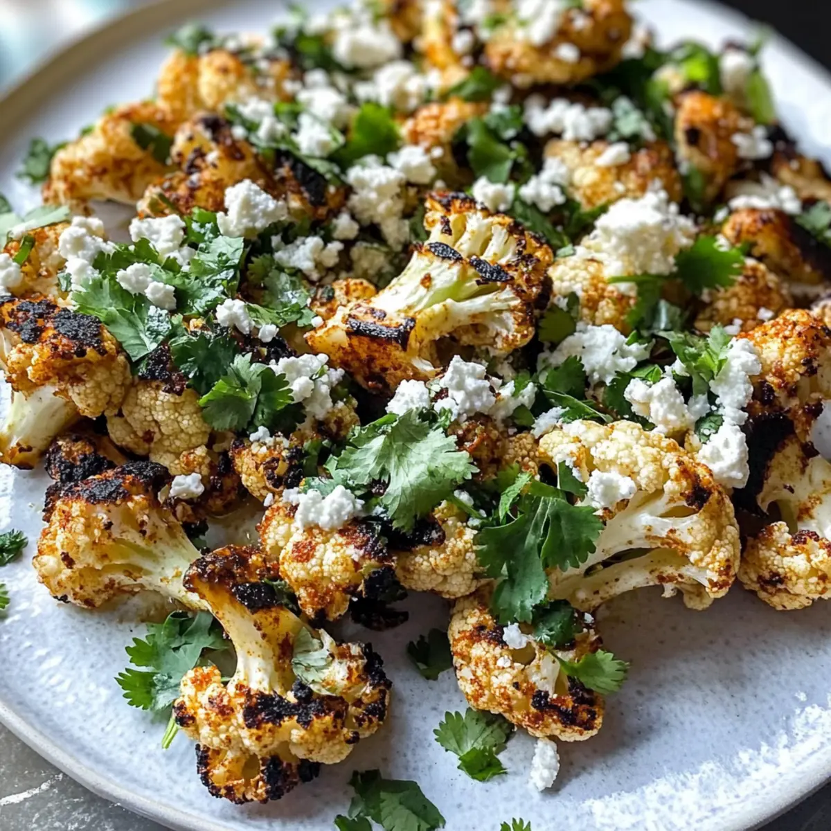 5. Serviert den Blumenkohl mit der Sauce, zerbröckeltem Cotija-Käse und frischem Koriander.