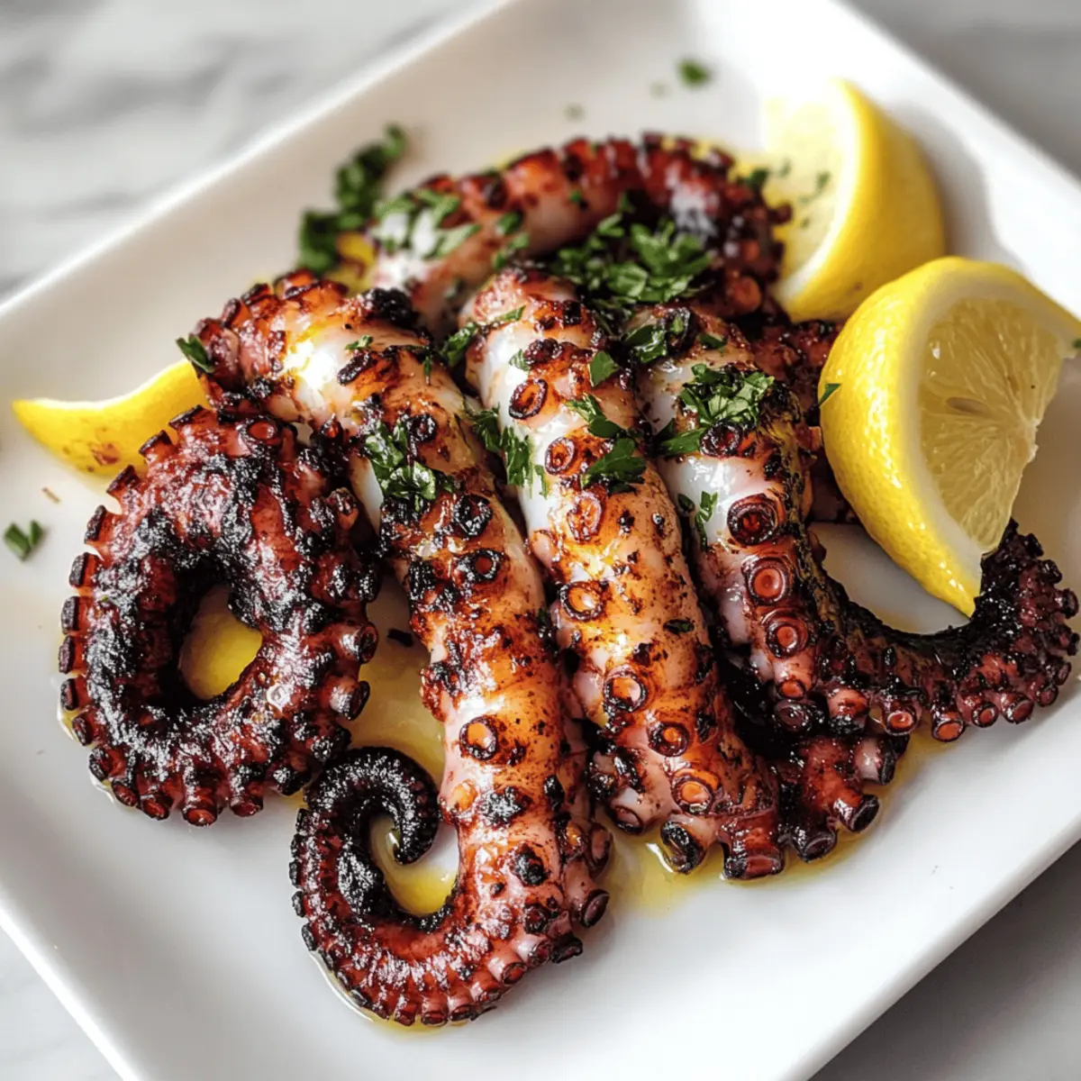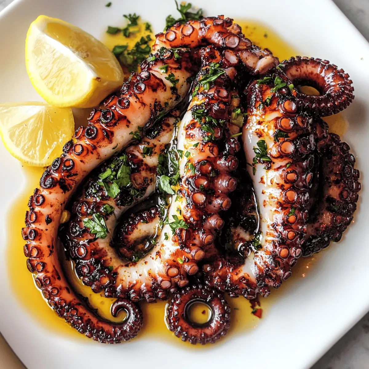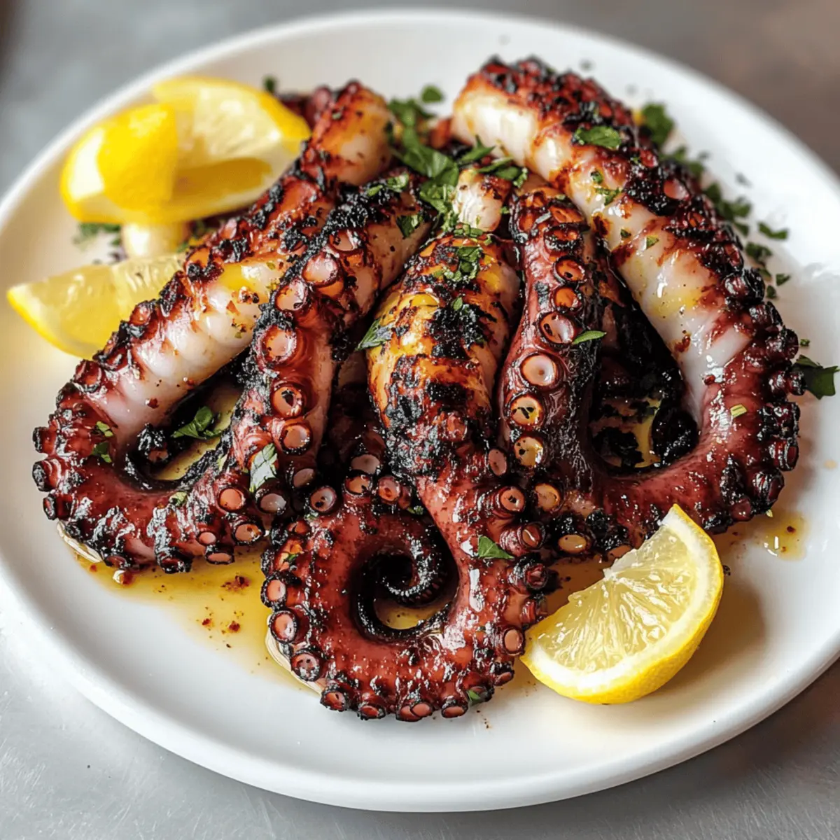 Ein erster Biss in perfekt gegrillten Oktopus und der Geschmack des Meeres wird lebendig. Bei diesem Rezept, für das ich meiner mediterranen Vorliebe fröne, verwandelt sich frischer Oktopus in ein zartes, rauchiges Erlebnis, das nicht nur als köstlicher Appetizer überzeugt, sondern auch eine gesunde Mahlzeit darstellt. Mit unserer aromatischen Marinade aus Olivenöl, Knoblauch und einem Spritzer frischem Zitronensaft erhält der Oktopus ein unwiderstehliches Aroma und bleibt gleichzeitig kalorienbewusst. Dieses Gericht ist nicht nur ein wahrer Publikumsliebling, sondern bringt auch den Genuss der mediterranen Küche direkt auf deinen Grill. Hast du schon darüber nachgedacht, wie du den Oktopus perfekt zubereiten kannst? Lass uns gemeinsam in die Zubereitung eintauchen! Warum du dieses Rezept lieben wirst Einfachheit: Der gesamte Prozess ist unkompliziert, sodass du nur grundlegende Kochkenntnisse benötigst, um diesen köstlichen Oktopus zuzubereiten. Gesunde Wahl: Mit nur etwa 150 Kalorien pro Portion ist dies eine ideale Option für gesundheitsbewusste Genießer. Aromatische Marinade: Die Kombination aus Olivenöl, Knoblauch und Zitrone sorgt für einen herrlichen Geschmack, der Erinnerungen an mediterrane Sommerabende weckt. Vielseitige Beilage: Egal, ob du deinen Oktopus mit einem knackigen Salat oder gegrilltem Gemüse servierst, die Möglichkeiten sind endlos! Publikumsliebling: Dieses Gericht wird beim nächsten Grillabend bestimmt für Begeisterung sorgen und deine Gäste um ein Rezept bitten. Entdecke auch die Variationen dieses Gerichts, um ihm eine persönliche Note zu verleihen! Zutaten für Gegrillten Oktopus • Um das Rezept zum Nachkochen noch einfacher zu gestalten, findest du hier alle Zutaten, die du benötigst. Für den Oktopus Oktopus – Frisch ist essenziell für den charakteristischen Meeresgeschmack; achte darauf, dass er richtig gereinigt ist. Für die Marinade Olivenöl – Sorgt für eine reichhaltige und feuchte Konsistenz; kann durch Avocadoöl ersetzt werden, um einen anderen Geschmack zu erzielen. Knoblauch – Verleiht ein aromatisches Flair; frischer Knoblauch ist am besten, im Notfall kann auch Knoblauchpulver verwendet werden. Getrockneter Oregano – Fügt mediterrane Authentizität hinzu; frischer Oregano kann für einen frischeren Geschmack verwendet werden, menge nach Geschmack an. Zitrone – Verbessert den Geschmack und bringt die nötige Säure; frisch gepresster Zitronensaft sorgt für die besten Ergebnisse. Salz und Pfeffer – Grundlegende Gewürze; passe sie nach deinem persönlichen Geschmack an. Schritt-für-Schritt-Anleitung für den Gegrillten Oktopus mit mediterraner Marinade Schritt 1: Oktopus vorbereiten Den frischen Oktopus gründlich unter kaltem Wasser abspülen und das Maul sowie die Innereien entfernen. Um ihn zart zu machen, koche den Oktopus 30-40 Minuten lang in einem großen Topf mit kochendem Wasser. Alternativ kannst du ihn auch 5-10 Minuten kräftig mit Salz massieren. Nach der Zubereitung nochmals abspülen und kurz abtropfen lassen. Schritt 2: Marinade zubereiten In einer Schüssel Olivenöl, fein gehackten Knoblauch, frisch gepressten Zitronensaft, getrockneten Oregano sowie Salz und Pfeffer gut vermischen. Rühre alles gründlich um, bis eine homogene Marinade entsteht. Der aromatische Duft, der dir entgegenschlägt, zeigt, dass du auf dem richtigen Weg zu einem herrlichen gegrillten Oktopus bist. Schritt 3: Marinieren Den vorbereiteten Oktopus in die Marinade eintauchen und sicherstellen, dass er gleichmäßig bedeckt ist. Decke die Schüssel mit Frischhaltefolie ab und stelle sie für mindestens 1 Stunde oder besser über Nacht in den Kühlschrank. Dies ermöglicht es den Aromen, tief in das Fleisch einzudringen und sorgt für einen fantastischen Geschmack beim Grillen. Schritt 4: Grillvorbereitung Den Grill auf mittelhohe Hitze (ca. 200 °C) vorheizen. Es ist wichtig, dass der Grill richtig vorgeheizt ist, um die charakteristische Grillmarkierung und den köstlichen rauchigen Geschmack zu erzielen. Überprüfe die Temperatur, indem du deine Hand in die Nähe des Grills hältst; nach etwa 3-4 Sekunden solltest du die Hitze deutlich spüren. Schritt 5: Grillen Entferne den Oktopus aus der Marinade und lasse überschüssige Marinade abtropfen. Lege die Tentakel auf den Grill und grille sie 15-20 Minuten pro Seite. Achte darauf, dass der Oktopus außen schön angeröstet und innen zart bleibt. Die Tentakel sollten eine appetitliche, leicht angebräunte Oberfläche bekommen, die beim Hineinbeißen knusprig ist. Schritt 6: Servieren Die gegrillten Oktopustentakel vorsichtig auf eine Servierplatte legen und einige Minuten ruhen lassen. Dadurch können sich die Säfte setzen und das Fleisch bleibt saftig. Serviere den Gegrillten Oktopus mit einer Beilage von Zitronenschnitzen und einem frischen Salat, um den mediterranen Genuss abzurunden. Aufbewahrungstipps für Gegrillten Oktopus Raumtemperatur: Lass den Oktopus nicht länger als 2 Stunden bei Raumtemperatur stehen. Nach dem Grillen sollte er schnell abgekühlt werden, um eine gute Qualität zu sichern. Kühlschrank: Gereifter gegrillter Oktopus sollte in einem luftdichten Behälter im Kühlschrank aufbewahrt werden, wo er bis zu 3 Tage frisch bleibt. Gefrierschrank: Du kannst den gegrillten Oktopus auch einfrieren, indem du ihn in Gefrierbeuteln gut verpackst; so hält er sich bis zu 2 Monate. Achte darauf, die Luft herauszudrücken, um Gefrierbrand zu vermeiden. Aufwärmen: Zum Aufwärmen den Oktopus gleichmäßig bei mittlerer Hitze in einer Pfanne oder auf dem Grill rösten, um die zarte Textur zu erhalten und die Aromen wieder aufzufrischen. Variationen & Substitutionen Entdecke, wie du dieses Rezept nach deinem Geschmack anpassen und vielfältig gestalten kannst! Glutenfrei: Verwende glutenfreie Marinade oder verleihe dem Oktopus einen Hauch von Pesto für ein neues Aroma. Rauchig: Füge ein wenig geräuchertes Paprikapulver zur Marinade hinzu, um einen intensi