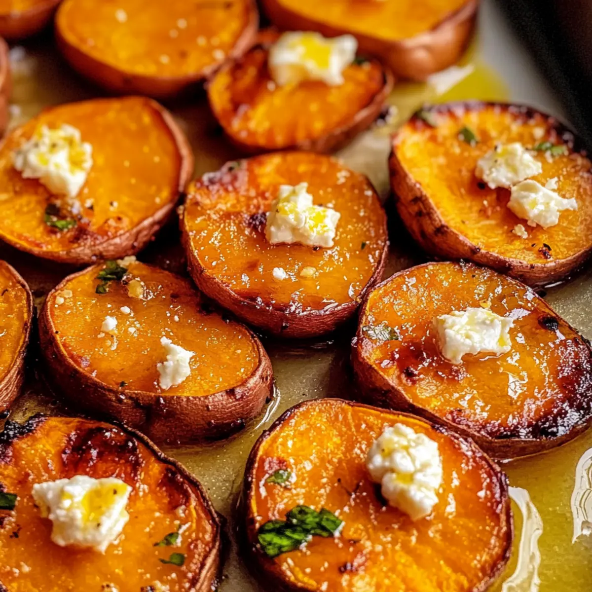 Nehmen Sie das Backblech aus dem Ofen und lassen Sie die Gerösteten Süßkartoffelrunden kurz abkühlen. Während sie noch warm sind, streuen Sie den zerbröckelten Feta gleichmäßig über die Runden. Der warme Kartoffelboden lässt den Feta leicht schmelzen, was dem Gericht eine köstliche Cremigkeit verleiht.