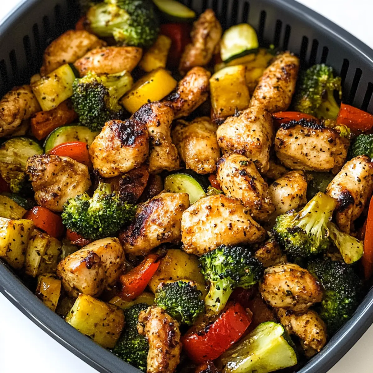 Gebt die Mischung aus Hähnchen und Gemüse in den Korb der Heißluftfritteuse. Kocht die Zutaten für etwa 10 Minuten. Um sicherzustellen, dass alles gleichmäßig gart, schüttelt den Korb nach der ersten Hälfte der Garzeit vorsichtig, sodass sich das Gemüse und das Hähnchen gut vermischen.