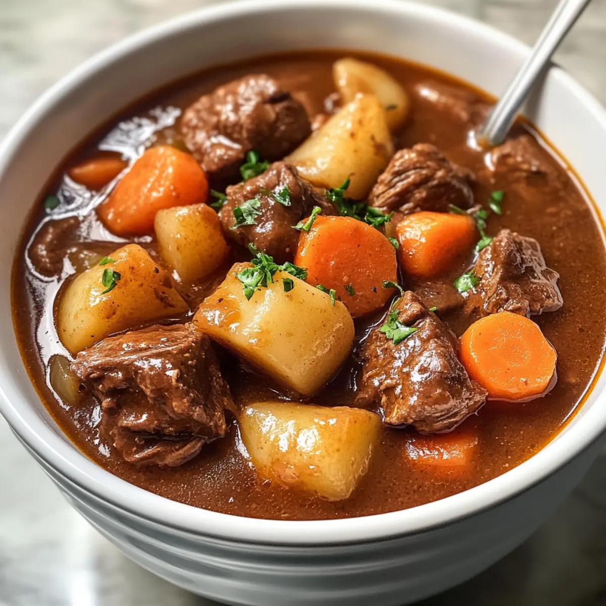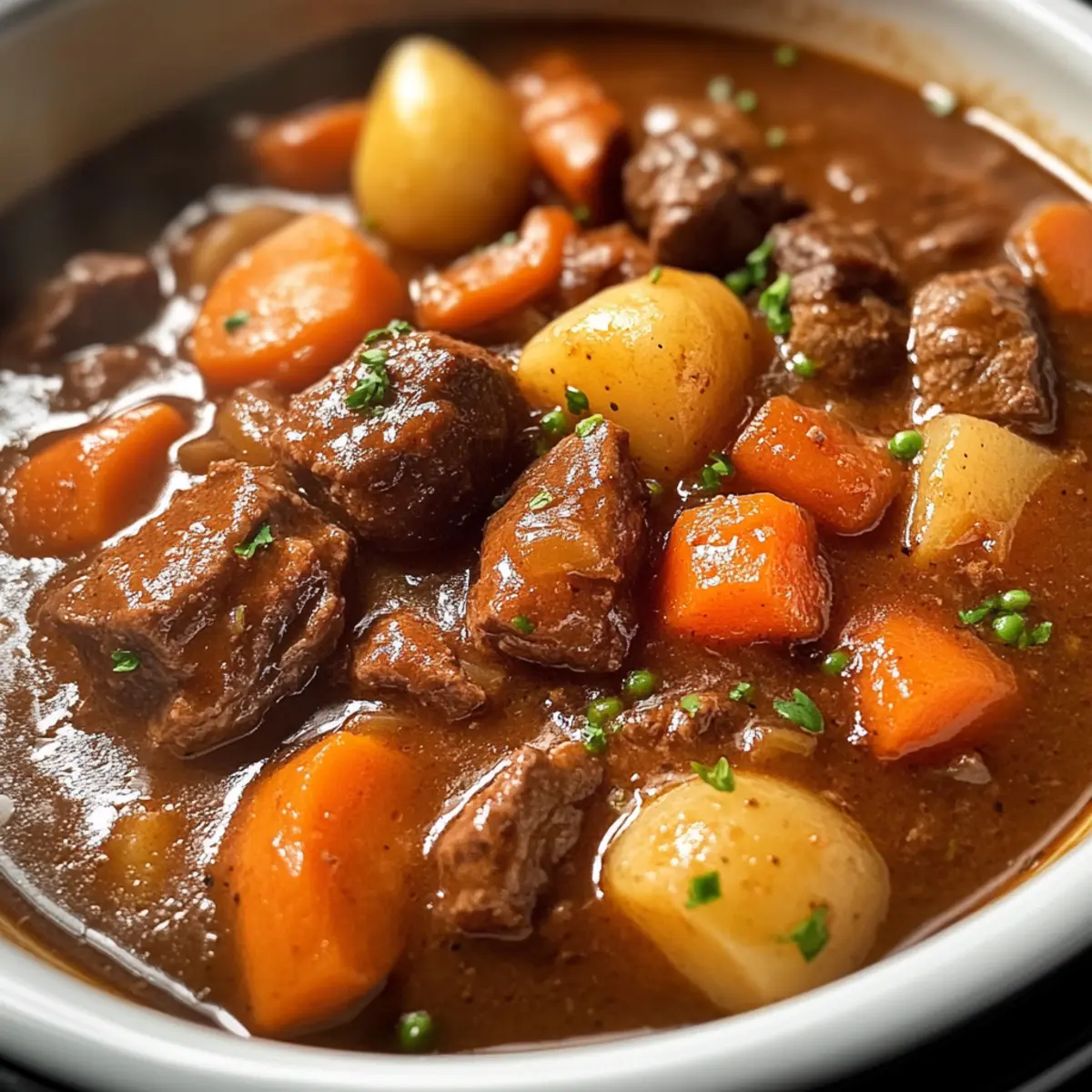 Es gibt Tage, an denen man einfach nach einem warmen, wohltuenden Gericht verlangt, das einen umarmt und die Seele wärmt. Mein Rezept für den Gesundes Rindfleisch-Eintopf aus dem Crockpot ist genau das, was ich in solchen Momenten koche. Mit zartem Rindfleisch, frischem Gemüse und einem aromatischen Sud, der sanft vor sich hin köchelt, während ich meinen Alltag meistere, wird dieses Gericht zu einer unkomplizierten Lösung für hektische Abende. Es ist nicht nur ein perfektes Beispiel für ein gesundes und nahrhaftes Familienessen, sondern auch ein absoluter Hit beim Meal Prep – so kannst du die Reste ganz einfach einfrieren und an stressigen Tagen genießen. Wer kann da schon widerstehen? Lass uns gemeinsam herausfinden, wie man dieses köstliche Gericht zubereitet! Warum wirst du diesen Eintopf lieben? Einfachheit: Die Zubereitung ist ein Kinderspiel! Mit minimaler Vorbereitung und der kleinen Hilfe des Crockpots entsteht ein hervorragendes Gericht, während du dich um andere Dinge kümmern kannst. Herzhafter Geschmack: Die Kombination aus zartem Rindfleisch, frischem Gemüse und einer aromatischen Brühe verleiht diesem Eintopf eine unvergessliche Tiefe. Familienfreundlich: Perfekt geeignet für große Familien oder Gäste – du wirst garantiert Begeisterung ernten! Jeder wird um Nachschlag bitten. Vielseitigkeit: Du kannst leicht Anpassungen vornehmen, um deinen persönlichen Vorlieben gerecht zu werden, sei es durch glutenfreie Alternativen oder verschiedene Gemüseoptionen. Meal Prep-Genuss: Dieser Eintopf eignet sich hervorragend zum Vorbereiten! Koche eine große Portion und genieße ihn in der kommenden Woche oder friere ihn für hektische Tage ein. Wenn du noch mehr spannende Rezepte suchst, probiere doch auch unseren Gebratener Reis Mit oder Chinesisches Rindfleisch Mit, um noch mehr Abwechslung in deine Küche zu bringen! Gesunde Rindfleisch-Eintopf Zutaten Für den Eintopf • Rindfleisch für Eintöpfe – zartes Fleisch wie Chuck Roast sorgt für eine wunderbare Konsistenz; vermeide mageres Fleisch, da es nicht gut zerfällt. • Olivenöl – zum Anbraten des Fleisches, um den Geschmack durch die Maillard-Reaktion zu intensivieren. • Butter – verleiht den aromatischen Zutaten zusätzlichen Reichtum. • Zwiebeln und Knoblauch – unverzichtbare Aromaten, die das Fundament des Geschmacks bilden. • Rotwein – sorgt für eine tiefere Geschmacksnuance; optional kannst du diesen durch Brühe oder Traubensaft ersetzen für eine alkoholfreie Variante. • Rinderbrühe – als Basis für den Eintopf; trägt zur herzhaften Tiefe bei. • Karotten, Kartoffeln, Erbsen – bringen Vitamine und Textur; sie sollten zart, aber nicht matschig sein. • Mehl (oder Maisstärke für glutenfrei) – zum Andicken des Eintopfs; verwende eine Maisstärkeslurry als Alternative. • Frische Kräuter (z. B. Rosmarin, Thymian) – verstärken das Aroma und das Geschmacksprofil. • Lorbeerblätter – verleihen eine subtile Geschmacksvertiefung; vor dem Servieren entfernen. Dieses Rezept für einen gesunden Rindfleisch-Eintopf aus dem Crockpot wird dir nicht nur das Wasser im Munde zusammenlaufen lassen, sondern ist auch ideal für die gesamte Familie! Schritt-für-Schritt-Anleitung für den gesunden Rindfleisch-Eintopf aus dem Crockpot Schritt 1: Rindfleisch vorbereiten Schneide das Rindfleisch in 4 cm große Würfel und entferne überschüssiges Fett. Würze die Stücke großzügig mit schwarzem Pfeffer, Knoblauchsalz und Selleriesalz, damit jedes Stück gut durchgezogen ist. Diese ersten Schritte sind entscheidend, um die Grundlage für den herzhaften Geschmack deines gesunden Rindfleisch-Eintopfs aus dem Crockpot zu legen. Schritt 2: Rindfleisch anbraten Wende das gewürzte Rindfleisch in Mehl (oder Maisstärke für die glutenfreie Variante), um eine leichte Kruste zu erhalten. Erhitze in einer großen Pfanne das Olivenöl auf mittlerer Hitze und brate das Fleisch in Portionen ca. 1-2 Minuten pro Seite an, bis es schön gebräunt ist. Dies verbessert den Geschmack erheblich, also achte darauf, die Pfanne nicht zu überladen. Schritt 3: Rindfleisch in den Crockpot geben Nachdem das Rindfleisch goldbraun ist, überführe die Stücke vorsichtig in den Crockpot. Achte darauf, die Pfanne nicht leer stehen zu lassen, da die Aromen hier noch intensiviert werden. Mit dem Anbraten im Vorfeld bereitest du die Grundlage für einen besonders reichhaltigen Eintopf. Schritt 4: Aromaten sautieren Reduziere die Hitze in der Pfanne und füge die Butter hinzu. Sauté die Zwiebeln für etwa 5 Minuten, bis sie durchsichtig sind und ihr Aroma entfalten. Füge dann den Knoblauch hinzu und koche ihn für 1 weitere Minute mit. Dieser Schritt sorgt dafür, dass die Aromen im gesunden Rindfleisch-Eintopf wunderbar harmonieren. Schritt 5: Pfanne ablöschen Lösche die Pfanne mit dem Rotwein ab und schabe die angebrannten Reste vom Boden. Diese kleinen, karamellisierten Stücke sind wahre Geschmacksträger! Gieße den Inhalt in den Crockpot, damit die Aromen sich perfekt entfalten können und der Eintopf reichhaltig wird. Schritt 6: Restliche Zutaten hinzufügen Gib alle übrigen Zutaten, außer Erbsen, Maisstärke und Butter, in den Crockpot. Darunter fallen die Rinderbrühe, die Karotten, Kartoffeln und Lorbeerblätter. Rühre alles gut um, um sicherzustellen, dass die Aromen gut verteilt sind und die gesamte Mischung köcheln kann. Schritt 7: Eintopf garen Setze den Deckel auf den Crockpot und koche den Eintopf auf niedriger Stufe für 7½ bis 8 Stunden oder auf hoher Stufe für 3½ bis 4 Stunden. Der Rindfleisch-Eintopf sollte fertig sein, wenn das Fleisch so zart ist, dass es leicht mit einer Gabel zerfällt. Kontrollen sind hier wichtig! Schritt 8: Erbsen hinzufügen In den letzten 15 Minuten der Garzeit füge die Erbsen hinzu. Dadurch bleiben sie schön lebendig in der Konsistenz, und ihr frischer Geschmack bereichert den Eintopf zusätzlich. Rühre sie vorsichtig unter, damit sie gleichmäßig verte