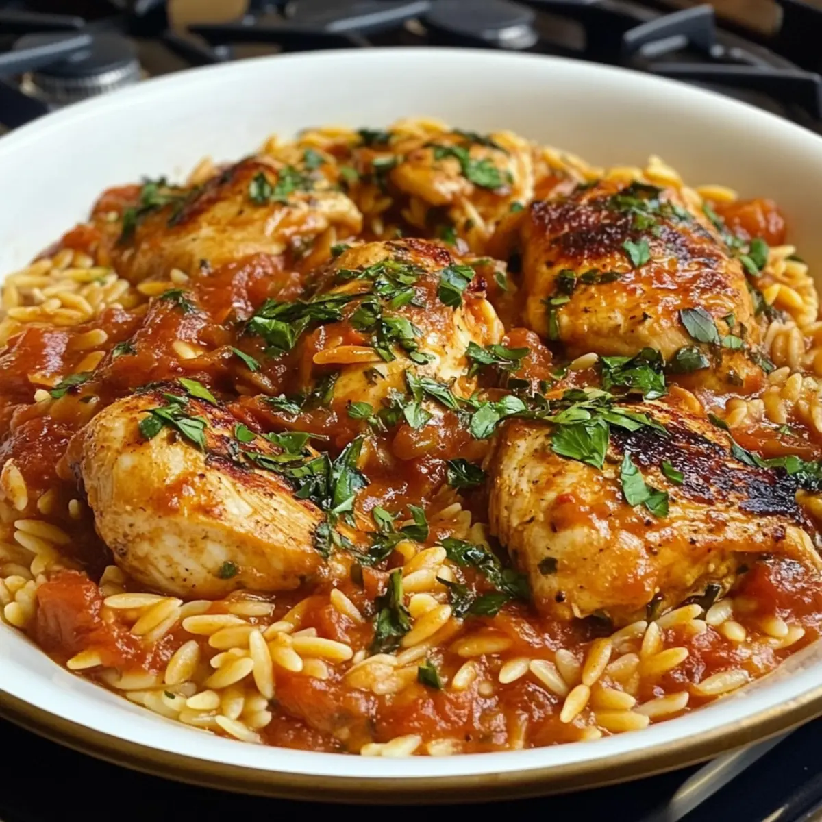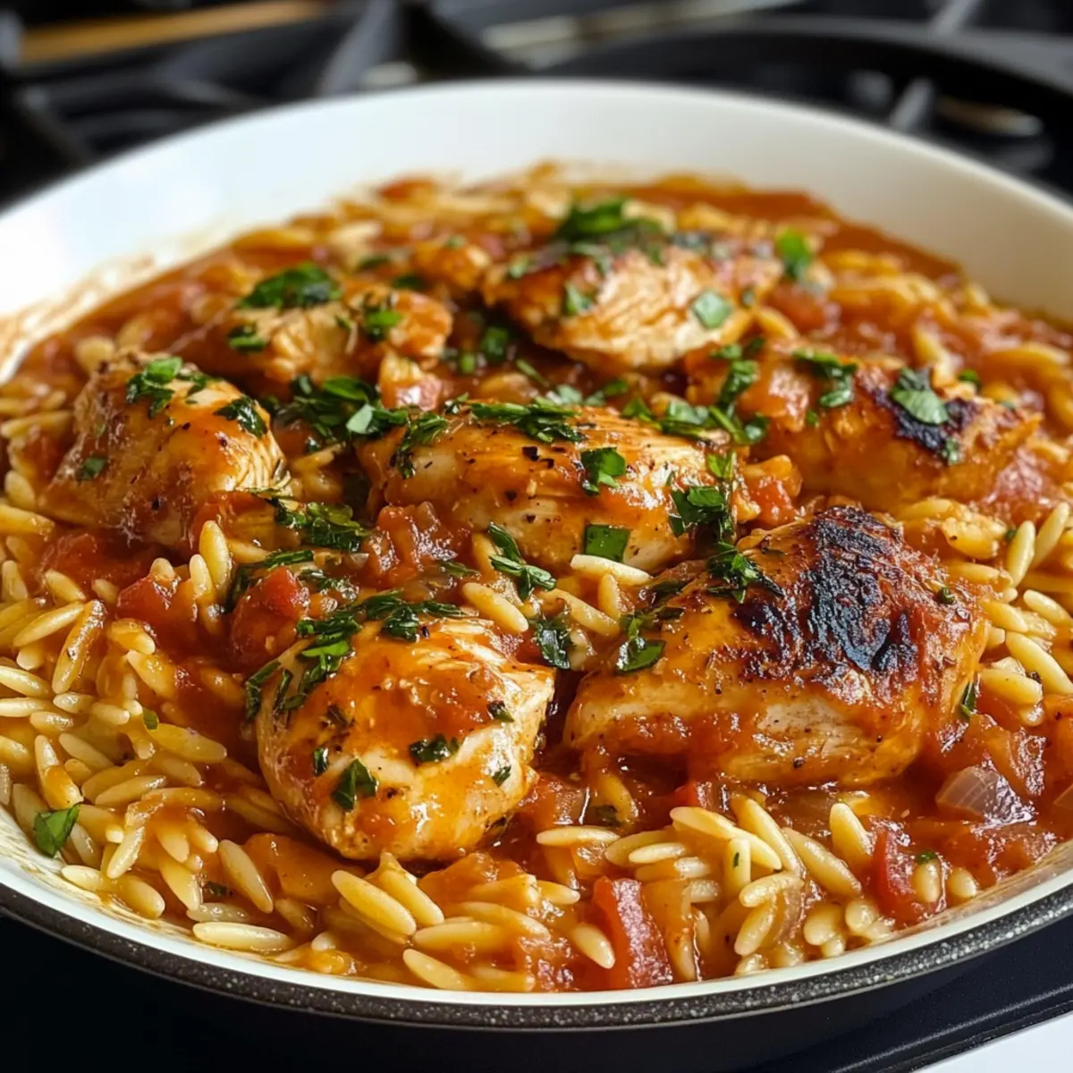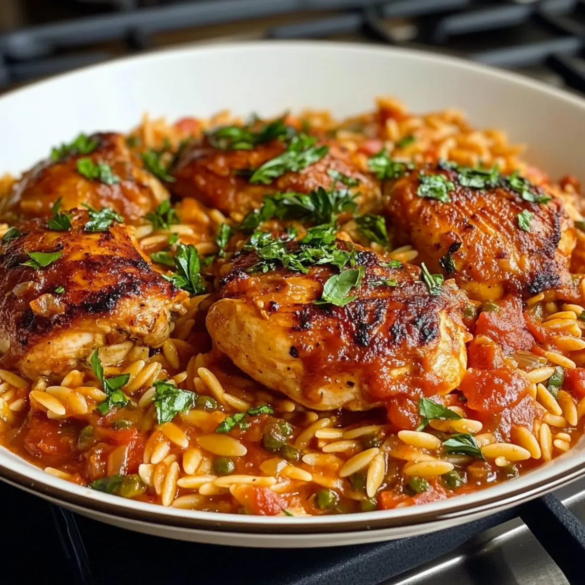 Als ich vor kurzem die Aromen Griechenlands in meiner Küche entdecken wollte, fiel mir das Rezept für Chicken Giouvetsi ins Auge – ein verlockendes, einpfanniges Gericht, das Herz und Gaumen gleichermaßen umarmt. Diese köstliche Kombination aus zartem Hähnchen und orzo Pasta bringt die mediterrane Küche direkt auf unseren Tisch, und das ganz unkompliziert. Die minimalen Vorbereitungszeiten machen dieses Gericht nicht nur perfekt für ein gemütliches Familienessen, sondern auch für den schnellen Genuss an stressigen Tagen. Zudem ist es glutenfrei und eignet sich hervorragend für alle, die eine gesunde und schmackhafte Mahlzeit schätzen. Ich kann es kaum erwarten, euch unsere Geheimtipps zu verraten! Habt ihr euch schon einmal ans Kochen dieser griechischen Spezialität gewagt? Warum Giouvetsi so besonders ist? Traditionelles Rezept: Giouvetsi ist ein klassisches griechisches Gericht, das sich durch seine aromatische Einfachheit auszeichnet und die mediterrane Küche perfekt widerspiegelt. Vielseitig: Mit der Möglichkeit, die Orzo-Pasta durch Reis oder saisonales Gemüse zu ersetzen, ist dieses Rezept anpassbar und für jeden Geschmack geeignet. Wenig Aufwand: Die Zubereitung erfolgt in nur einem Topf, sodass ihr nicht viel Zeit mit dem Abwasch verbringen müsst. Gesunde Wahl: Glutenfrei und voller gesunder Zutaten, bietet Giouvetsi eine ausgewogene und herzhafte Mahlzeit für die ganze Familie. Beeindruckend: Ob beim Familienessen oder bei einem besonderen Anlass, dieses Gericht wird garantiert alle Gäste begeistern! Giouvetsi Zutaten Für das Hähnchen und die Sauce Öl – Ideal zum Anbraten, hier könnt ihr auch Olivenöl für einen authentischen Geschmack verwenden. Zwiebel – Sie verleiht Süße und Tiefe; verwendet am besten gelbe oder weiße Zwiebel für optimale Ergebnisse. Cubanelle Paprika – Fügt eine milde Süße hinzu; könnt ihr durch Banane- oder grüne Paprika ersetzen, falls nicht verfügbar. Hühnerbrühe – Stellt die nötige Flüssigkeit und einen reichhaltigen Geschmack bereit; empfehlenswert ist Brühe mit niedrigem Natriumgehalt. Tomatenpüree – Bringt Säure und Tiefe; kann auch durch zerdrückte Tomaten für eine stückigere Konsistenz ersetzt werden. Salz und Pfeffer – Unverzichtbar für die Würze; nach Geschmack anpassen. Ganzes Hähnchen (in Stücke geschnitten) – Hauptproteinequelle; Hähnchenkeulen oder -brust sind ebenfalls gute Alternativen, um die Vorbereitungszeit zu verkürzen. Für die Pasta Orzo – Dient als Pasta-Basis, die die Hähnchenaromen aufnimmt; für eine gesündere Option kann auch glutenfreies Orzo verwendet werden. Schritt-für-Schritt-Anleitung für Giouvetsi Step 1: Ofen vorheizen Heize deinen Ofen auf 190°C (375°F) vor, während du mit der Vorbereitung beginnst. Dies stellt sicher, dass die Hitze gleichmäßig im Ofen verteilt ist, wenn du das Giouvetsi später hineinlegst. Ein gut vorgeheizter Ofen hilft, dass das Gericht perfekt gart und eine goldbraune Kruste bildet. Step 2: Zutaten anbraten Erhitze etwas Öl in einer großen Pfanne bei mittlerer Hitze. Füge die fein gehackte Zwiebel und die gewürfelte Cubanelle-Paprika hinzu und brate diese für etwa 5 bis 7 Minuten an, bis sie weich und leicht goldbraun sind. Achte darauf, regelmäßig umzurühren, damit nichts anbrennt und die Aromen sich gut verbinden. Step 3: Orzo rösten Gib den Orzo in die Pfanne und röste ihn für 2-3 Minuten, bis er leicht goldbraun duftet. Dies intensiviert den Geschmack und sorgt dafür, dass die Pasta die köstlichen Aromen des Giouvetsi besser aufnehmen kann. Beobachte die Farbe des Orzo, um sicherzustellen, dass er nicht zu dunkel wird. Step 4: Brühe und Tomaten hinzufügen Gieße nun die Hühnerbrühe und das Tomatenpüree in die Pfanne. Rühre alles gut durch und würze mit Salz und Pfeffer nach Geschmack. Bringe die Mischung zum Kochen und achte darauf, dass sie gleichmäßig blubbert, bevor du mit dem nächsten Schritt fortfährst. Step 5: Mischung in eine Auflaufform geben Übertrage die Mischung vorsichtig in eine große Auflaufform oder ein Backblech und verteile sie gleichmäßig. Platziere die Hähnchenteile auf der Oberfläche des Giouvetsi. Die Haut sollte nach oben zeigen, damit sie beim Backen schön knusprig wird und sich die Aromen entfalten können. Step 6: Backen und garen Backe das Giouvetsi im vorgeheizten Ofen für etwa 45 Minuten. Achte darauf, dass die oberste Schicht goldbraun wird und der Orzo die gesamte Flüssigkeit aufgenommen hat. Überprüfe das Gericht gegen Ende der Backzeit und hebe gegebenenfalls das Hähnchen an, um sicherzustellen, dass es durchgegart ist. Step 7: Servieren und genießen Lass das Giouvetsi einige Minuten ruhen, bevor du es aus dem Ofen nimmst, damit sich die Aromen setzen können. Serviere das Gericht direkt aus der Auflaufform, optional garniert mit frischer Petersilie oder geriebenem Käse. Jeder Biss des Giouvetsi wird dich mit dem Geschmack Griechenlands verzaubern. Aufbewahrungstipps für Giouvetsi Kühlschrank: Bewahre Reste des Giouvetsi in einem luftdichten Behälter auf, damit es bis zu 3 Tage frisch bleibt und die Aromen schön erhalten bleiben. Tiefkühler: Das Giouvetsi kann auch bis zu 3 Monate im Gefrierfach aufbewahrt werden. Achte darauf, es gut in Folie oder einem gefrierfesten Behälter zu verpacken, um Gefrierbrand zu vermeiden. Wiedererwärmen: Erwärme das Giouvetsi langsam im Ofen bei 180°C (350°F), bis es vollständig durchgewärmt ist. Du kannst auch einen Spritzer Hühnerbrühe hinzufügen, um die Feuchtigkeit wiederherzustellen. Raumtemperatur: Lass das Giouvetsi nicht länger als 2 Stunden bei Raumtemperatur stehen, um Lebensmittelvergiftungen zu vermeiden. Giouvetsi Variationen & Substitutionen Eure Abenteuer in der Küche können mit diesen Variationen für Giouvetsi noch aufregender werden – lasst euch inspirieren! Glutenfrei: Ersetzt die Orzo-Pasta durch glutenfreies Orzo oder Reis, um das Gericht abzuwandeln und trotzdem köstlich zu ge