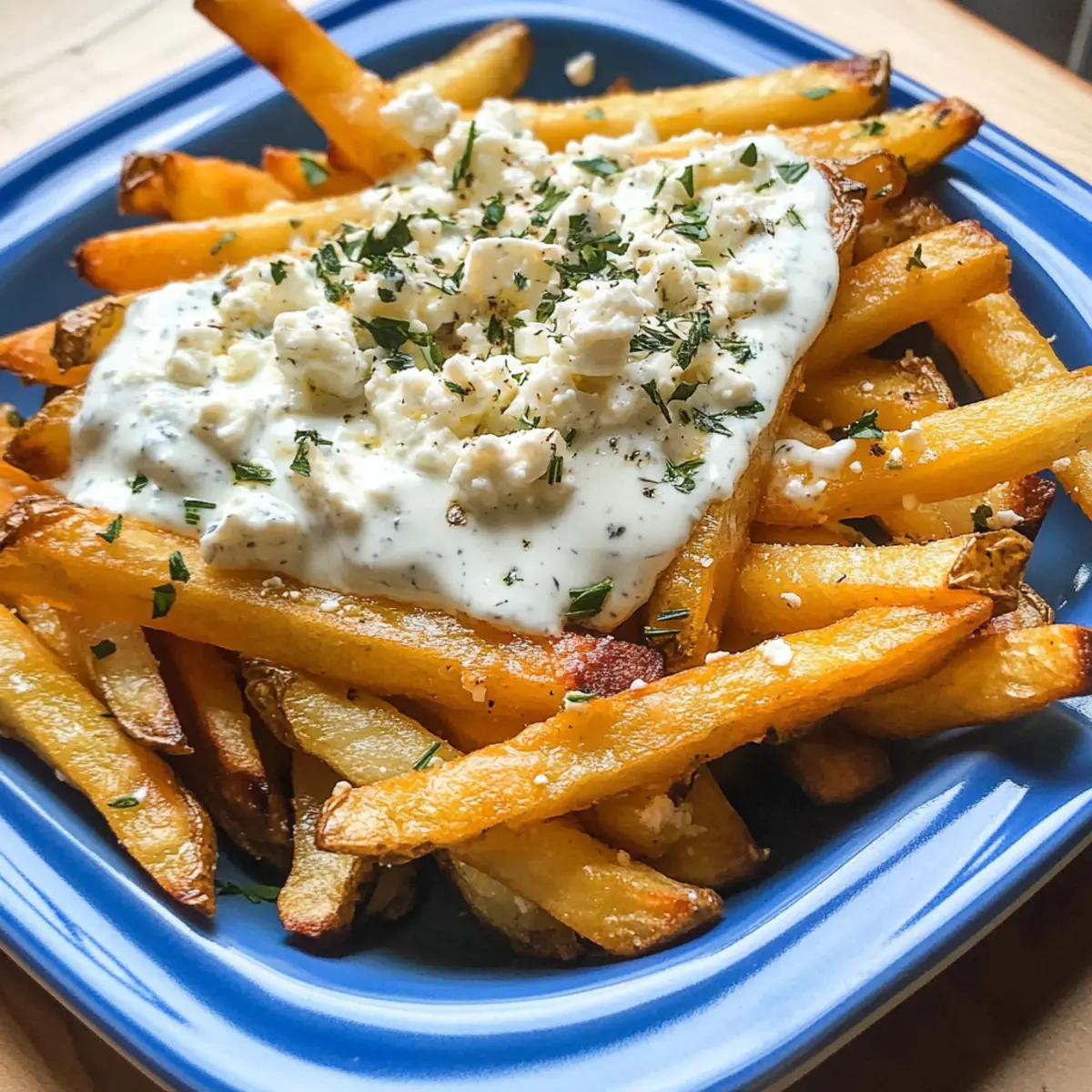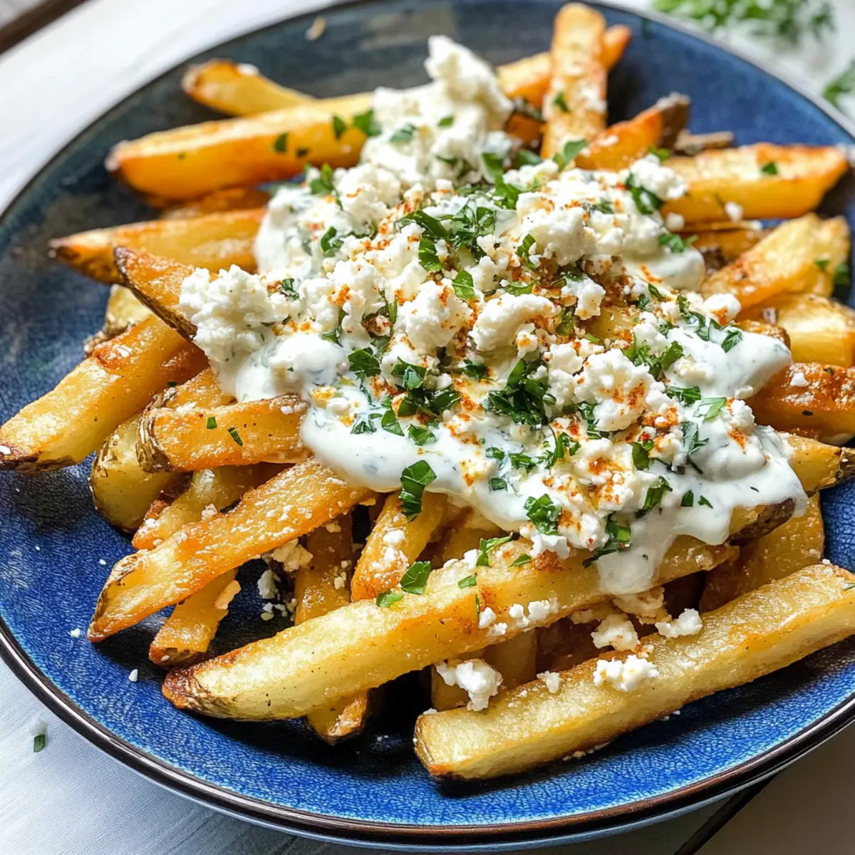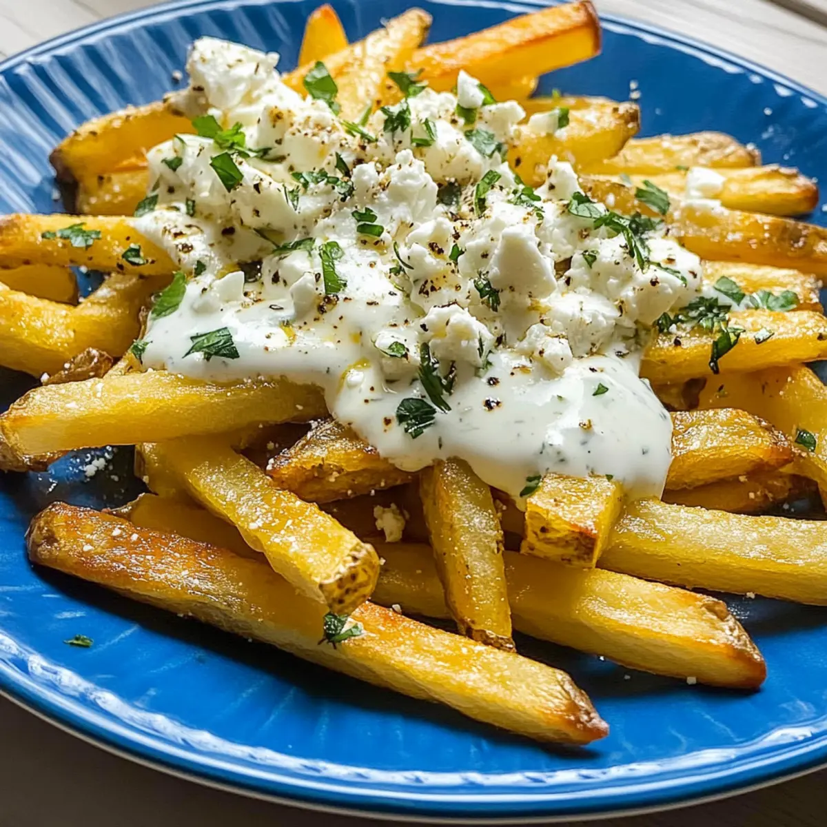 Leckere Griechische Pommes mit Feta-Käse, perfekt für jeden Anlass.