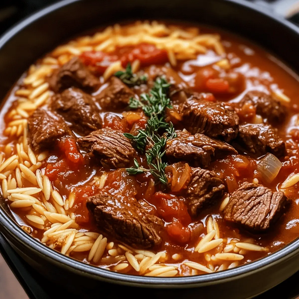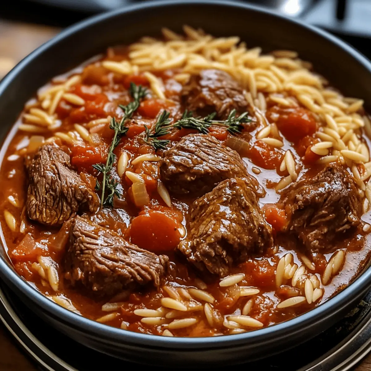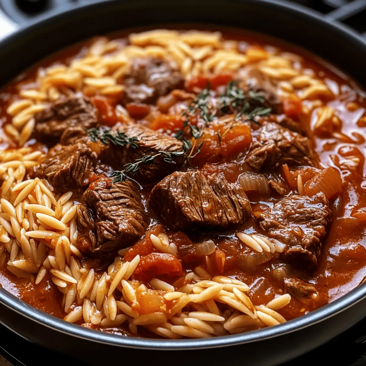 Als ich das erste Mal den betörenden Duft eines griechischen Giouvetsi in der Luft wahrnahm, fühlte ich mich direkt in die Sonne Griechenlands versetzt. Dieser traditionelle Eintopf mit Rindfleisch und zartem Orzo entfaltet sich wie eine herzliche Umarmung auf dem Teller, perfekt für gesellige Familienabende. Mit seiner einladenden Tomatensauce und der Möglichkeit, ihn im Slow Cooker oder am Herd zuzubereiten, bietet dieses Gericht nicht nur schnellen Genuss, sondern auch den Komfort eines wärmenden Hausmannskost. Wenn du auf der Suche nach einem unkomplizierten, dennoch köstlichen Gericht bist, das selbst den anspruchsvollsten Gaumen begeistert, dann ist dieser Giouvetsi genau das Richtige für dich. Welche köstlichen Geheimnisse du in dieser klassischen Rezeptur entdecken wirst, lässt meinen Löffel schon sabbern! Warum wirst du Giouvetsi lieben? Aromatische Erfahrungen: Das köstliche Aroma von diesem Giouvetsi ist unwiderstehlich und versetzt dich sofort in Feierlaune. Einfache Zubereitung: Ob im Slow Cooker oder auf dem Herd, diese unkomplizierte Methode spart dir Zeit und Aufwand. Vielseitige Geschmäcker: Du kannst das Rindfleisch ganz einfach gegen Lamm oder sogar Hühnchen austauschen und so eigene Variationen kreieren. Herzhaft und Wohltuend: Mit zartem Orzo und einer reichhaltigen Tomatensauce wird jeder Löffel zu einer Umarmung für deinen Gaumen. Klassisch und Modern: Dieser Giouvetsi verbindet traditionelle griechische Küche mit modernem Komfort und eignet sich ideal für gesellige Abende. Entdecke auch gerne andere köstliche Rezepte wie Linsensuppe mit Zitrone und Kirschen Schokoladen Brownies, die deine nächste Familienversammlung unvergesslich machen! Griechisches Giouvetsi Zutaten • Dieser Abschnitt enthält alles, was du für dein köstliches Giouvetsi benötigst. Für das Rindfleisch Olivenöl – Sorgt für Reichtum und Feuchtigkeit; ein anderes hoch erhitzbares Pflanzenöl kann verwendet werden. Rindfleisch oder Brust (900g) – Das Hauptprotein, das Herzhaftigkeit hinzufügt; leicht gegen Lamm oder Hühnchen austauschbar. Zwiebel (1 große, gewürfelt) – Verleiht Süße und Tiefe; für einen milderen Geschmack können Schalotten verwendet werden. Knoblauch (4 Zehen, grob gehackt) – Verbessert den Geschmack; Knoblauchpulver ist ein guter Ersatz, falls frischer nicht verfügbar ist. Für die Sauce Rotwein (80ml) oder Rinderbrühe – Flüssigkeit zum Ablöschen, fügt Säure und Tiefe hinzu; man kann mehr Brühe für eine alkoholfreie Version verwenden. Rotweinessig (60ml) – Verleiht eine pikante Note; weißer Weinessig kann ebenfalls verwendet werden. Balsamico-Essig (1 EL) – Ergänzt die Sauce mit Süße; Apfelessig ist ein gutes Ersatzprodukt. Worcestershire-Sauce (½ EL) – Sorgt für einen herzhaften Geschmack; kann weggelassen werden, falls nicht vorhanden. Tomatenmark (2 EL) – Konzentriert den Tomatengeschmack; zusätzliches passierte Tomaten kann ebenfalls verwendet werden. Zerkleinerte Tomaten (400g) – Basis der Sauce; frisch pürierte Tomaten können auch verwendet werden. Brauner Zucker (½ EL, optional) – Balanciert die Säure; kann weggelassen werden, um weniger Süße zu erhalten. Salz (2 TL) & schwarzer Pfeffer (1 TL) – Gewürze zur Geschmacksverbesserung; je nach Geschmack anpassen. Für die Gewürze Gemischte Kräuter (1 TL) – Fügt aromatischen Geschmack hinzu; italienische Gewürzmischung kann auch verwendet werden. Piment (½ TL), gemahlener Zimt (½ TL) – Fügt Wärme und Komplexität hinzu; Muskatnuss kann ebenfalls als Ersatz verwendet werden. Gemahlener Kreuzkümmel (¼ TL) & Koriander (¼ TL) – Diese Gewürze verbessern das Aroma des Eintopfs; optional weglassen. Lorbeerblatt (1 großes) – Verleiht beim Kochen Geschmack; vor dem Servieren entfernen. Für die Brühe und Pasta Rinderbrühe (500ml) – Sorgt für Feuchtigkeit; kann durch Gemüsebrühe für eine leichtere Variante ersetzt werden. Orzo (300g) – Die charakteristische Pasta im Gericht; kann für eine Variation auch durch Reis oder andere kleine Pasta ersetzt werden. Für das Servieren Frisch geriebener Parmesan (nach Geschmack) – Verleiht zusätzliche Reichhaltigkeit; kann für eine milchfreie Version weggelassen werden. Gehackte Petersilie (1 EL) – Dient zur Garnierung und verleiht Frische; andere frische Kräuter wie Dill sind ebenfalls möglich. Schritt-für-Schritt-Anleitung für Griechisches Rindfleisch Giouvetsi mit Orzo Step 1: Rindfleisch würzen Würze das Rindfleisch großzügig mit Salz und Pfeffer, um den Geschmack zu intensivieren. Du kannst Rindfleischstücke oder Brust verwenden. Achte darauf, dass das Fleisch gleichmäßig bedeckt ist, um das volle Aroma zu entfalten. Step 2: Öl erhitzen Erhitze in einem großen Casserole oder Slow Cooker Olivenöl bei mittlerer Hitze. Das Öl sollte heiß genug sein, dass es leicht schimmert. Brate das gewürzte Rindfleisch rundherum an, bis es goldbraun ist, was etwa 5-7 Minuten pro Seite dauert. Vermeide es, zu viel Fleisch auf einmal zu braten, damit es gut bräunt. Step 3: Ablöschen und Gemüse hinzufügen Nachdem das Fleisch schön braun ist, lösche den Bratensatz mit Rotwein oder Rinderbrühe ab. Schabe die Röststücke vom Boden des Topfes ab, um zusätzlichen Geschmack zu gewinnen. Füge die gewürfelte Zwiebel, den gehackten Knoblauch und das Lorbeerblatt hinzu und lasse alles für 2-3 Minuten kochen, bis die Zwiebeln glasig sind. Step 4: In den Slow Cooker umfüllen Falls du auf dem Herd begonnen hast, überführe jetzt die Mischung in den Slow Cooker. Füge die restlichen Gewürze, die gemischten Kräuter, den Rotweinessig, die Worcestershire-Sauce, die Rinderbrühe und die zerkleinerten Tomaten hinzu. Rühre alles gut um, damit sich die Aromen vermischen. Step 5: Langsam garen im Slow Cooker Decke den Slow Cooker ab und koche das Giouvetsi auf HOCH für 4-5 Stunden oder auf NIEDRIG für 6-8 Stunden, bis das Fleisch sehr zart ist. Überprüfe zwischendurch den Gargrad des Fl