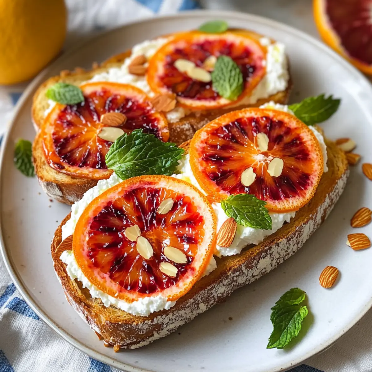 Die rösten Toasts mit grob gehackten Mandeln bestreuen, die einen schönen Crunch hinzufügen. Optional können frische Minzblätter darüber gestreut werden, um eine aromatische Frische zu verleihen. Zuletzt mit einer Prise Meersalzflocken bestreuen, um die Süße der Orangen und die Cremigkeit der Ricotta hervorzuheben.