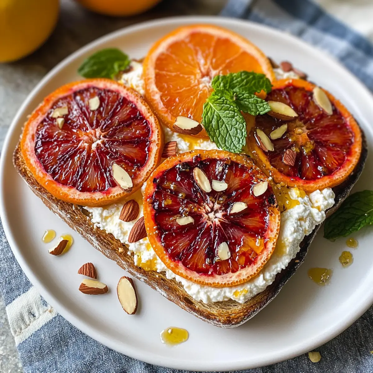 Die Grillierte Orange Geschlagener Ricotta Toasts sind ideal für die Vorbereitung im Voraus, um Zeit zu sparen und hektische Morgen zu erleichtern. Sie können die Ricotta-Mischung bis zu 24 Stunden im Voraus zubereiten und im Kühlschrank aufbewahren, damit sie die Aromen voll entfaltet. Slicing der Orangen kann ebenfalls am Tag zuvor erfolgen; halten Sie diese jedoch in einem luftdichten Behälter, um die Frische zu erhalten. Wenn Sie bereit sind zu servieren, rösten Sie das Brot unter dem Grill für etwa 3-5 Minuten, belegen Sie die Toasts unmittelbar danach mit der vorbereiteten Ricotta und den gegrillten Orangen. Genießen Sie die perfekte Kombination aus cremigem, fruchtigem Geschmack, die stressfrei und gleichzeitig beeindruckend ist!