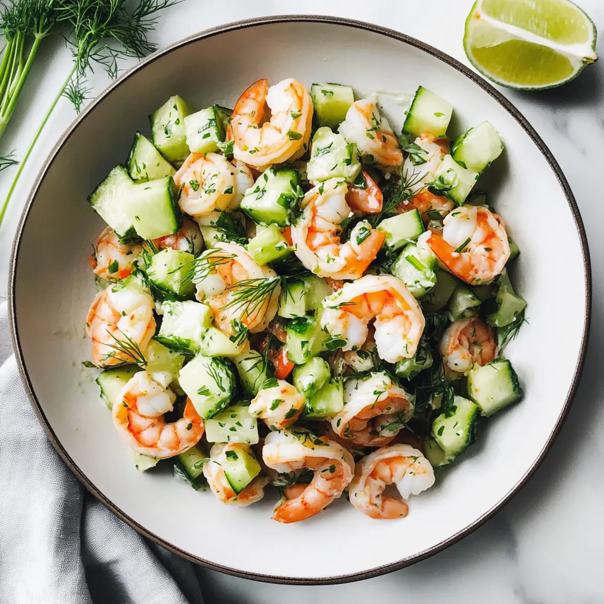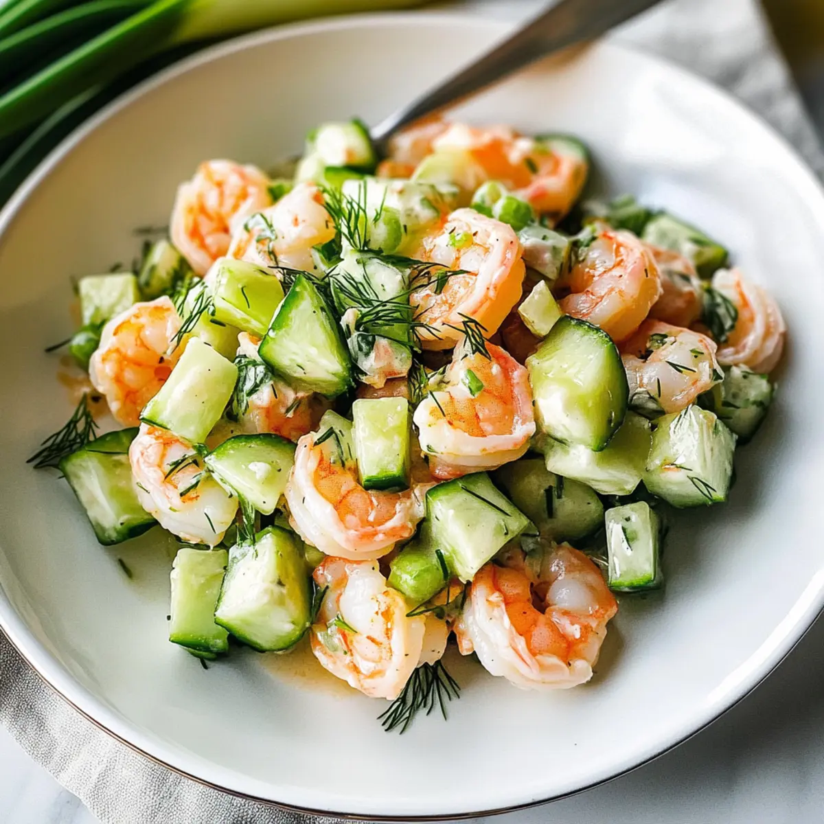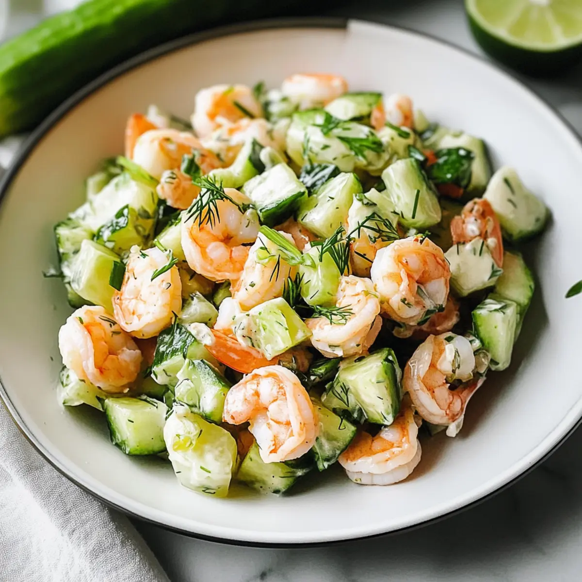 Beim ersten Biss in diesen Gurken-Garnelen-Salat wird man sofort von einem köstlichen Geschmackserlebnis überrascht. Die zarten, saftigen Garnelen harmonieren perfekt mit den knackigen Gurken und dem frischen Dill. Diese Kombination, umhüllt von einem cremigen Limetten-Dressing, bringt nicht nur Farbe auf den Teller, sondern auch eine gesunde Portion Protein und knackige Frische – ideal für alle, die schnelle und gesunde Mahlzeiten lieben. In nur 30 Minuten zubereitet, ist dieser Salat die perfekte Lösung für ein schnelles Mittagessen oder ein leichtes Abendessen. Wer kann da schon widerstehen? Lass uns entdecken, wie einfach es ist, diesen herrlichen Gurken-Garnelen-Salat zuzubereiten! Warum wirst du diesen Gurken-Garnelen-Salat lieben? Frische Aromen: Der Gurken-Garnelen-Salat bietet eine erfrischende Kombination aus saftigen Garnelen und knackigen Gurken, perfekt für warme Tage. Schnelle Zubereitung: In nur 30 Minuten zauberst du eine gesunde, proteinreiche Mahlzeit – ideal für geschäftige Momente! Vielseitige Anpassungen: Füge Avocado oder verschiedene Kräuter hinzu, um den Salat ganz nach deinem Geschmack zu variieren. Gesund und nahrhaft: Dieser Salat ist nicht nur glutenfrei, sondern auch arm an Kohlenhydraten und reich an Proteinen, perfekt für eine ausgewogene Ernährung. Perfekte Portionsgröße: Mit etwa 349 Kalorien pro Portion eignet sich dieser Salat hervorragend für die Lunch-Pause oder als leichtes Abendessen. Gurken-Garnelen-Salat Zutaten Für den Salat • Garnelen – Sorgt für Proteine und Geschmack; frische oder gefrorene Garnelen sind ideal, geschält und entdarmt für einfache Zubereitung. • Englische Gurke – Fügt Knackigkeit und Hydration hinzu; reguläre Gurken können als Alternative verwendet werden, sind jedoch wässriger. • Frühlingszwiebeln – Bringt einen milden Zwiebelgeschmack und Farbe; alternativ können Schnittlauch oder andere Zwiebelarten verwendet werden. Für das Dressing • Mayonnaise – Bildet die Basis für das cremige Dressing; griechischer Joghurt ist eine leichtere Alternative. • Sauerrahm – Fügt eine herzhafte Cremigkeit und einen Hauch von Säure hinzu; kann durch zusätzliche Mayonnaise ersetzt werden. • Limette – Liefert Frische und Säure; frisch gepresste Limetten sind am besten, aber abgefüllter Limettensaft ist geeignet. • Frischer Dill – Verleiht dem Gericht einen luxuriösen, aromatischen Geschmack; getrockneter Dill kann in kleinerer Menge verwendet werden, ergibt jedoch nicht das gleiche Aroma. • Dijon-Senf – Sorgt für mehr Geschmackstiefe; gelber Senf kann auch als Ersatz dienen. • Knoblauch – Fügt einen aromatischen, herzhaften Geschmack hinzu; Knoblauchpulver ist eine praktikable Alternative, wenn frischer nicht verfügbar ist. • Koshersalz – Verstärkt die Aromen; die Menge kann je nach diätetischen Bedürfnissen angepasst werden. Genieße die Zubereitung dieses köstlichen Gurken-Garnelen-Salats und verwöhne dich und deine Liebsten mit einem gesunden, schnellen Gericht! Schritt-für-Schritt-Anleitung für Gurken-Garnelen-Salat Step 1: Das Dressing vorbereiten In einer Schüssel die Mayonnaise, den Sauerrahm, die Limettenschale, den Limettensaft, den frischen Dill, den Dijon-Senf, den gehackten Knoblauch, das Koshersalz und frisch gemahlenen Pfeffer vermengen. Rühre die Mischung gut um, bis sie schön cremig und glatt ist. Dann beiseite stellen, damit sich die Aromen entfalten können. Step 2: Die Garnelen kochen Einen Topf mit Wasser zum Kochen bringen. Füge die Garnelen hinzu und koche sie für 2-3 Minuten, bis sie eine rosa und opake Farbe erreichen. Achte darauf, die Garnelen nicht zu überkochen, da sie sonst zäh werden. Nach dem Kochen die Garnelen sofort mit einem Schaumlöffel entfernen und abtropfen lassen. Step 3: Eisbaden vorbereiten Bereite eine Schüssel mit kaltem Wasser und Eiswürfeln vor. Übertrage die gekochten Garnelen in das Eiswasser, um den Garprozess schnell zu stoppen. Lasse sie für etwa 3 Minuten im Wasser, damit sie vollständig abkühlen. Anschließend abtropfen und in mundgerechte Stücke schneiden. Step 4: Zutaten kombinieren In einer großen Schüssel die gehackten Garnelen, die gewürfelte englische Gurke und die in Ringe geschnittenen Frühlingszwiebeln zusammenfügen. Gieße das vorbereitete cremige Dressing über die Zutaten und vermenge alles vorsichtig, bis alles gleichmäßig bedeckt ist. Step 5: Servieren oder Kühlen Der Gurken-Garnelen-Salat ist nun fertig! Du kannst ihn sofort servieren oder für 30 Minuten im Kühlschrank kühlen, damit er noch erfrischender schmeckt. Genießen Sie diesen leckeren Salat als schnelles Mittagessen oder leichtes Abendessen. Was passt gut zum Gurken-Garnelen-Salat? Der Gurken-Garnelen-Salat ist nicht nur köstlich und leicht, sondern lässt sich auch wunderbar mit einer Vielzahl von Beilagen kombinieren, um eine vollendete Mahlzeit zu kreieren. Knusprige Brötchen: Diese sind perfekt, um die cremige Füllung aufzusaugen und bringen eine angenehme Textur ins Spiel. Leichte Quinoa-Beilage: Quinoa ist nährstoffreich und bietet einen herzhaften Kontrast zur frischen Salattextur. Zitronenwasser: Ein spritziges Getränk, das die Frische des Salates unterstreicht und ideal für warme Tage ist. Avocado-Scheiben: Füge eine cremige Note hinzu, die perfekt die Frische der Gurke und die Zartheit der Garnelen ergänzt. Gemischter grüner Salat: Ein einfaches grünes Bett mit Rucola und Spinat bringt zusätzliche Vitamine und sorgt für ein farbenfrohes Präsentation. Tortilla-Chips: Knusprige Chips sind eine großartige Ergänzung für den Salat, ideal um die köstliche Dressing zu genießen. Jede dieser Beilagen ergänzt die Aromen des Gurken-Garnelen-Salats und sorgt für ein harmonisches Geschmackserlebnis! Gurken-Garnelen-Salat: Variationen & Alternativen Lass deiner Kreativität freien Lauf und entdecke, wie du diesen köstlichen Gurken-Garnelen-Salat ganz nach deinem Geschmack anpassen kannst! Meer