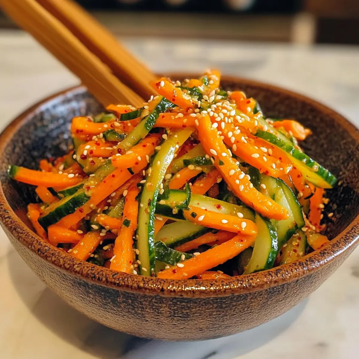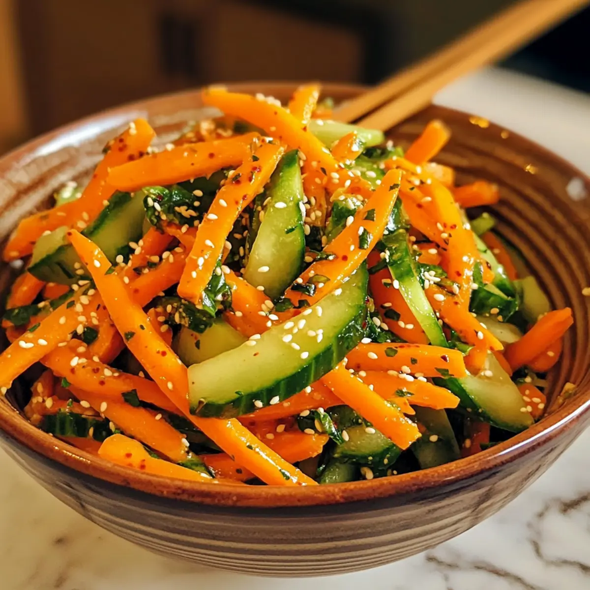 Die warmen Sonnenstrahlen kitzeln auf der Haut, während ich die frischen Zutaten für meinen Gurken-Möhren-Salat mit Gochugaru bereitstelle. Diese knackige, farbenfrohe Kombination aus Gurken und Möhren wird in ein köstliches, koreanisch inspiriertes Dressing getaucht, das mit Gochugaru für einen dezenten Kick sorgt. Eine großartige Sache an diesem Rezept? Es ist nicht nur blitzschnell zubereitet, perfekt für geschäftige Abende oder als erfrischender Snack an warmen Tagen, sondern auch vielseitig und anpassbar. Ideal für jedermann, der sich von Fast Food verabschieden möchte, während er gleichzeitig gesunde, vegetarische und glutenfreie Optionen erkundet. Wer hätte gedacht, dass die Kombination aus frischen Zutaten und einem Hauch von Schärfe so viel Freude bereiten kann? Lasst uns gemeinsam herausfinden, wie einfach und schmackhaft dieser Salat wirklich sein kann! Warum ist dieser Salat so besonders? Einfache Zubereitung: Die Zubereitung dieses Gurken-Möhren-Salats mit Gochugaru dauert nur wenige Minuten. Ideal für alle, die in der Küche nicht viel Zeit verbringen möchten! Frische Farben: Die leuchtenden Farben der Zutaten machen jeden Bissen zu einem Fest für die Augen. Vielseitigkeit: Ob als leichtes Mittagessen oder als Beilage zu gegrilltem Hähnchen oder Knoblauch Butter Rinderfilet, er passt einfach überall dazu. Gesunde Wahl: Mit frischen, natürlichen Zutaten ist dieser Salat leicht, vegetarisch und glutenfrei, perfekt für gesundheitsbewusste Genießer. Koreanischer Kick: Der Gochugaru verleiht ihm eine einzigartige, würzige Note, die für Abwechslung sorgt und das Geschmackserlebnis hebt! Experimentiere gerne auch mit variierenden Zutaten, um deine eigene perfekte Mischung zu kreieren! Gurken-Möhren-Salat mit Gochugaru Zutaten Zutaten für den Salat: Gurken – Sie sorgen für den knackigen Biss und sind reich an Wasser. Wähle frische, feste Exemplare für das beste Ergebnis. Möhren – Sie bringen natürliche Süße und leuchtende Farben in den Salat. Achte auf frische, knackige Möhren für die beste Textur. Olivenöl – Verleiht Reichhaltigkeit und hilft, das Dressing zu emulgieren. Frischer Zitronensaft – Sorgt für die notwendige Säure und Helligkeit im Geschmack. Gochugaru – Diese koreanische Chiliflocke sorgt für eine besondere, rauchige Schärfe. Du kannst sie auch durch gewöhnliche rote Chiliflocken ersetzen, aber der Geschmack wird anders sein. Sojasauce – Fügt Umami hinzu und verstärkt den herzhaften Aspekt des Dressings. Verwende glutenfreies Tamari für eine glutenfreie Option. Zucker – Balanciert die Säure und Schärfe im Dressing. Passe ihn je nach Geschmack an. Gehackter Knoblauch – Verstärkt die Tiefe des Geschmacks im Salat. Frische Petersilie – Sorgt für Frische und ein leichtes, pfeffriges Aroma. Kann durch Schnittlauch oder Koriander ersetzt werden. Sesamkörner – Bringt Nussigkeit und visuelle Anziehung. Für mehr Geschmack verwende geröstete Sesamkörner. Dieser Gurken-Möhren-Salat mit Gochugaru ist nicht nur einfach zuzubereiten, sondern auch ein wahrer Genuss für die Sinne! Schritt-für-Schritt-Anleitung für Gurken-Möhren-Salat mit Gochugaru Step 1: Gemüse vorbereiten Wasche die Gurken und Möhren gründlich unter fließendem Wasser und trockne sie ab. Verwende ein scharfes Messer oder einen Julienne-Schneider, um die Gurken und Möhren in dünne Streifen zu schneiden. Diese gleichmäßigen Schnitte sorgen für eine ansprechende Textur in deinem Gurken-Möhren-Salat mit Gochugaru. Step 2: Dressing anrühren In einer kleinen Schüssel gibst du das Olivenöl, den frischen Zitronensaft, Gochugaru, Sojasauce und Zucker hinein. Mit einem Schneebesen rührst du die Mischung gut um, bis sich der Zucker vollständig aufgelöst hat. Probiere das Dressing und passe die Geschmacksbalance nach deinem Belieben an, um die perfekte Schärfe und Süße zu finden. Step 3: Salat mischen Gib die juliennen Gurken und Möhren in eine große Mischschüssel. Füge das vorbereitete Dressing hinzu und streue den gehackten Knoblauch sowie die frische Petersilie hinein. Verwende eine große Gabel oder deine Hände, um alles sanft zu vermengen, sodass die Gemüse gleichmäßig mit dem Dressing bedeckt sind. Step 4: Durchziehen lassen Lass den Gurken-Möhren-Salat mit Gochugaru für etwa 10-15 Minuten bei Raumtemperatur stehen. Diese Ruhezeit ermöglicht es den Aromen, sich miteinander zu verbinden und intensiver zu werden. Je länger du wartest, desto besser entfalten sich die Geschmäcker! Step 5: Garnierung und Servieren Vor dem Servieren kannst du die Oberfläche des Salats mit gerösteten Sesamkörnern bestreuen. Wenn du möchtest, füge noch einige frisch geschnittene Frühlingszwiebeln oder einen Spritzer Sesamöl hinzu. Serviere den Salat sofort für beste Frische oder genieße ihn als köstlichen Snack auf einem leichten Mittagstisch. Was passt zum Gurken-Möhren-Salat mit Gochugaru? Die perfekte Ergänzung zu diesem spritzigen Salat macht dein Essen zu einem Fest der Aromen und Farben! Gegrilltes Hähnchen: Das zarte, saftige Fleisch harmoniert ideal mit der Frische des Salats und bringt eine herzhafte Note. Seitan-Streifen: Diese pflanzliche Proteinquelle ist nicht nur nahrhaft, sondern ergänzt auch die Schärfe des Salats auf köstliche Weise. Kimchi: Dieses fermentierte Gemüse bringt zusätzliche Würze und Tiefe in die Mahlzeit und passt perfekt zu den koreanischen Aromen. Vollkorn-Reis: Die nussige Textur des Reises sorgt für eine sättigende Basis und ergänzt die frischen Zutaten des Salats wunderbar. Weiße Bohnensuppe: Diese cremige Suppe bietet einen herzhaften Kontrast zur knackigen Frische des Gurken-Möhren-Salats mit Gochugaru. Kalter grüner Tee: Ein erfrischendes Getränk, das die Schärfe des Salats ausbalanciert und eine sanfte, beruhigende Komponente hinzufügt. Frisches Obst: Eine Auswahl an Trauben oder Melonenscheiben bietet eine süße, saftige Erfrischung zwischen den herzhaften Bissen. Expert