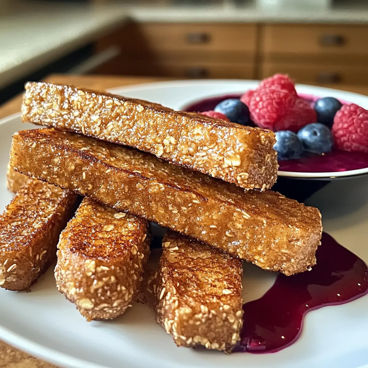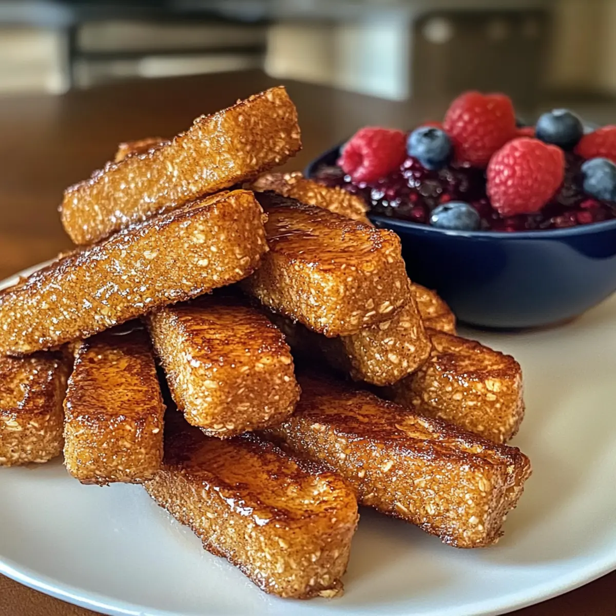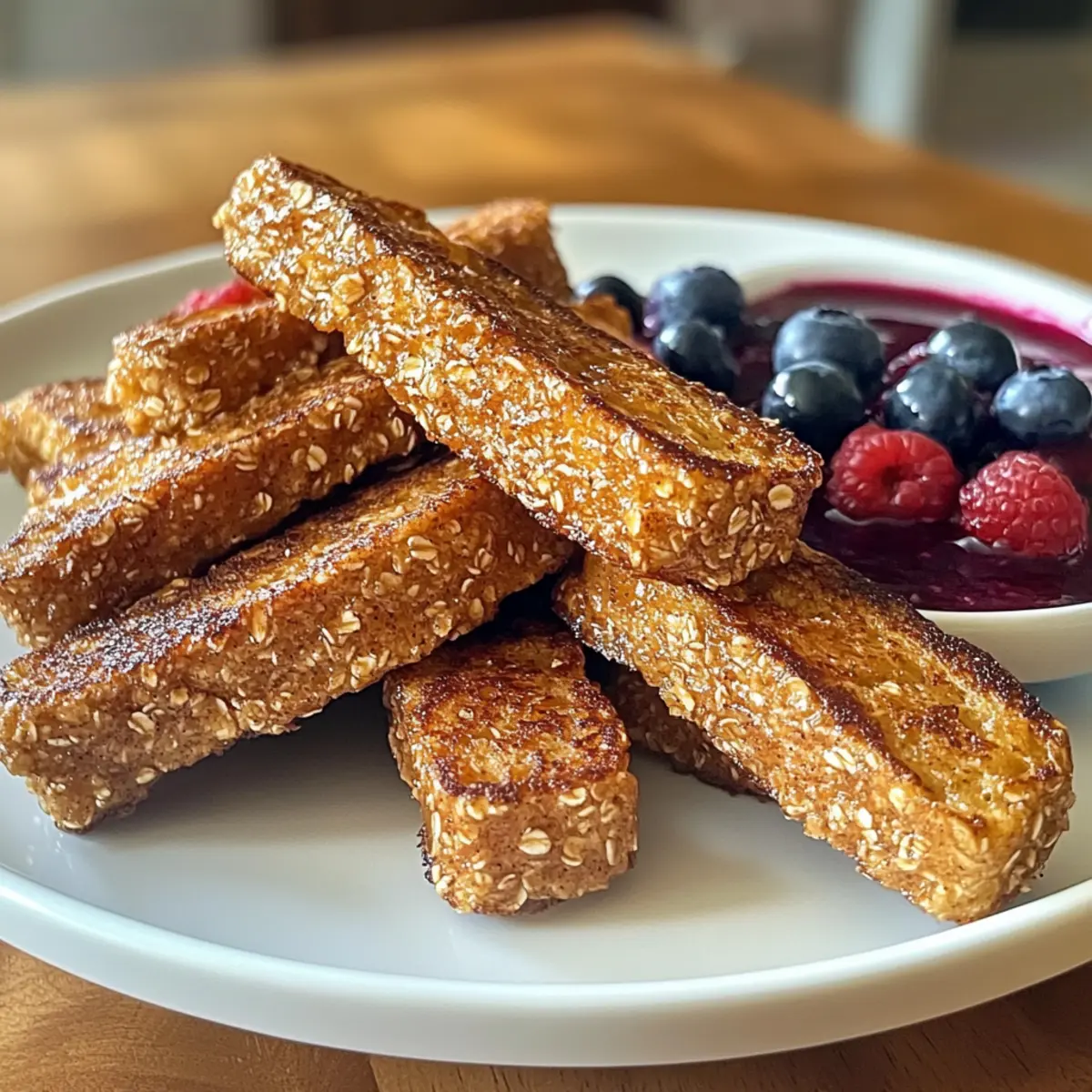 8. Serviere die Hafer French Toast Sticks warm zusammen mit dem Beerendip.