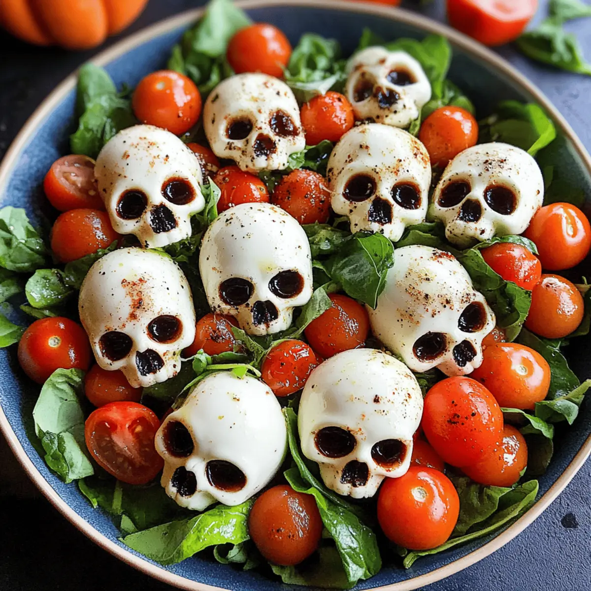 Die gruseligste Zeit des Jahres steht vor der Tür, und ich kann es kaum erwarten, meine kreative Seite in der Küche auszuleben! Dieses Jahr habe ich eine ganz besondere Idee für euer Halloween-Buffet: einen Caprese-inspirierten Halloween-Salat mit Mozzarella-Schädeln. Diese fröhliche Mischung aus süßen Kirschtomaten, knackigen grünen Blättern und formschönen Käse-Schädeln verleiht dem Fest nicht nur eine gesunde, sondern auch eine festliche Note. Schnelle Zubereitung und die Möglichkeit, ihn vorab vorzubereiten, machen diesen Salat zu einem absoluten Lieblingsgericht für gesellige Zusammenkünfte. Wer kann da widerstehen? Lasst euch von dieser Mischung aus Geschmack und Kreativität überraschen und entdeckt, wie einfach es ist, bei eurer nächsten Halloween-Feier das Highlight zu setzen! Warum wirst du diesen Salat lieben? Gesunde Zutaten: Diese Halloween-Salat-Variante ist nicht nur festlich, sondern auch leicht und gesund, perfekt für alle, die sich von ungesunden Snacks abwenden möchten. Einfachheit: Die Zubereitung ist kinderleicht und benötigt nur grundlegende Kochkenntnisse – ideal für alle, die sich nicht mit komplizierten Rezepten auseinandersetzen möchten. Kreative Präsentation: Der Einsatz von Mozzarella-Schädeln macht diesen Salat zum Blickfang auf jedem Tisch und sorgt garantiert für Staunen bei deinen Gästen. Vielfalt: Du kannst die Zutaten nach Belieben variieren – probiere zum Beispiel Feta oder geröstetes Gemüse aus, um deinem Salat eine persönliche Note zu verleihen. Schnelle Zubereitung: Perfekt für hektische Tage, lässt sich der Salat im Voraus vorbereiten, sodass du mehr Zeit für die Feierlichkeiten hast. Entdecke außerdem weitere raffinierte Ideen in unserem Artikel über einige der besten Halloween-Rezepte. Halloween-Salat Zutaten • Erlebe die besten Zutaten für deinen gruseligen Erfolg! Für den Salat Mozzarella-Bälle – Sie bilden die cremige Basis des Salats; alternativ kannst du auch einen großen Mozzarella verwenden, der in Würfel geschnitten wird. Gemischte Salatblätter – Sie bieten eine frische und knackige Grundlage; jede Sorte sorgt für unterschiedliche Texturen. Süße Kirschtomaten – Sie tragen zur lebhaften Farbe und Süße bei; ersatzweise können auch Traubentomaten oder gewürfelte normale Tomaten verwendet werden. Frisches Basilikum – Fügt aromatische Frische hinzu, die das Gericht aufhellt; getrocknetes Basilikum kann in der Not verwendet werden, hat jedoch nicht denselben Geschmack. Für das Dressing Olivenöl – Dient als Dressing und verbessert den Geschmack; wähle ein hochwertiges Öl oder alternativ ein zitroneninfiziertes Öl. Balsamico-Glasur – Verleiht eine süß-säuerliche Note; eine hausgemachte Glasur kann durch Reduzieren von Balsamico-Essig zubereitet werden. Flockiges Meersalz & frisch gemahlener schwarzer Pfeffer – Verstärken alle Aromen im Salat; herkömmliches Salz und gemahlener Pfeffer können bei Bedarf verwendet werden. Zitrone (optional) – Hellert die Aromen auf und fügt Säure hinzu; kann weggelassen werden, wenn ein milderer Geschmack gewünscht wird. Diese frischen Zutaten machen deinen Halloween-Salat nicht nur zu einer gesunden, sondern auch zu einer festlichen Wahl für jede Halloween-Feier! Schritt-für-Schritt-Anleitung für den Halloween-Salat mit Mozzarella-Schädeln Step 1: Ofen vorheizen Heize den Ofen auf 180°C (350°F) vor. Diese Temperatur ist ideal, um die Mozzarella-Bälle perfekt zu formen und sie weich zu machen, damit sie sich gut in die Silikon-Schädel-Backformen einfügen lassen. Sorge dafür, dass der Ofen vollständig vorgeheizt ist, bevor du mit dem nächsten Schritt fortfährst. Step 2: Mozzarella-Schädel vorbereiten Lege die Mozzarella-Bälle in gut gefettete Silikon-Schädel-Formen. Achte darauf, ausreichend Öl zu verwenden, damit der Käse nicht an der Form kleben bleibt. Backe die Mozzarella-Bälle für etwa 6 Minuten, bis sie weich und leicht geschmolzen sind. In dieser Zeit kannst du die frischen Zutaten für deinen Halloween-Salat vorbereiten. Step 3: Mozzarella formen Nehme die Formen aus dem Ofen und lasse sie kurz abkühlen. Mit einem Löffel drückst du vorsichtig den geschmolzenen Käse in die Formen, um die Details der Schädel zu formen. Stelle die Formen für 10-15 Minuten in den Kühlschrank, damit der Käse fest wird und die Form behält. Step 4: Salat anrichten In einer großen Schüssel vermischst du die gemischten Salatblätter mit einem großzügigen Schuss Olivenöl und optionalem Zitronensaft. Mische alles gut durch, bis die Blätter gleichmäßig mit dem Öl überzogen sind. Dies sorgt für frische Aromen im Halloween-Salat. Step 5: Toppings hinzufügen Füge behutsam die halbierten Kirschtomaten, die vorbereiteten Mozzarella-Schädel und die frischen Basilikumblätter zu den Salatblättern hinzu. Achte darauf, die Zutaten gleichmäßig zu verteilen, um das optische Erlebnis des Salats zu maximieren. Step 6: Salat vollenden Träufele nun etwas Olivenöl und die Balsamico-Glasur über den Salat. Bestreue ihn mit flauschigem Meersalz und frisch gemahlenem schwarzen Pfeffer für zusätzlichen Geschmack. Der Halloween-Salat mit Mozzarella-Schädeln ist jetzt bereit, serviert zu werden – genieße die bunten Farben und die gruselige Darstellung! Vorbereitung für den Halloween-Salat mit Mozzarella-Schädeln Dieser Halloween-Salat mit Mozzarella-Schädeln ist ideal für Meal Prep! Du kannst die Mozzarella-Schädel bis 3 Tage im Voraus zubereiten; forme die geschmolzenen Käsebällchen in die Silikonformen und bewahre sie im Kühlschrank auf, damit sie frisch bleiben und ihre Form bewahren. Auch das Waschen und Vorbereiten der gemischten Salatblätter und des Basilikums kannst du bereits 24 Stunden vorher erledigen, sodass du an Halloween nur noch alles zusammenstellen musst. Achte darauf, das Dressing erst kurz vor dem Servieren hinzuzufügen, um die Qualität und Frische zu erhalten. Wenn es Zeit ist zu servieren, ver