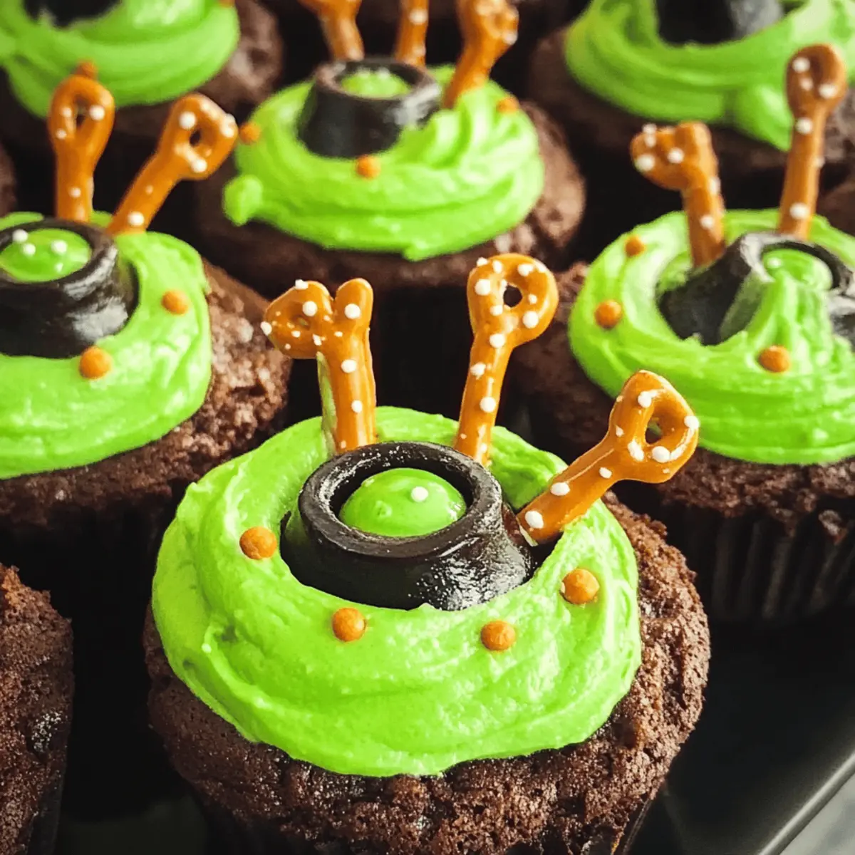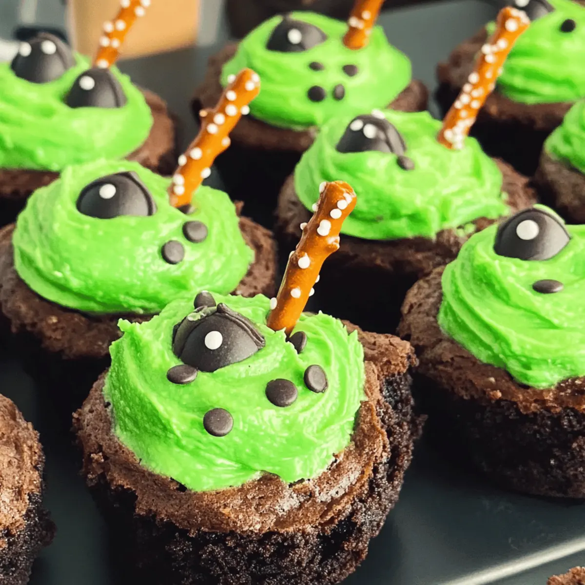 Originelle Witch Cauldron Brownies mit saftiger Brownie-Basis und grünem Buttercreme-Topping sind ein Highlight für jede Halloween-Feier.