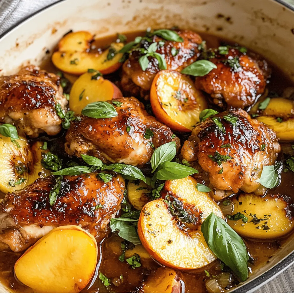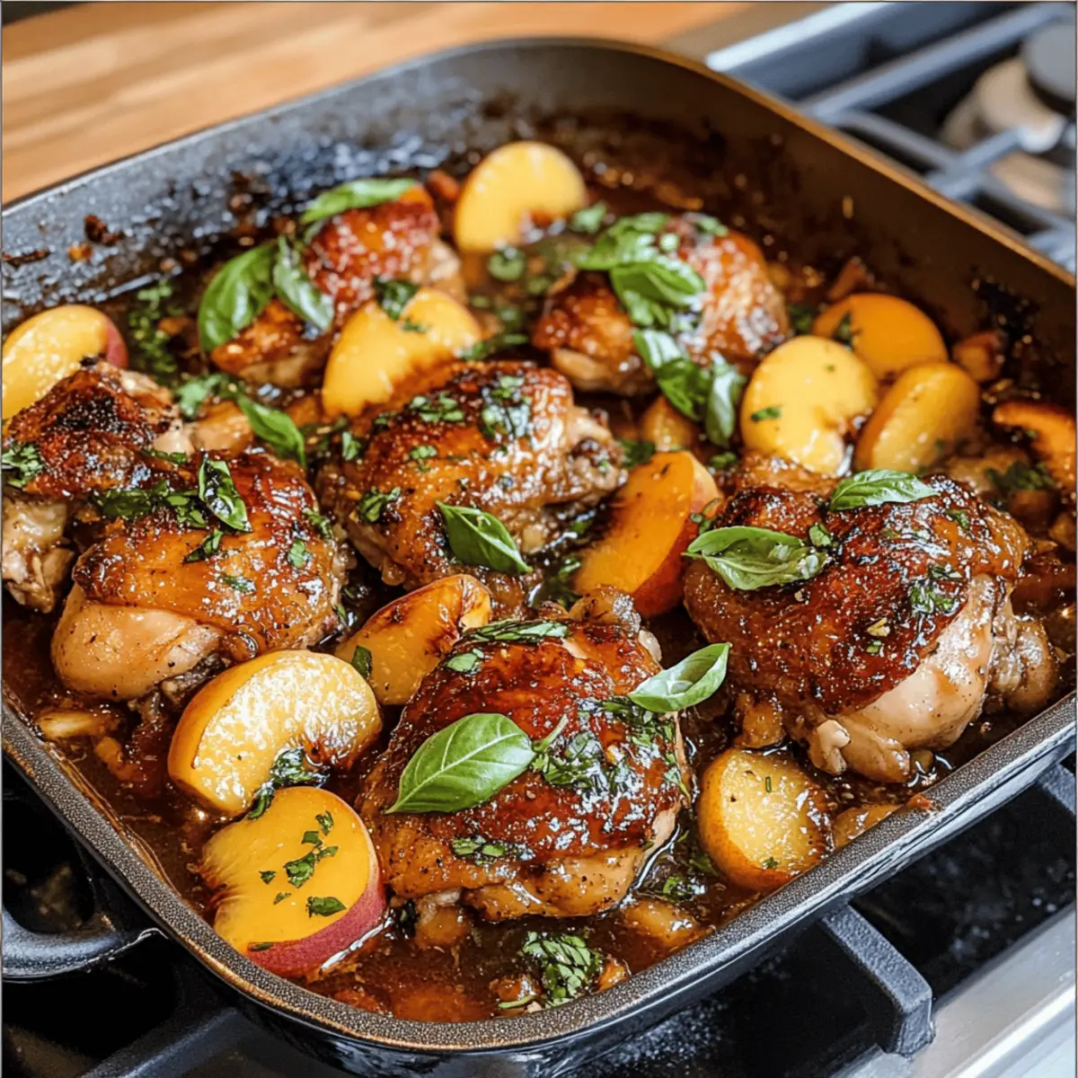 Der Duft von gebratenem Hähnchen und saftigen Pfirsichen erfüllt die Küche, während ich mich auf eines meiner Lieblingsgerichte vorbereite: Honey Butter Peach Chicken. Dieses Rezept vereint die Süße von frischen Pfirsichen mit der pikanten Note von Pancetta und einer unwiderstehlichen Honig-Butter-Sauce. Es ist nicht nur ein Fest für den Gaumen, sondern auch ein echter Blickfang auf jedem Esstisch – perfekt für ein schnelles Abendessen, das bei Freunden und Familie immer gut ankommt. Mit seiner unkomplizierten Zubereitung und den köstlichen Aromen ist dieses Gericht ideal für alle, die sich nach einer schmackhaften Abwechslung von Fast Food sehnen. Bist du bereit, deine Küche in ein kleines Gourmet-Restaurant zu verwandeln? Lass uns loslegen! Warum wirst du dieses Rezept lieben? Einfachheit: Mit nur wenigen Zutaten und klaren Schritten ist dieses Rezept perfekt für Kochanfänger und Profis gleichermaßen. Unglaublicher Geschmack: Die Verbindung von süßen Pfirsichen und salziger Pancetta schafft einen exquisiten Geschmack, der deine Sinne verzaubert. Vielseitigkeit: Ob als schnelles Abendessen oder für besondere Anlässe – dieses Gericht ist zu jeder Zeit ein Hit. Du kannst es wunderbar mit einer frischen Salatseite oder Linsensuppe Mit Zitrone kombinieren. Schnell zubereitet: Mit minimalem Aufwand kannst du ein Gericht kreieren, das aussieht und schmeckt wie aus einem feinen Restaurant. Fantastisches Aroma: Der Duft des gebratenen Hähnchens und der gebackenen Pfirsiche wird deine Küche in einen einladenden Ort verwandeln. Perfekt für jede Gelegenheit: Ob für ein Dinner mit Freunden oder ein entspanntes Familienessen, dieses Rezept kommt immer gut an! Zutaten für Honigbutter-Pfirsich-Hühnchen • Entdecke die geheimen Zutaten, die dieses Gericht unwiderstehlich machen! Für das Hühnchen Pancetta – Fügt eine herzhafte Tiefe und Salzigkeit hinzu; Bacon kann als Ersatz verwendet werden. Hähnchenoberschenkel – Liefert Reichtum und Feuchtigkeit; Hähnchenbrust ist auch möglich, aber achte darauf, sie zu zarten. Olivenöl – Ideal zum Anbraten und verstärkt den Geschmack; kann durch Pflanzenöl ersetzt werden. Schalotte – Bringt Süße und eine feine Schärfe; normale Zwiebeln sind ein geeigneter Ersatz. Knoblauch – Gibt ein starkes Aroma und Geschmack; verwende frischen Knoblauch, da Knoblauchpulver nicht optimal ist. Hühnerbrühe – Belebt und bereichert die Sauce; kann durch Gemüsebrühe für eine leichtere Variante ersetzt werden. Butter – Macht die Sauce cremig; Margarine kann für eine leichtere Option verwendet oder ganz weggelassen werden. Honig – Sorgt für natürliche Süße; alternative Süßungsmittel sind auch möglich, aber Honig ist entscheidend für den Geschmack. Frischer Thymian – Fügt eine kräuterliche Frische hinzu; gedrockener Thymian kann in etwa einem Drittel der Menge genutzt werden. Pfirsiche – Die Hauptzutat, die Frische und Süße hinzufügt; man kann auch Nektarinen verwenden, wenn Pfirsiche nicht in Saison sind. Frisches Basilikum – Für das Topping; bringt zusätzlichen Geschmack, aber ist nicht zwingend notwendig. Für die Sauce Zucker – Verstärkt die Süße der Mischung; ersatzweise kann auch brauner Zucker verwendet werden. Zitronensaft – Fügt eine säuerliche Note hinzu und verstärkt die Aromen; gut als frische Zutat geeignet. Mit diesen Zutaten zauberst du ein fantastisches Honigbutter-Pfirsich-Hühnchen, das deine Freunde und Familie begeistern wird! Schritt-für-Schritt-Anleitung für Honigbutter-Pfirsich-Hühnchen Step 1: Ofen vorheizen Heize deinen Backofen auf 175 °C (350 °F) vor. Diese Temperatur sorgt dafür, dass das Hühnchen gleichmäßig gart und die Aromen der Honigbutter und Pfirsiche optimal zur Geltung kommen. Während der Ofen aufheizt, kannst du die Hähnchenstücke vorbereiten, um die Zubereitung effizienter zu gestalten. Step 2: Hähnchen würzen Würze die Hähnchenoberschenkel großzügig mit der Hälfte der Gewürze auf beiden Seiten. Diese Vorarbeit sorgt dafür, dass das Fleisch von innen saftig und aromatisch ist. Lass das Würzen ein paar Minuten einwirken, sodass die Aromen gut durchziehen und du ein köstliches Honigbutter-Pfirsich-Hühnchen erhältst. Step 3: Pancetta anbraten Erhitze eine große, ofenfeste Pfanne bei mittlerer Hitze und brate die Pancetta für etwa 3 Minuten an, bis sie dunkelrot und knusprig ist. Diese herzhaften Stücke geben dem Gericht eine salzige Tiefe. Entferne die Pancetta anschließend und lasse sie auf einem Küchentuch abtropfen, um überschüssiges Fett zu entfernen. Step 4: Hähnchen anbraten Im verbleibenden Fett in der Pfanne brätst du die Hähnchenoberschenkel für 1-2 Minuten pro Seite an, bis sie goldbraun sind. Stelle sicher, dass du das Hähnchen nicht zu lange brätst, damit es saftig bleibt. Nach dem Anbraten nimm das Hühnchen aus der Pfanne und lege es beiseite, während du die nächsten Zutaten vorbereitest. Step 5: Schalotten und Knoblauch anschwitzen Sauté die Schalotten im verbliebenen Öl der Pfanne für etwa 2 Minuten, bis sie weich und leicht karamellisiert sind. Füge dann den geriebenen Knoblauch hinzu und brate ihn weitere 2 Minuten an, bis er duftet. So erhält deine Honigbutter-Pfirsich-Hühnchen-Sauce eine wunderbare aromatische Note, die perfekt mit den anderen Zutaten harmoniert. Step 6: Pfanne ablöschen Gib die Hühnerbrühe in die Pfanne und kratzen den Boden gründlich ab, um die angebratenen Reste zu lösen. Lass die Brühe für etwa 3 Minuten köcheln, damit sich die Aromen entfalten und eine tiefgründige Grundlage für die Sauce entsteht. Diese Schritte sind entscheidend für den vollmundigen Geschmack deines Gerichts. Step 7: Butter und Honig hinzufügen Füge nun die Butter und den Honig zur Pfanne hinzu und rühre, bis beides vollständig geschmolzen ist und eine cremige Sauce entsteht. Gib das Hähnchen zusammen mit dem frischen Thymian zurück in die Pfanne. Mische alles gut, sodass das Hühnchen gl