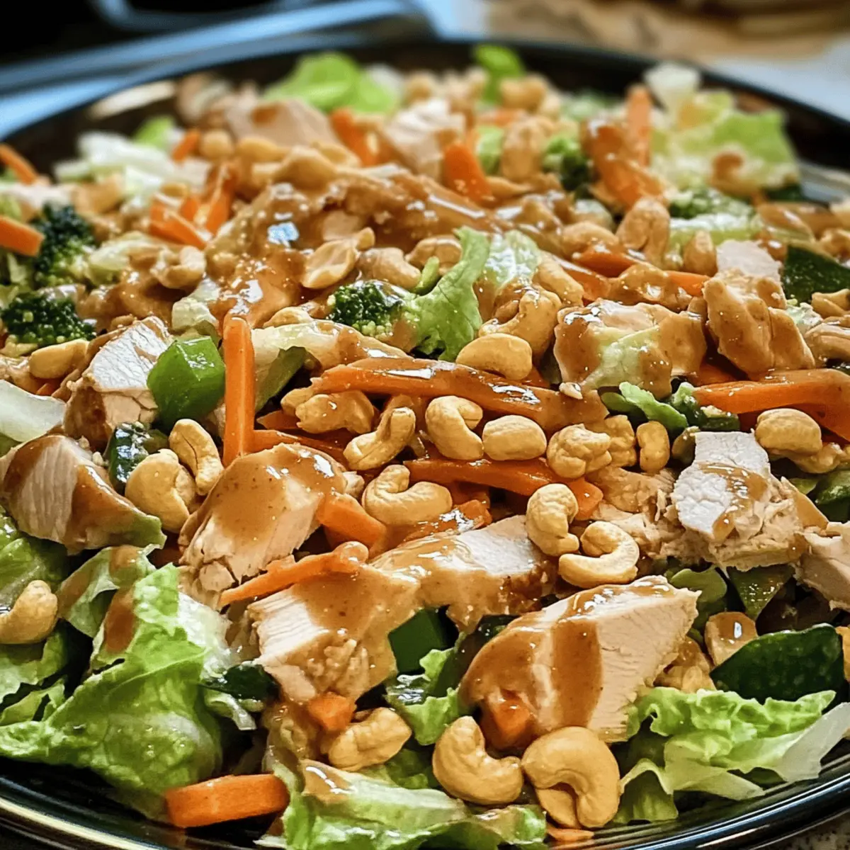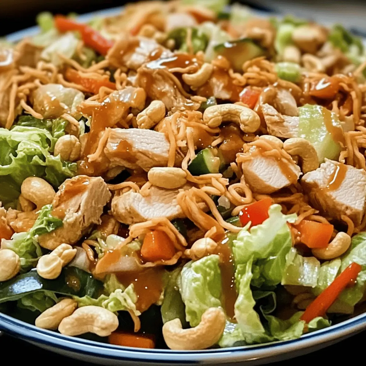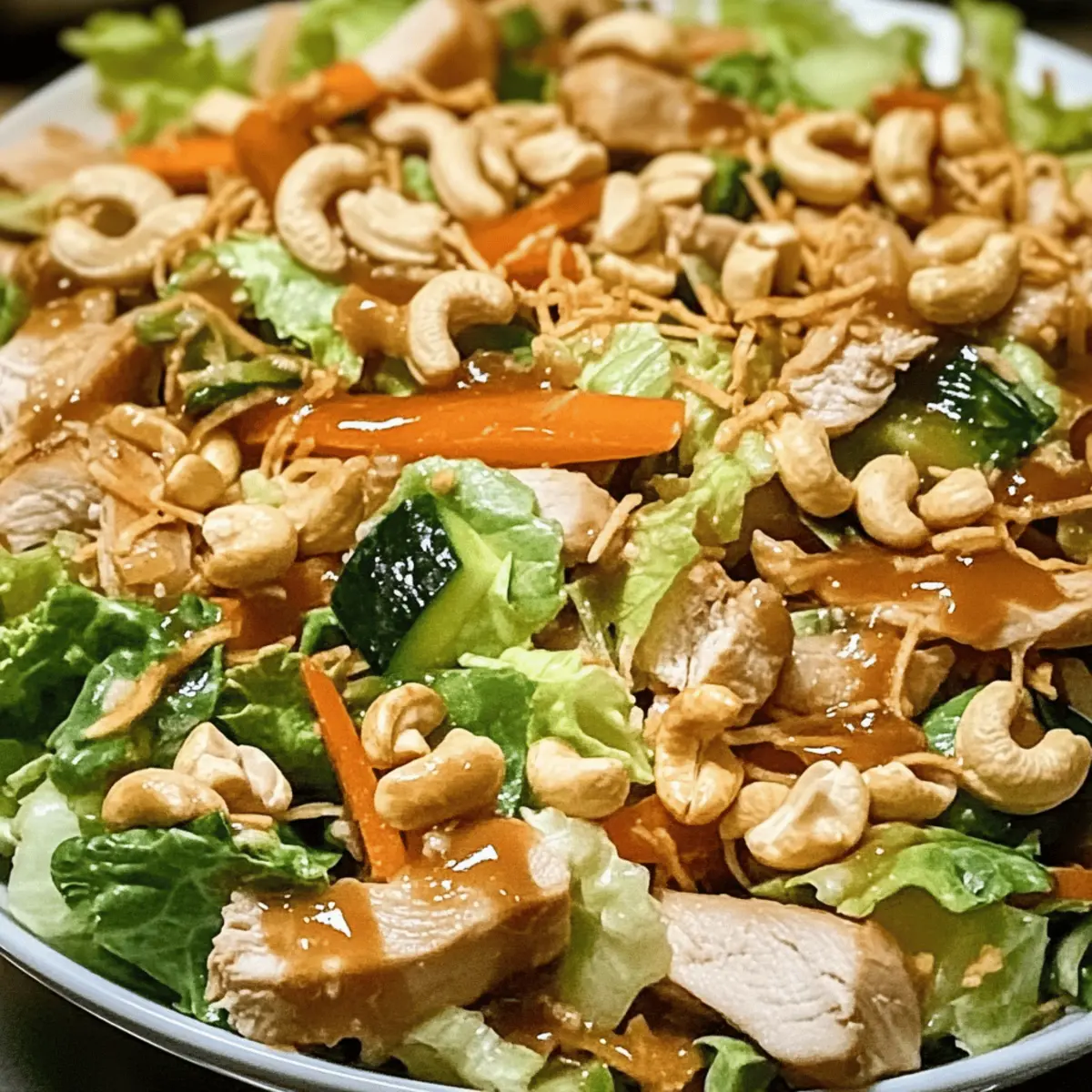 Als ich neulich am Markt vorbeiging, war ich sofort von den leuchtenden Farben der frischen Gemüse und dem verlockenden Duft von gegrilltem Hähnchen angezogen. Es war der ideale Moment, um einen leichten und doch sättigenden Chicken Cashew Crunch Salad zuzubereiten. Diese köstliche Kombination aus zartem Hähnchen, knusprigen Cashews und knackigem Gemüse ist nicht nur nährstoffreich, sondern auch in weniger als 30 Minuten zubereitet. Ideal für alle, die im Alltag eine gesunde, schmackhafte und vielseitige Mahlzeit suchen. Denkt daran, dass diese Salatvariationen im Handumdrehen zubereitet werden können, sodass Ihr stets neuen Schwung in eurem Speiseplan haben könnt. Wer würde nicht gerne eine bunte und lebendige Mahlzeit genießen, die den Gaumen erfreut und das Auge anzieht? Lasst uns tiefer eintauchen! Warum wirst du diesen Salat lieben? Vielfältig und anpassbar: Diese Rezeptur erlaubt es dir, mit verschiedenen Gemüse- und Proteinvariationen zu experimentieren. Entdecke Zutaten wie Toff und sogar Obst für zusätzliche Süße! Schnell und einfach: In weniger als 30 Minuten kannst du eine nahrhafte Mahlzeit zubereiten, die perfekt für stressige Tage ist. Bereite einige Zutaten vor und du bist bereit! Gesund und nahrhaft: Mit frischem Gemüse, Protein und gesunden Fetten aus den Cashews ist dieser Salat nicht nur lecker, sondern auch ein Fest für deine Gesundheit. Farbenfroh und ansprechend: Das lebendige Aussehen dieser Salatkombination macht jeden Biss zu einem Vergnügen. Er ist nicht nur ein Genuss für den Gaumen, sondern sieht auch auf dem Teller fantastisch aus! Du könntest auch andere köstliche Gerichte ausprobieren, wie das Wuerziges Rinderfleisch Mit oder die Knoblauch Butter Rinderfilet, die deine Kochkünste erweitern könnten! Hühnchen Cashew Crunch Salat Zutaten Für den Salat • Hähnchenbrust – Hauptproteinquelle, idealerweise gegrillt und in Scheiben geschnitten für zarte Textur. • Römersalat – Frische, knackige Blätter bilden die Basis und sorgen für einen schönen Crunch. • Paprika – Fügt Süße und Farbe hinzu; jede Farbe ist möglich, für einen anderen Crunch kannst du Gurken verwenden. • Karotte – Gibt eine süße Knusprigkeit, wenn sie in Streifen geschnitten wird; kann auch durch geschredderten Kohl ersetzt werden. • Frühlingszwiebeln – Bringt einen milden Zwiebellgeschmack und Crunch; normale Zwiebeln sind ein möglicher Ersatz, haben aber einen kräftigeren Geschmack. • Ungesalzene Cashews – Sorgen für Crunch und nussigen Geschmack, können durch Mandeln oder Erdnüsse ersetzt werden. • Krosse Chow Mein Nudeln – Fügen extra Knusprigkeit hinzu; kannst auch Tortillastreifen oder knusprige Wontons verwenden. • Frischer Koriander (optional) – Verstärkt den Geschmack mit frischen Kräuternoten; kann weggelassen werden, wenn nicht gewünscht. Für das Dressing • Sojasauce – Basis des Dressings für salzige Umami-Noten. • Honig – Fügt eine angenehme Süße hinzu, die gut mit der Sojasauce harmoniert. • Sesamöl – Für nussigen Geschmack und reichhaltige Aromen. • Reisessig – Sorgt für einen erfrischenden, sauren Kick, perfekt zur Balance der Aromen. • Knoblauch – Frisch gehackt für würzige Tiefe im Dressing. • Geriebener Ingwer – Fügt eine belebende Note hinzu; frisch ist am besten für den Geschmack. Dieser Hühnchen Cashew Crunch Salat ist eine köstliche und vielseitige Wahl, die einfach zu variieren ist! Schritt-für-Schritt-Anleitungen für Hühnchen Cashew Crunch Salat Step 1: Hähnchen grillen Heize deinen Grill auf mittlere Hitze vor. Grill die Hähnchenbrüste für etwa 6-7 Minuten pro Seite, bis sie vollständig durchgegart sind und eine Innentemperatur von 74°C (165°F) erreicht haben. Lass das Hähnchen danach mindestens 5 Minuten ruhen, bevor du es in dünne Scheiben schneidest. Step 2: Gemüse kombinieren Nimm eine große Schüssel und gib den gehackten Römersalat, die gewürfelte Paprika, die in Streifen geschnittene Karotte und die geschnittenen Frühlingszwiebeln hinein. Mische die Zutaten gründlich durch, bis sie gleichmäßig verteilt sind. Achte darauf, dass der Salat frisch und knackig aussieht, um die beste Textur zu gewährleisten. Step 3: Cashews hinzufügen Füge die ungesalzenen Cashews in die Schüssel mit dem Gemüse hinzu. Mische alles vorsichtig durch, sodass die Cashews gleichmäßig im Salat verteilt werden und der Crunch des Hühnchen Cashew Crunch Salats entsteht. Dieser Schritt sorgt für eine nussige Note, die wunderbar zum frischen Gemüse passt. Step 4: Dressing zubereiten In einer separaten Schüssel mische die Sojasauce, den Honig, das Sesamöl, den Reisessig, den frisch gehackten Knoblauch und den geriebenen Ingwer. Verquirle alles gut mit einem Schneebesen, bis eine gleichmäßige, glatte Mischung entsteht. Das Dressing sollte aromatisch und einladend duften, bevor es zu dem Salat kommt. Step 5: Alles vermengen Gieße das vorbereitete Dressing über den bereits gemischten Salat. Tossiere alle Zutaten vorsichtig, bis sie gut mit dem Dressing umhüllt sind. Achte darauf, dass jeder Bissen des Hühnchen Cashew Crunch Salats gut gewürzt ist und die Aromen gleichmäßig verteilt sind. Step 6: Hähnchen hinzufügen Schneide das ruhende Hähnchen in dünne Scheiben und falte es vorsichtig in den Salat. Dabei darauf achten, dass das Hähnchen gleichmäßig verteilt ist, sodass jeder Löffel die herrliche Kombination aus Hähnchen und frischen Zutaten bietet. So verleihst du deinem Hühnchen Cashew Crunch Salat eine proteinreiche Füllung. Step 7: Noodles krönen Kurz bevor du den Hühnchen Cashew Crunch Salat servierst, streue die knusprigen Chow Mein Nudeln obenauf. Diese fügen einen zusätzlichen Crunch hinzu, der nicht nur lecker, sondern auch optisch ansprechend ist. Achte darauf, die Nudeln zum besten Zeitpunkt hinzuzufügen, um ihre Knusprigkeit zu erhalten. Step 8: Garnieren Optional kannst du den Salat mit frischem Koriander bestreuen, u